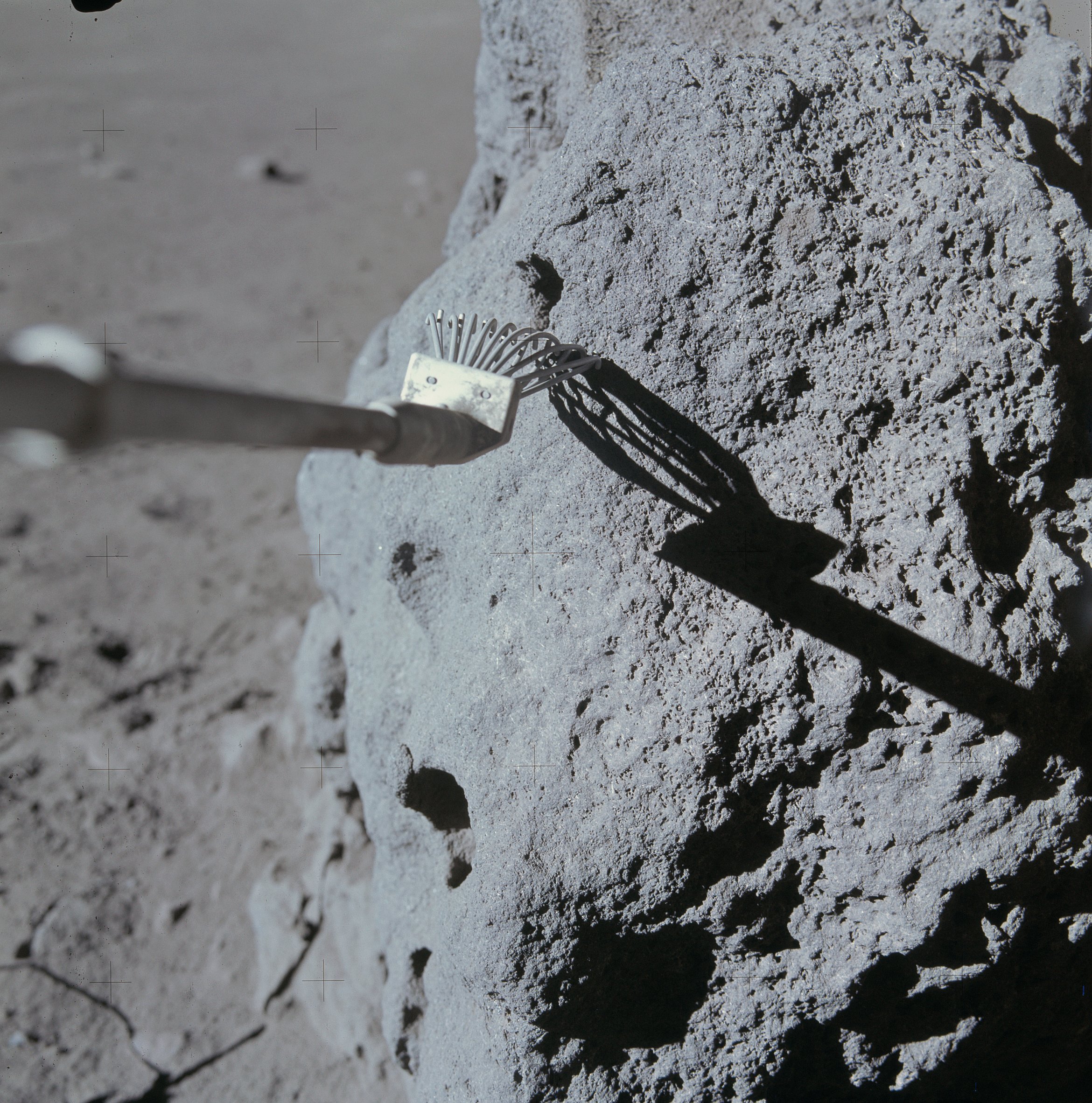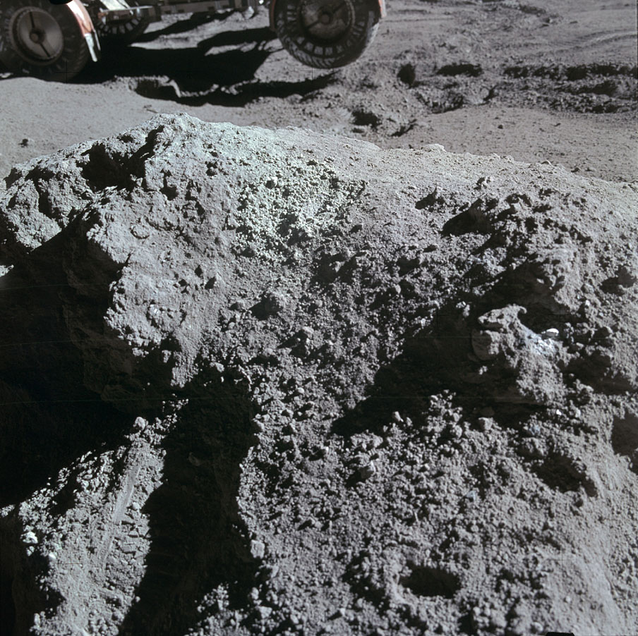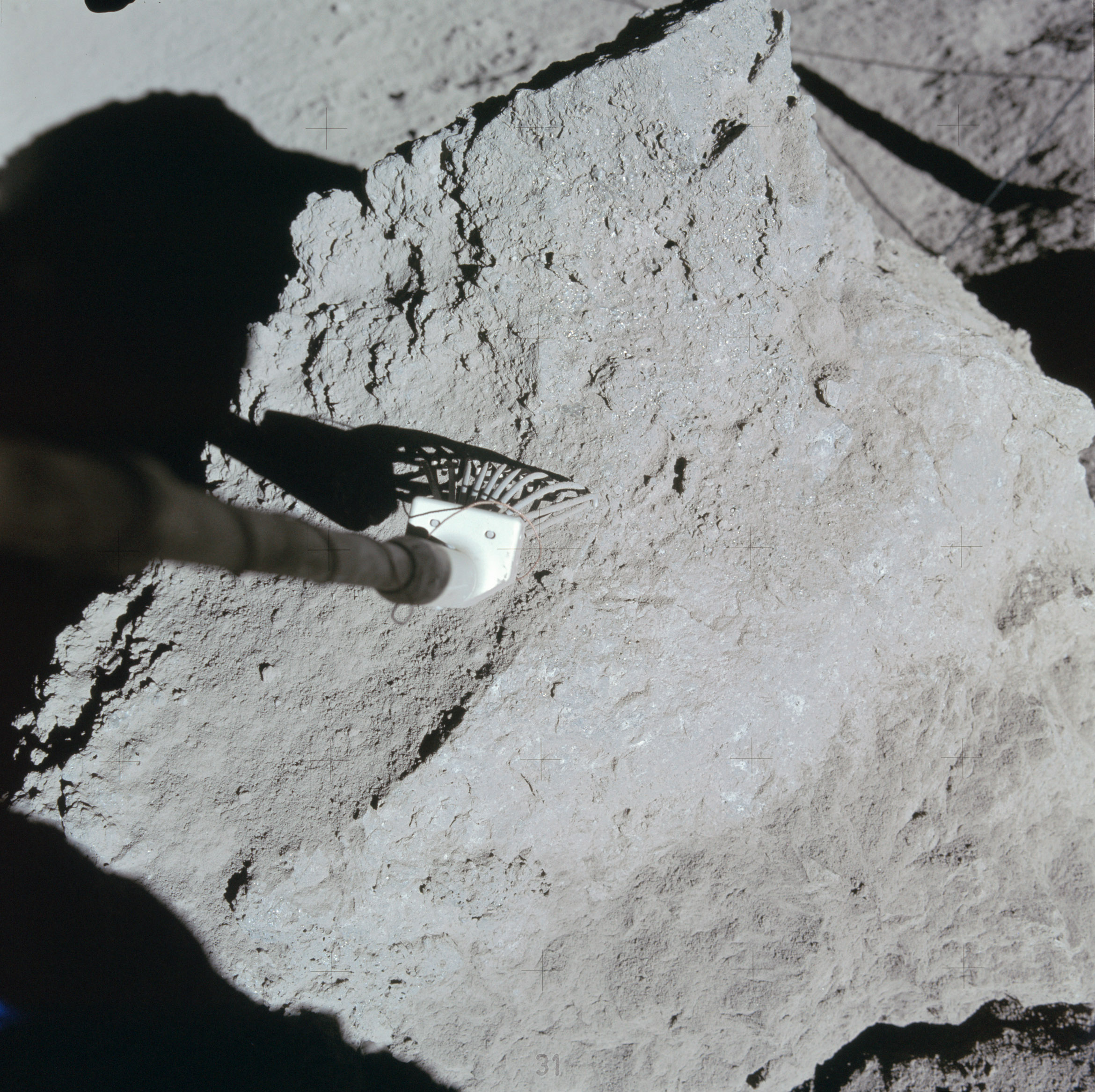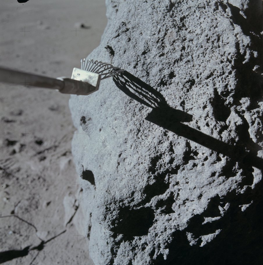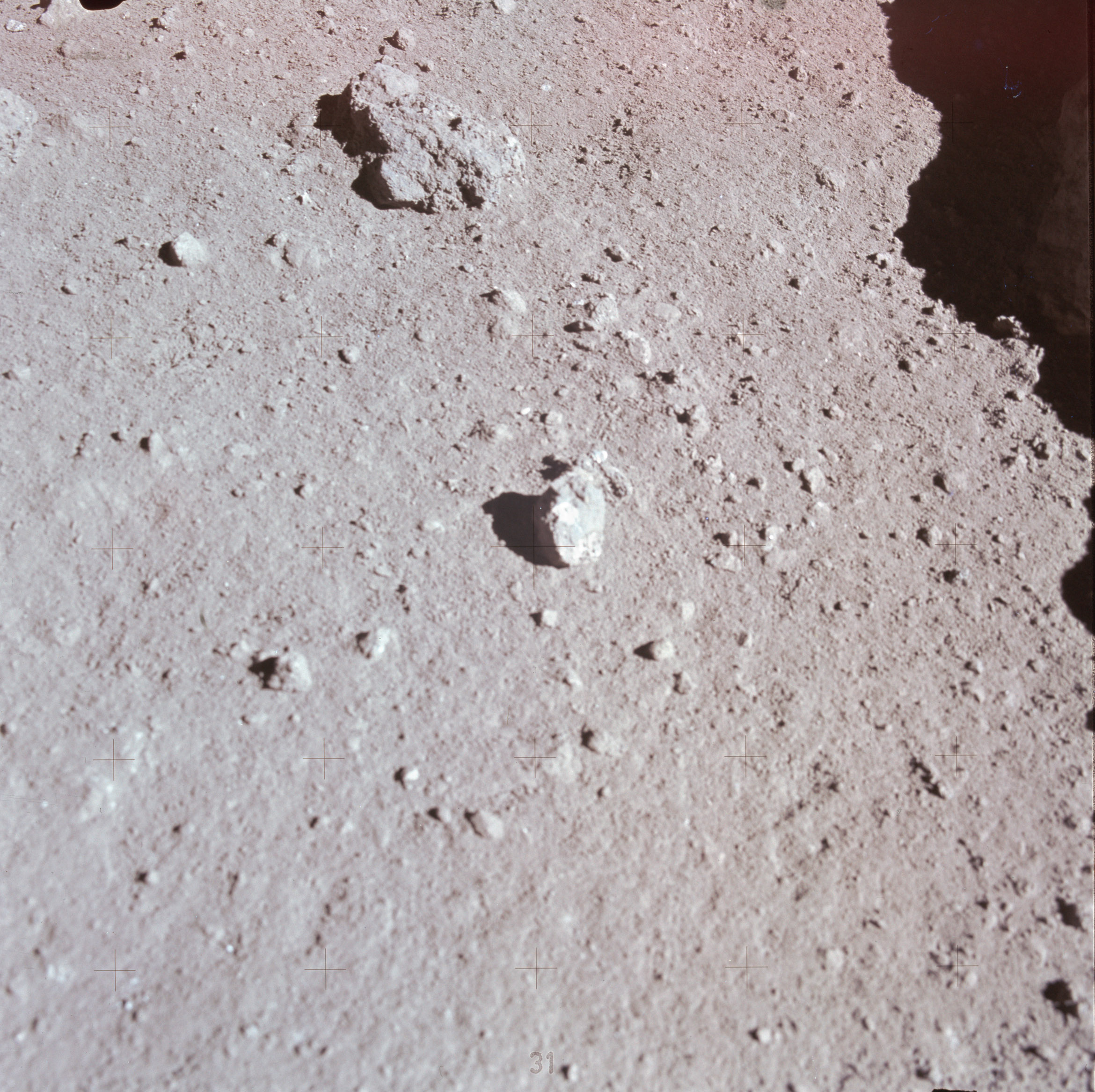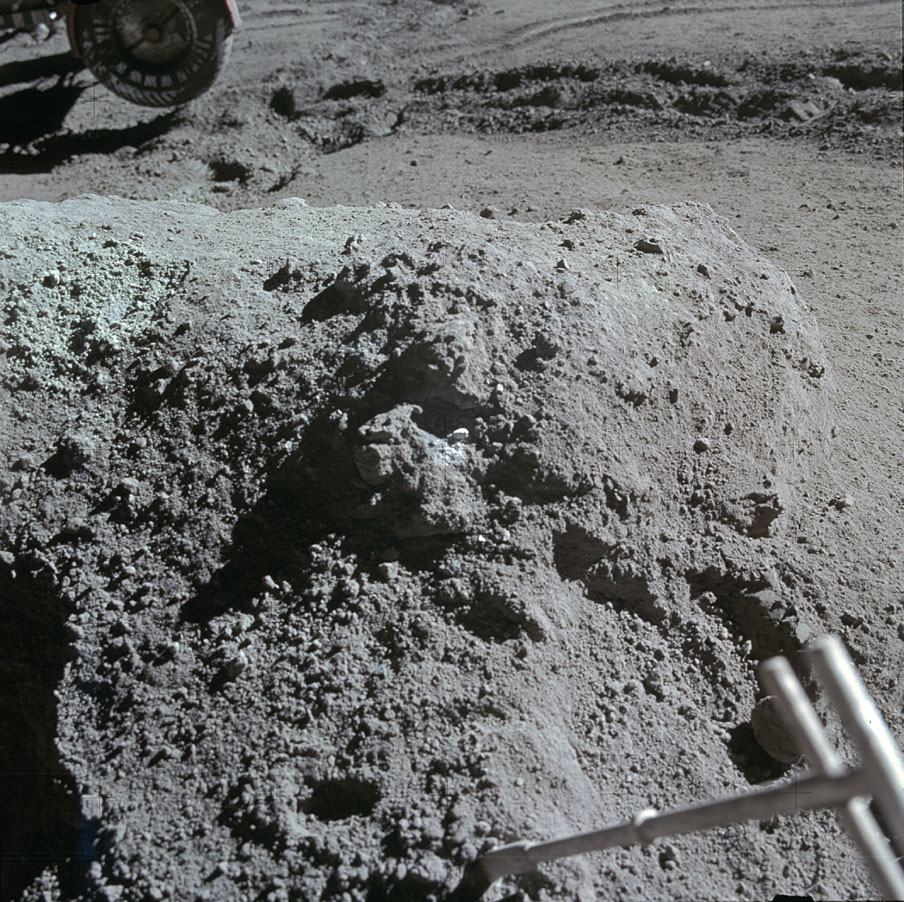 Second view of Great Scott. The cube at the lower right is one inch (2.54 cm) on eash side.S71-43392 (10 Mb or 0.5 Mb)