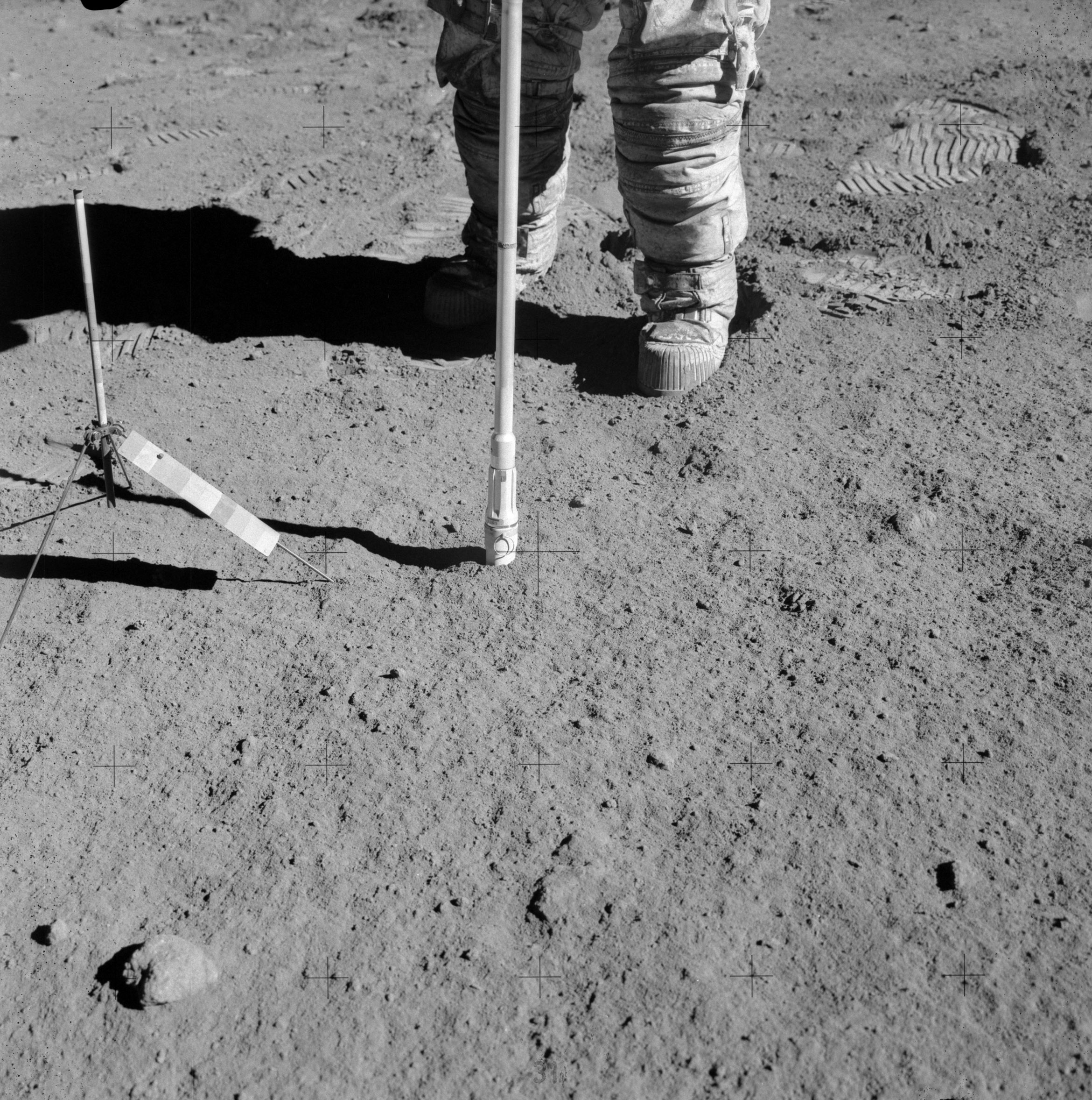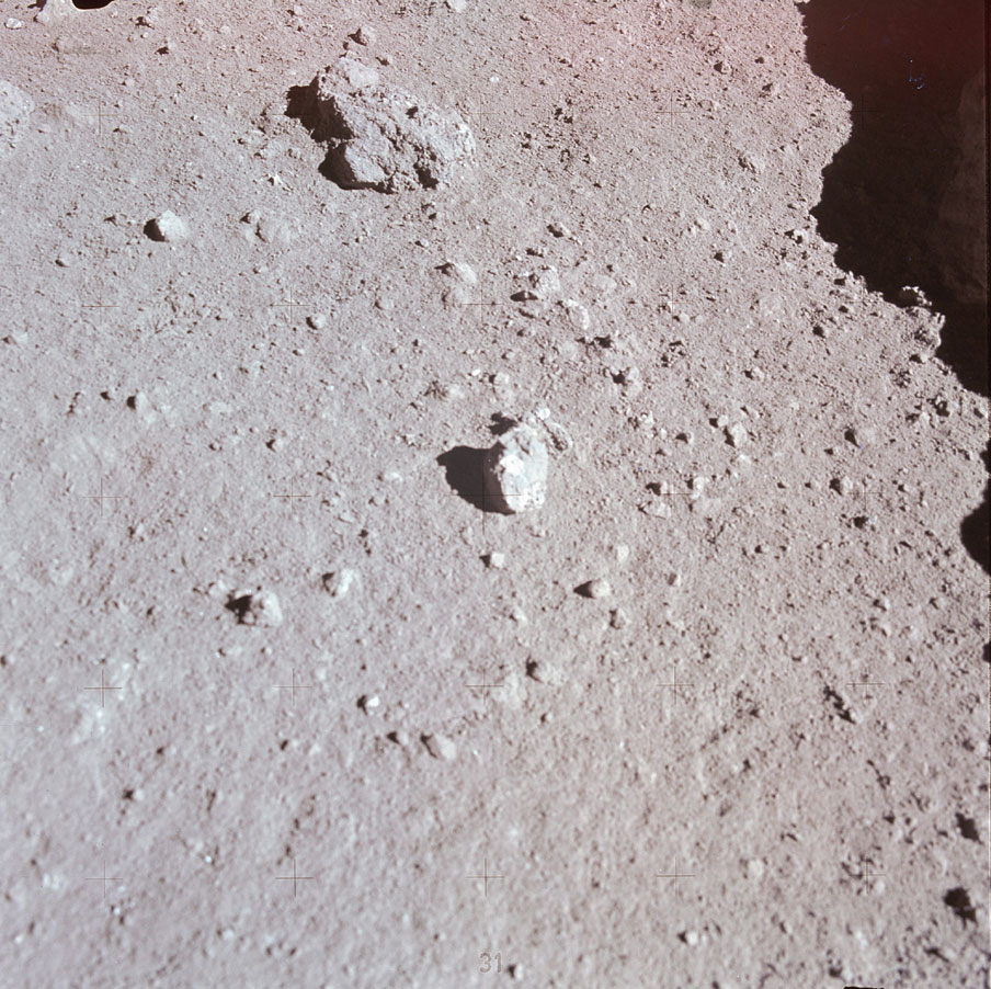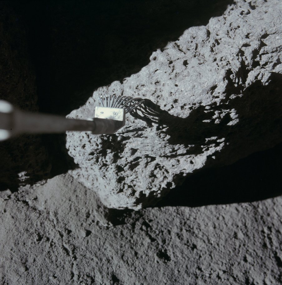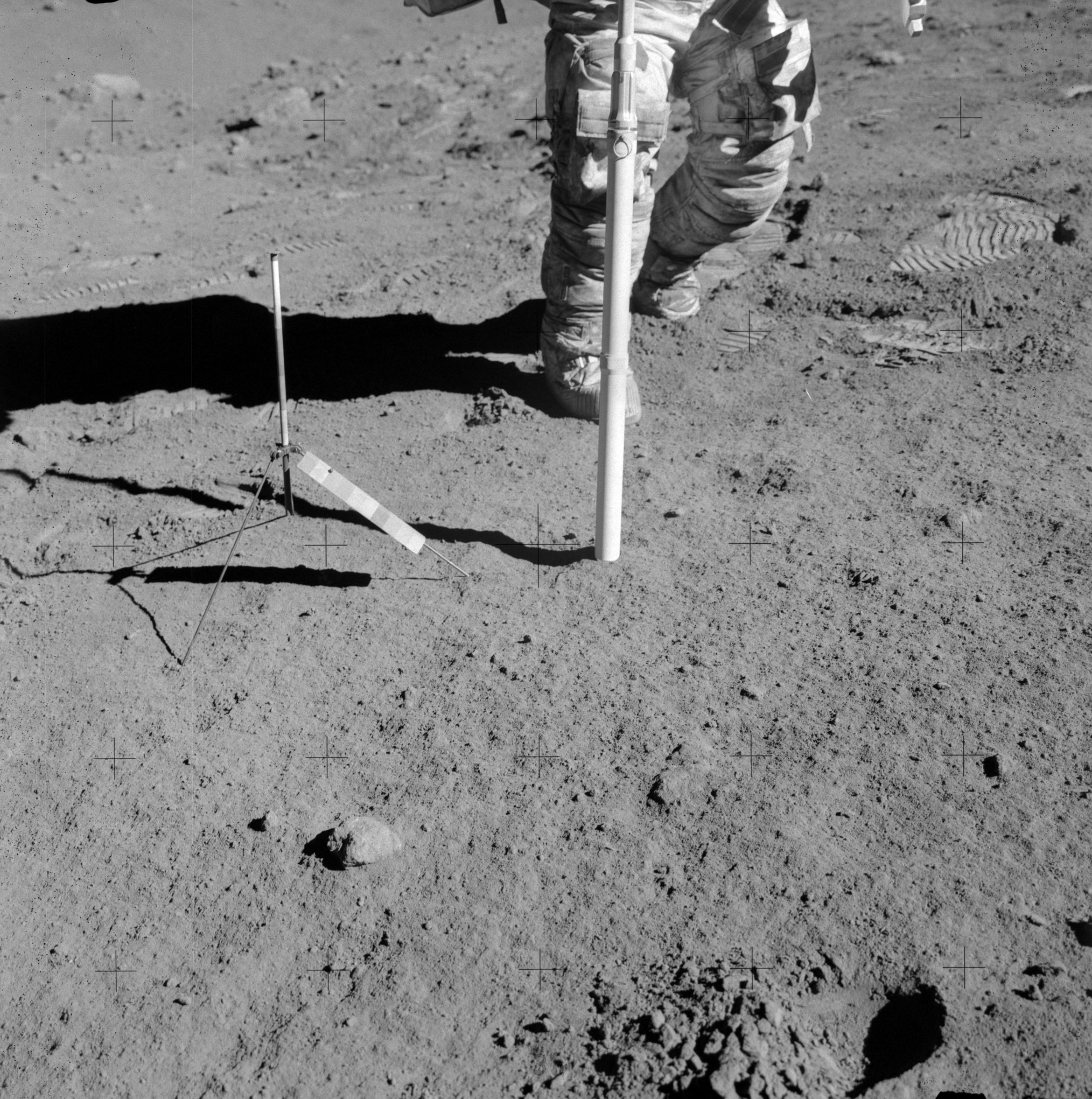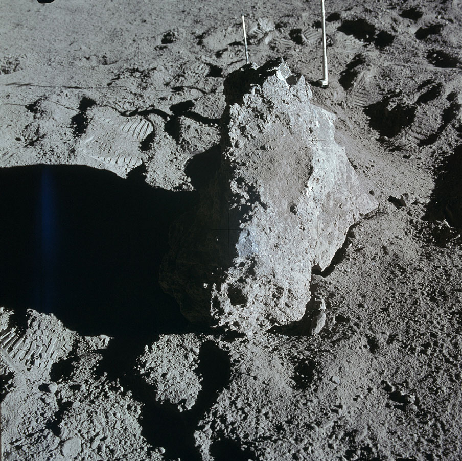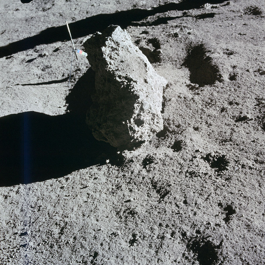 Second view of Great Scott. The cube at the lower right is one inch (2.54 cm) on eash side.S71-43392 (10 Mb or 0.5 Mb)