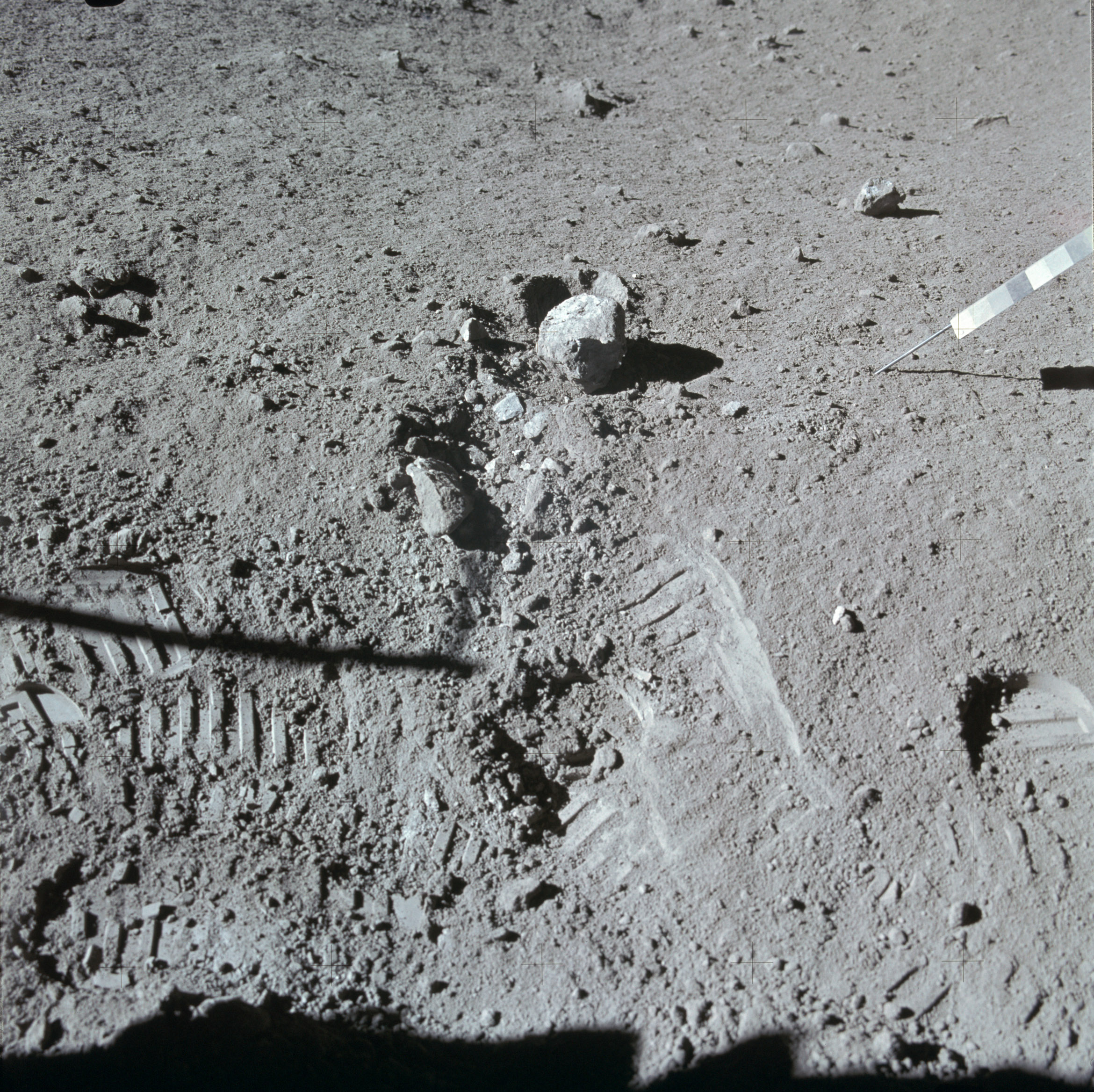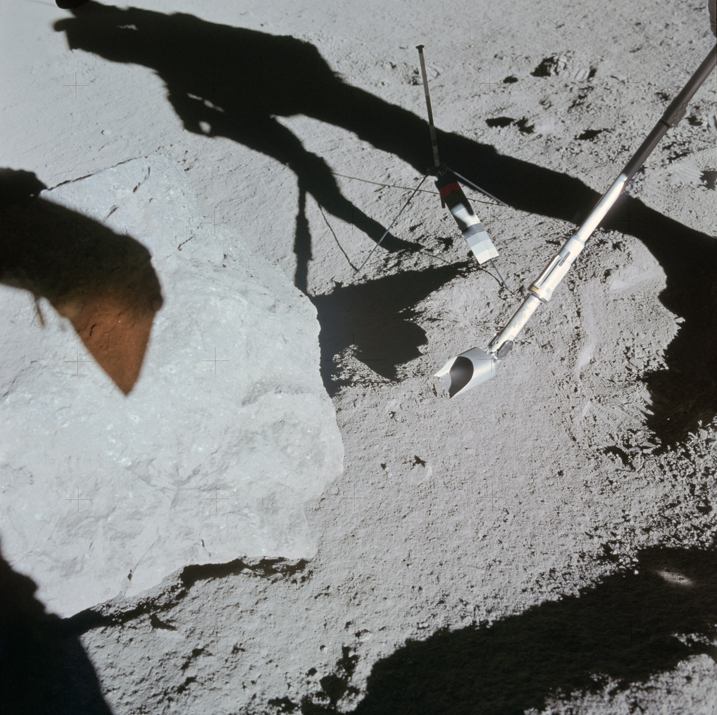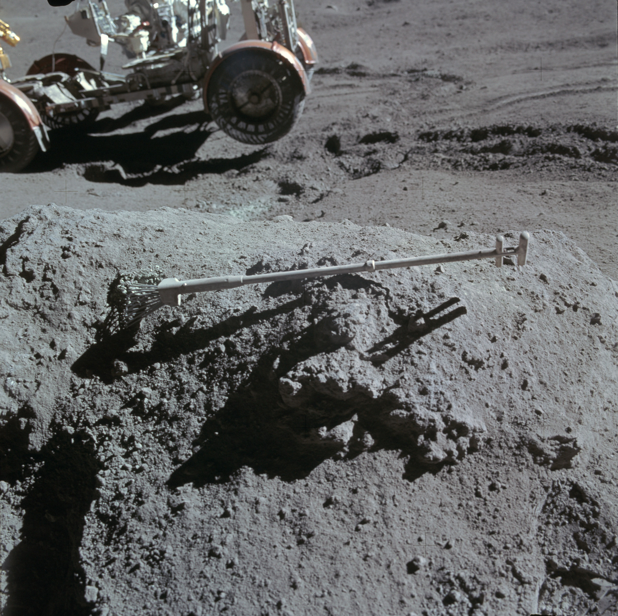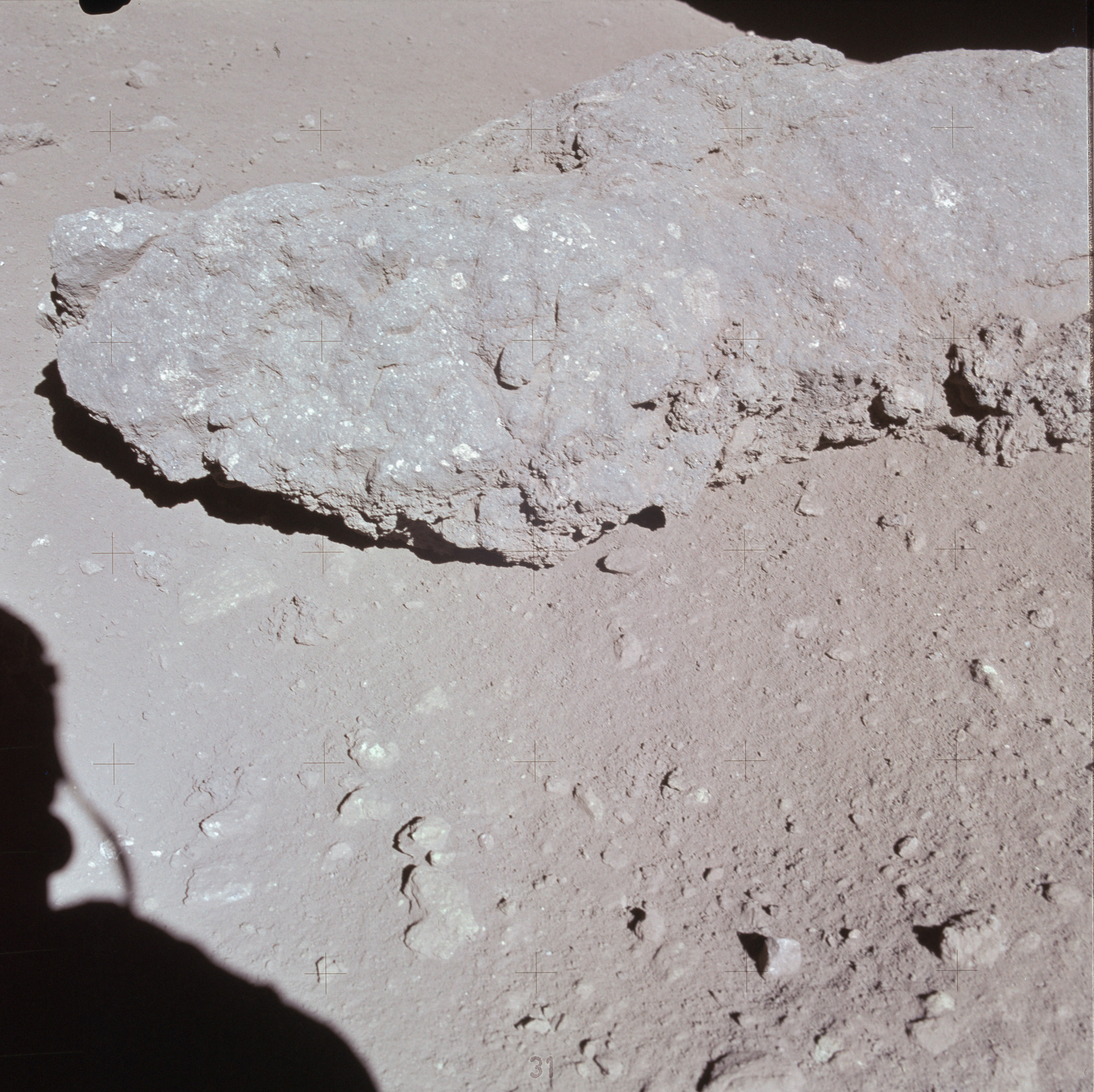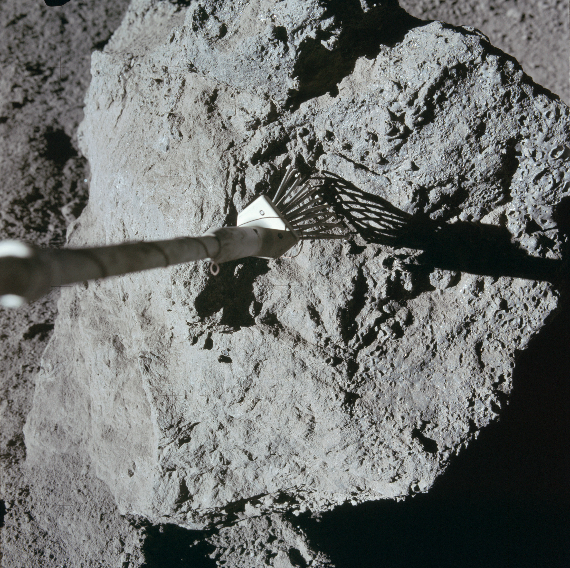 Second view of Great Scott. The cube at the lower right is one inch (2.54 cm) on eash side.S71-43392 (10 Mb or 0.5 Mb)