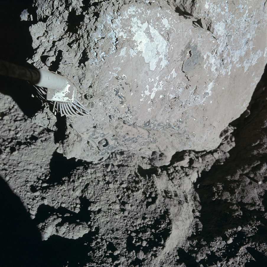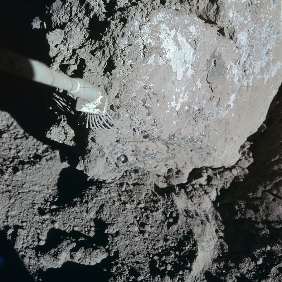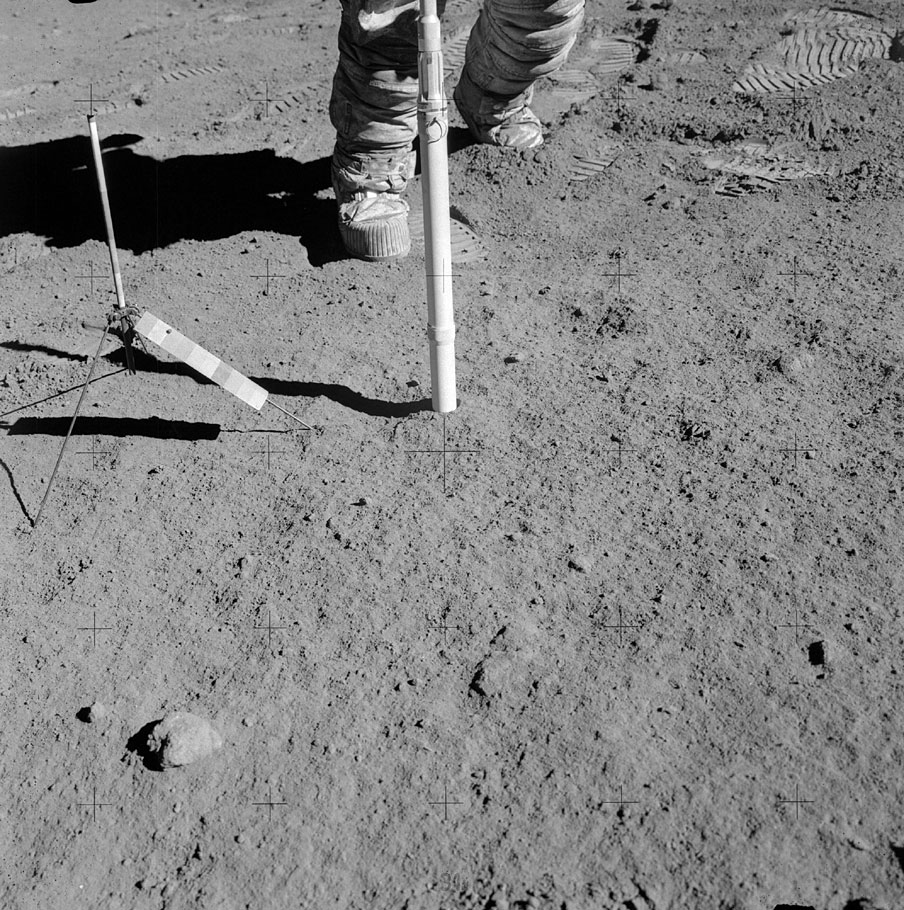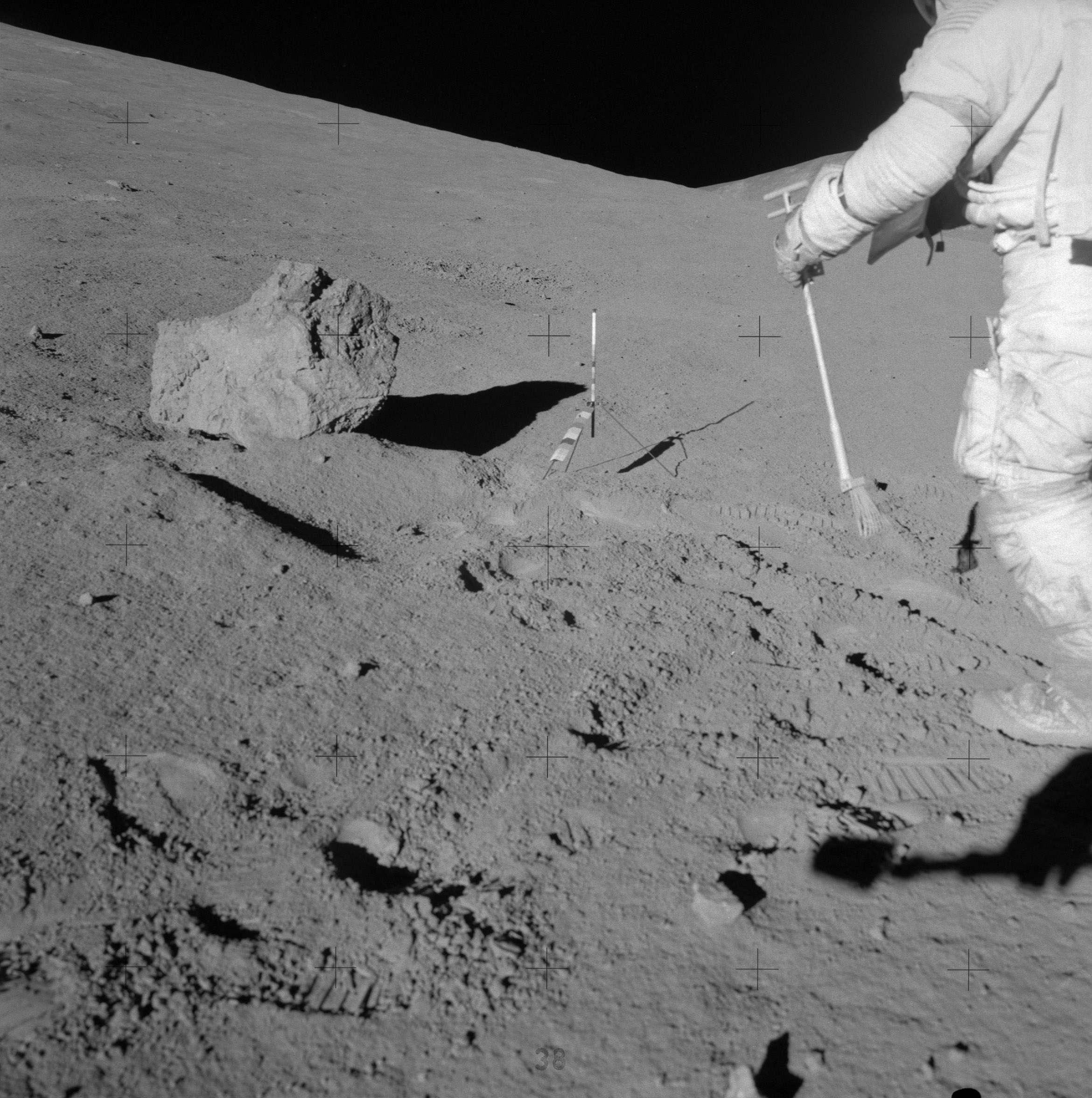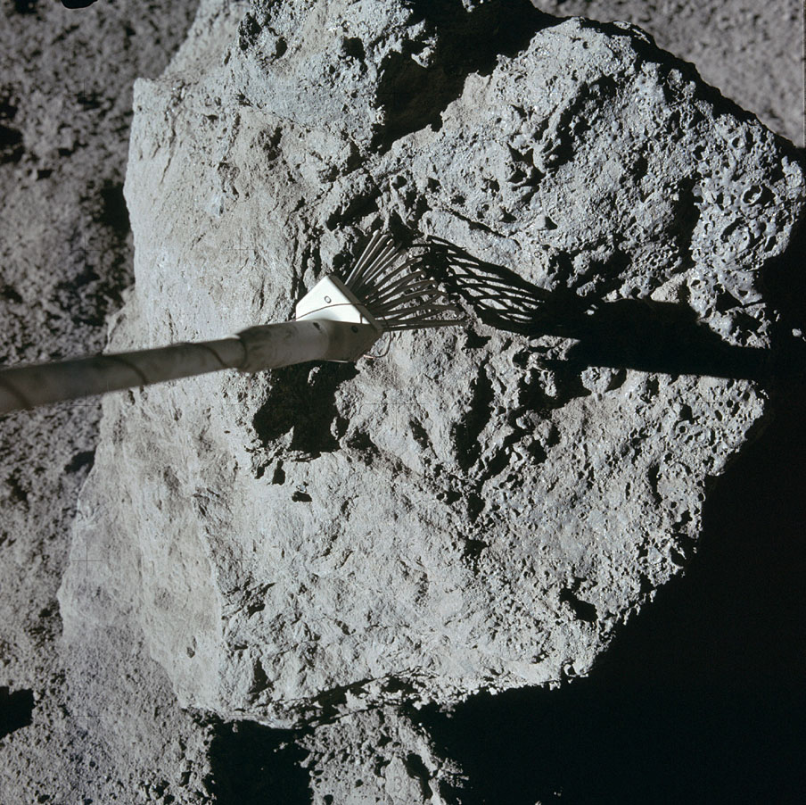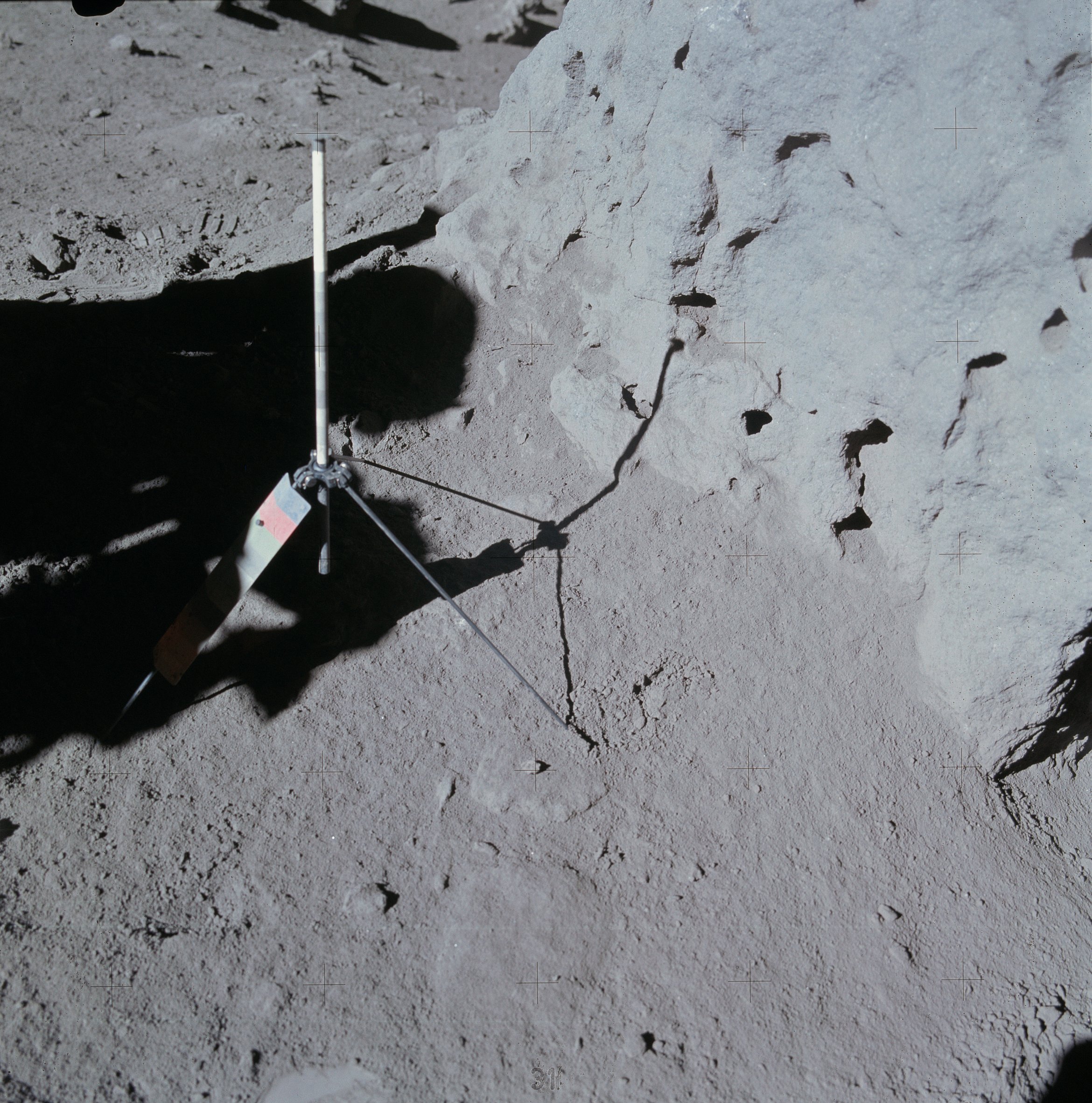 Second view of Great Scott. The cube at the lower right is one inch (2.54 cm) on eash side.S71-43392 (10 Mb or 0.5 Mb)