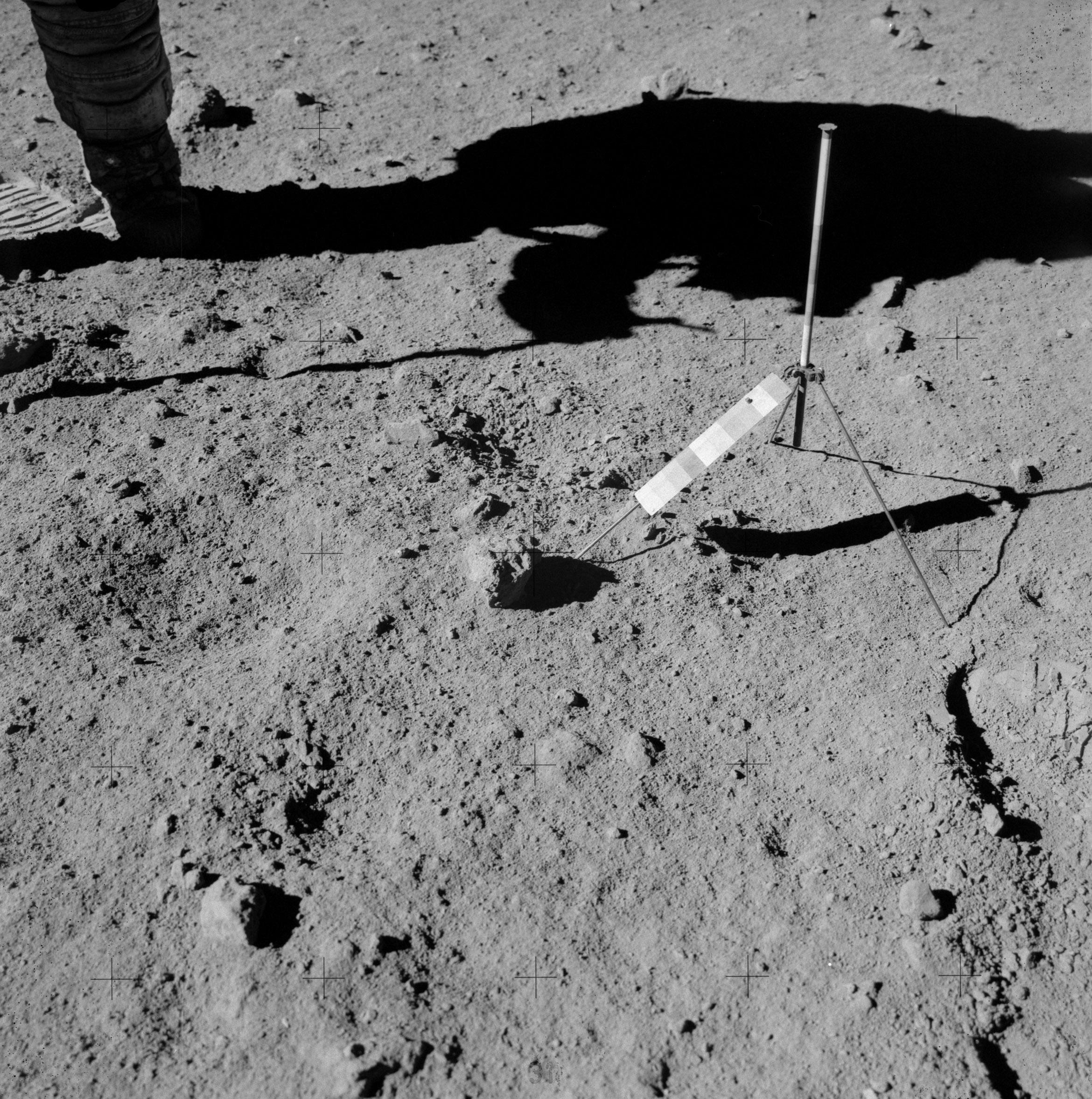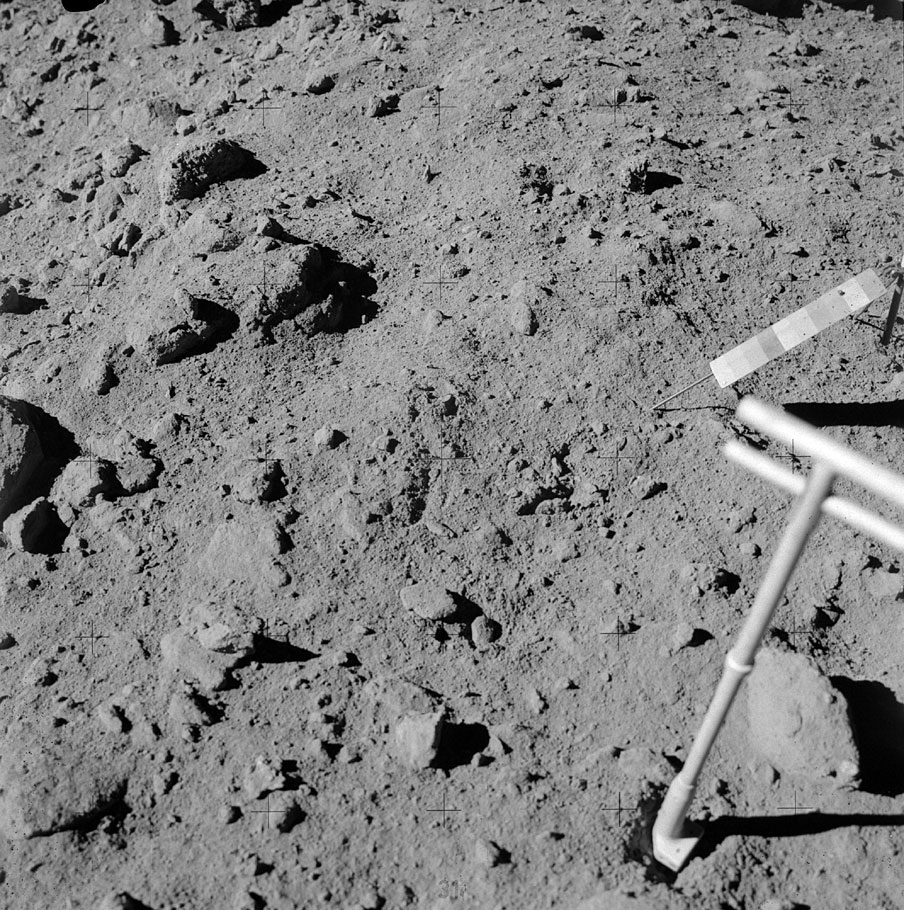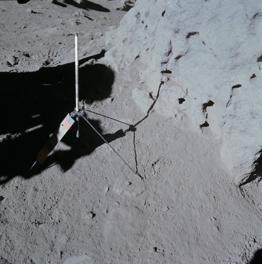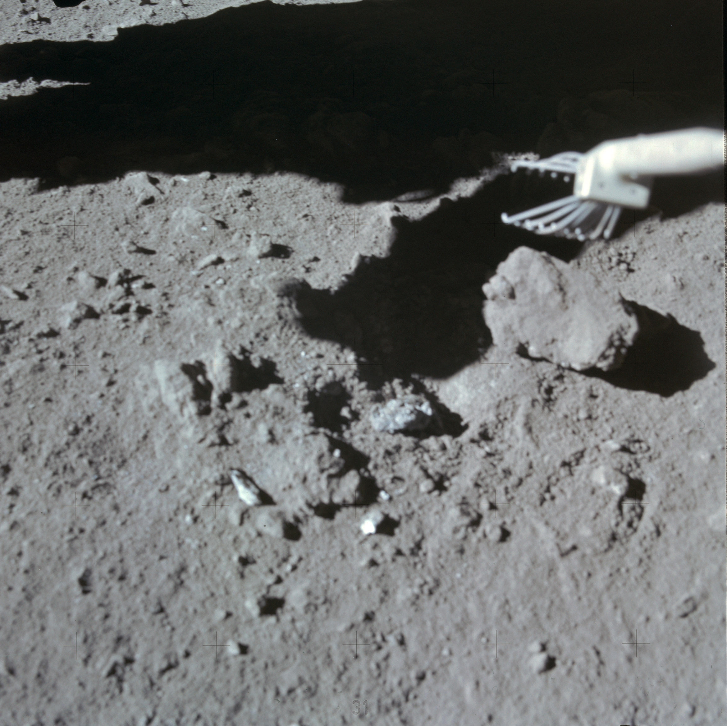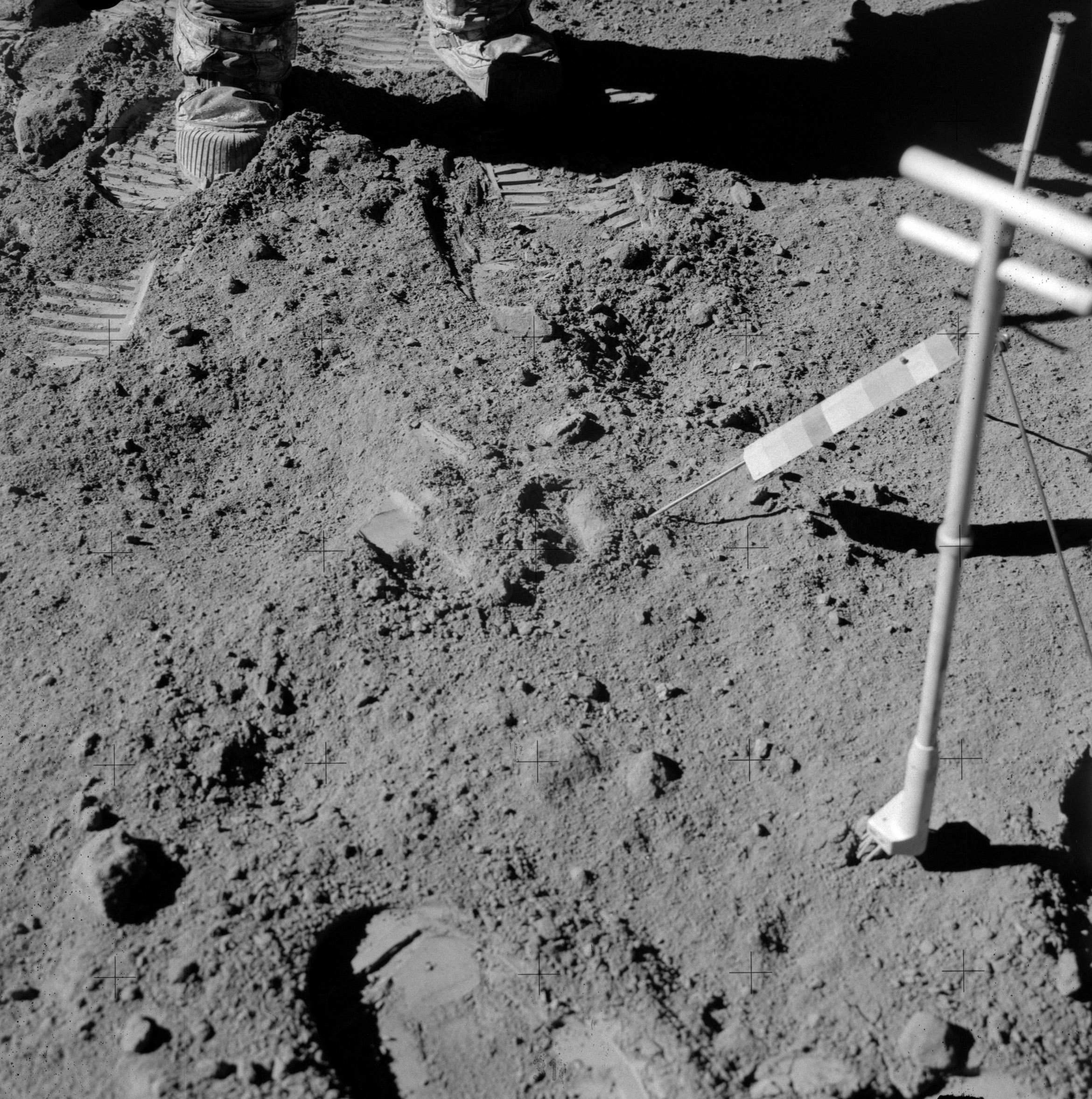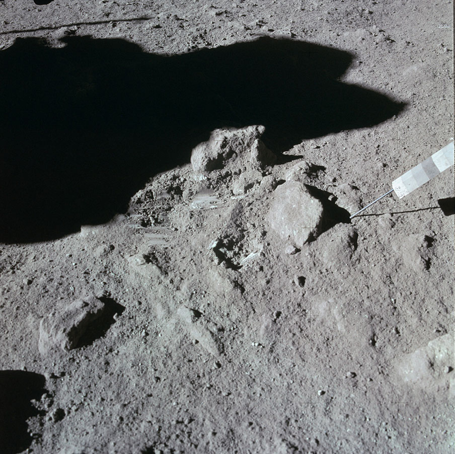 Second view of Great Scott. The cube at the lower right is one inch (2.54 cm) on eash side.S71-43392 (10 Mb or 0.5 Mb)