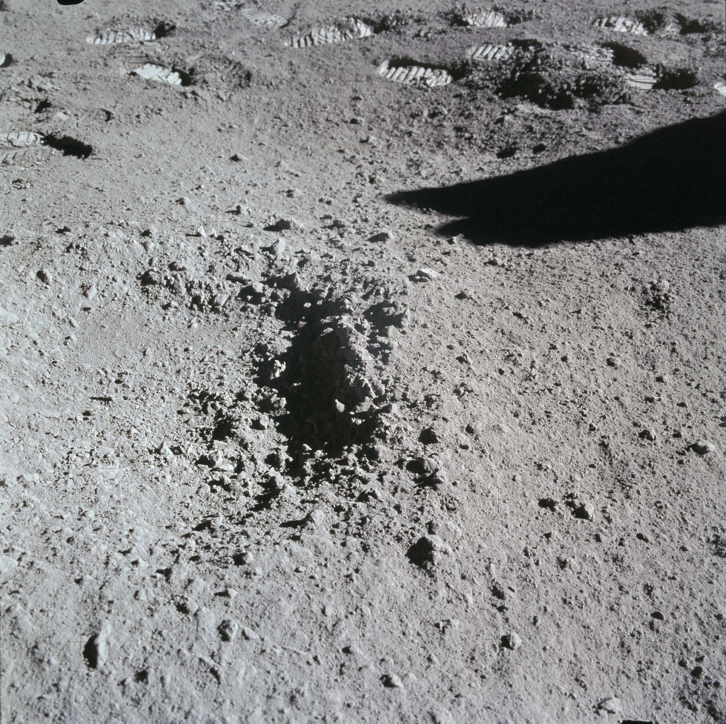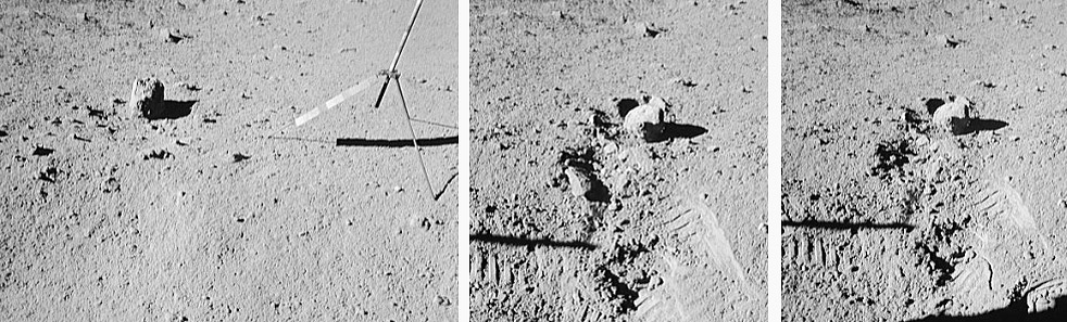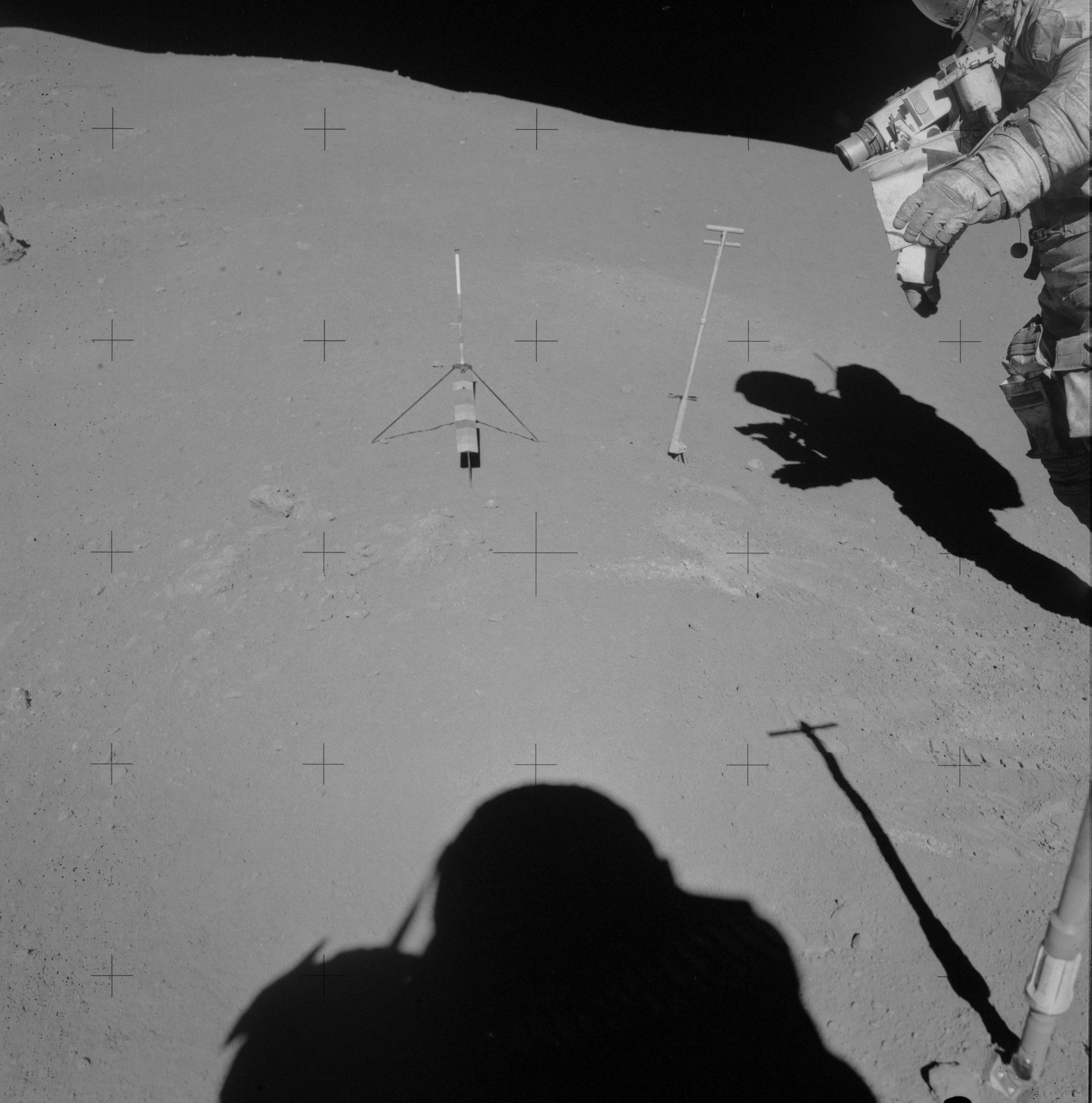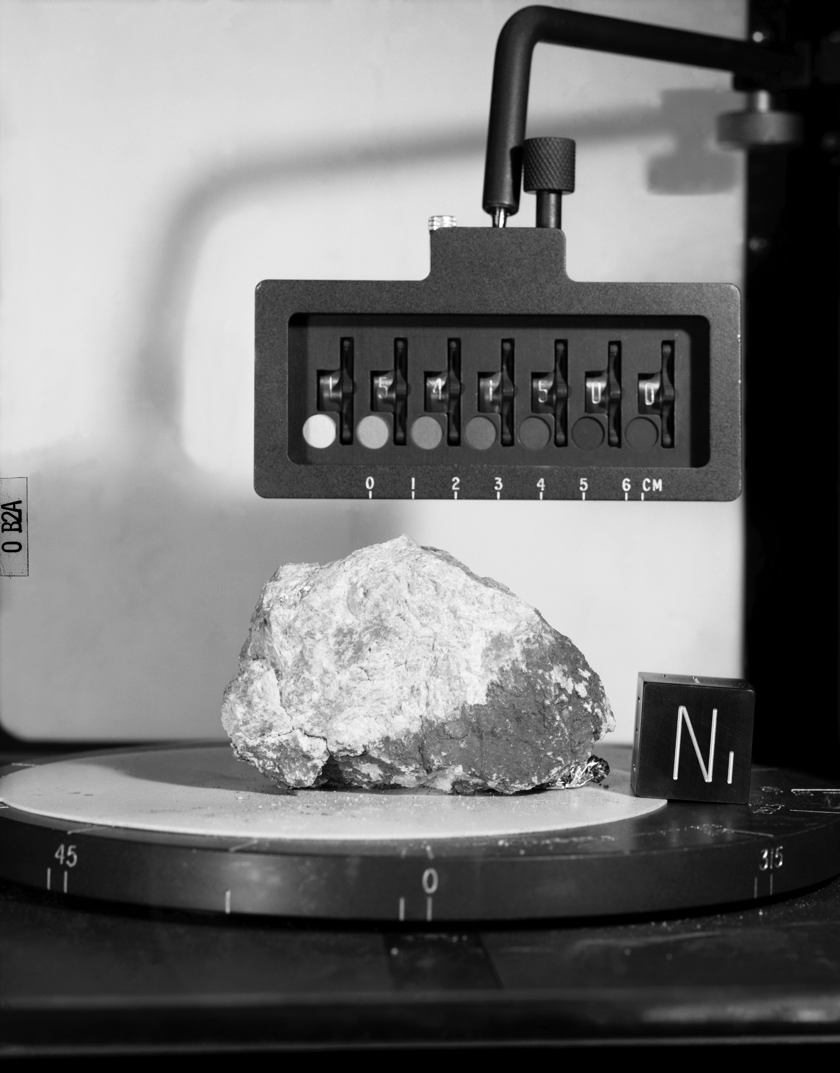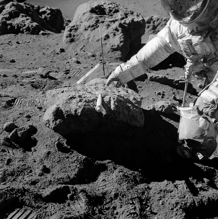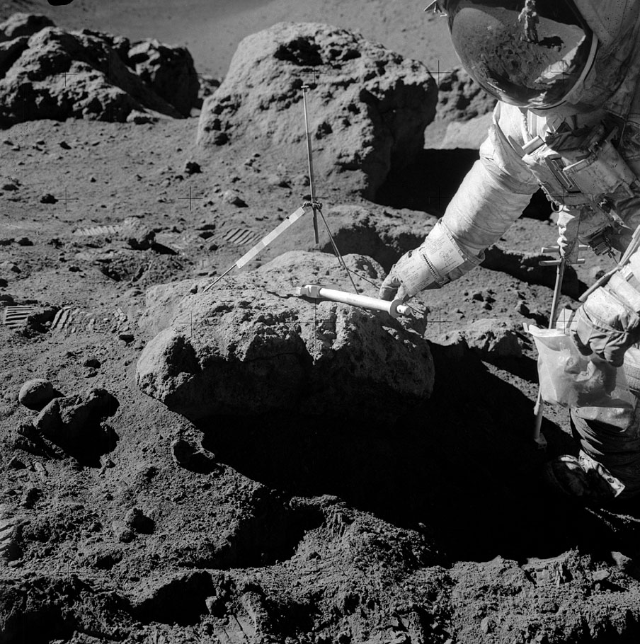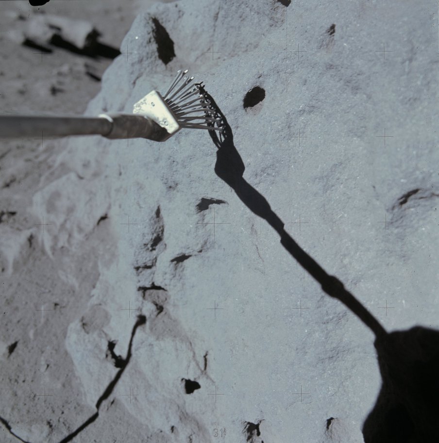 Second view of Great Scott. The cube at the lower right is one inch (2.54 cm) on eash side.S71-43392 (10 Mb or 0.5 Mb)