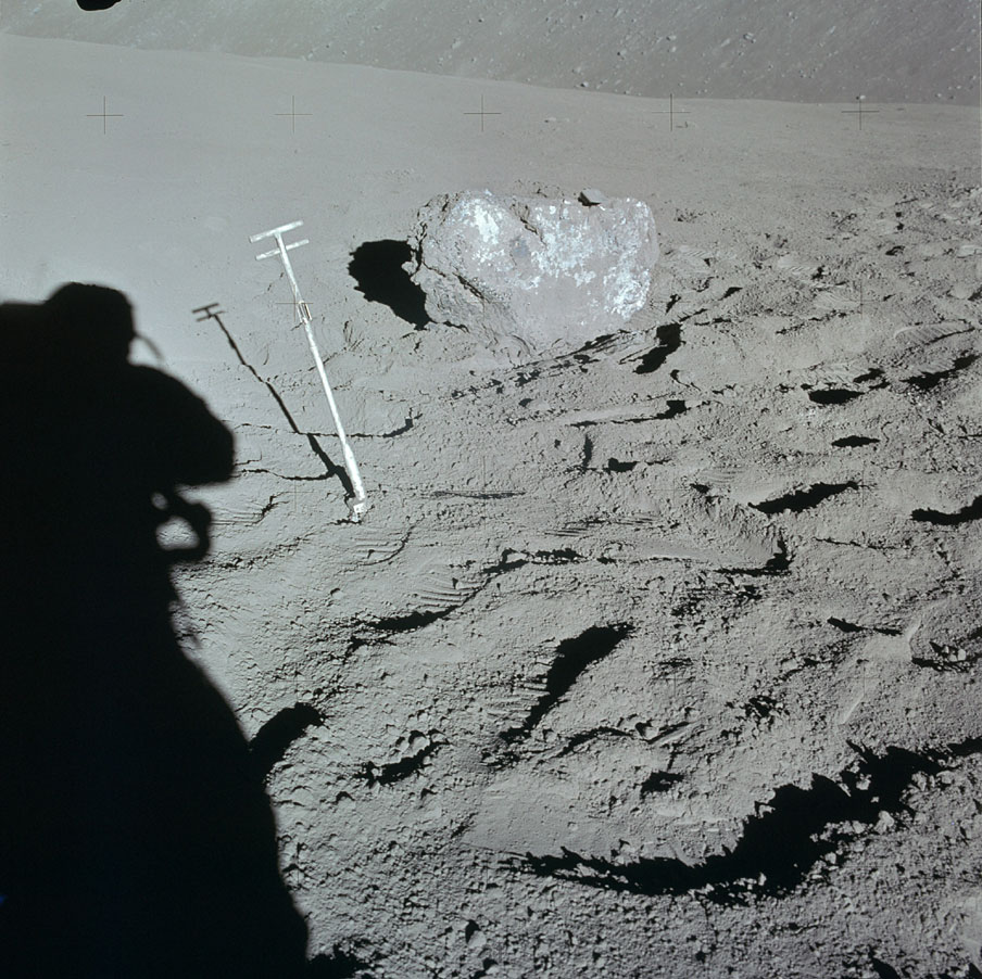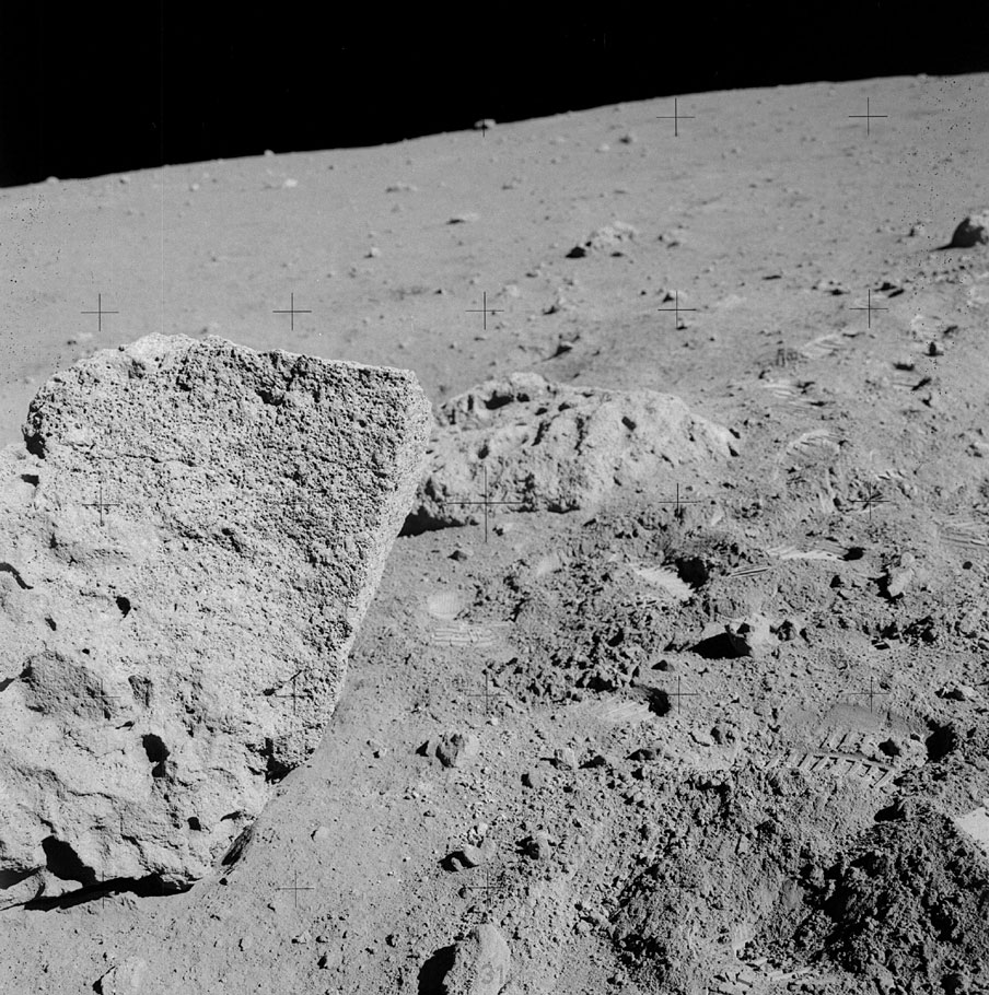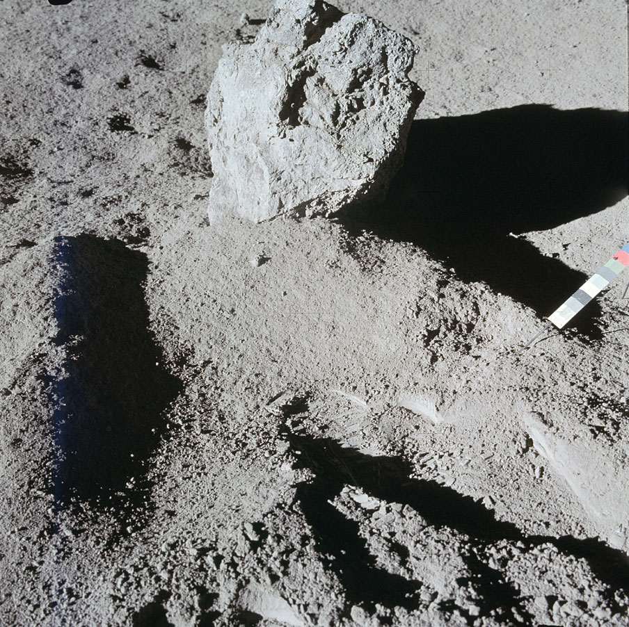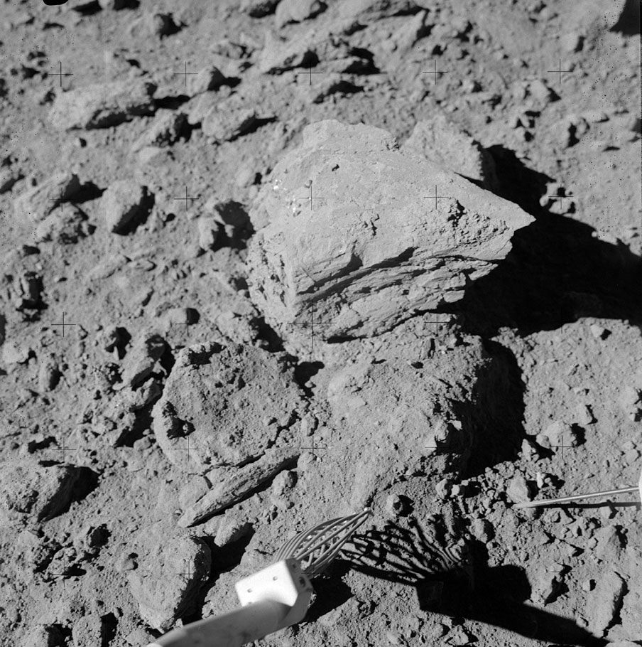 Eighth view of Great Scott. Black and white image. Similar to 43390, but with the rock rotated to the right relative to the camera position by about 45 degrees. The cube at the lower right is one inch (2.54 cm) on eash side.S71-46341 (1.5 Mb)
