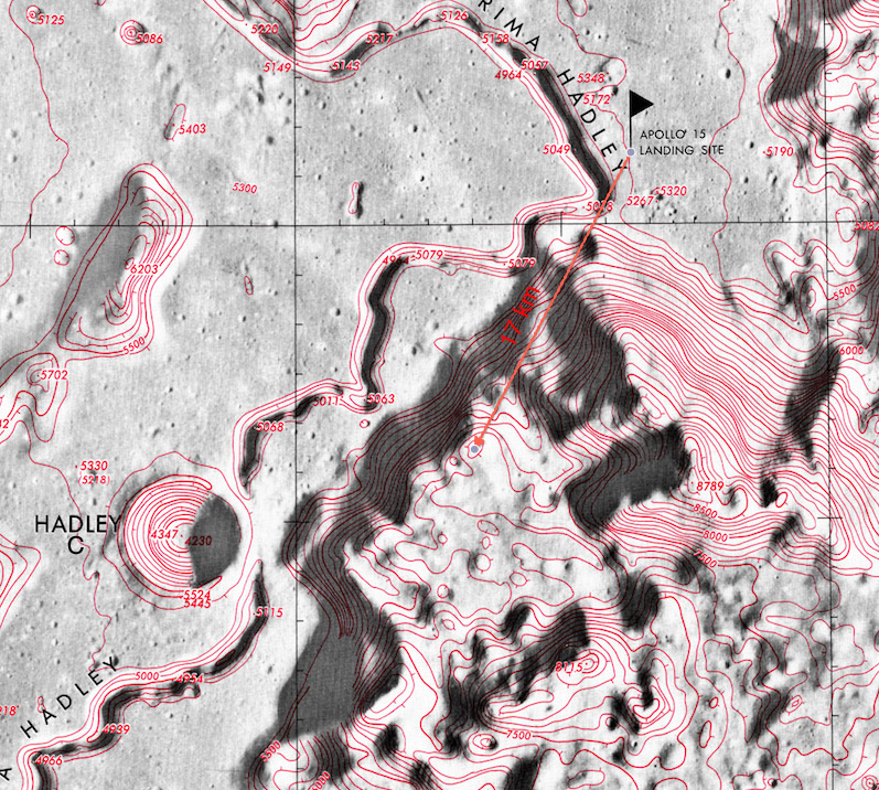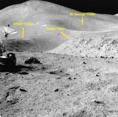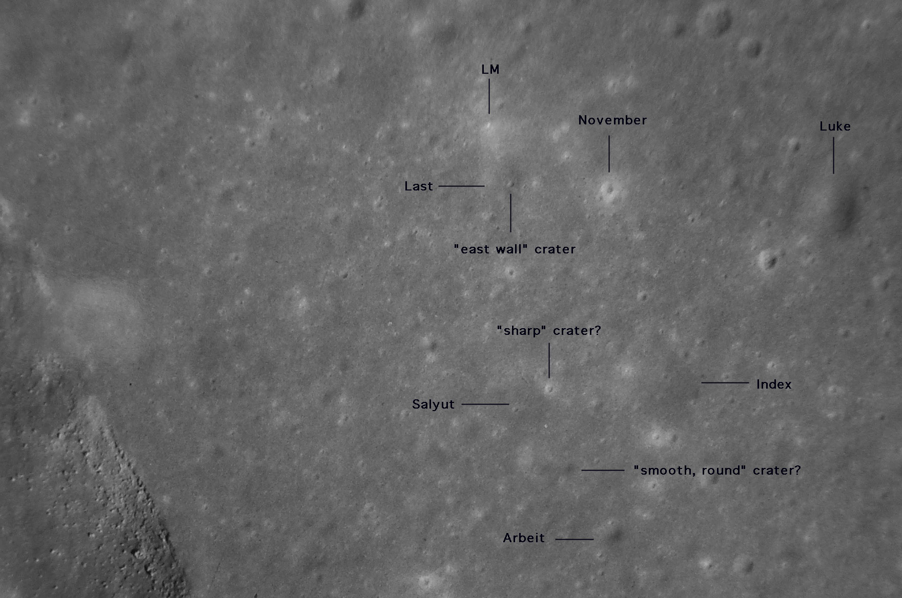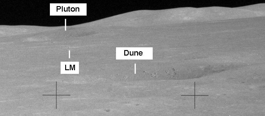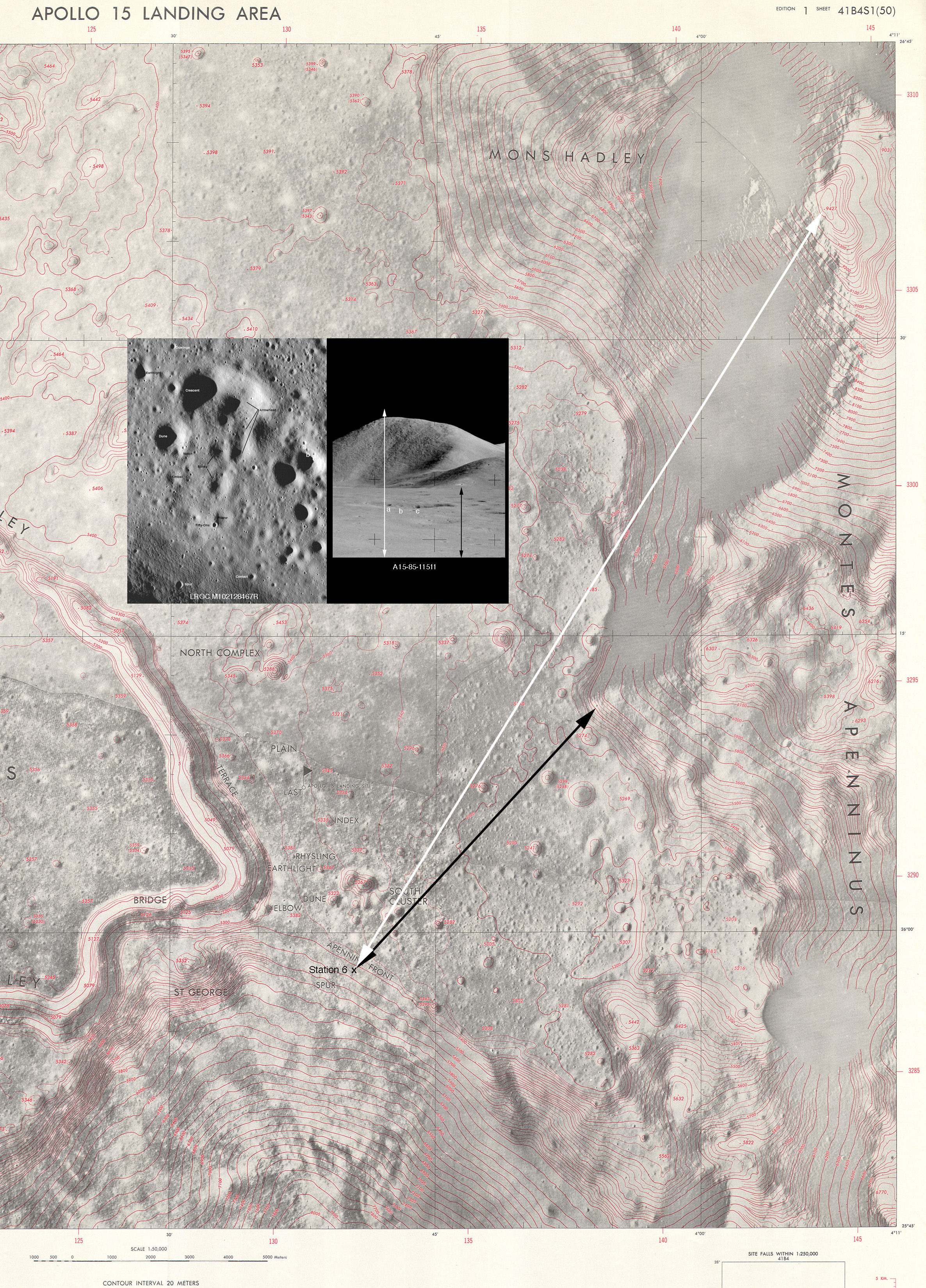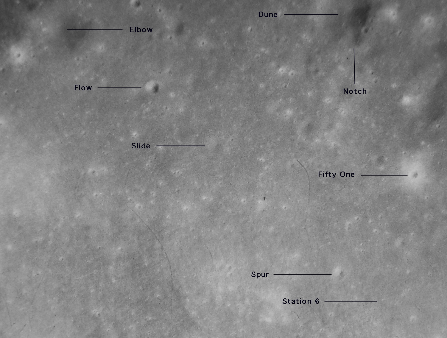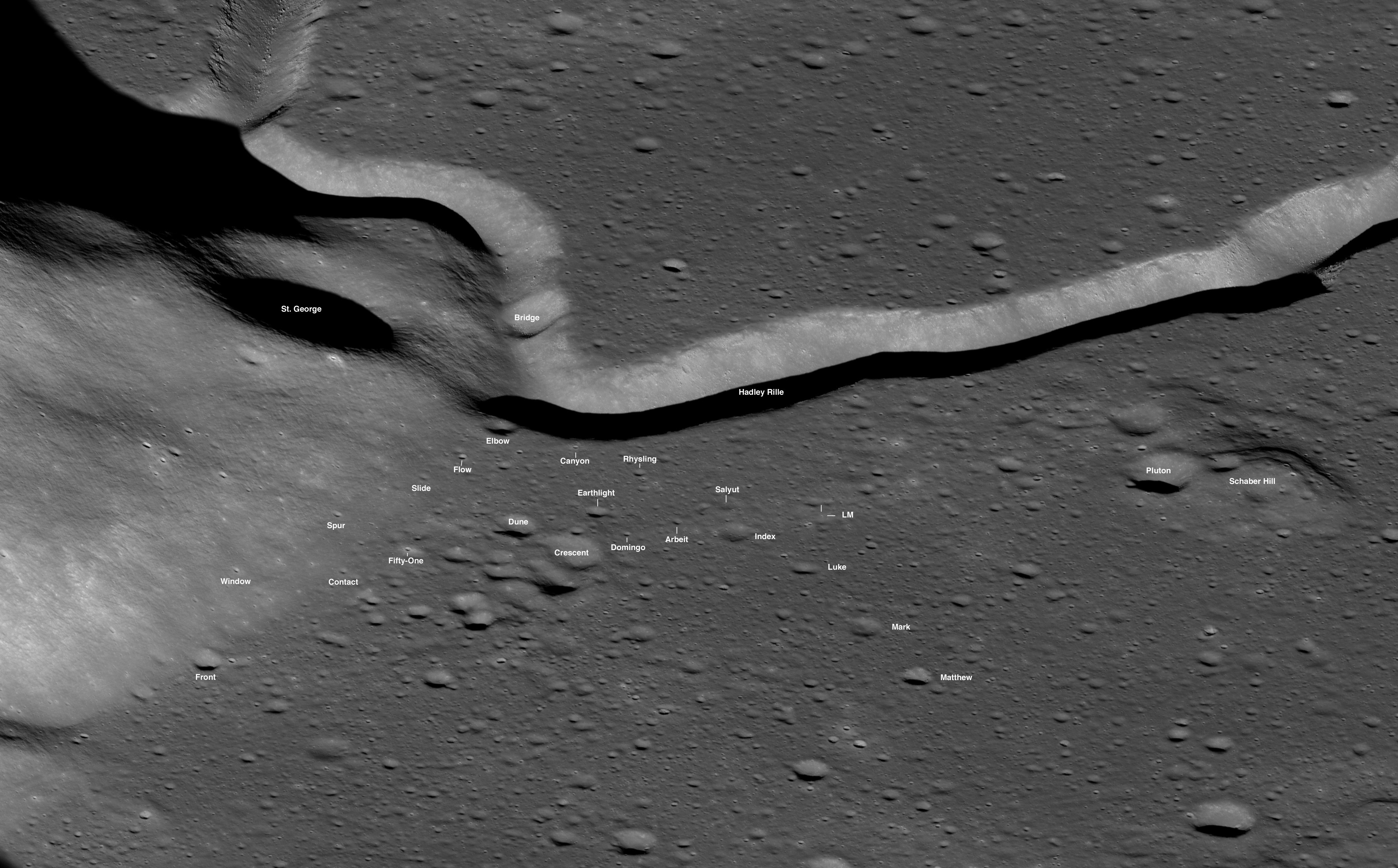 See, also, a labeled version ( 47 Mb ) with the Station 10 pinned down by triangulation of objects on the far wall of the rille identified by comparison between the LROC images and the 500-mm Hasselblad sequences Dave Scott took from Station 10.