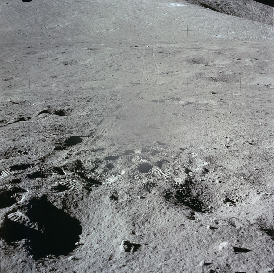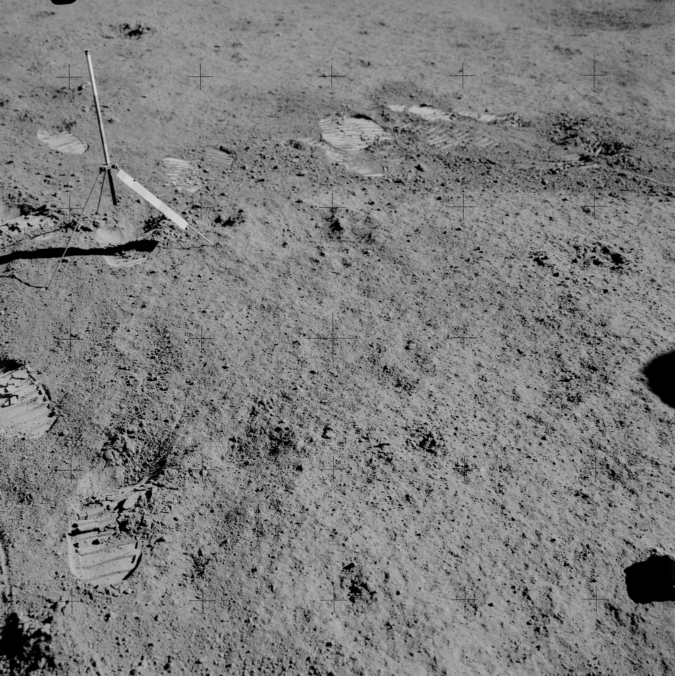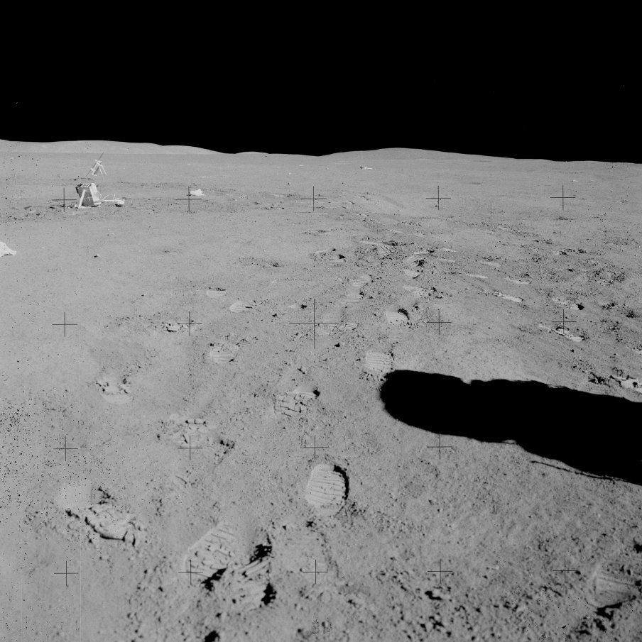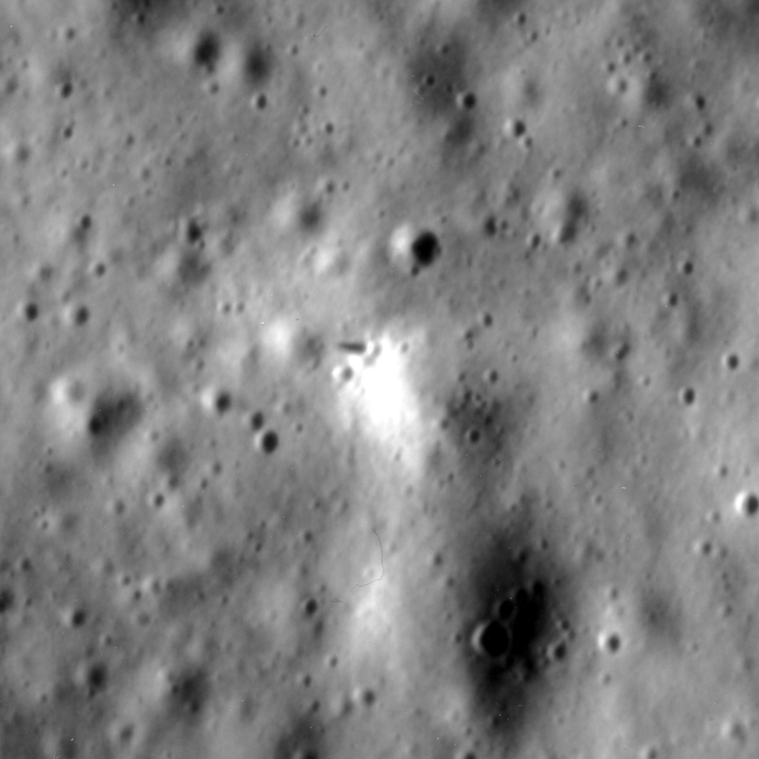 This image is immediately east of M102128467L. See, also, a labeled version (2.7 Mb). Labeled detail showing the LM and a link to the raw file (nacr00000ad9) are available at the LROC website13 July 2009 14:45:57 UTC; image M102135625L; Solar El/Az ; Full-image center Lat/Long 26.03/3.58; sub-LRO Lat/Long 26.03/3.73; LRO altitude 145 km, resolution 1.45 m/pixel ( 8 Mb )