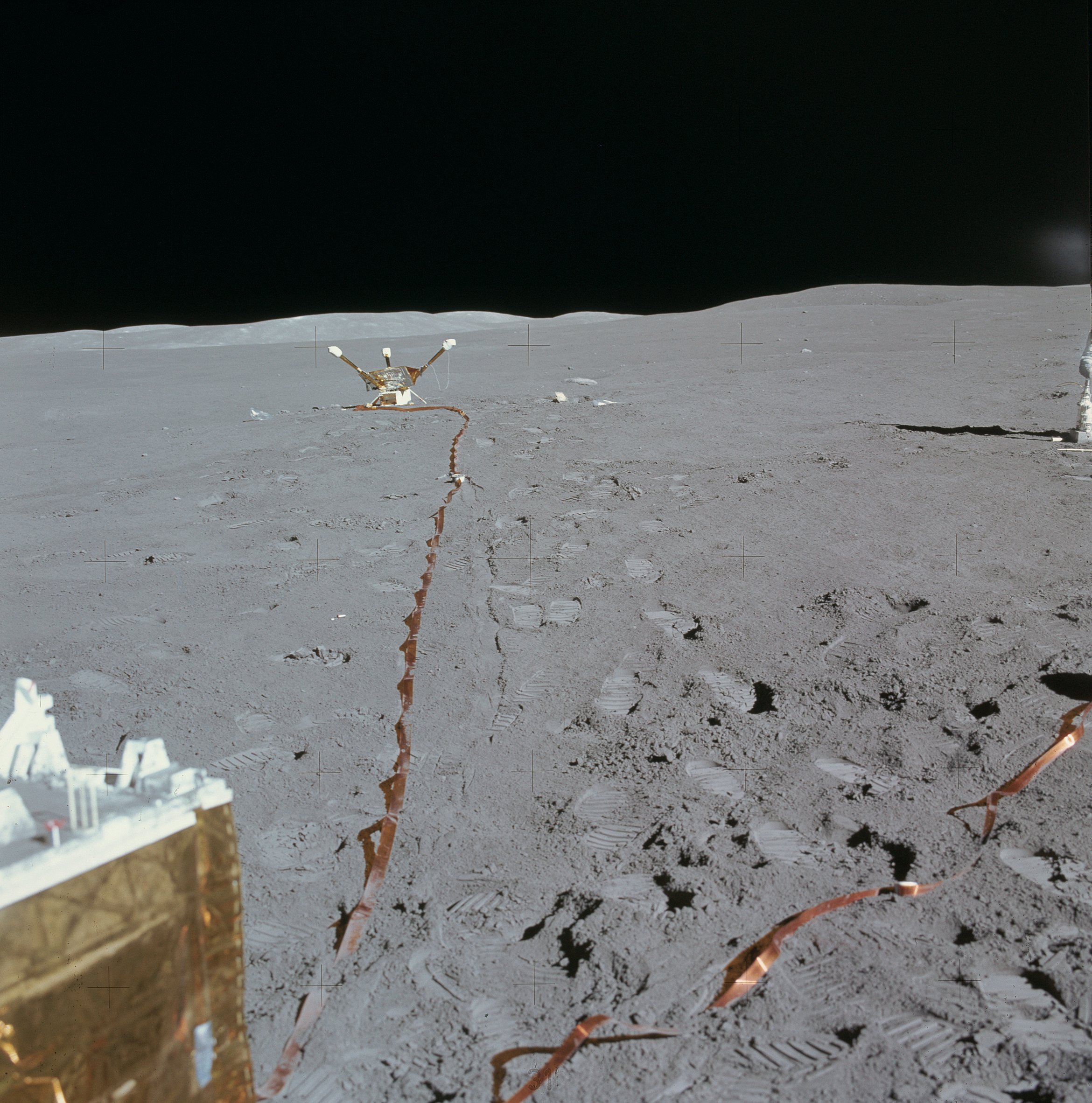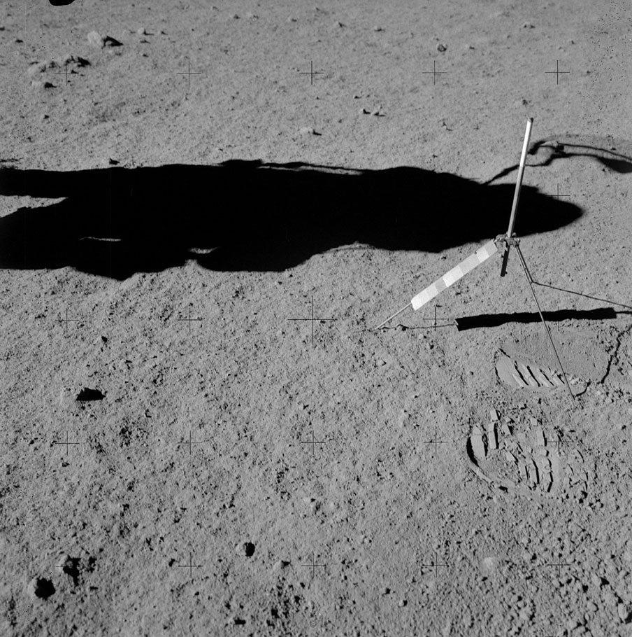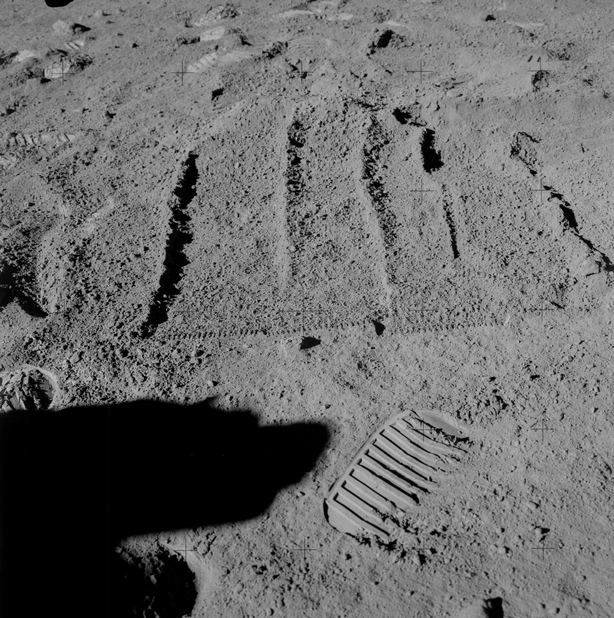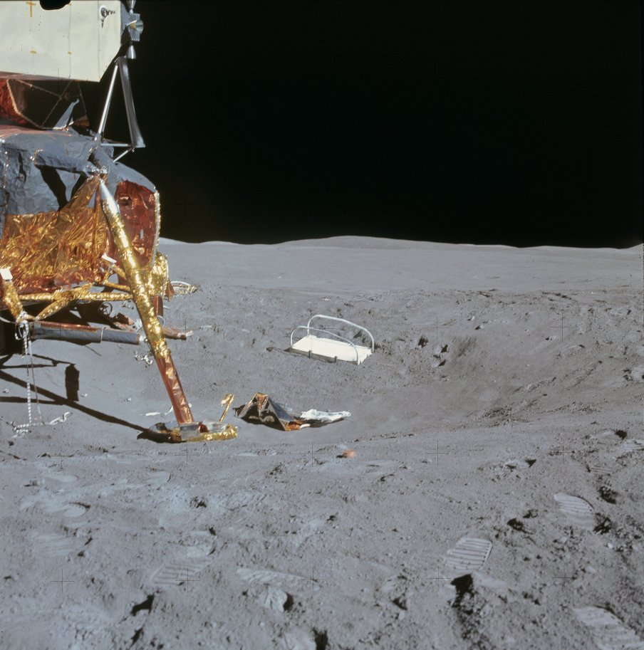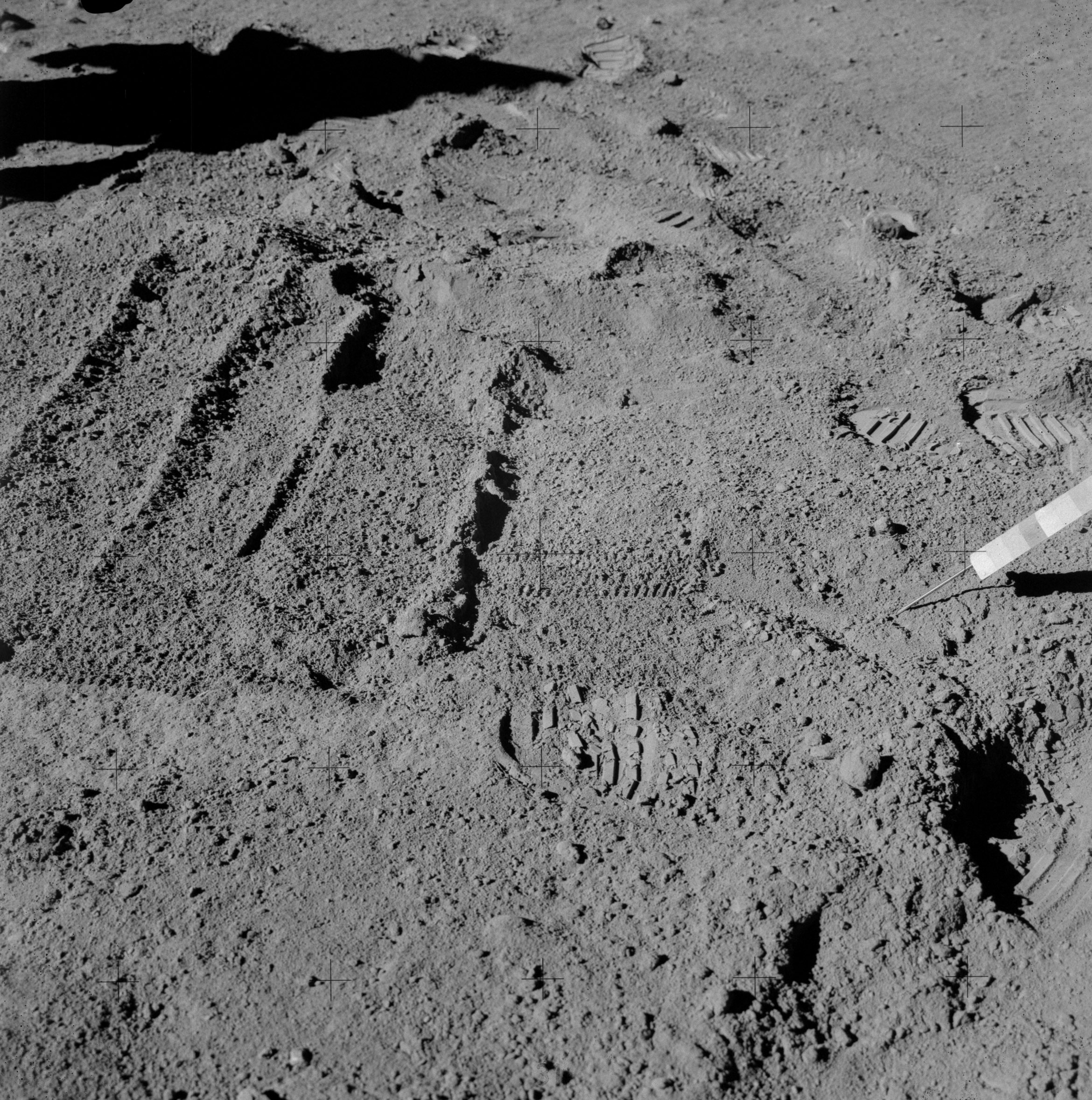 This image is immediately east of M102128467L. See, also, a labeled version (2.7 Mb). Labeled detail showing the LM and a link to the raw file (nacr00000ad9) are available at the LROC website13 July 2009 14:45:57 UTC; image M102135625L; Solar El/Az ; Full-image center Lat/Long 26.03/3.58; sub-LRO Lat/Long 26.03/3.73; LRO altitude 145 km, resolution 1.45 m/pixel ( 8 Mb )