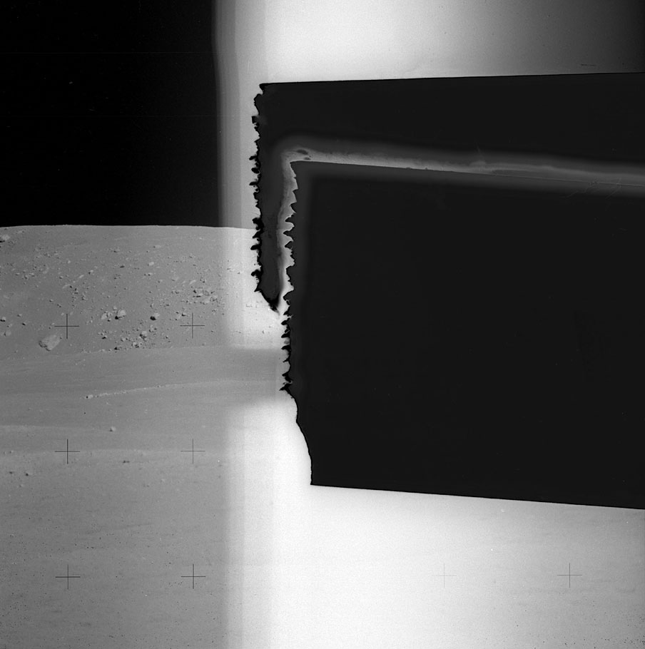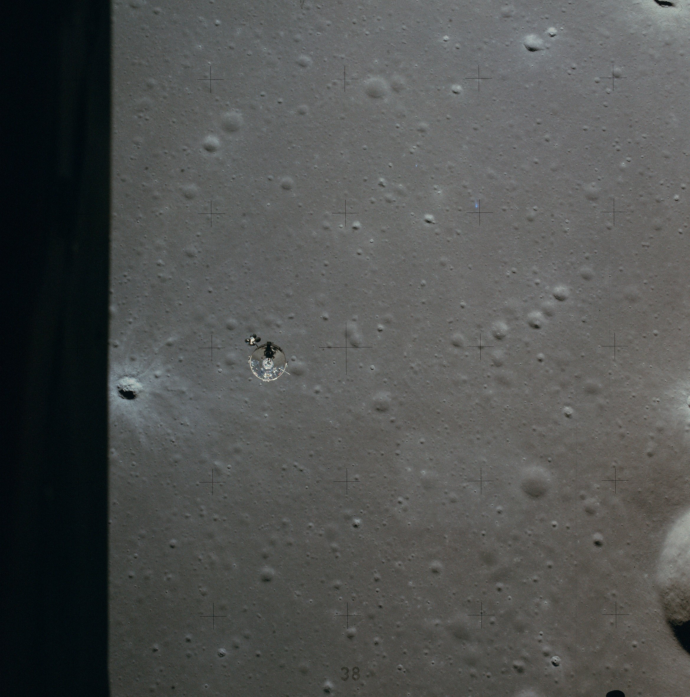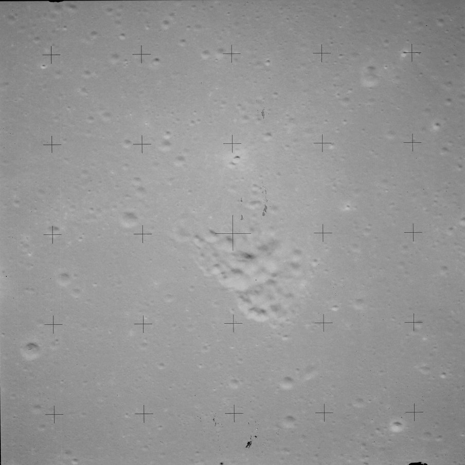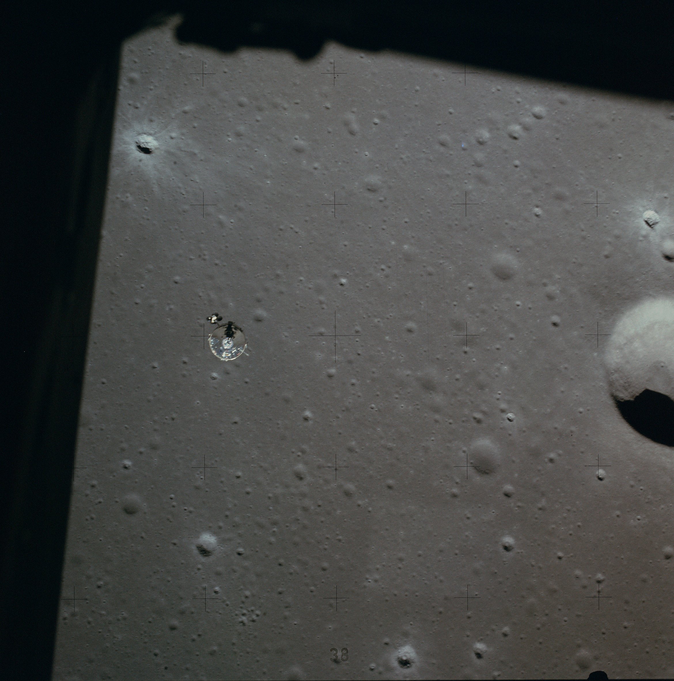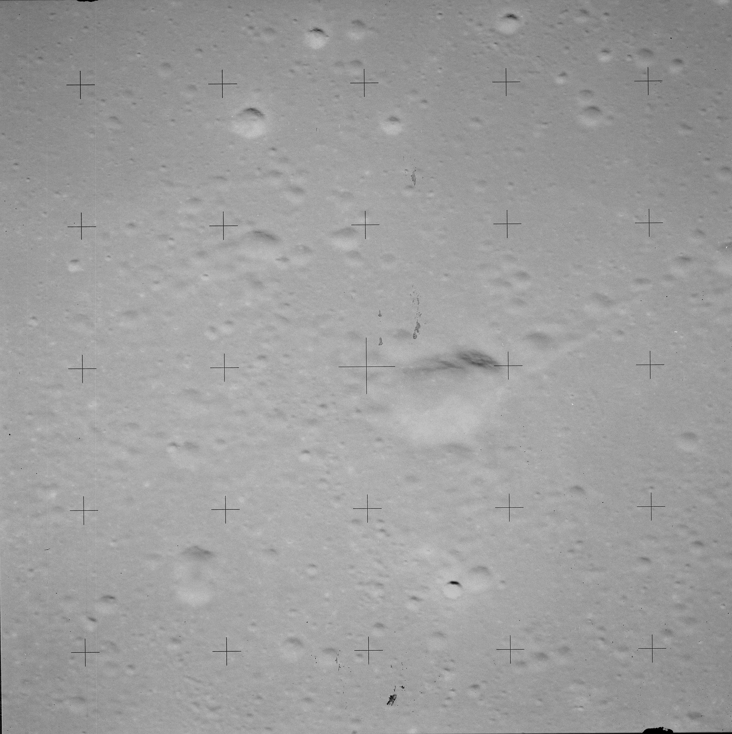 This frame was shot on 1 August 1971 at 21:32 UTC, with the camera looking down vertically. The Sun was 33 degrees above the eastern horizon. Higher resolution versions of M-1676 available from the ASU Apollo Image Archive. Frames 1675 and 1677 also include the landing site. Scan from the original film courtesy NASA/JSC/Arizona State University.Rev. 38 Pan Camera Frame 9798, LM Detail ( 346k )