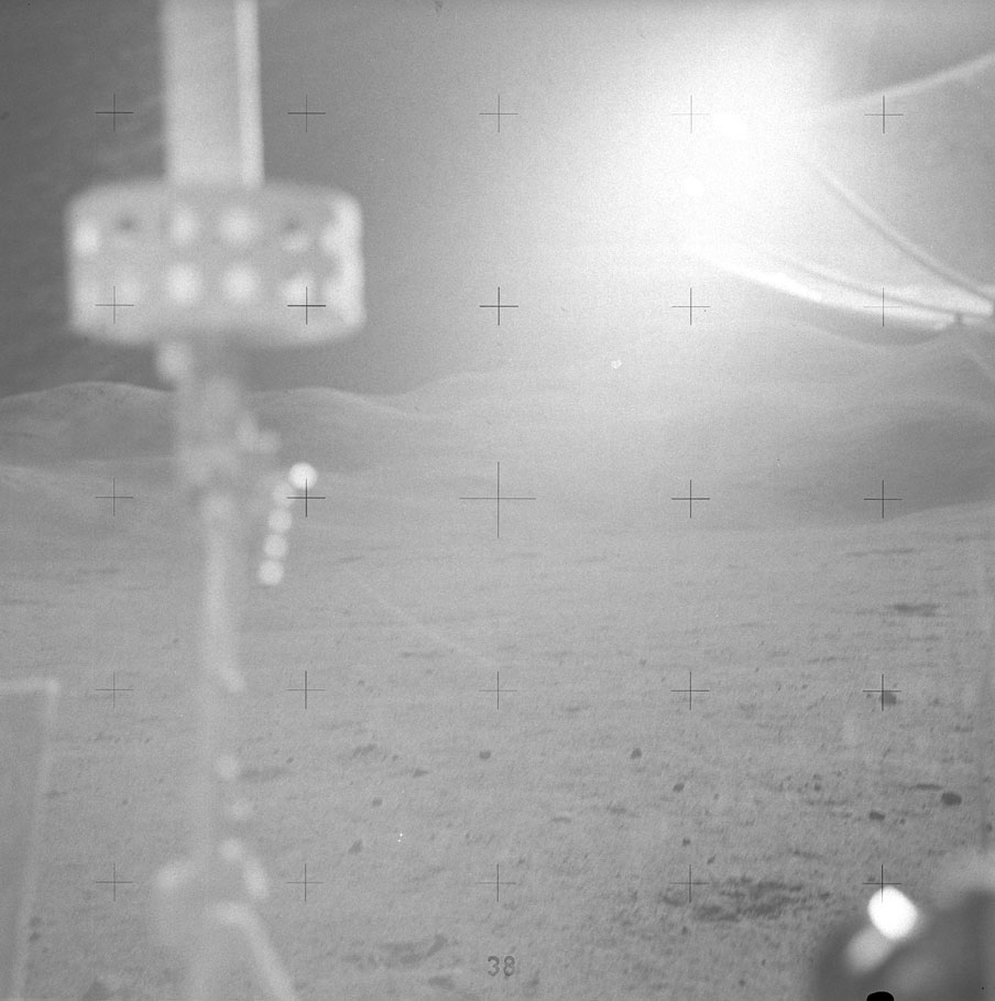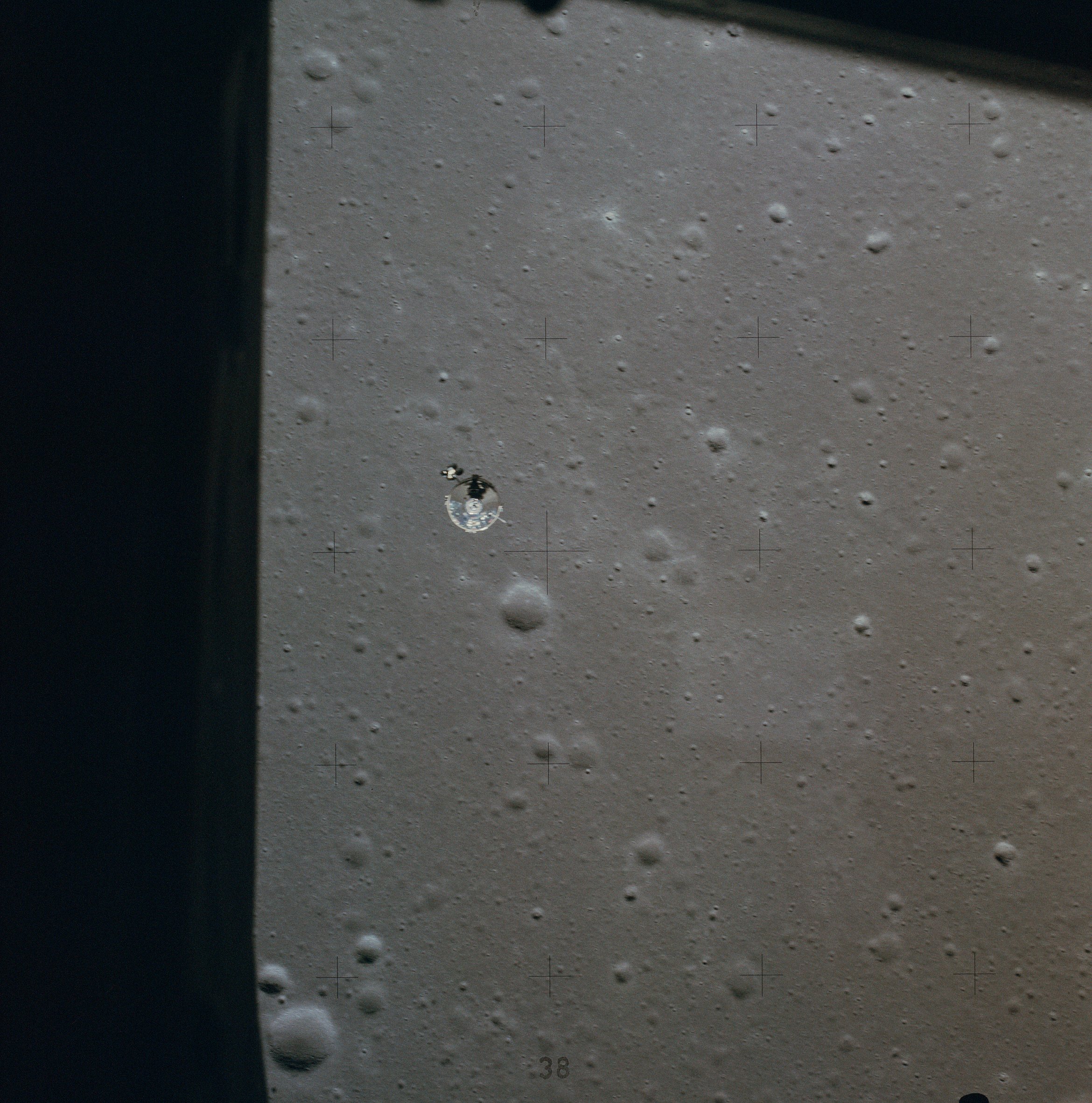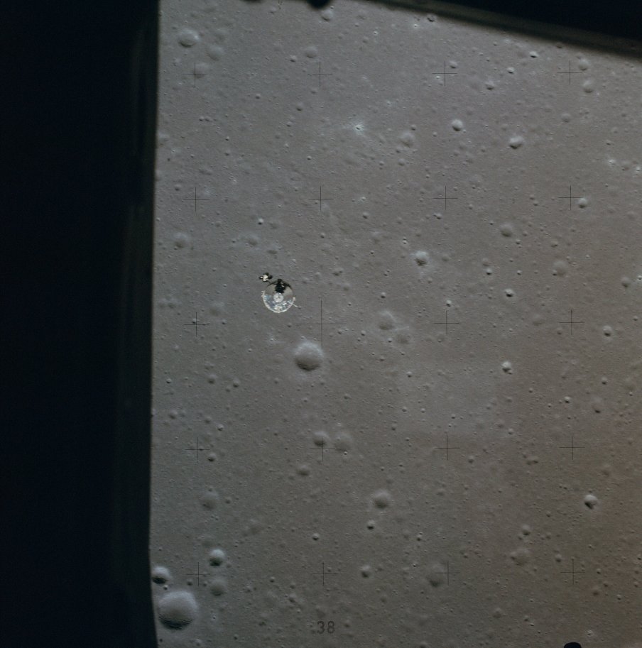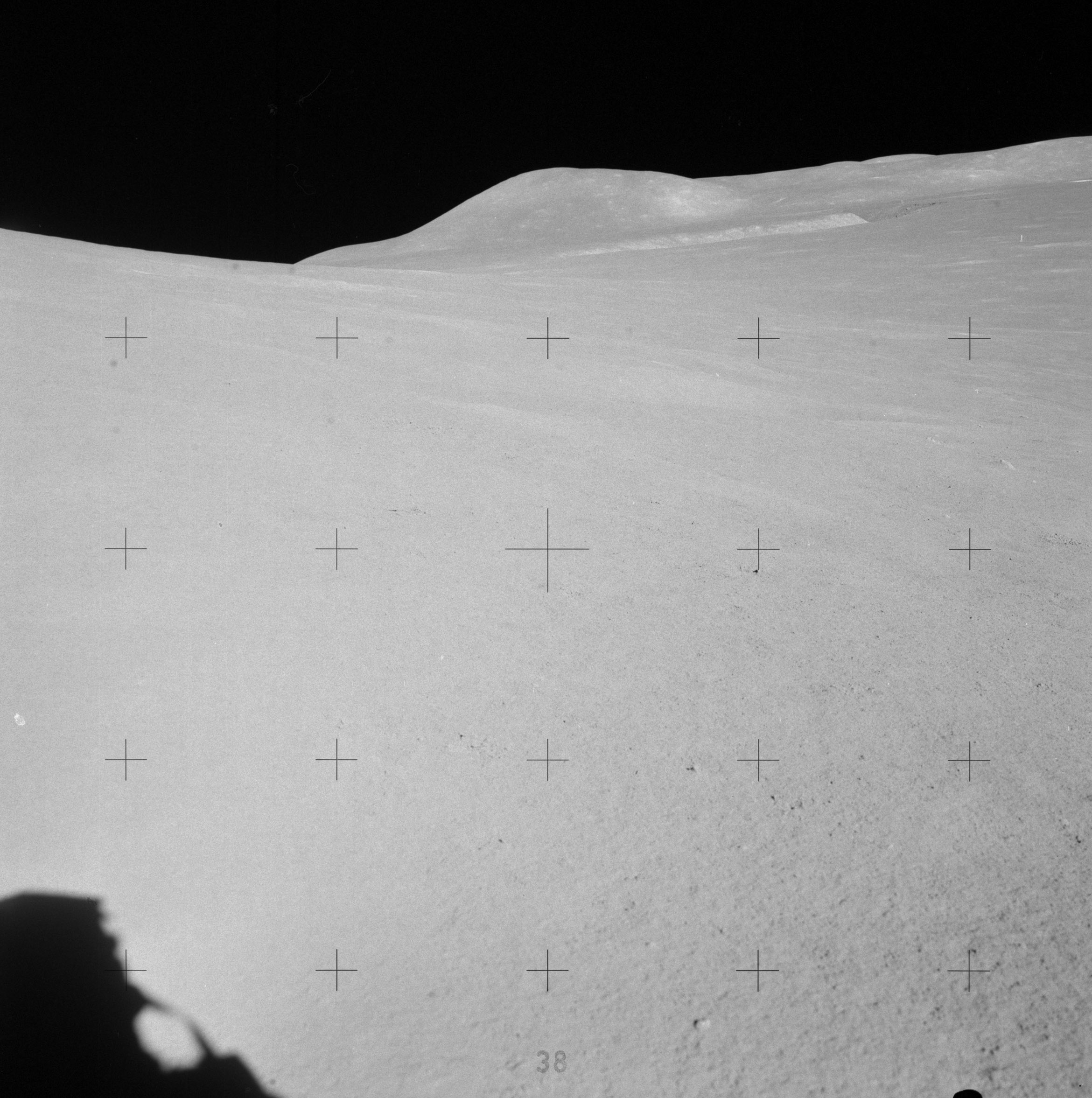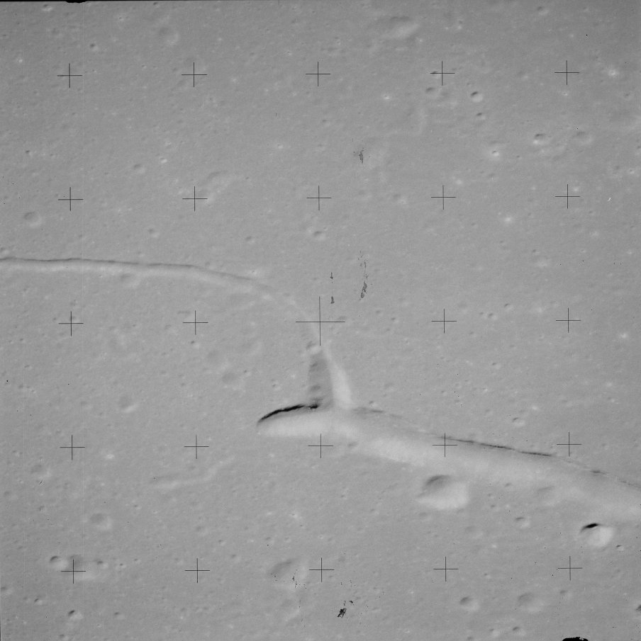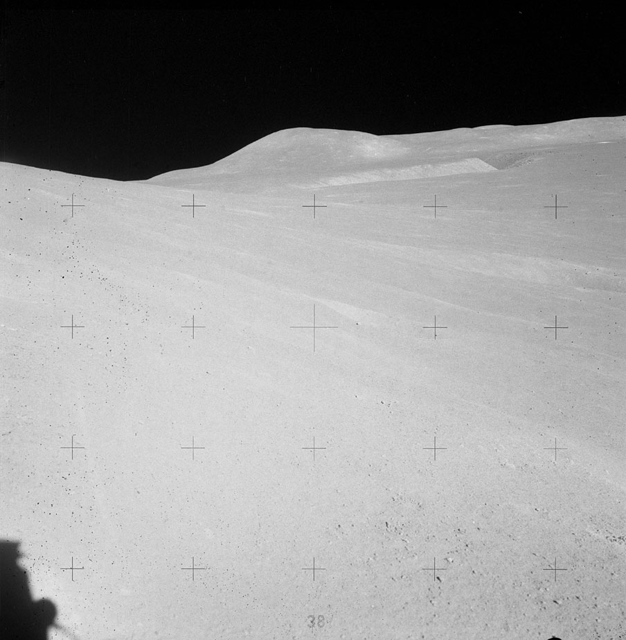 This frame was shot on 1 August 1971 at 21:32 UTC, with the camera looking down vertically. The Sun was 33 degrees above the eastern horizon. Higher resolution versions of M-1676 available from the ASU Apollo Image Archive. Frames 1675 and 1677 also include the landing site. Scan from the original film courtesy NASA/JSC/Arizona State University.Rev. 38 Pan Camera Frame 9798, LM Detail ( 346k )