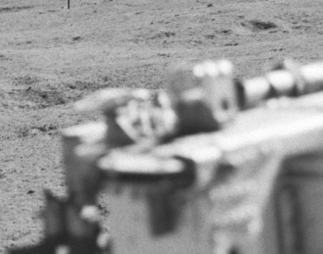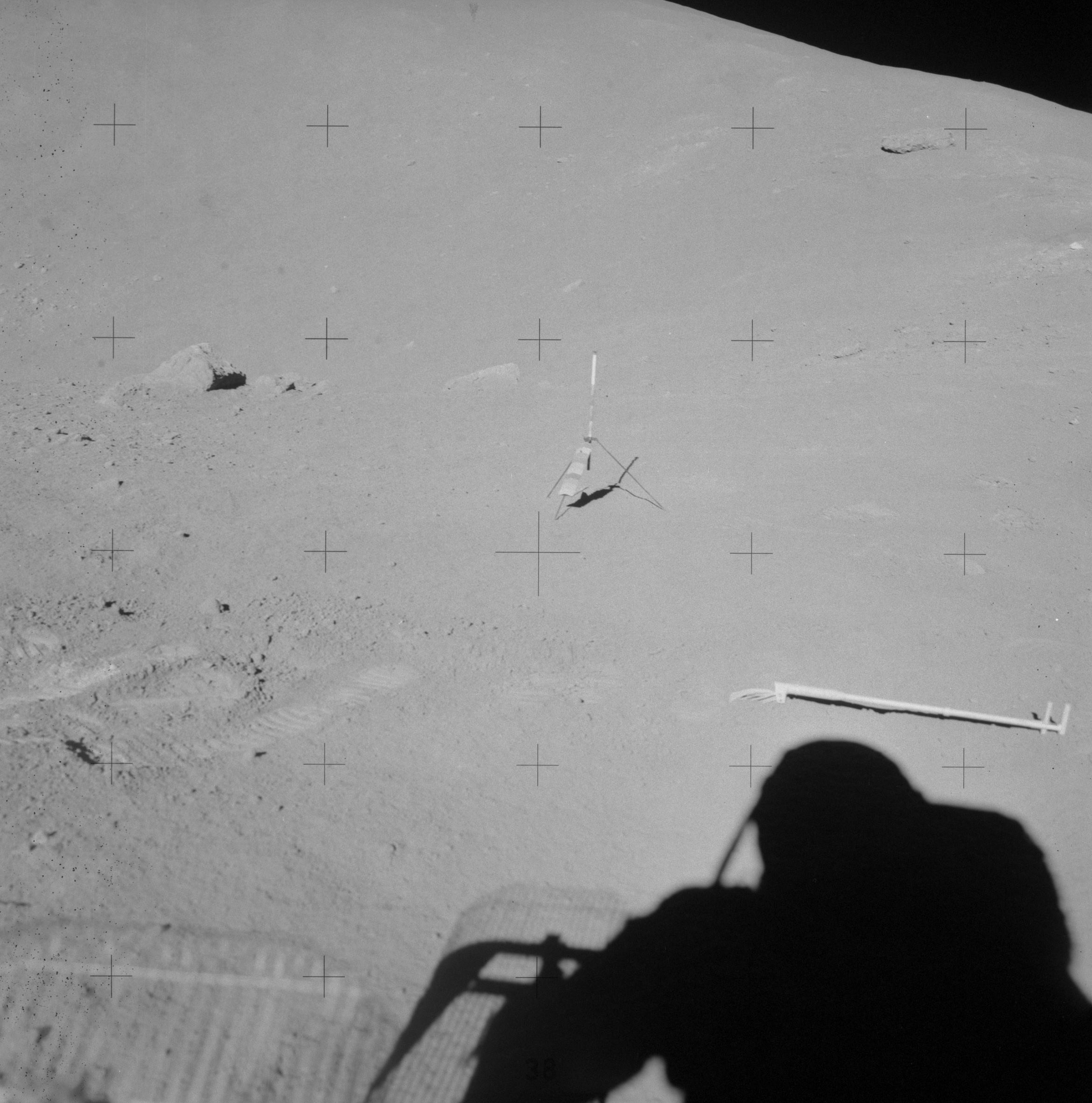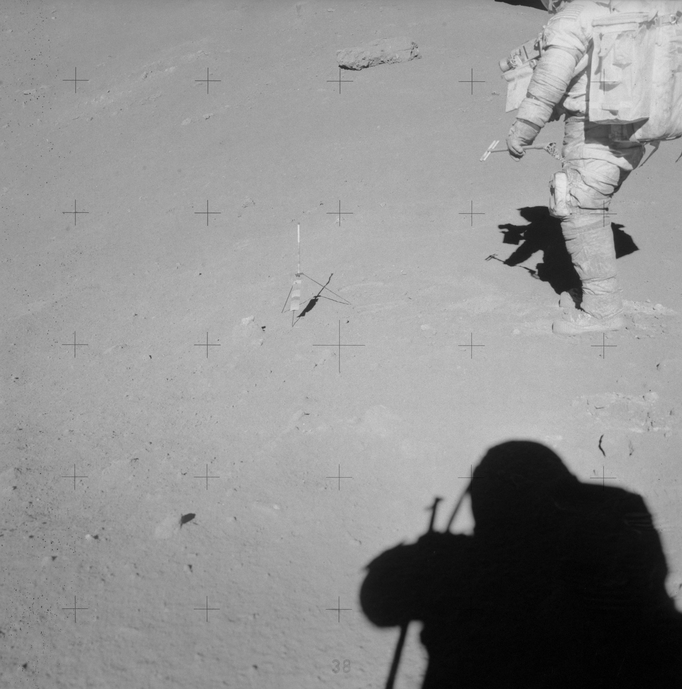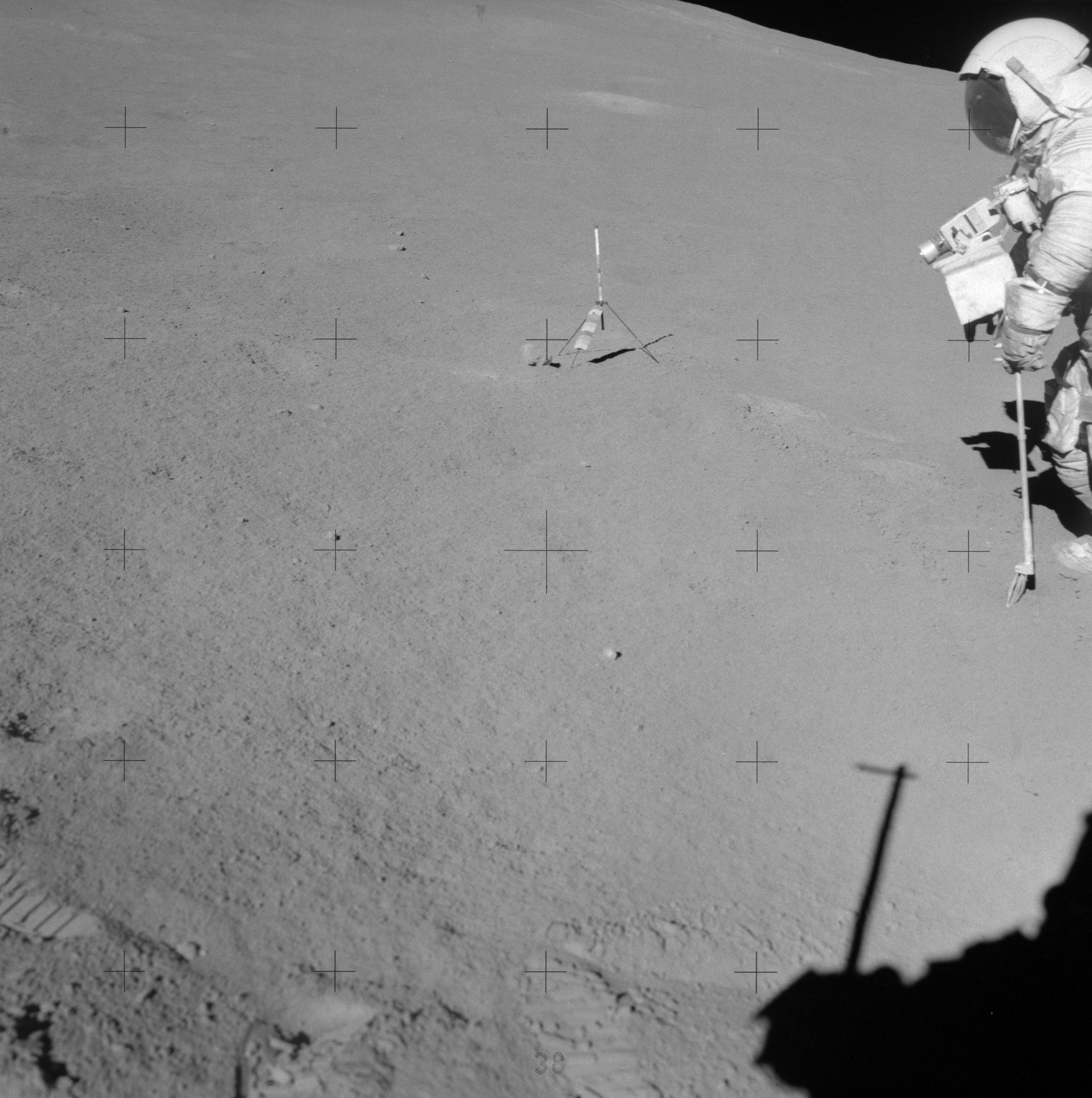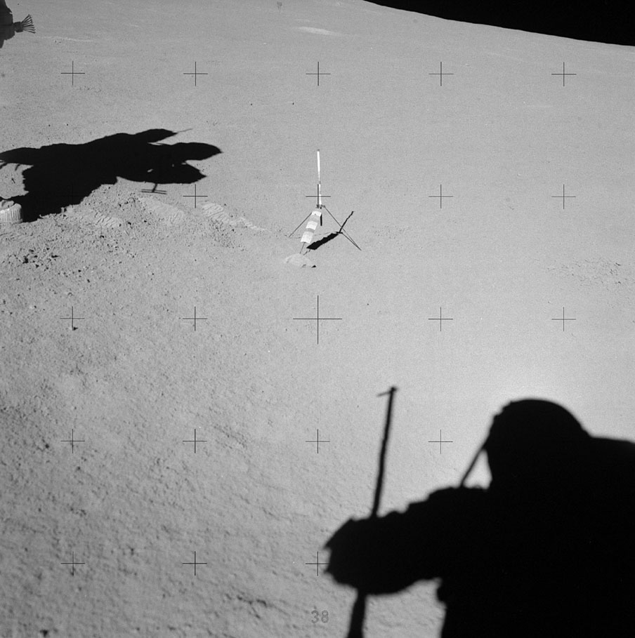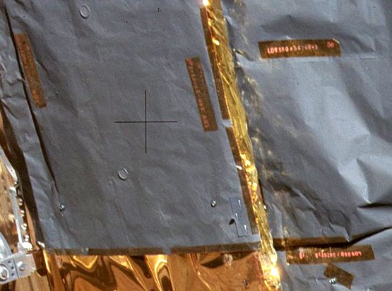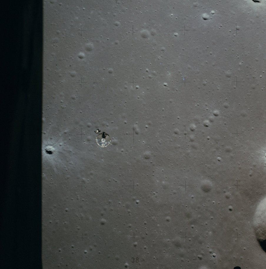 This frame was shot on 1 August 1971 at 21:32 UTC, with the camera looking down vertically. The Sun was 33 degrees above the eastern horizon. Higher resolution versions of M-1676 available from the ASU Apollo Image Archive. Frames 1675 and 1677 also include the landing site. Scan from the original film courtesy NASA/JSC/Arizona State University.Rev. 38 Pan Camera Frame 9798, LM Detail ( 346k )