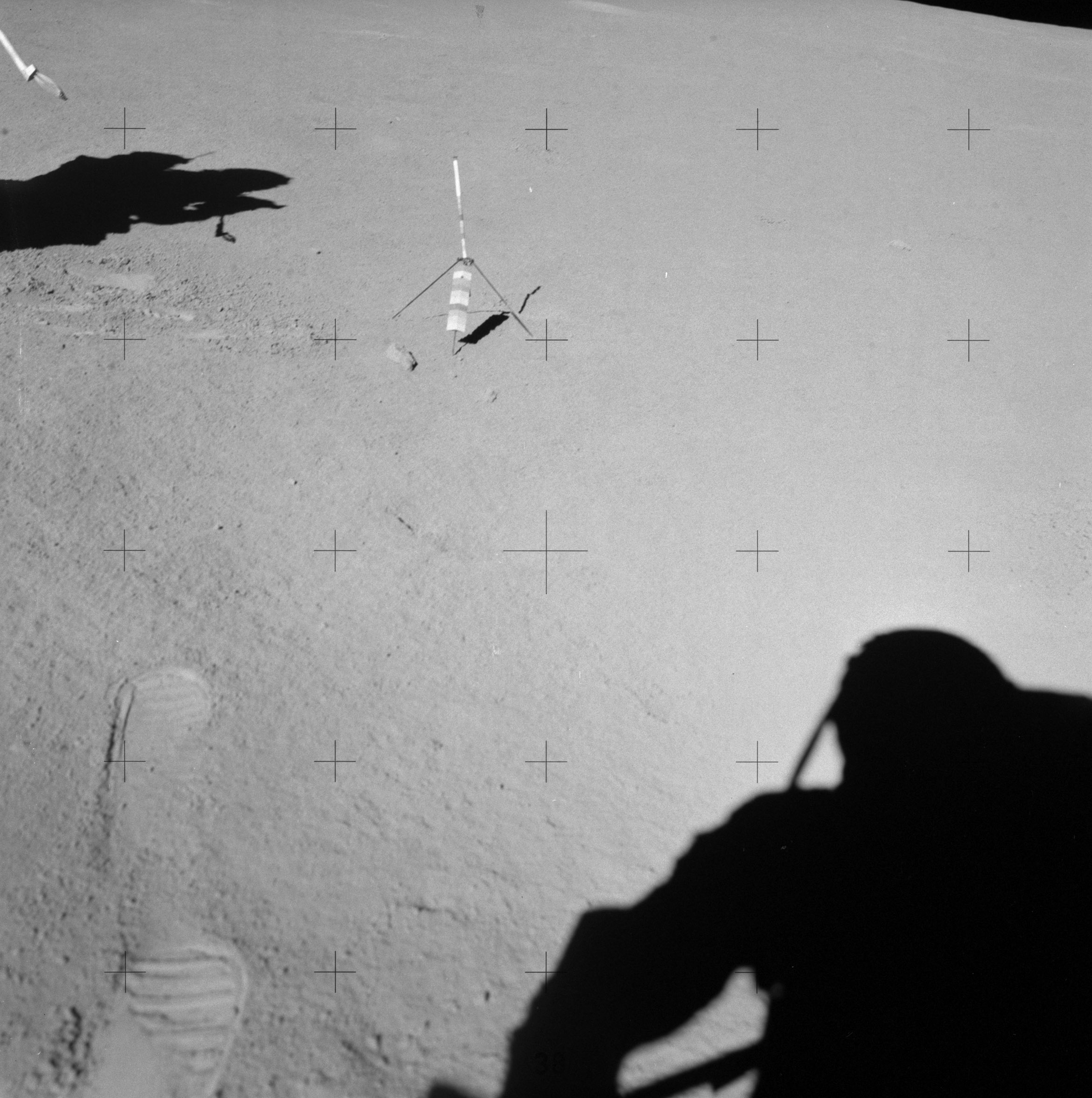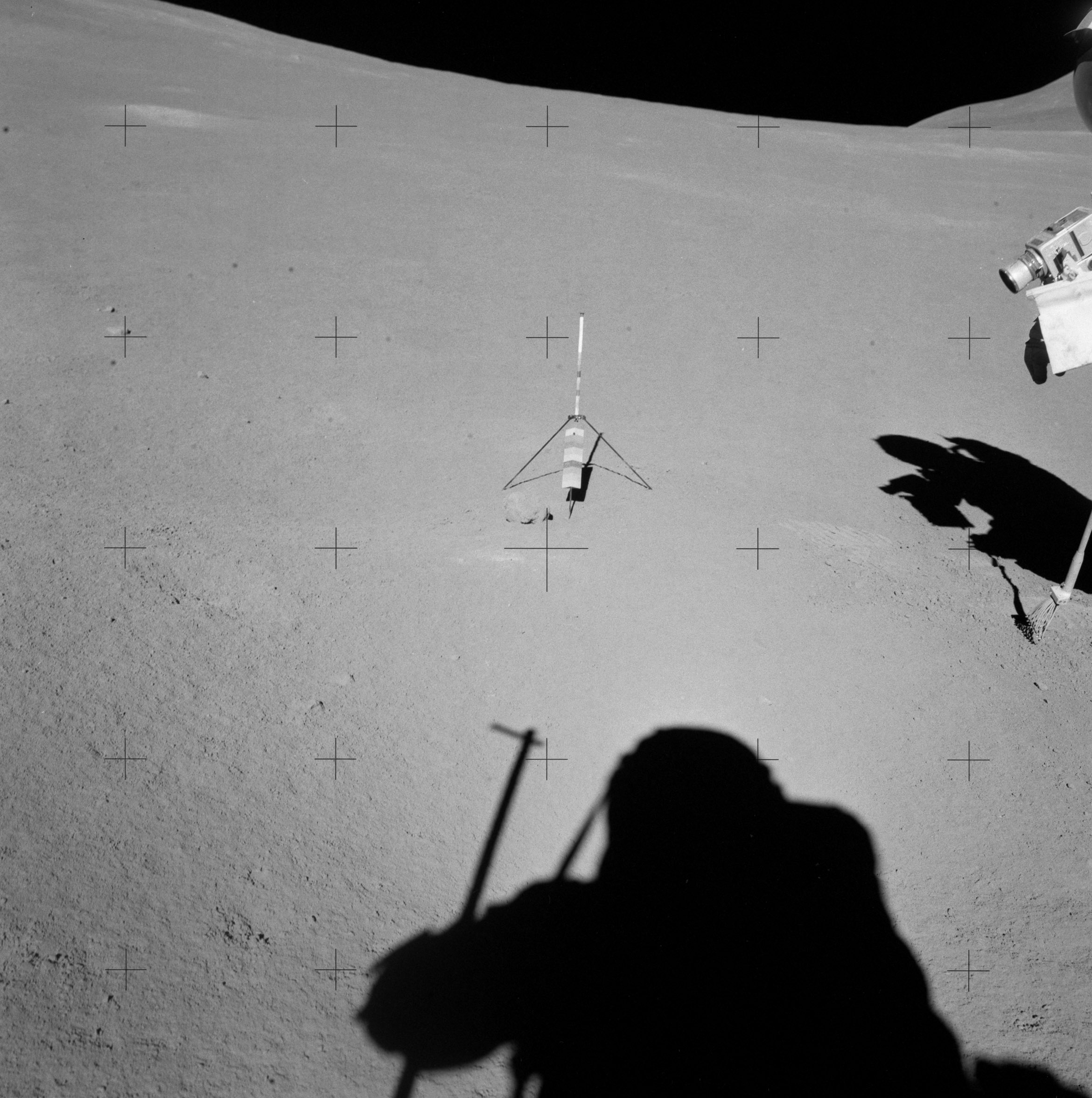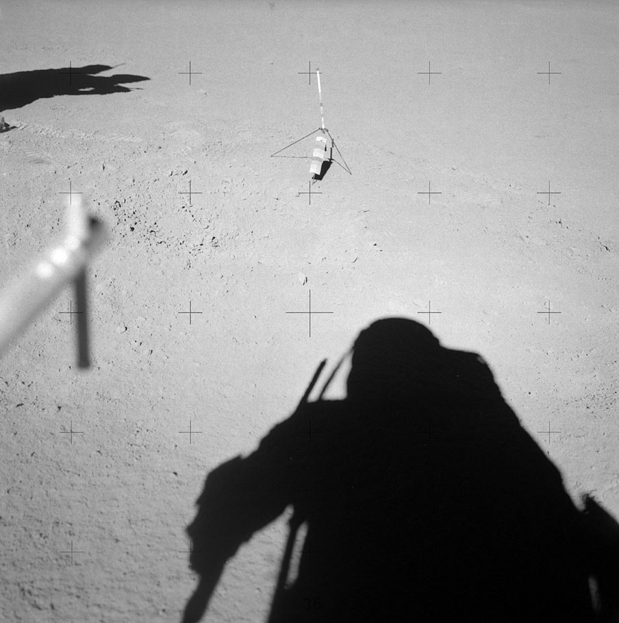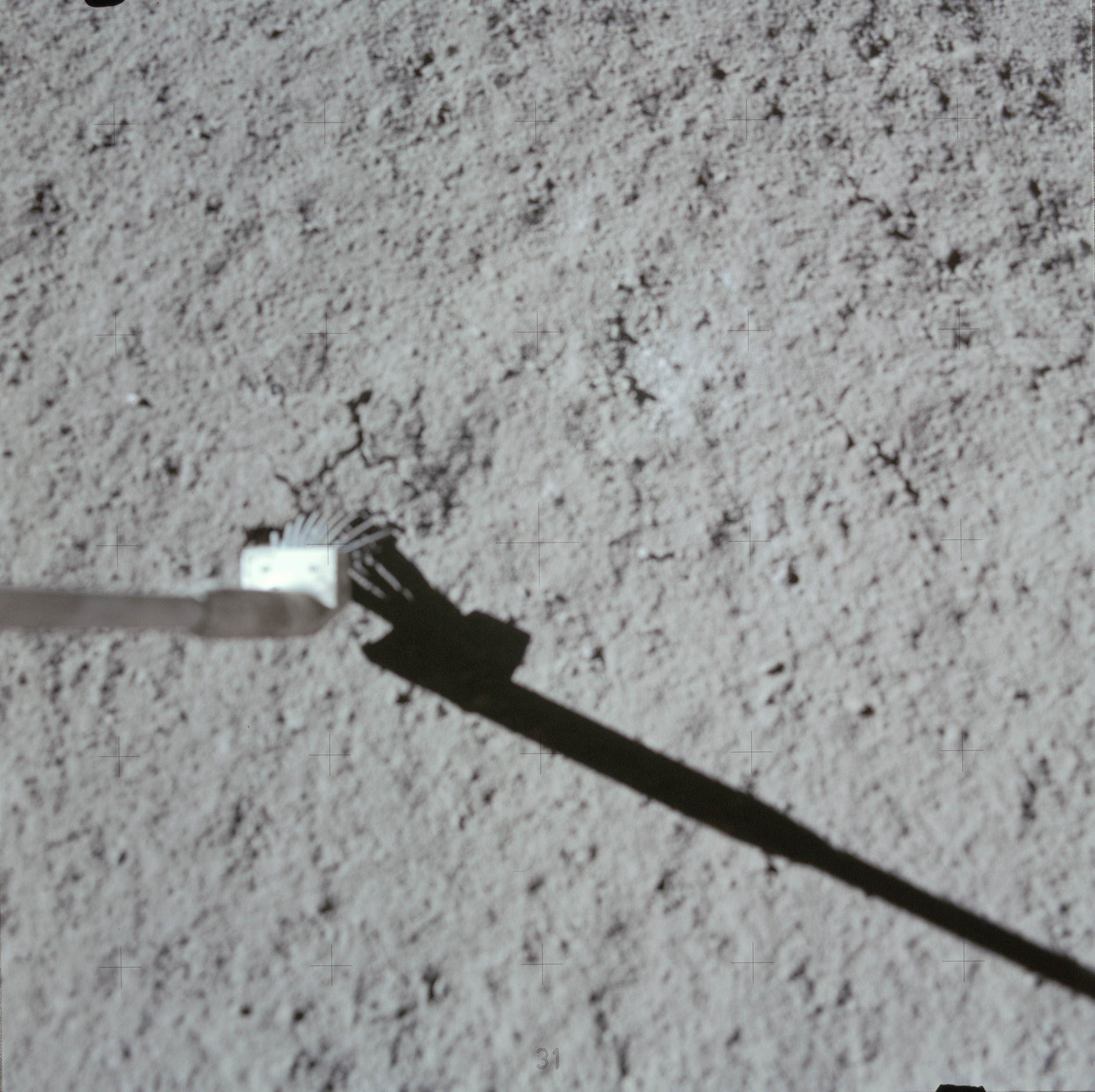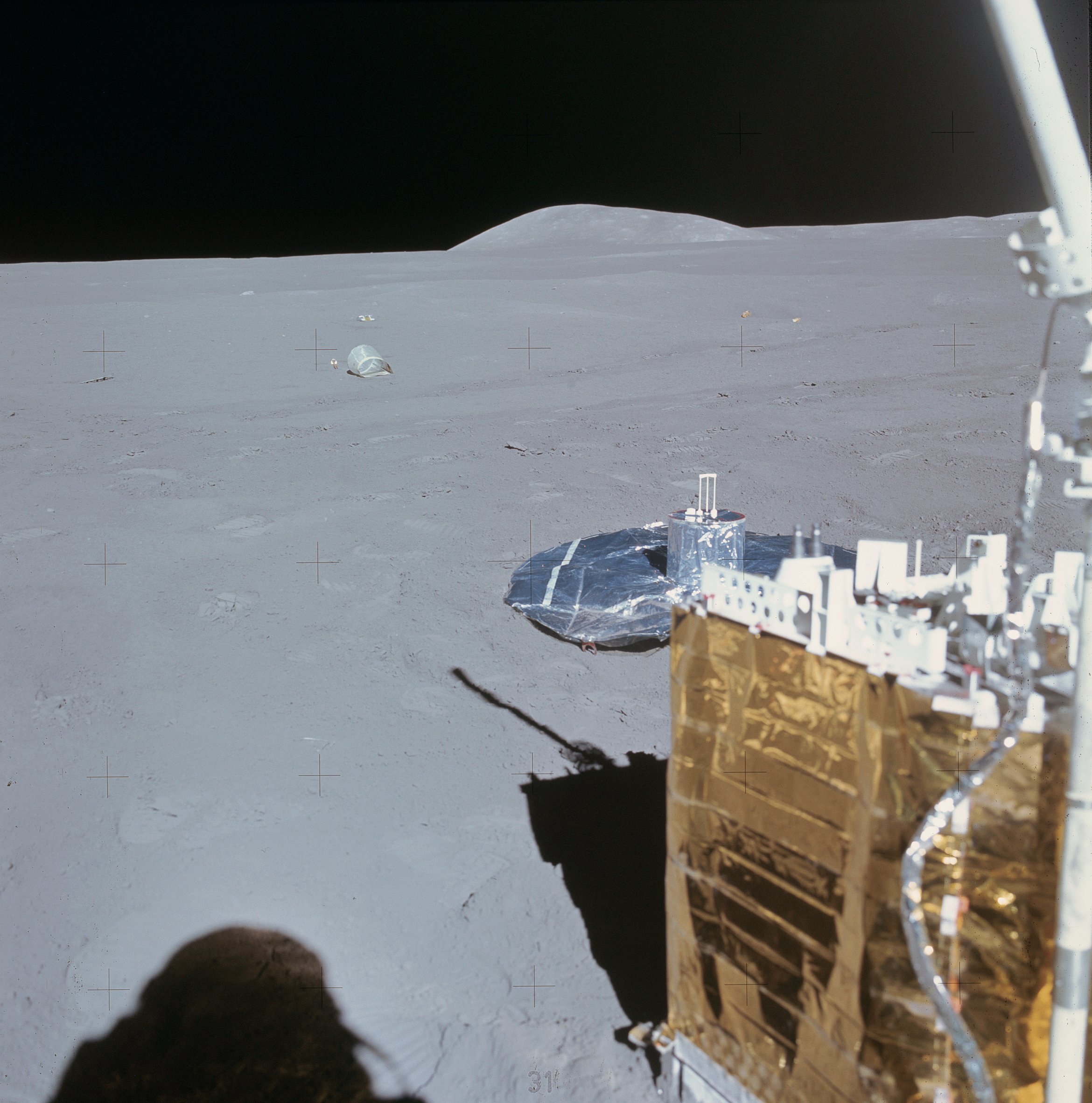 This frame was shot on 1 August 1971 at 21:32 UTC, with the camera looking down vertically. The Sun was 33 degrees above the eastern horizon. Higher resolution versions of M-1676 available from the ASU Apollo Image Archive. Frames 1675 and 1677 also include the landing site. Scan from the original film courtesy NASA/JSC/Arizona State University.Rev. 38 Pan Camera Frame 9798, LM Detail ( 346k )