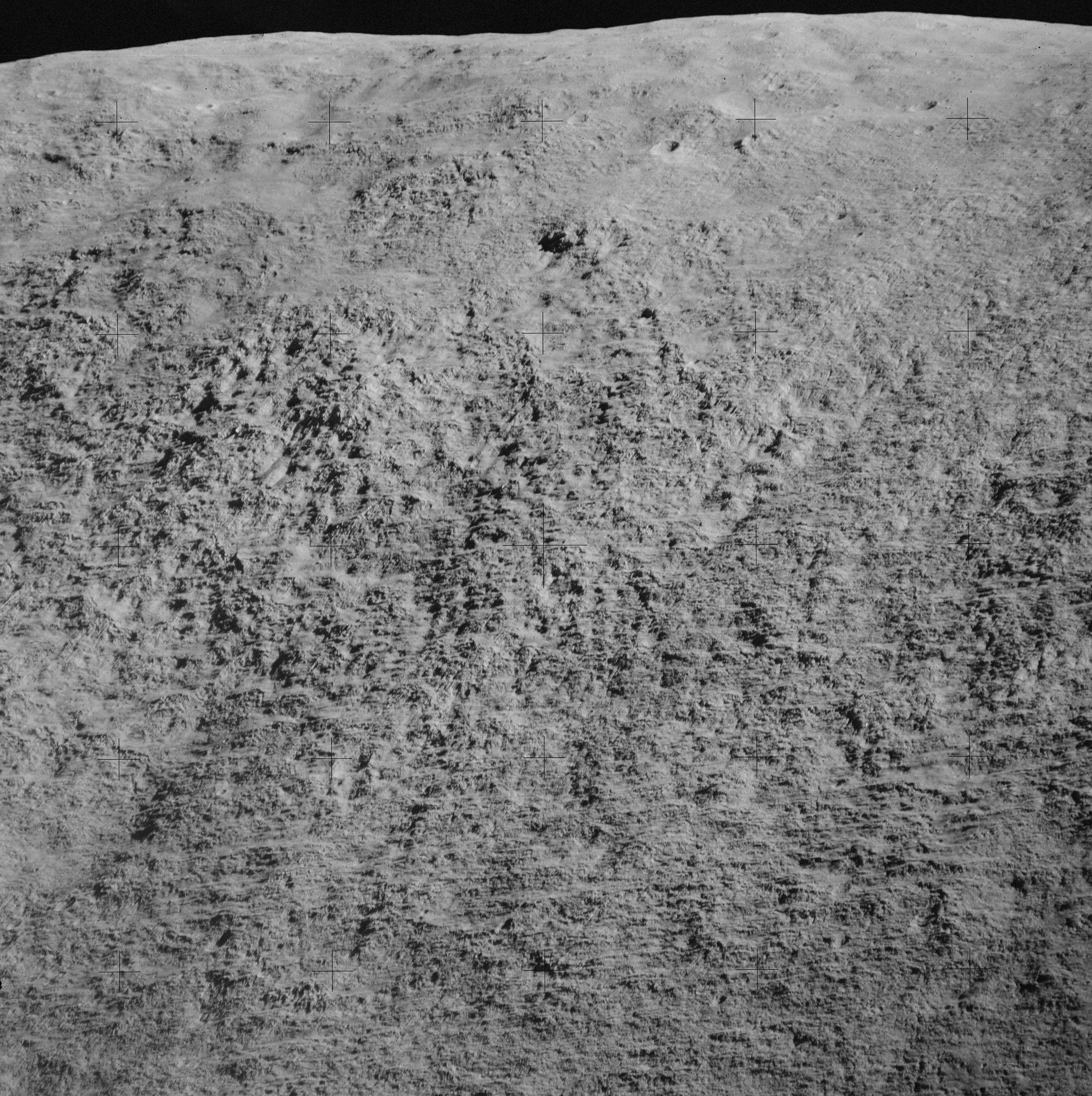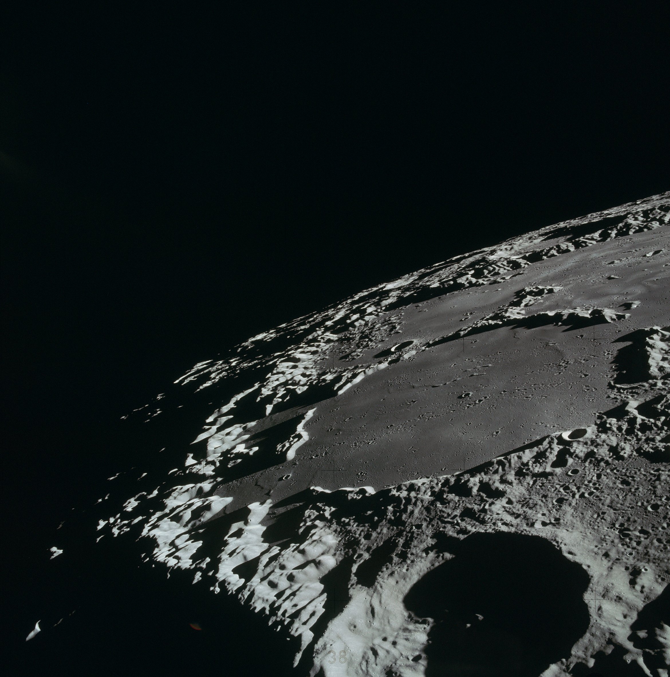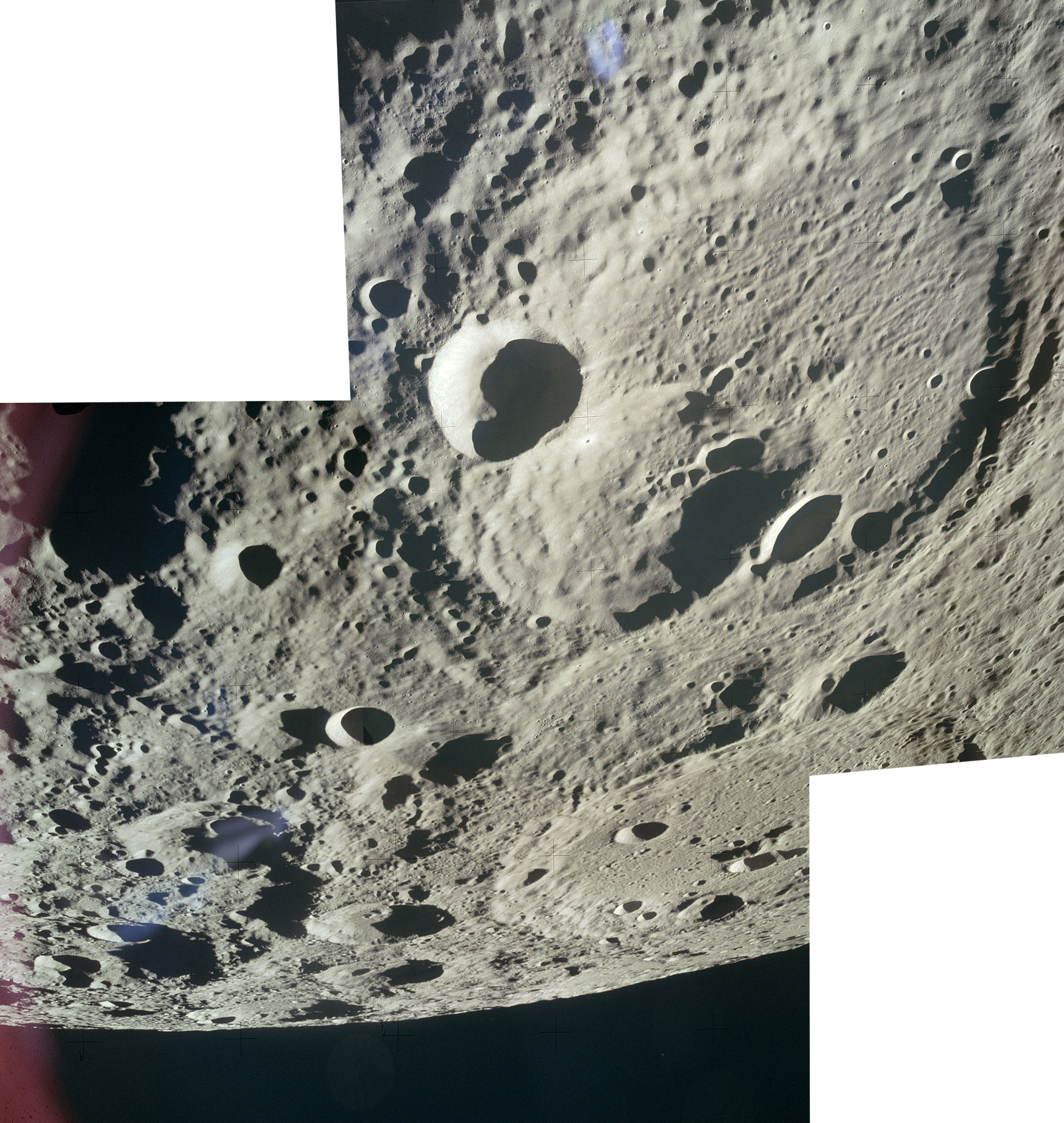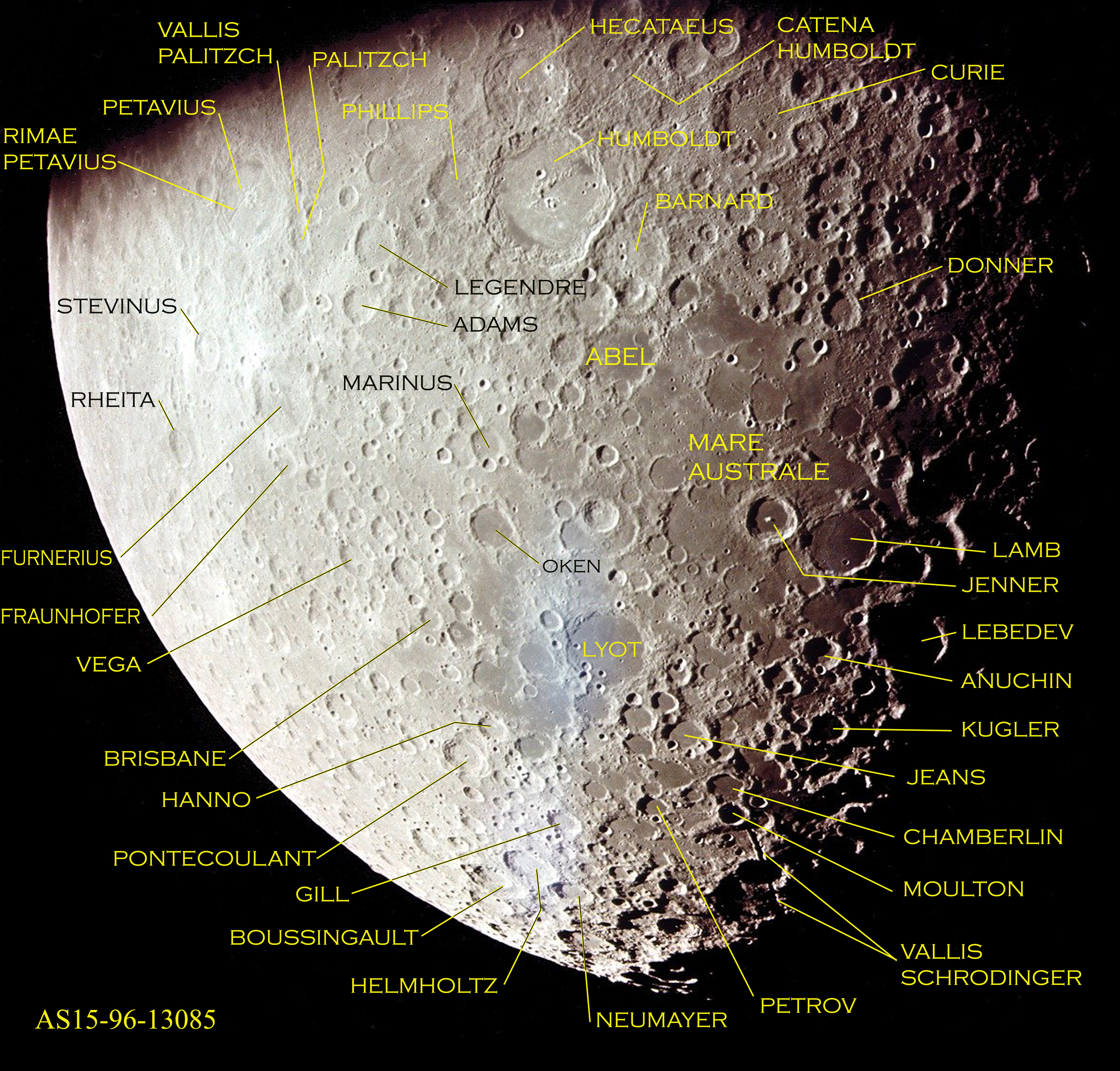 View towards lunar south pole. Mare Australe. Crater Lyot. Rima Schrödinger. Research by David Woods.AS15-96-13100