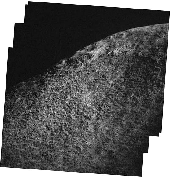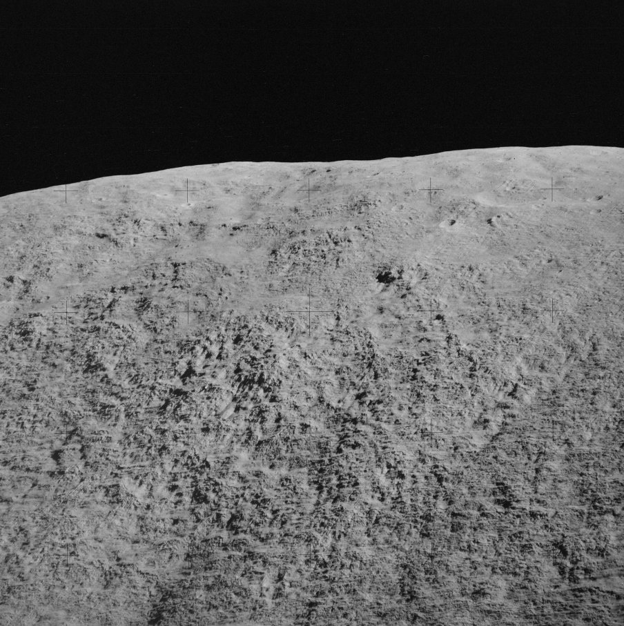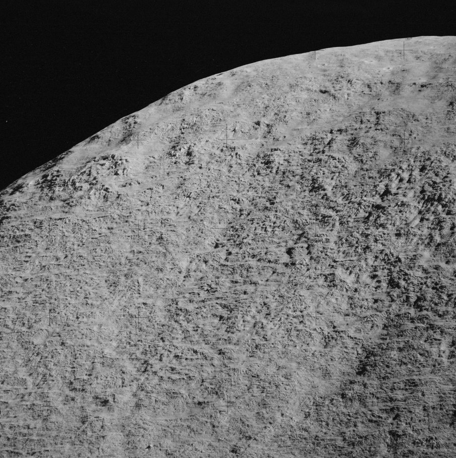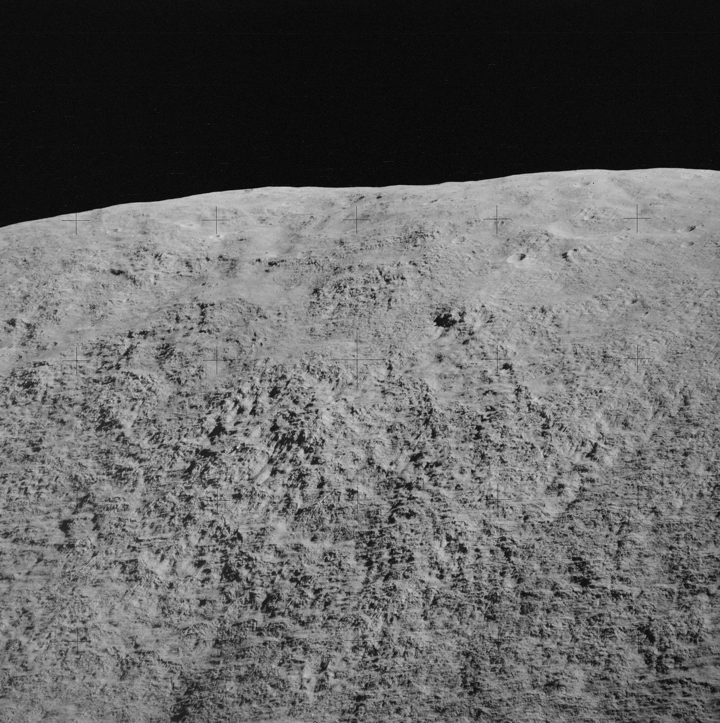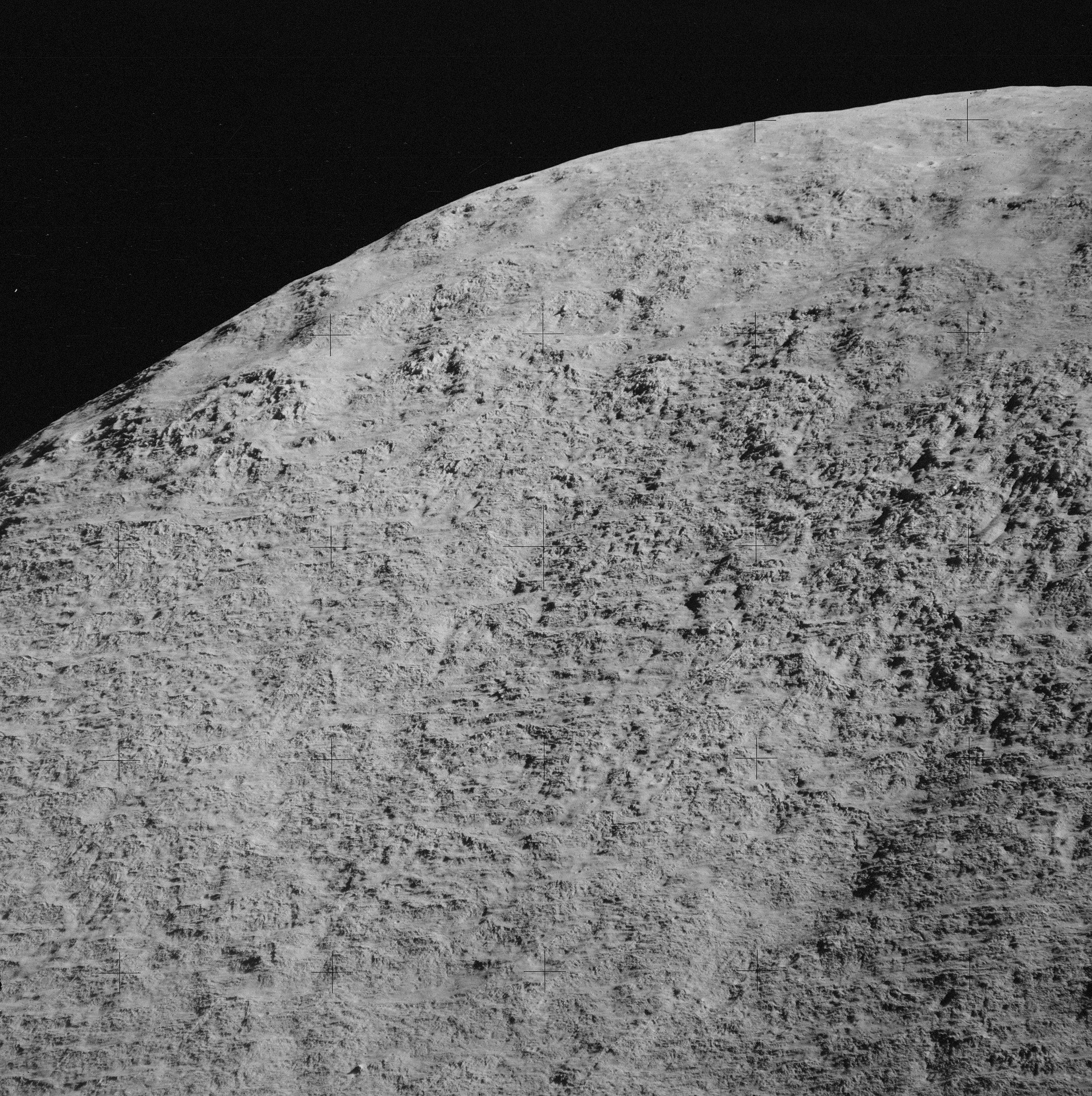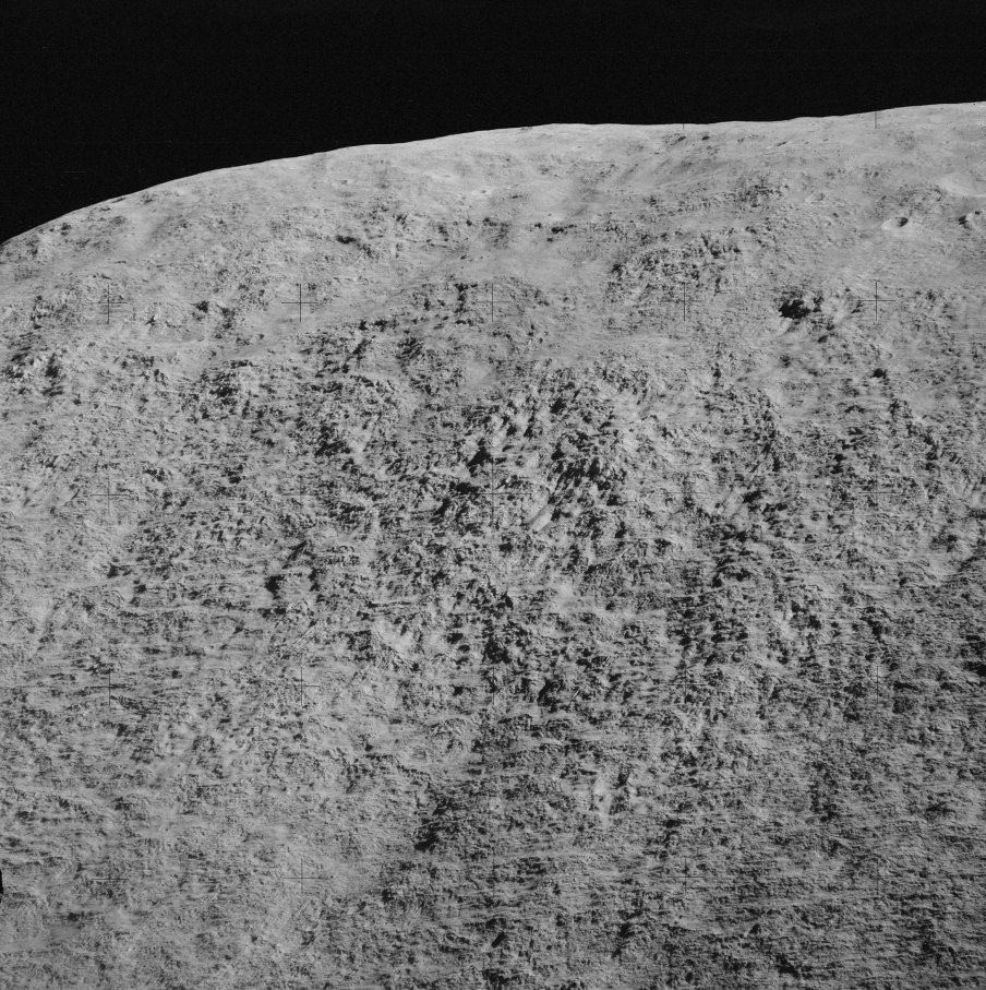 View towards lunar south pole. Mare Australe. Crater Lyot. Rima Schrödinger. Research by David Woods.AS15-96-13100