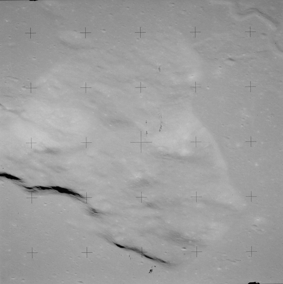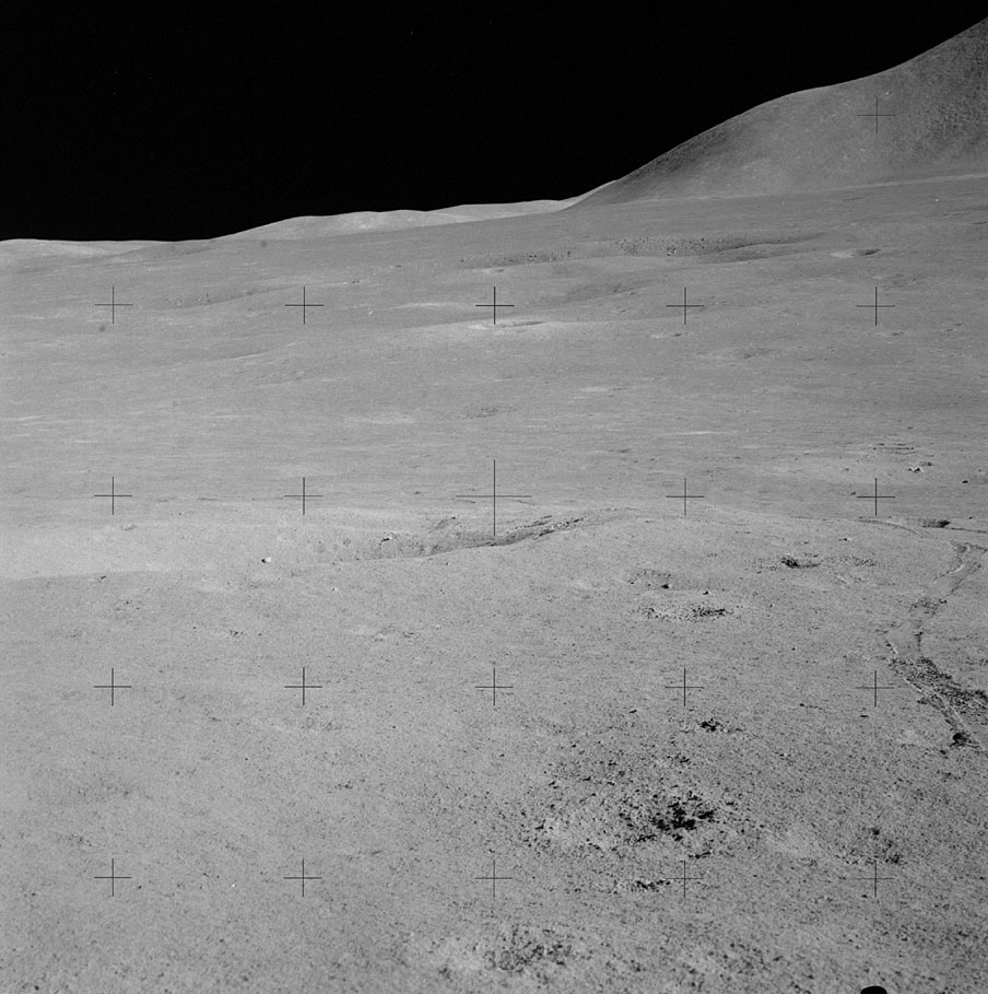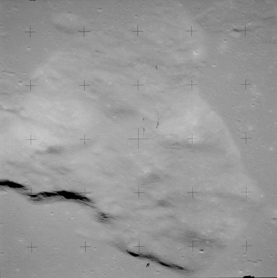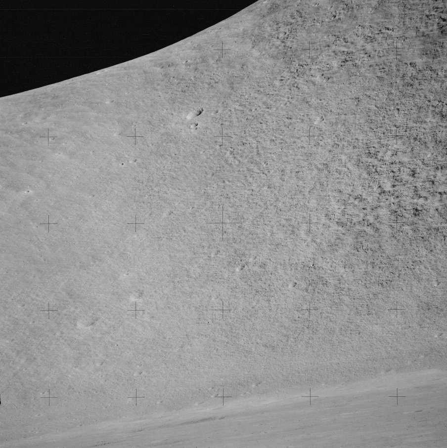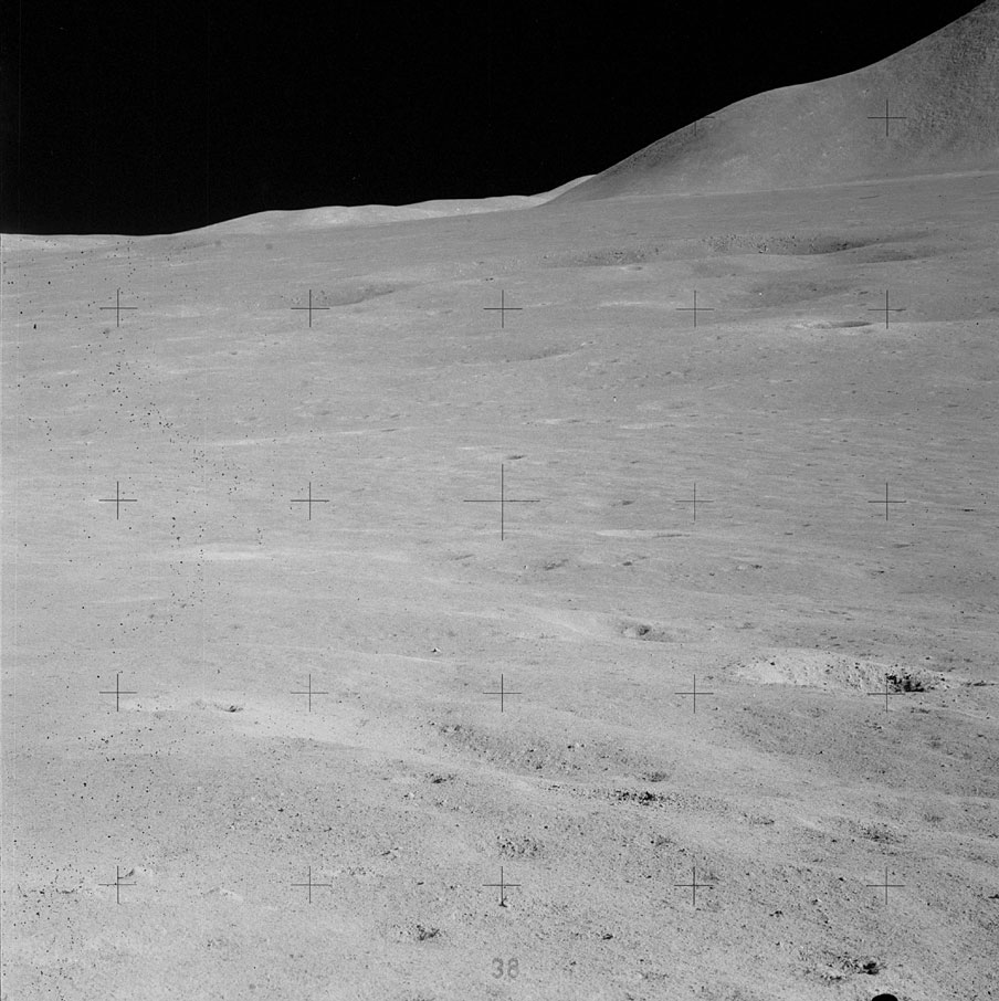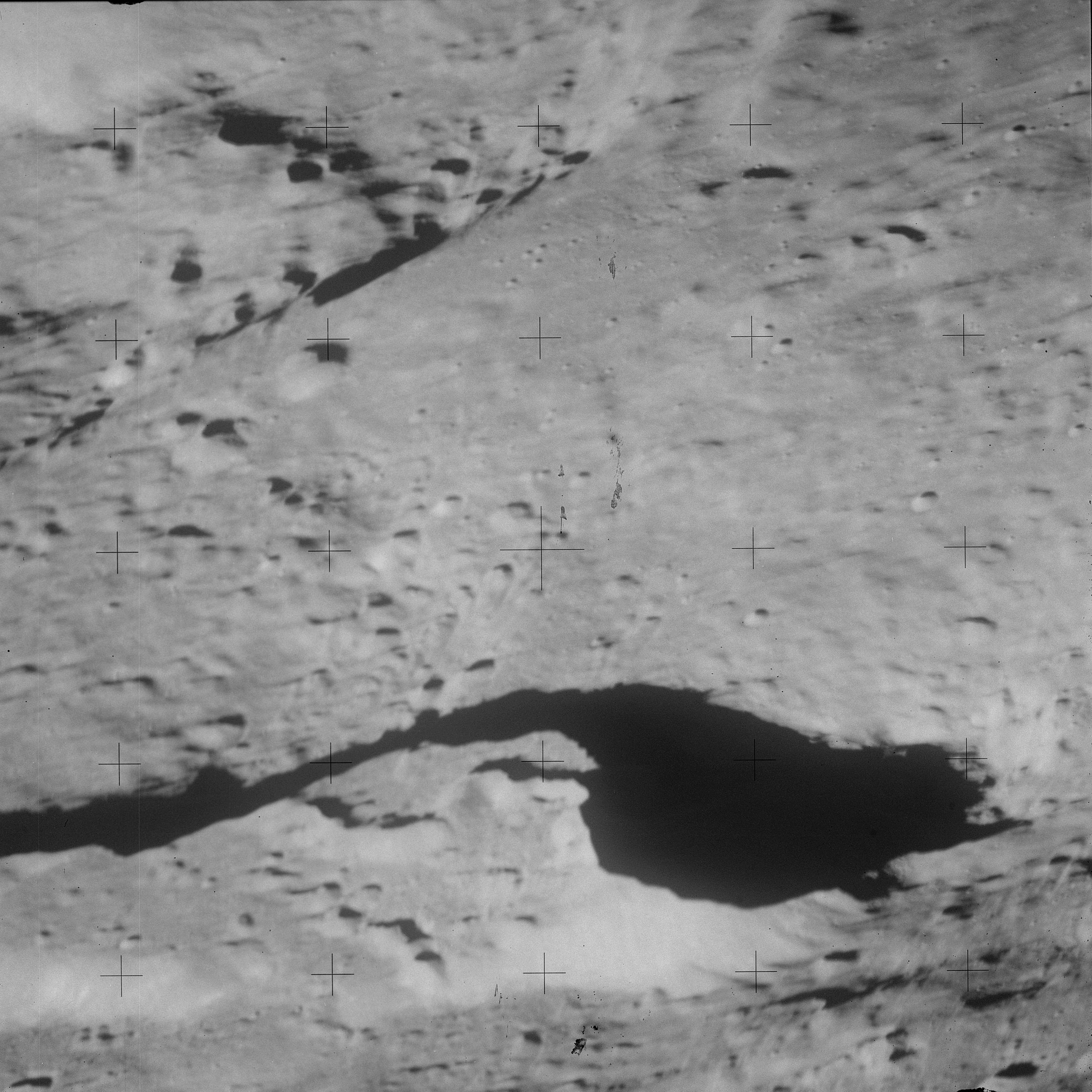 This frame was shot on 31 July 1971 at 23:53 UTC, with the camera looking vertifally down. The Sun was 23 degrees above the eastern horizon. Higher resolution versions of M-0993 available from the ASU Apollo Image Archive. Frames 0991, 0992, and 0994 also include the landing site. Scan from the original film courtesy NASA/JSC/Arizona State University.Rev. 27 Pan Camera Frame 9430 ( 392k )