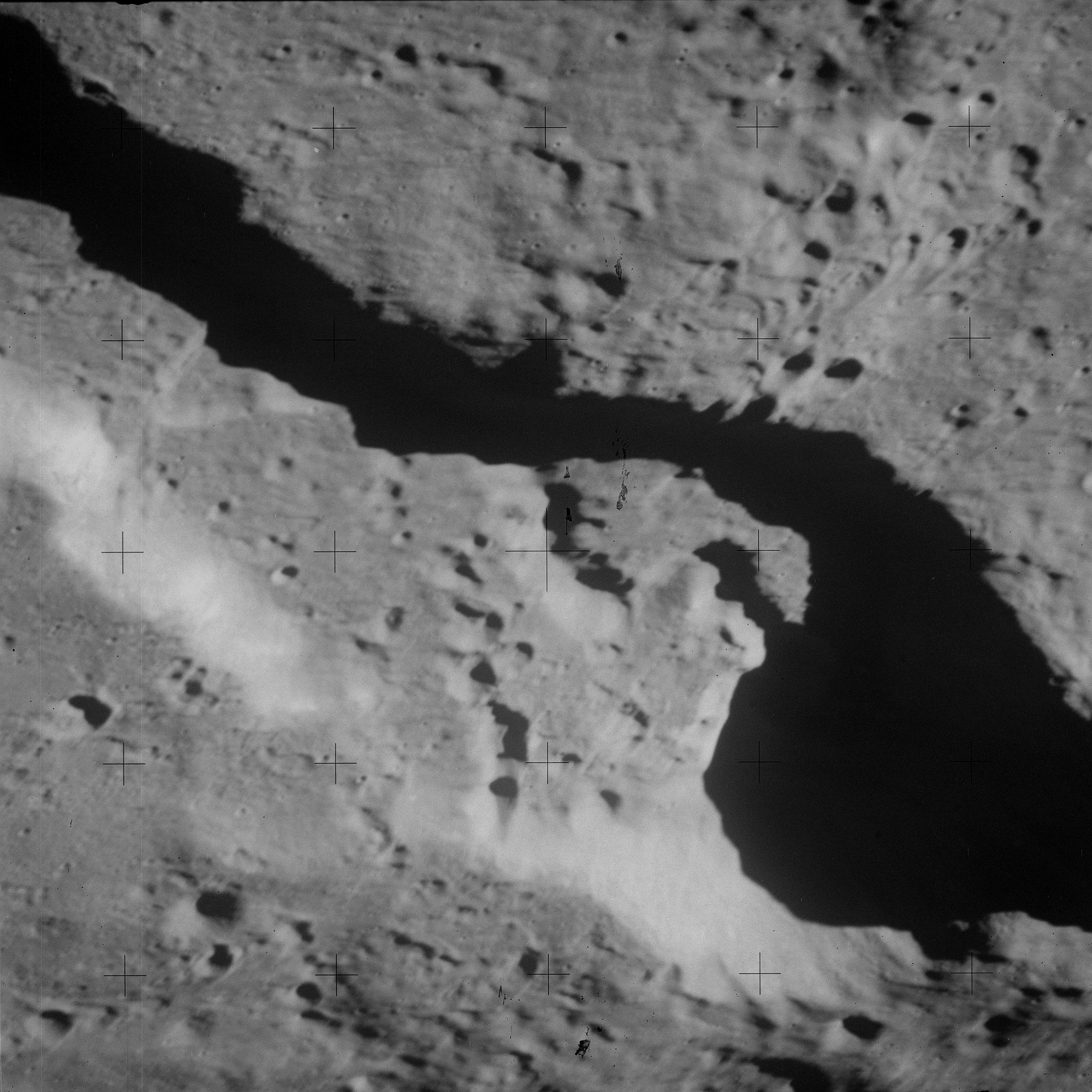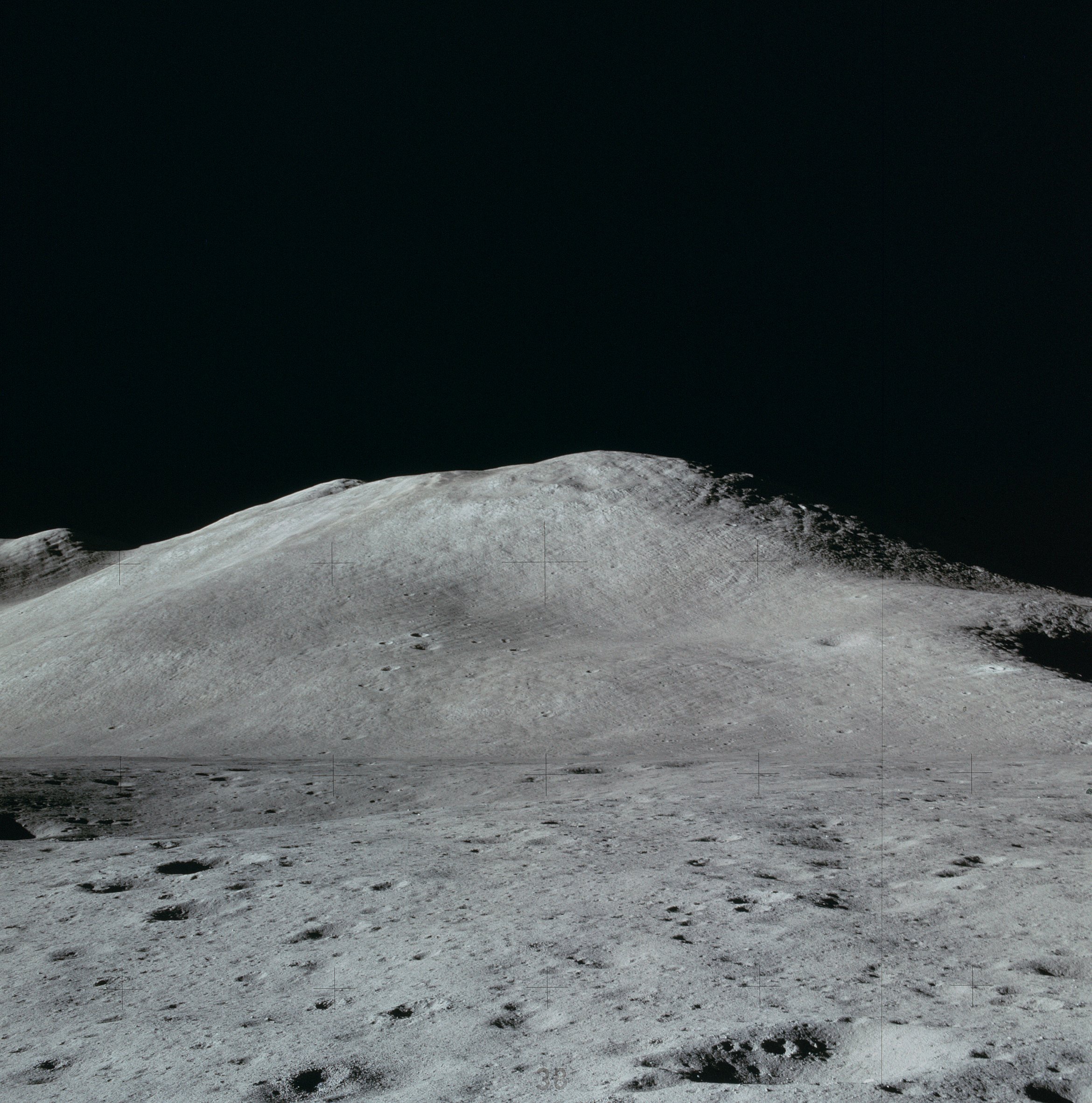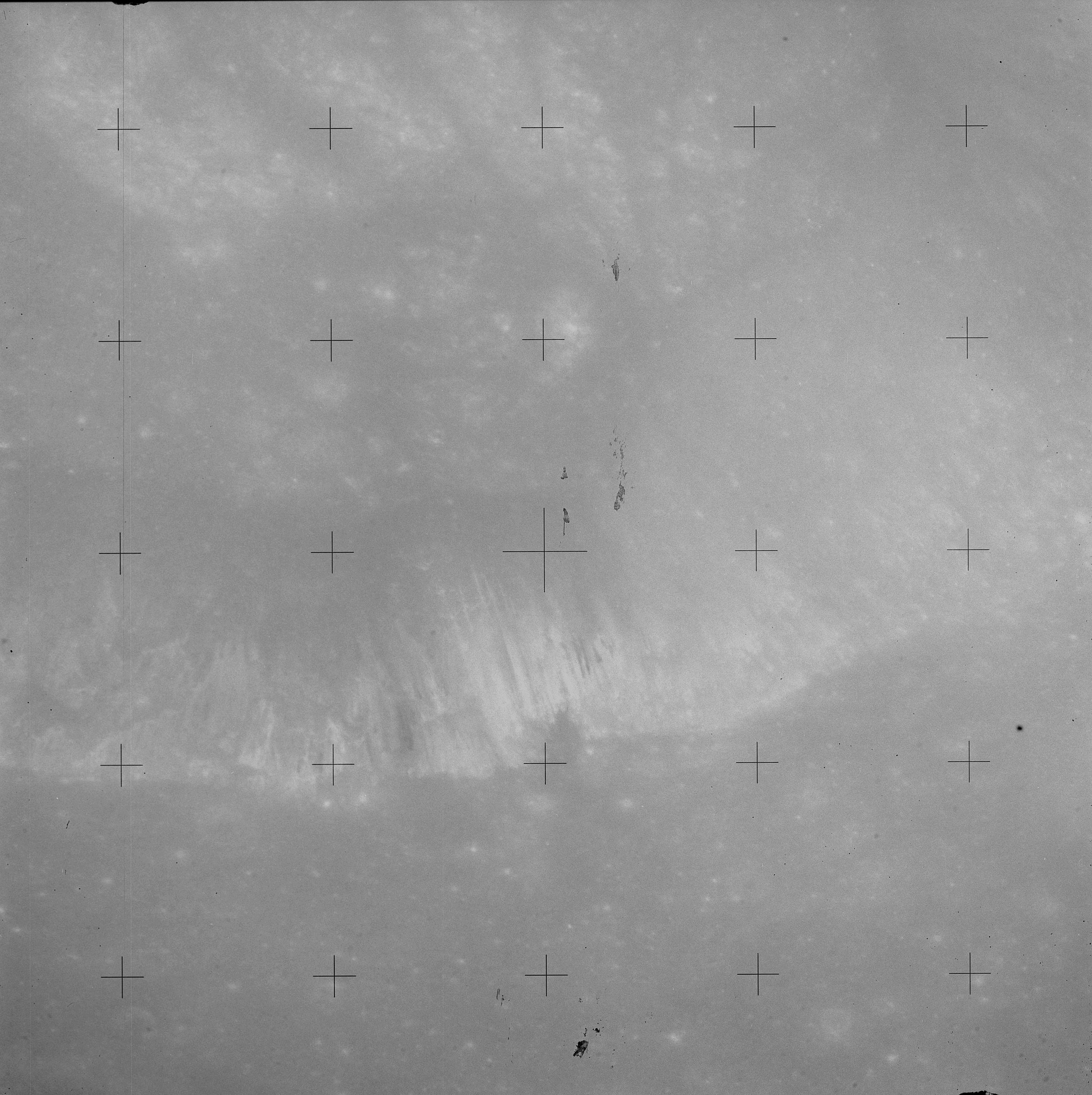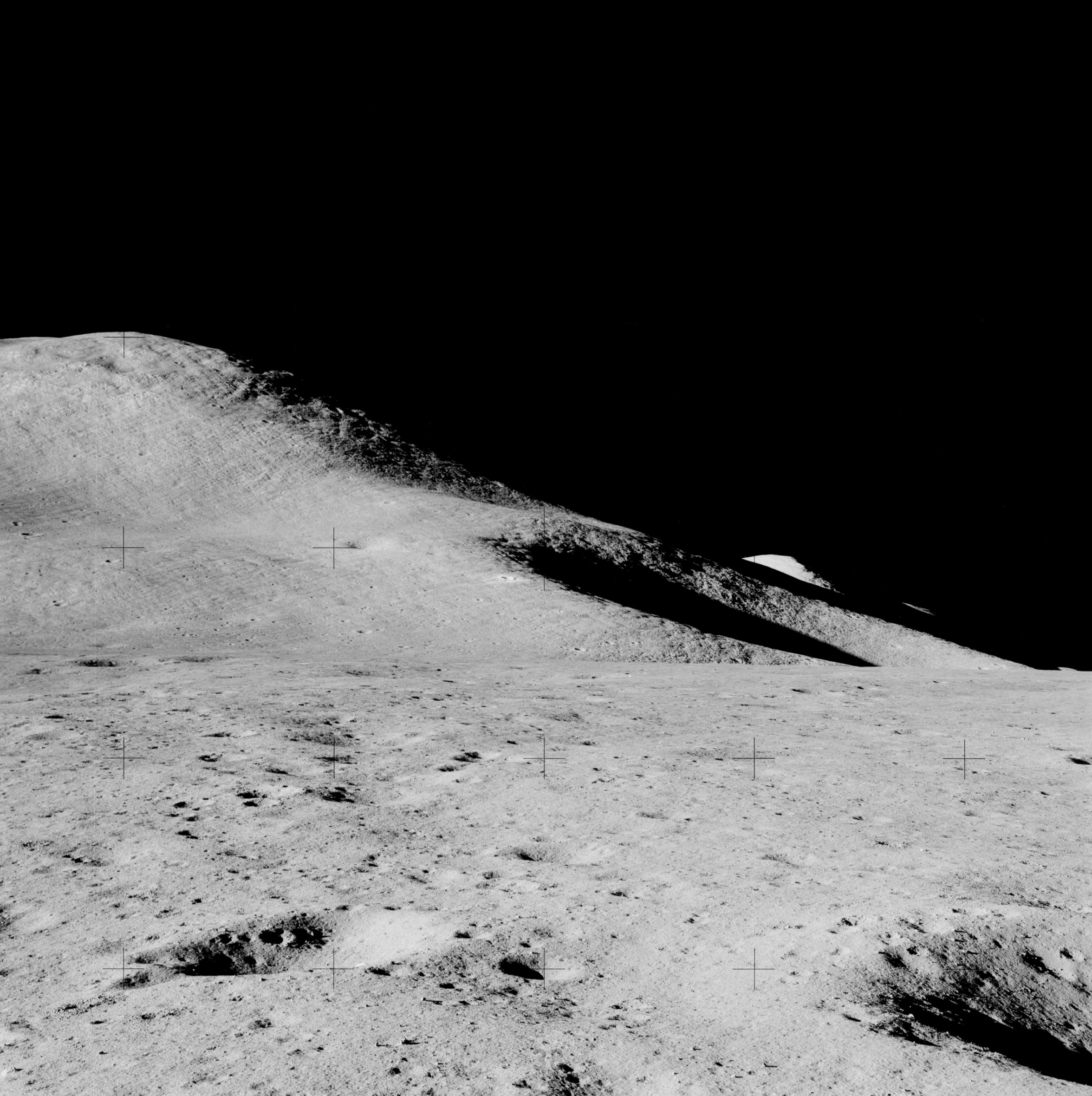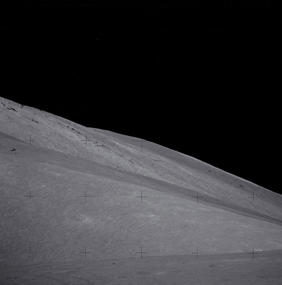 This frame was shot on 31 July 1971 at 23:53 UTC, with the camera looking vertifally down. The Sun was 23 degrees above the eastern horizon. Higher resolution versions of M-0993 available from the ASU Apollo Image Archive. Frames 0991, 0992, and 0994 also include the landing site. Scan from the original film courtesy NASA/JSC/Arizona State University.Rev. 27 Pan Camera Frame 9430 ( 392k )