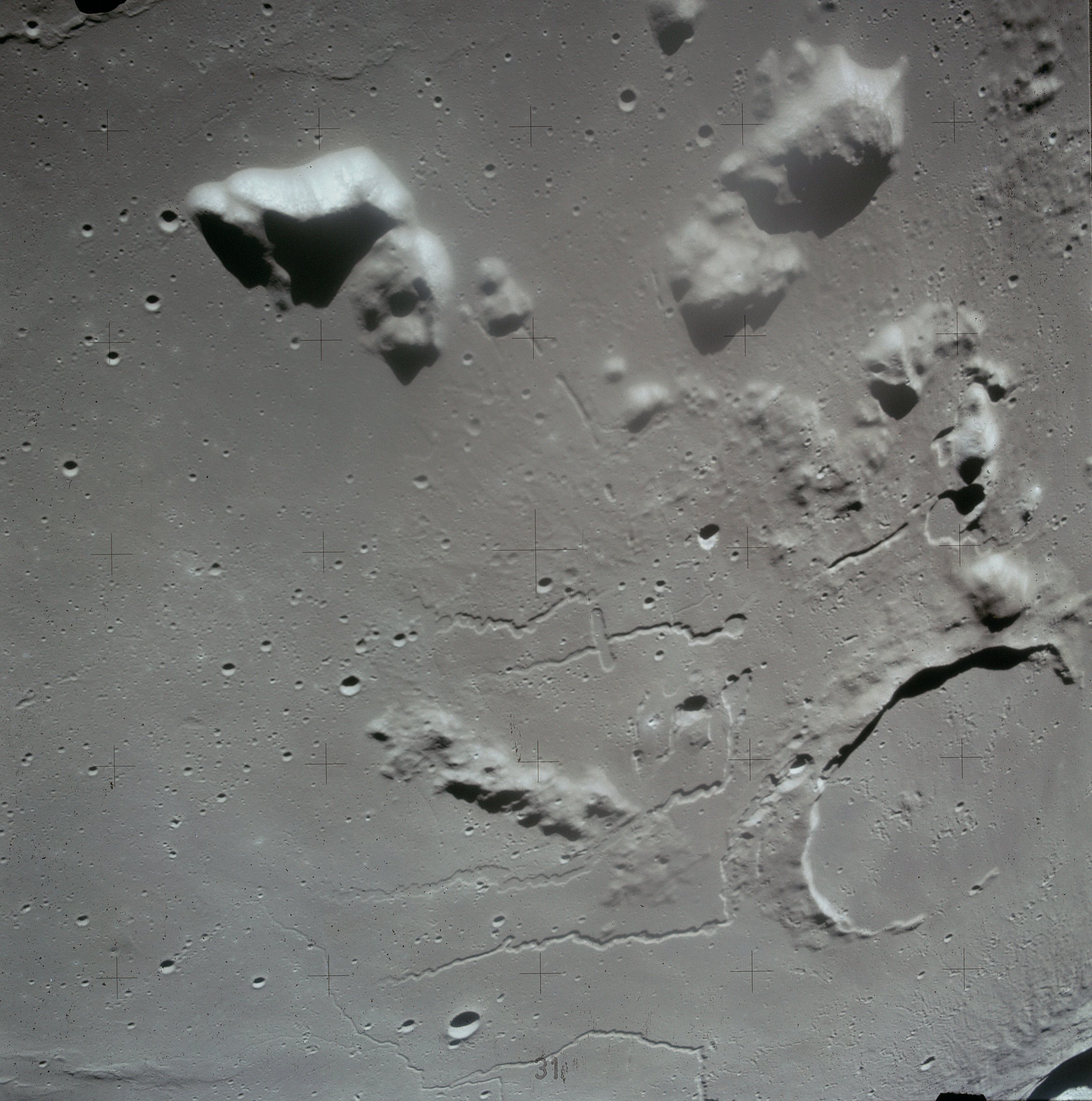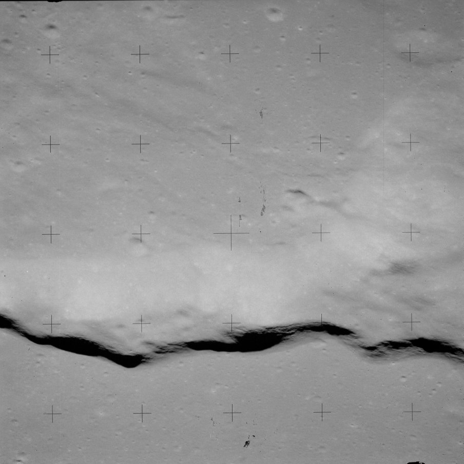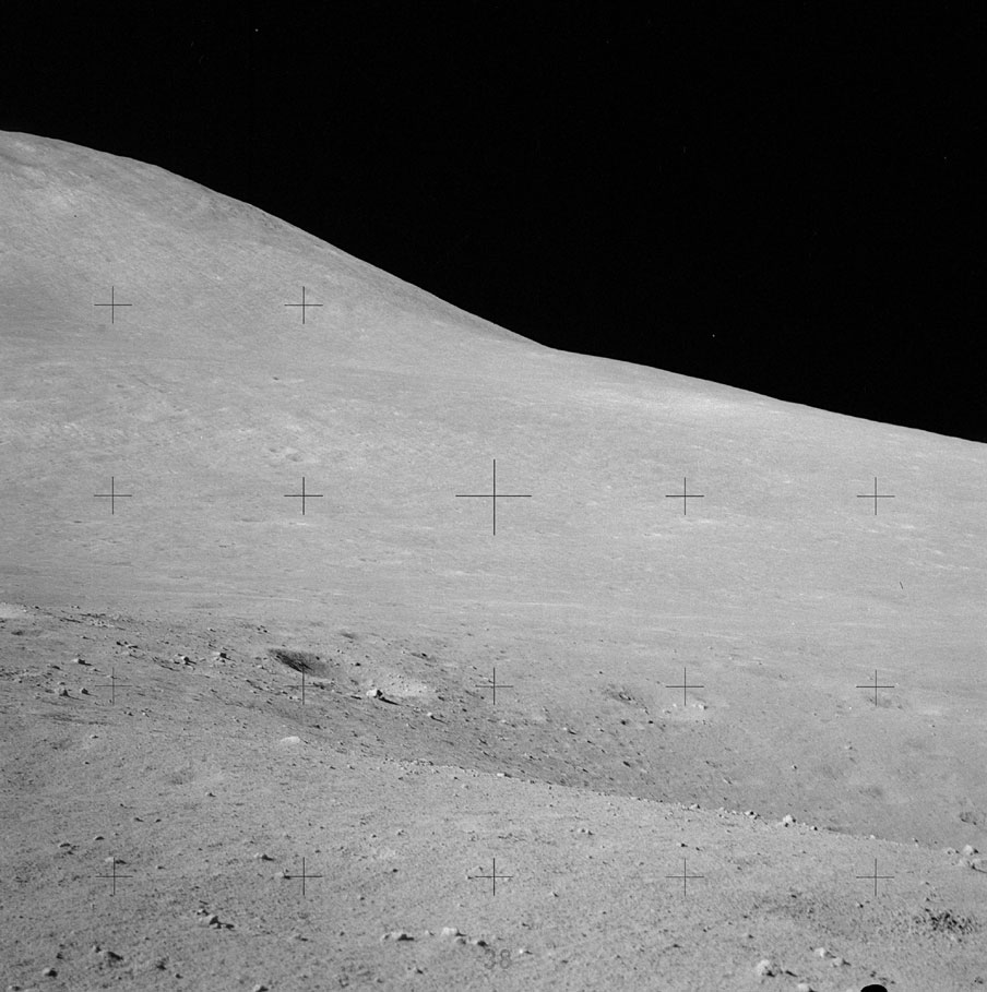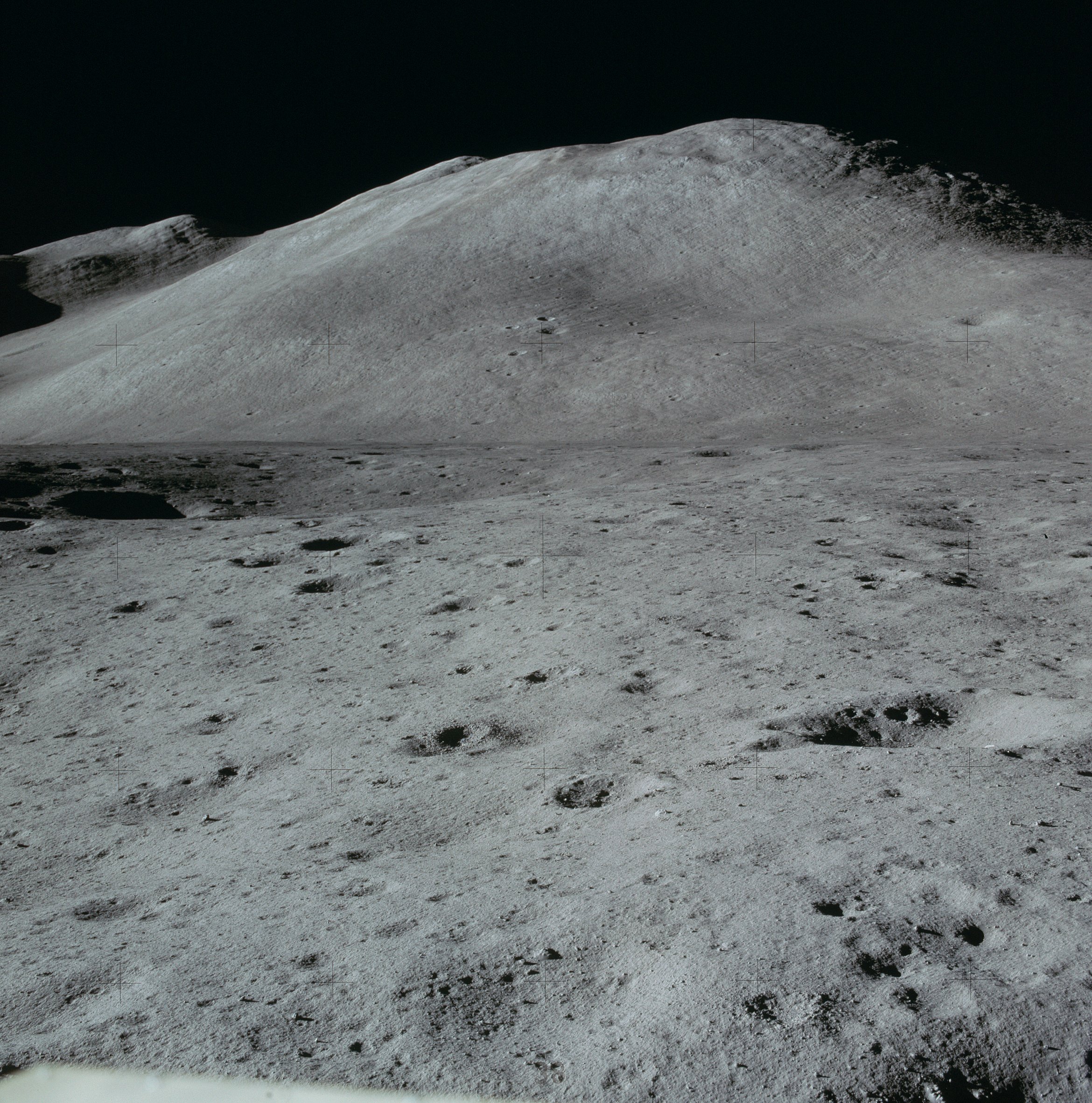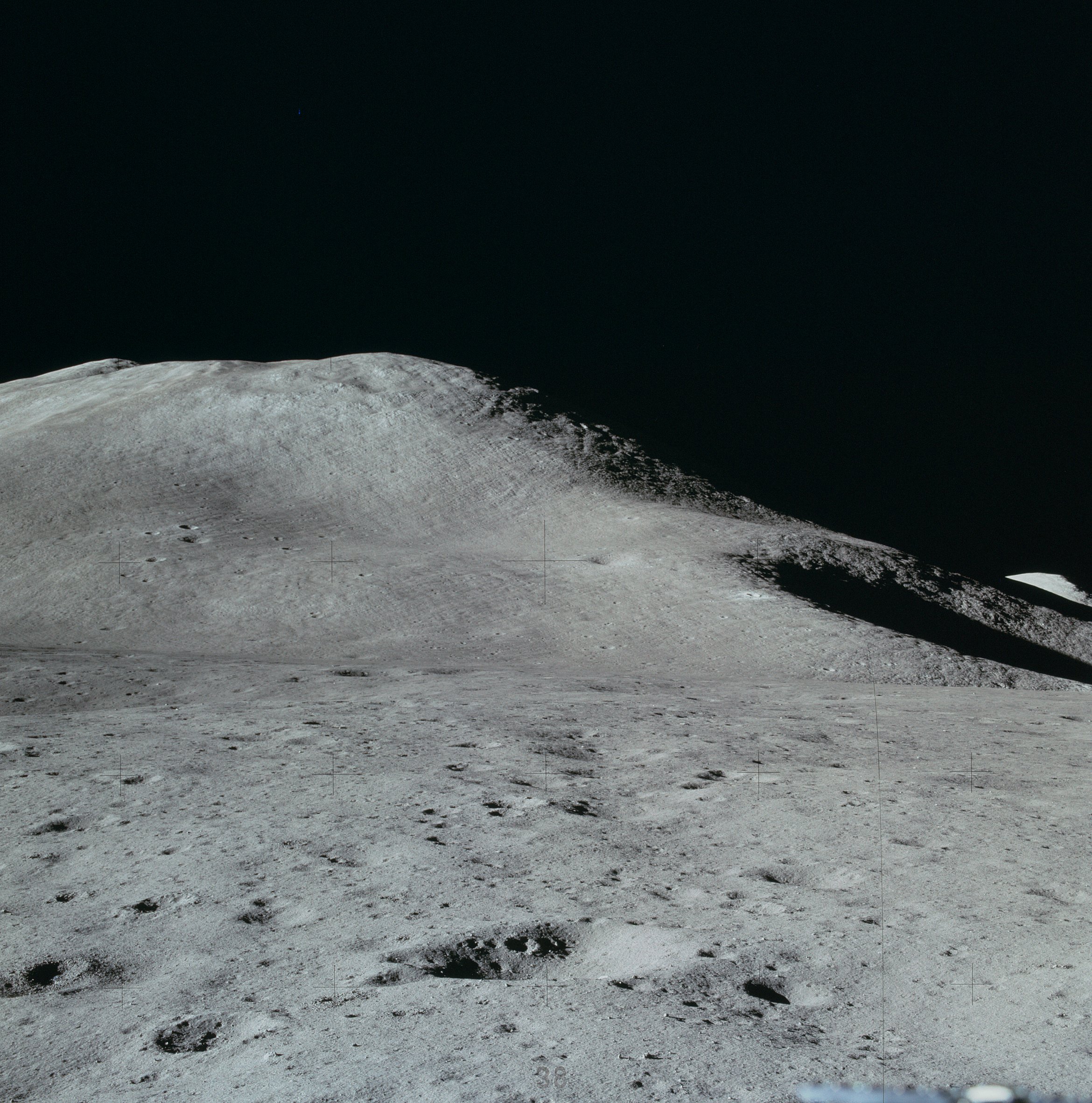 This frame was shot on 31 July 1971 at 23:53 UTC, with the camera looking vertifally down. The Sun was 23 degrees above the eastern horizon. Higher resolution versions of M-0993 available from the ASU Apollo Image Archive. Frames 0991, 0992, and 0994 also include the landing site. Scan from the original film courtesy NASA/JSC/Arizona State University.Rev. 27 Pan Camera Frame 9430 ( 392k )