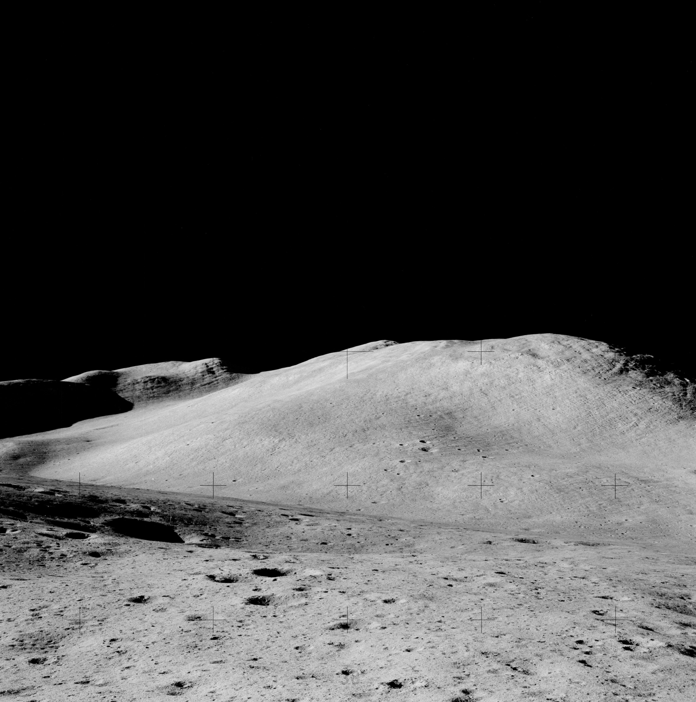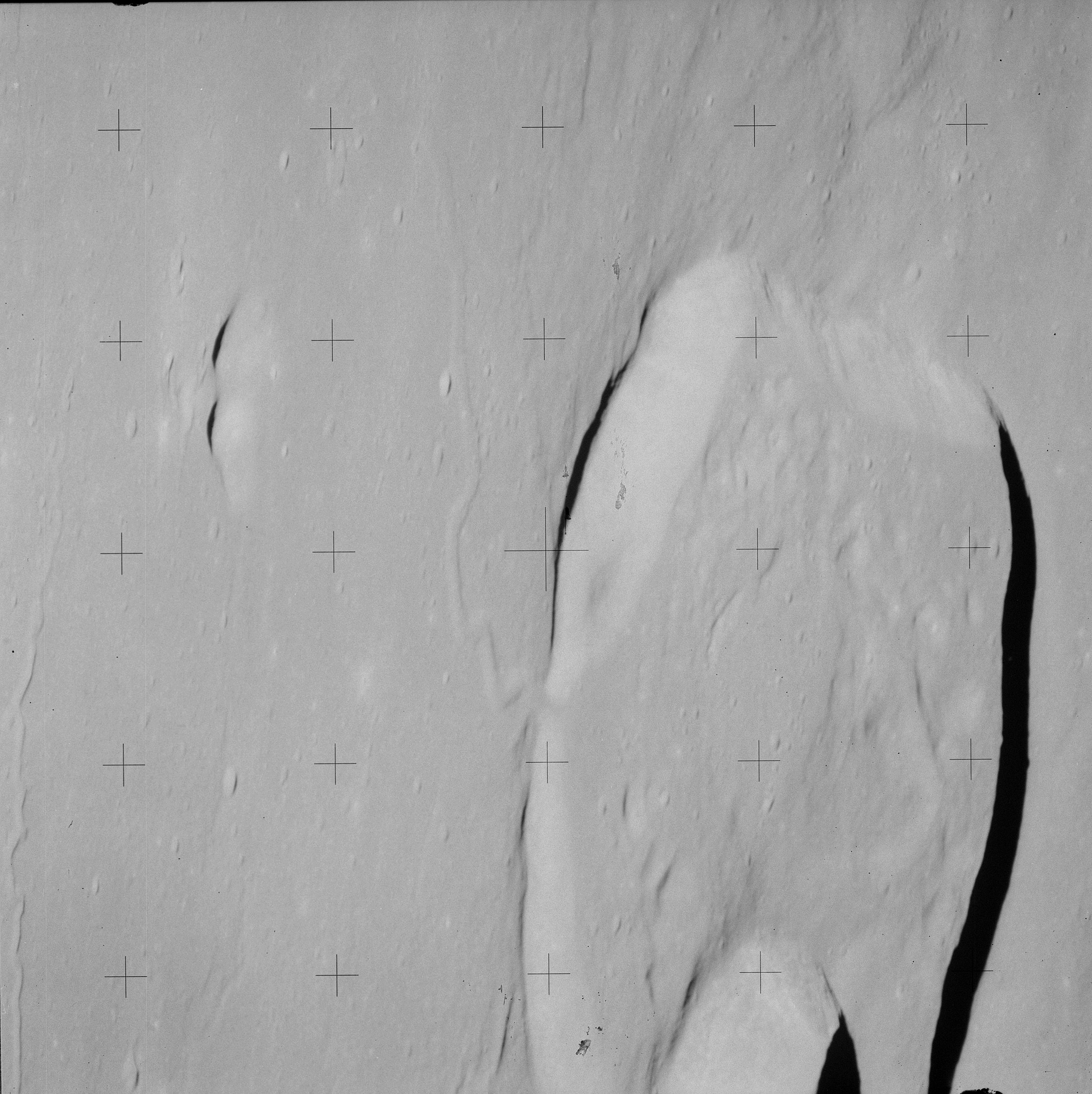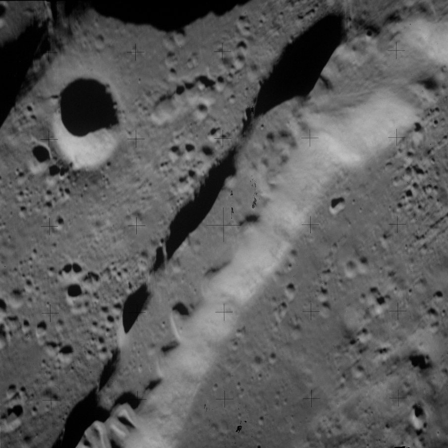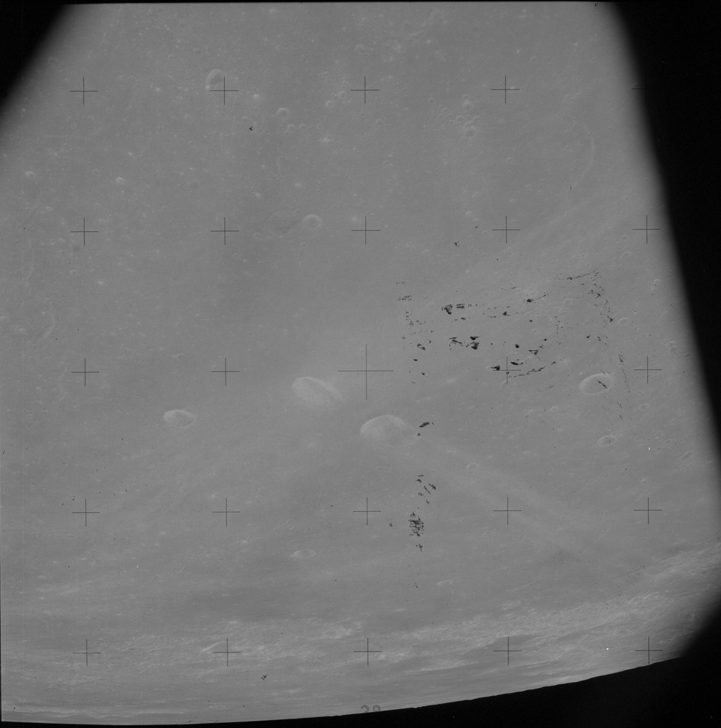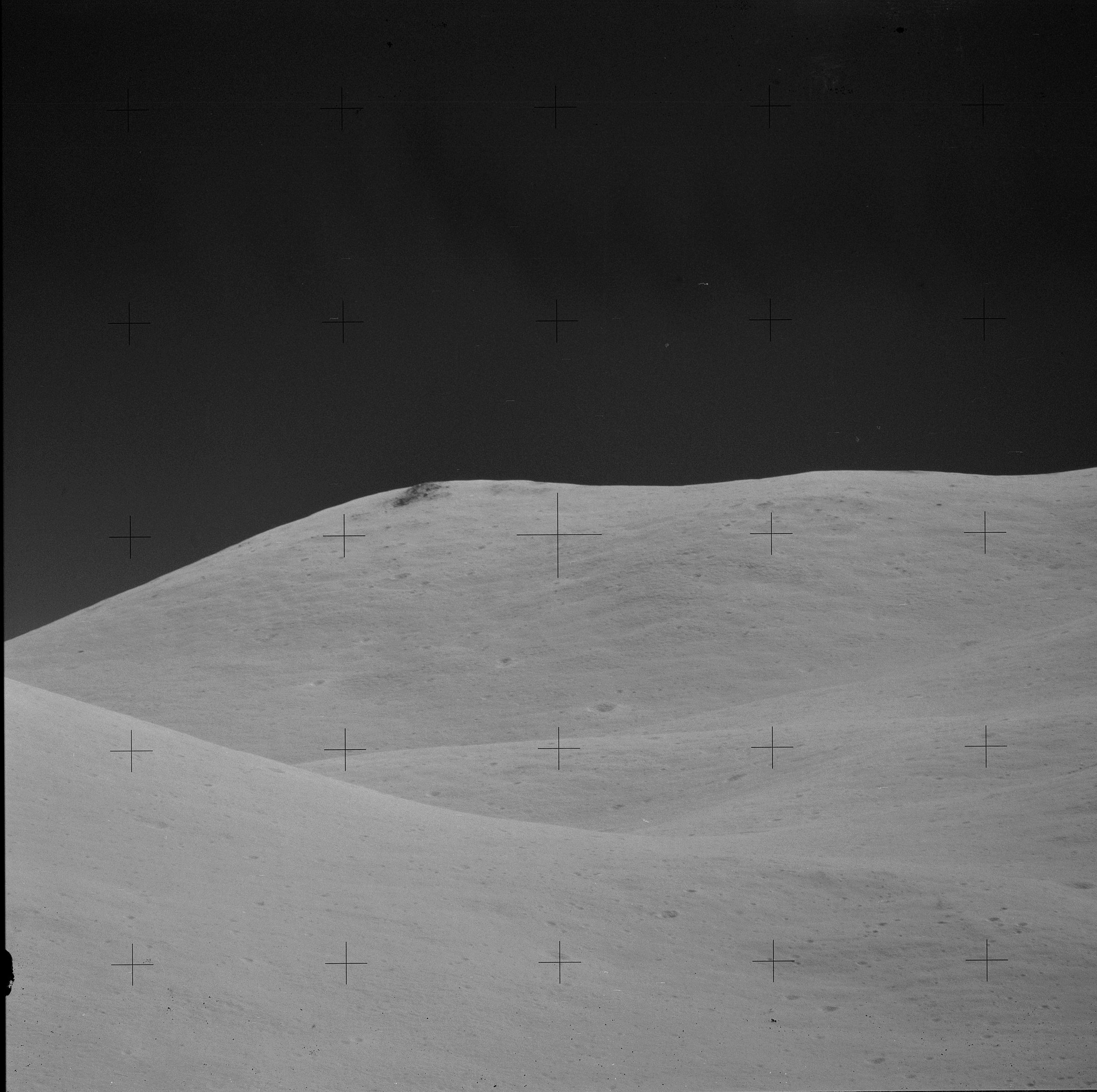 This frame was shot on 31 July 1971 at 23:53 UTC, with the camera looking vertifally down. The Sun was 23 degrees above the eastern horizon. Higher resolution versions of M-0993 available from the ASU Apollo Image Archive. Frames 0991, 0992, and 0994 also include the landing site. Scan from the original film courtesy NASA/JSC/Arizona State University.Rev. 27 Pan Camera Frame 9430 ( 392k )