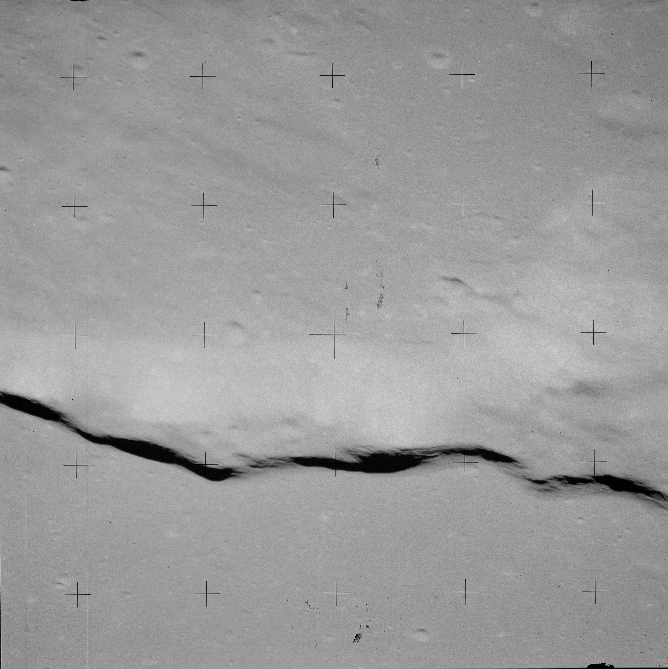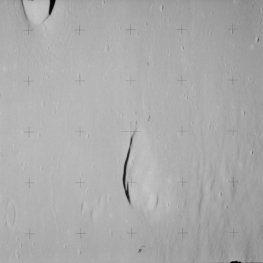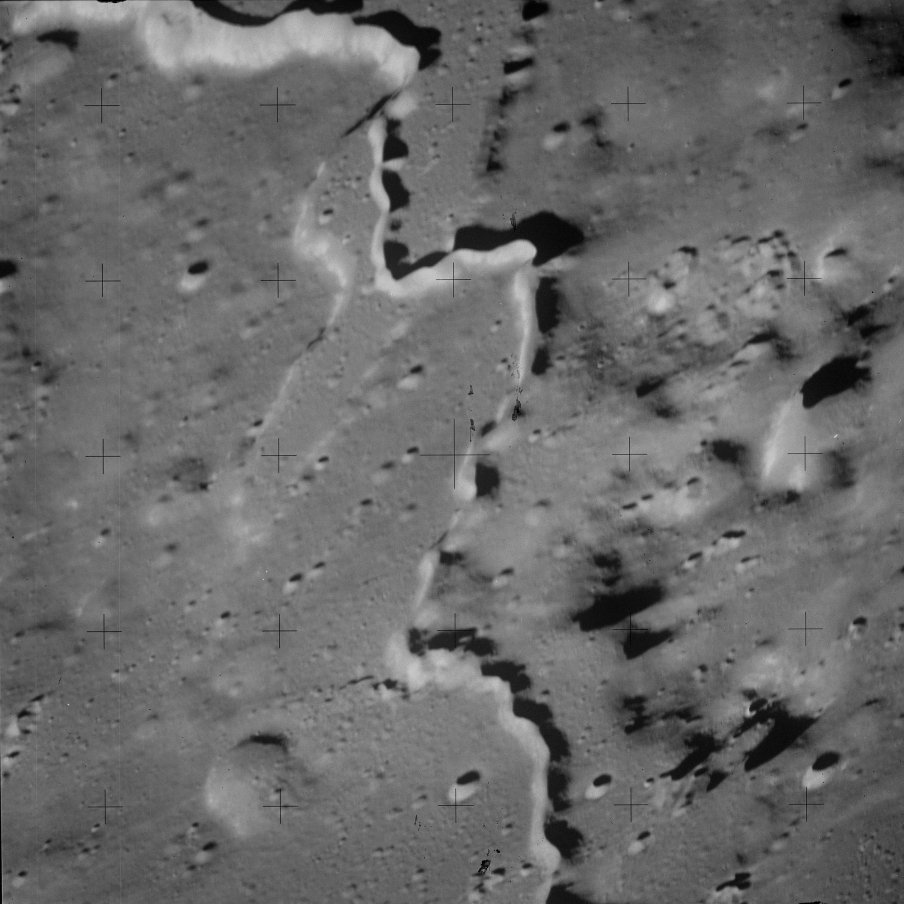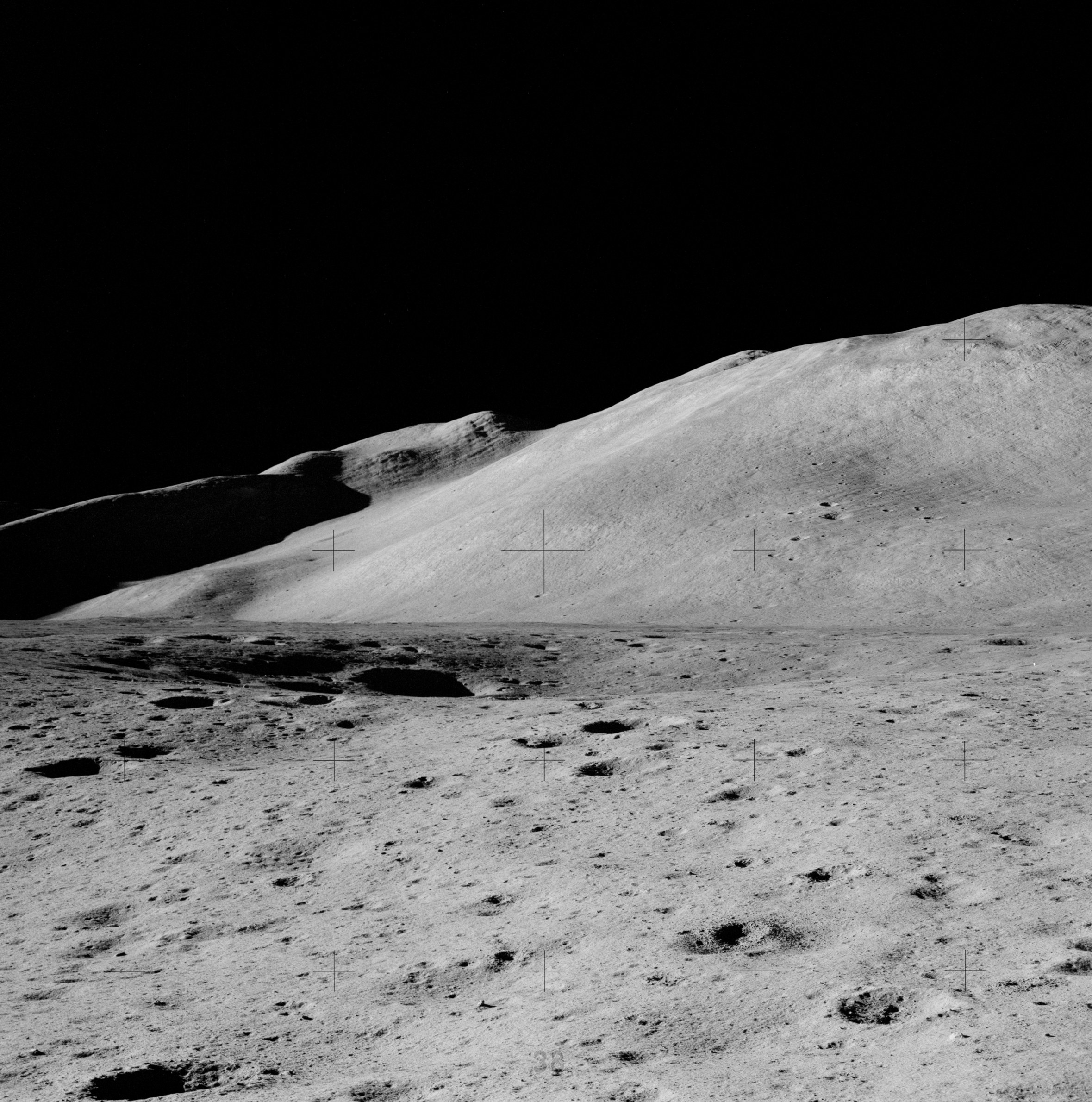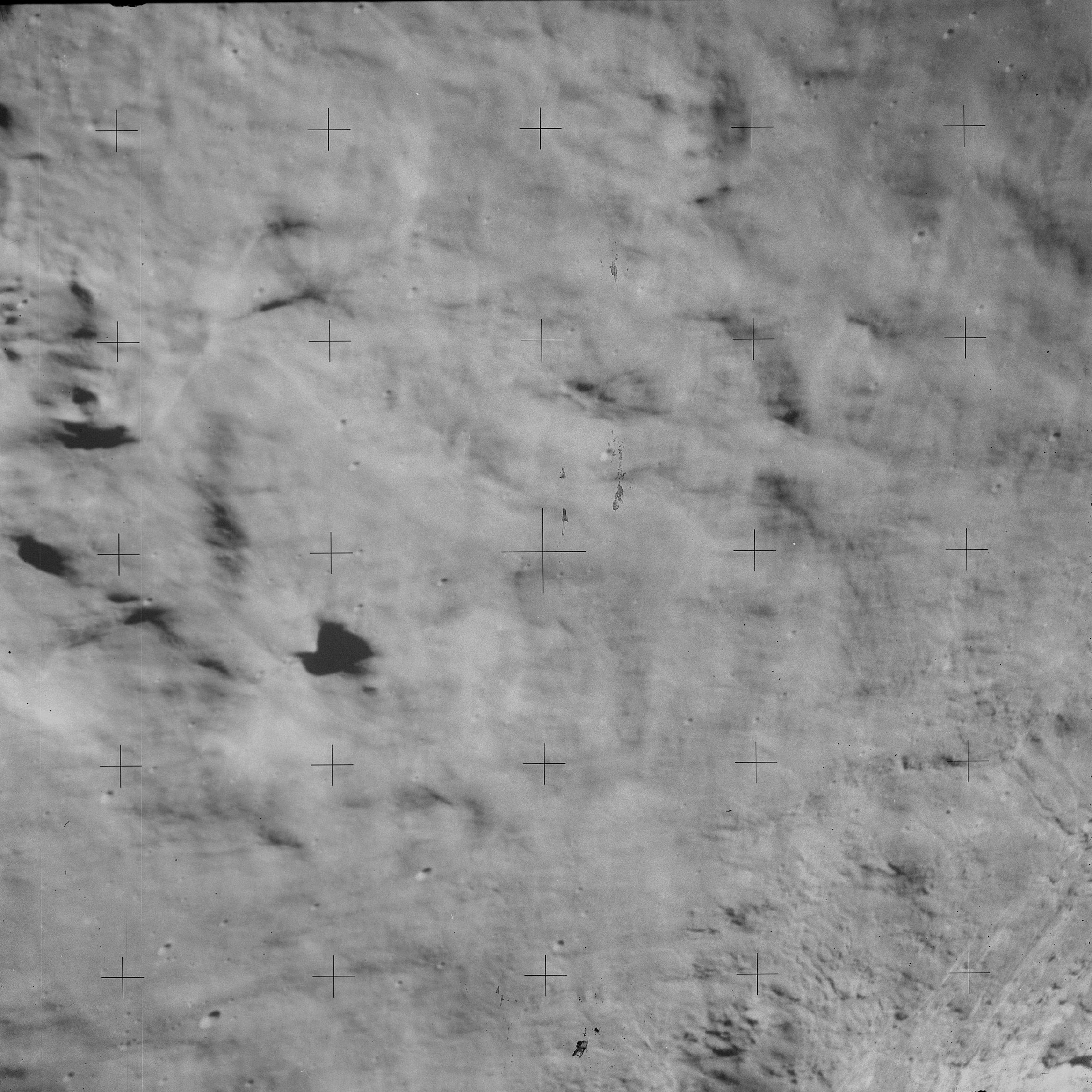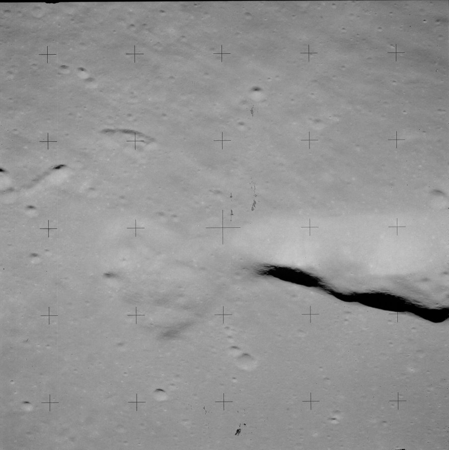This frame was shot on 31 July 1971 at 23:53 UTC, with the camera looking vertifally down. The Sun was 23 degrees above the eastern horizon. Higher resolution versions of M-0993 available from the ASU Apollo Image Archive. Frames 0991, 0992, and 0994 also include the landing site. Scan from the original film courtesy NASA/JSC/Arizona State University.Rev. 27 Pan Camera Frame 9430 ( 392k )