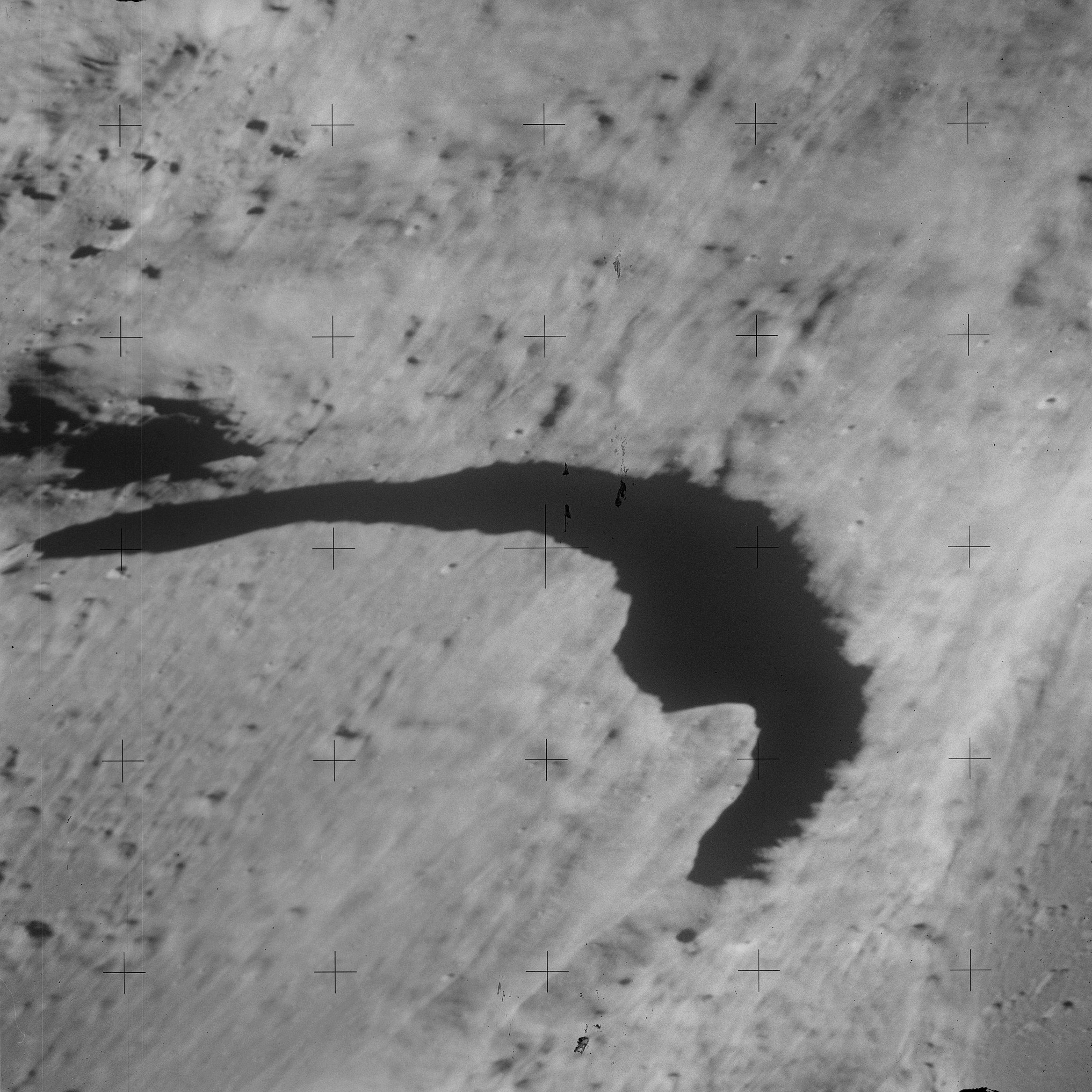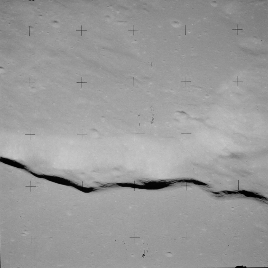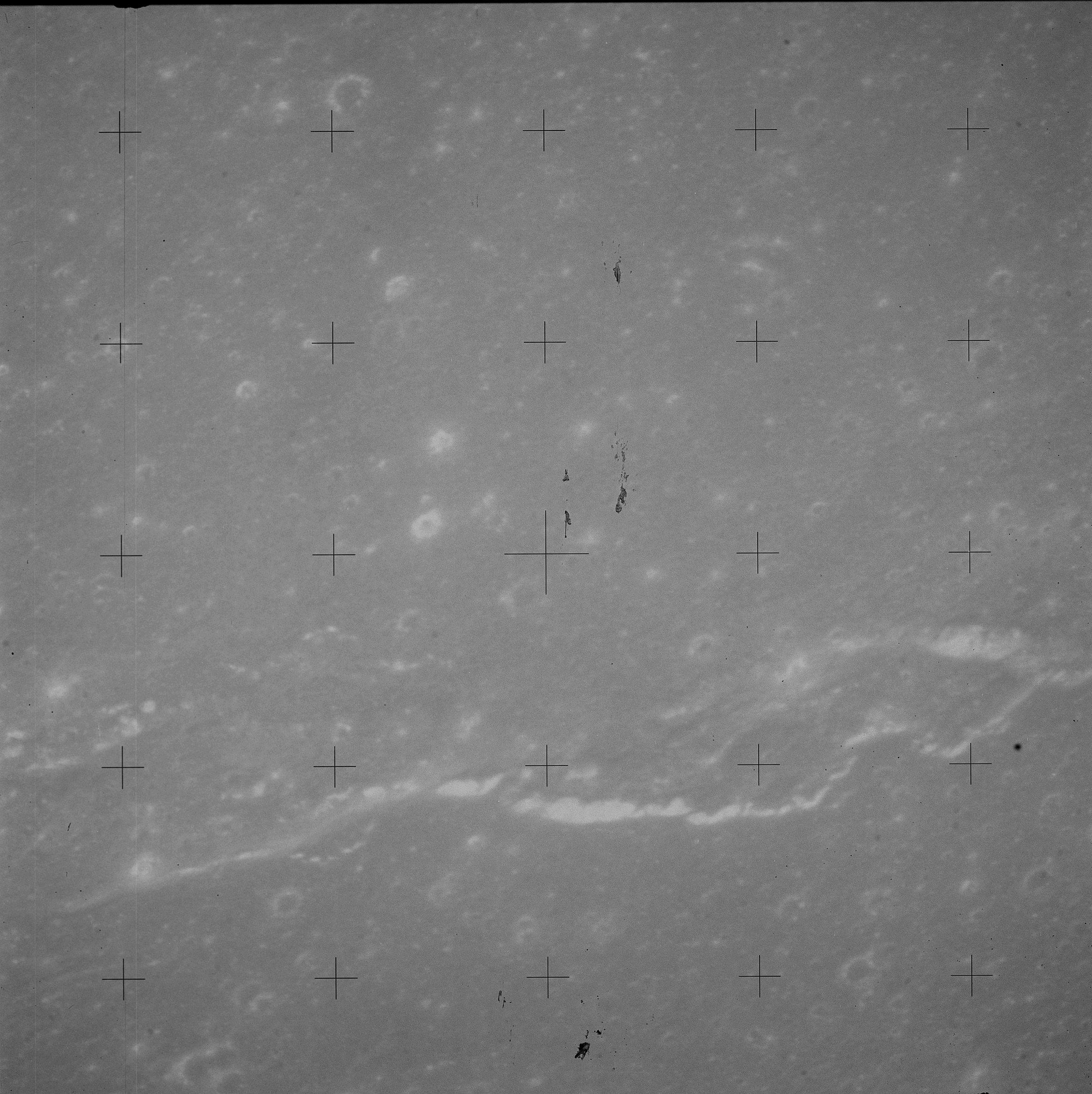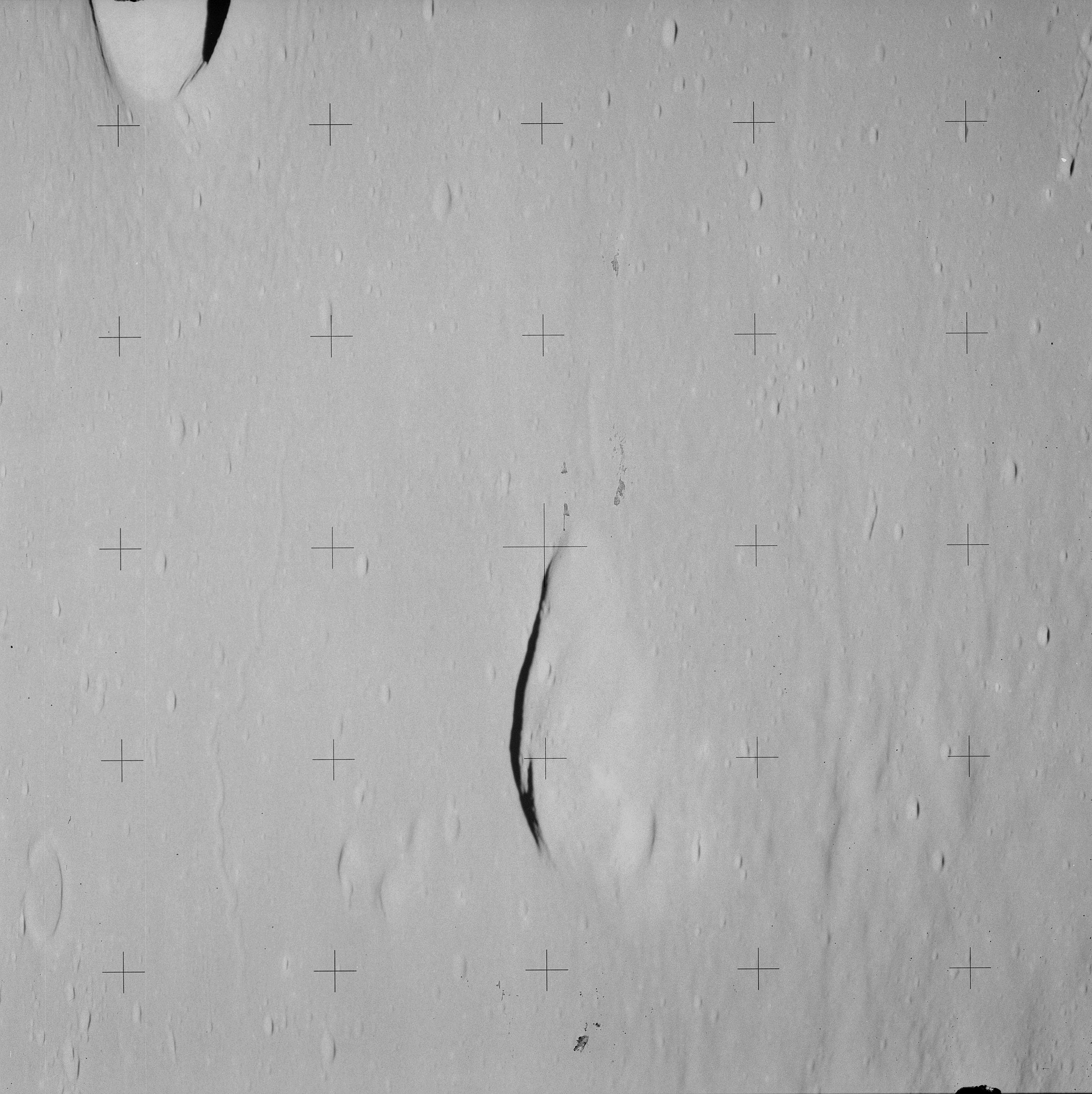 This frame was shot on 31 July 1971 at 23:53 UTC, with the camera looking vertifally down. The Sun was 23 degrees above the eastern horizon. Higher resolution versions of M-0993 available from the ASU Apollo Image Archive. Frames 0991, 0992, and 0994 also include the landing site. Scan from the original film courtesy NASA/JSC/Arizona State University.Rev. 27 Pan Camera Frame 9430 ( 392k )