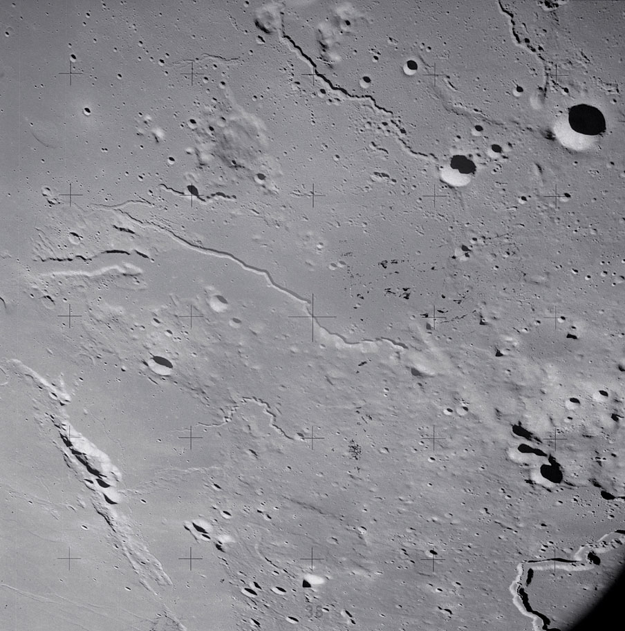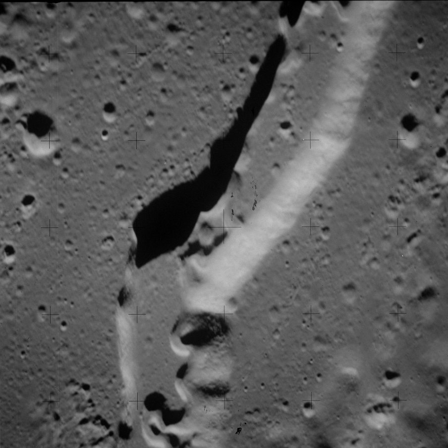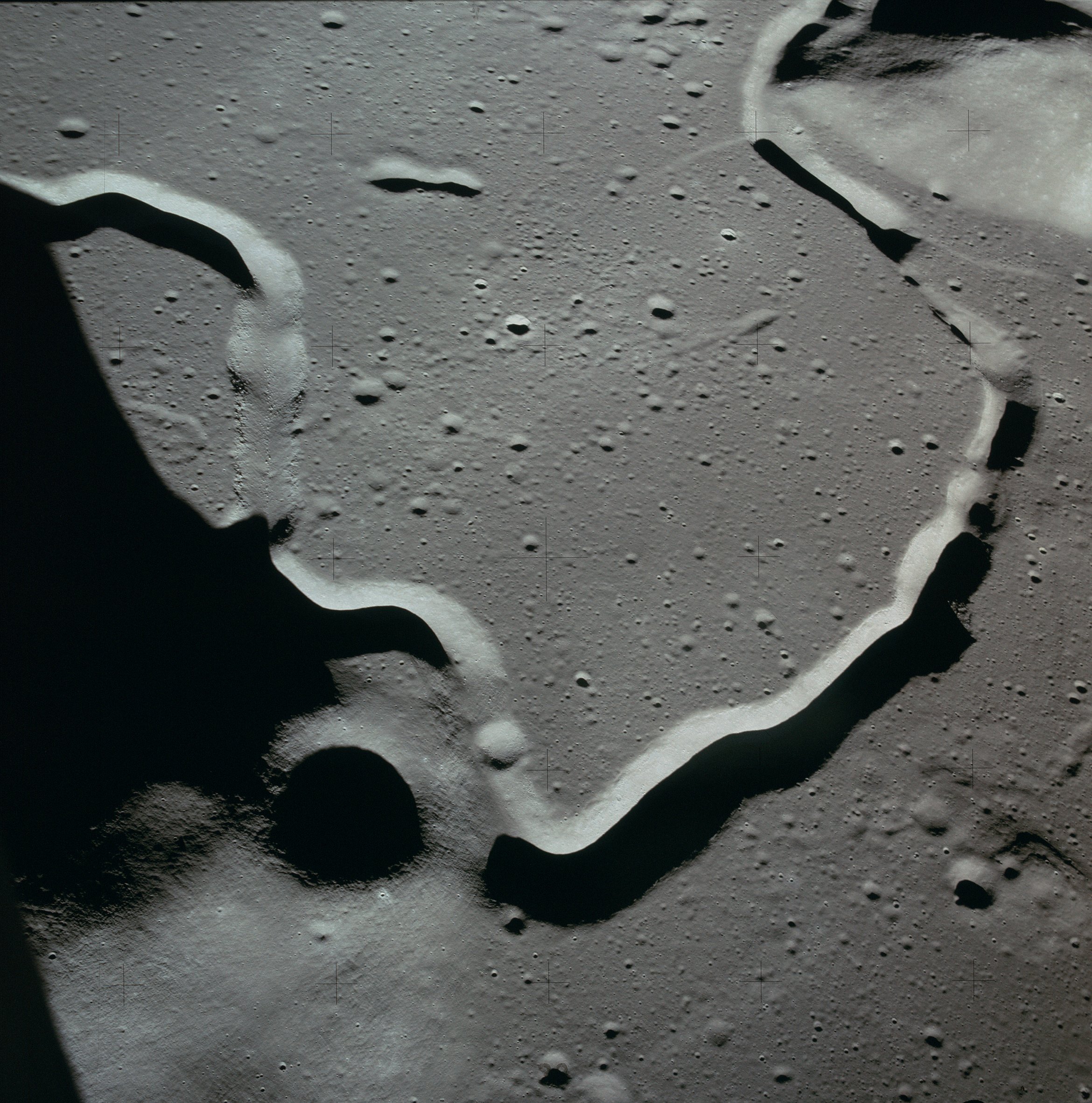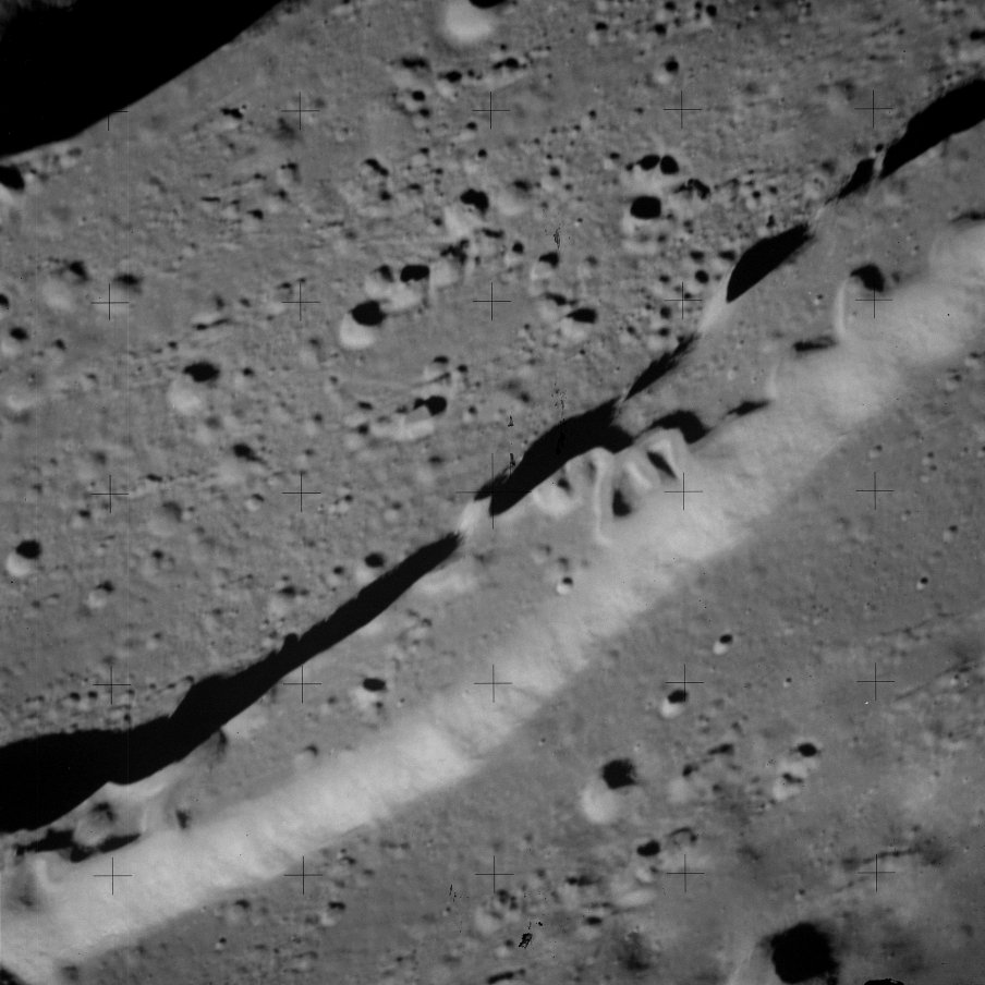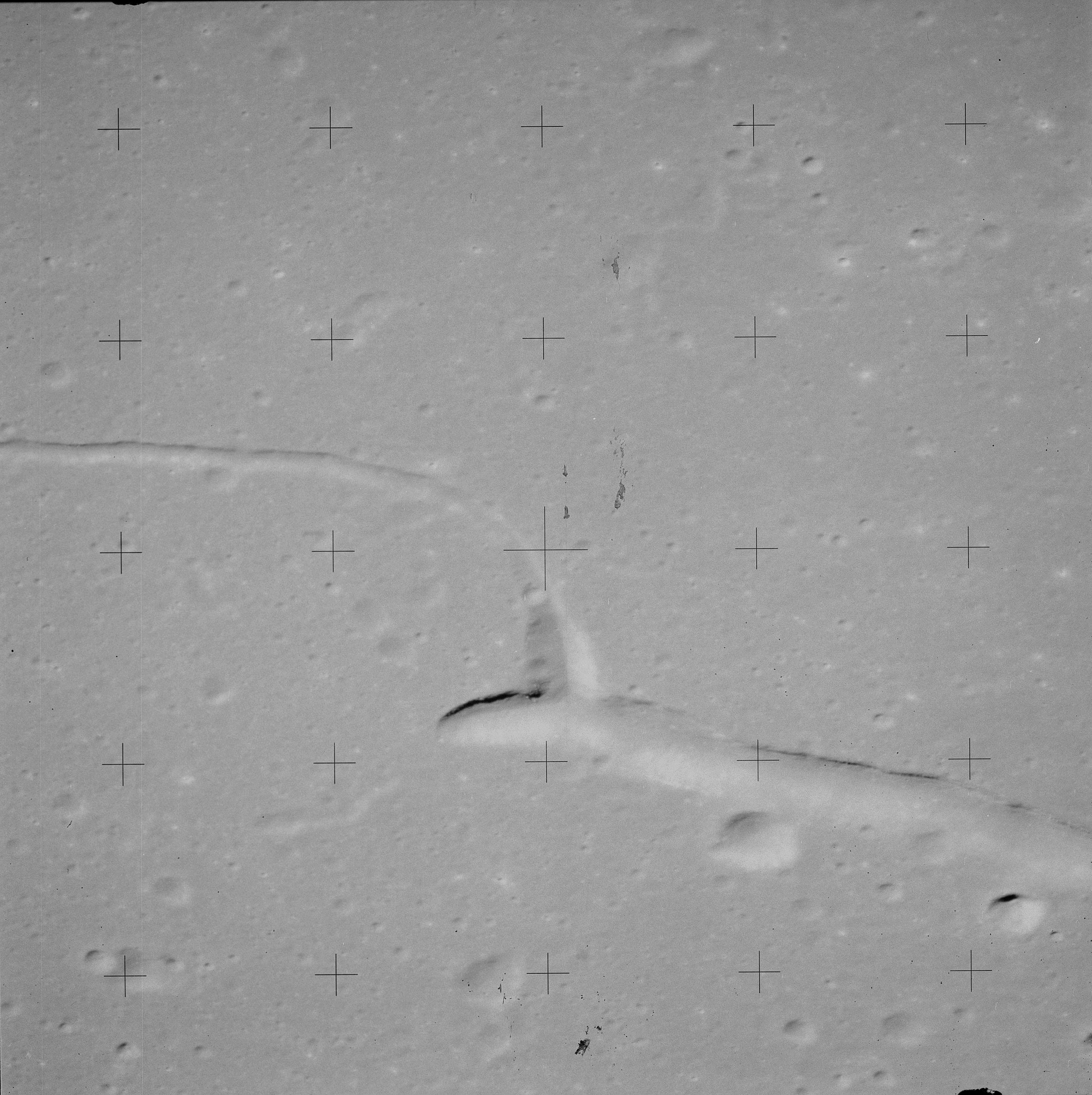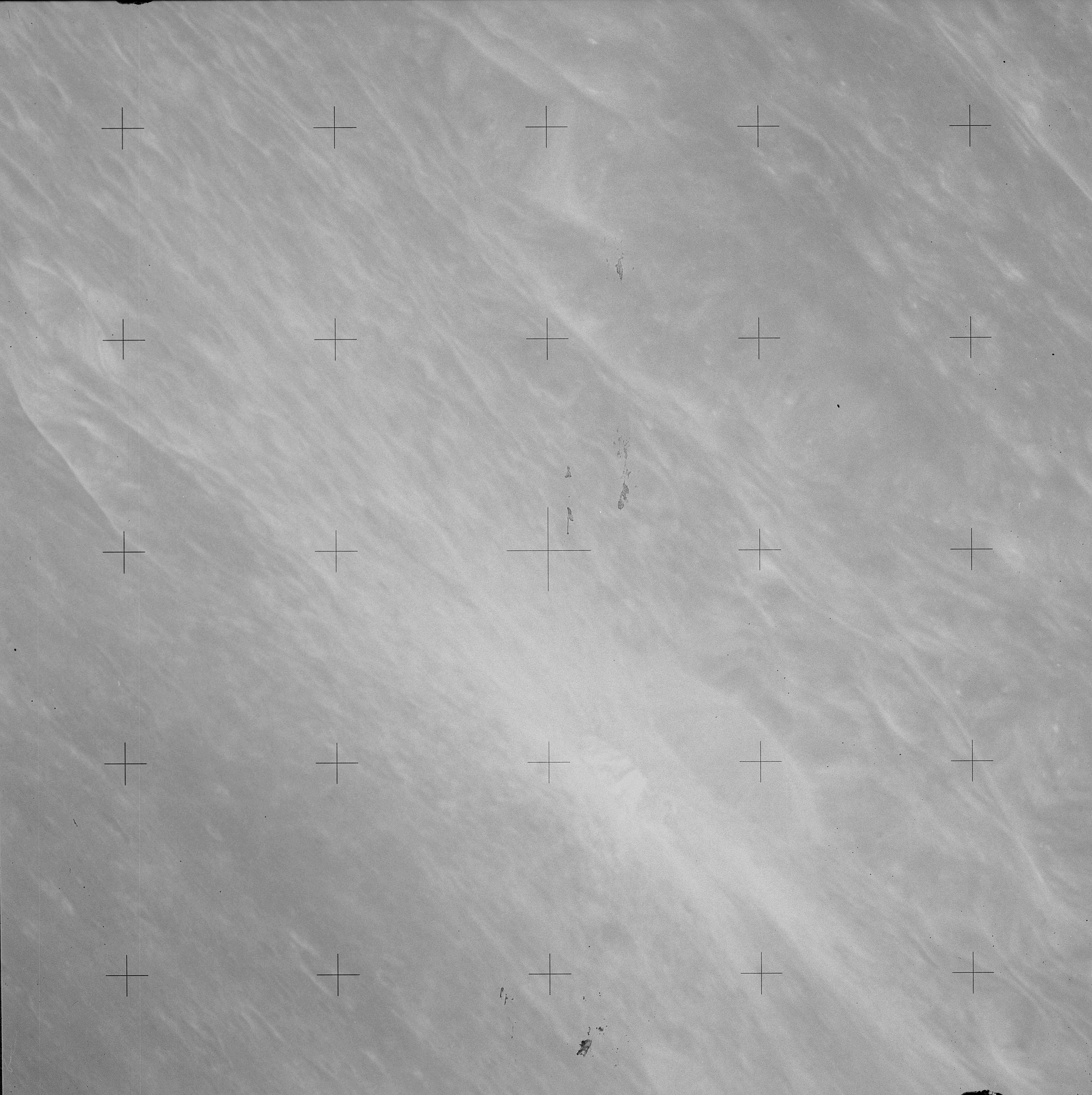 This frame was shot on 31 July 1971 at 23:53 UTC, with the camera looking vertifally down. The Sun was 23 degrees above the eastern horizon. Higher resolution versions of M-0993 available from the ASU Apollo Image Archive. Frames 0991, 0992, and 0994 also include the landing site. Scan from the original film courtesy NASA/JSC/Arizona State University.Rev. 27 Pan Camera Frame 9430 ( 392k )