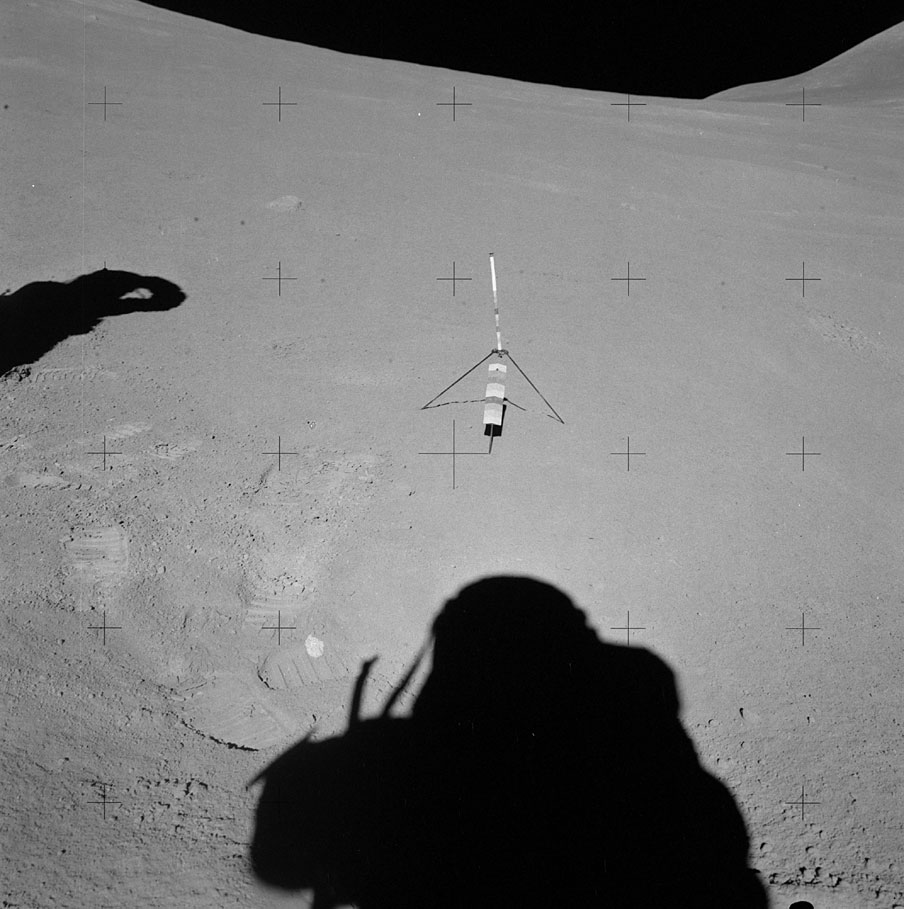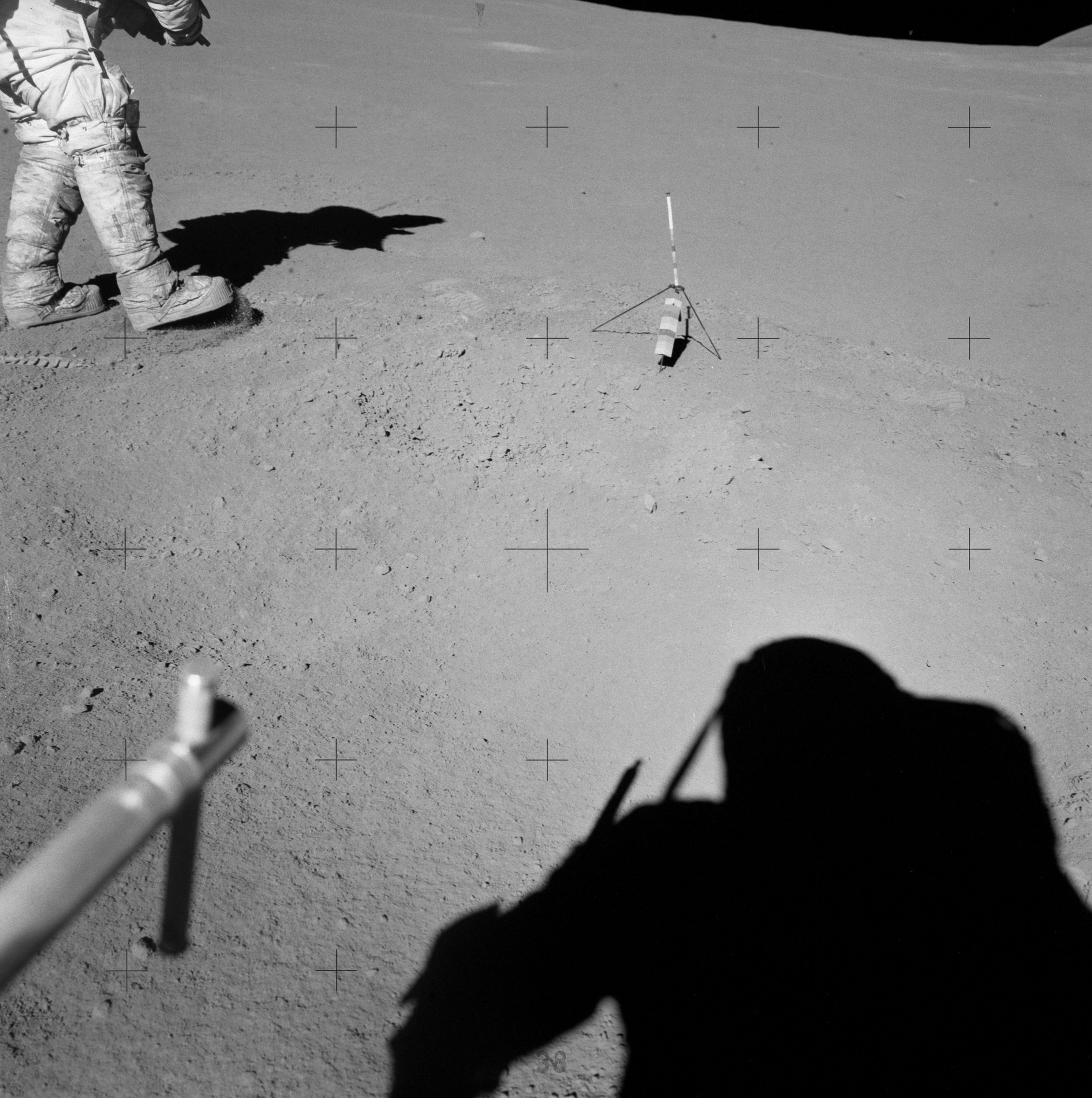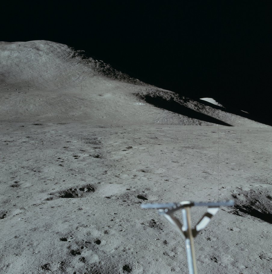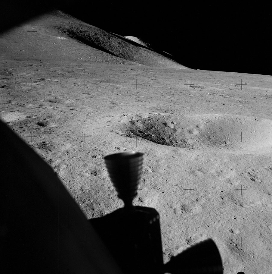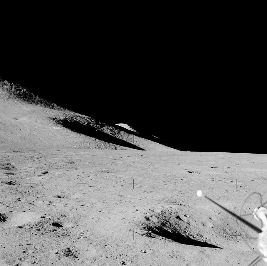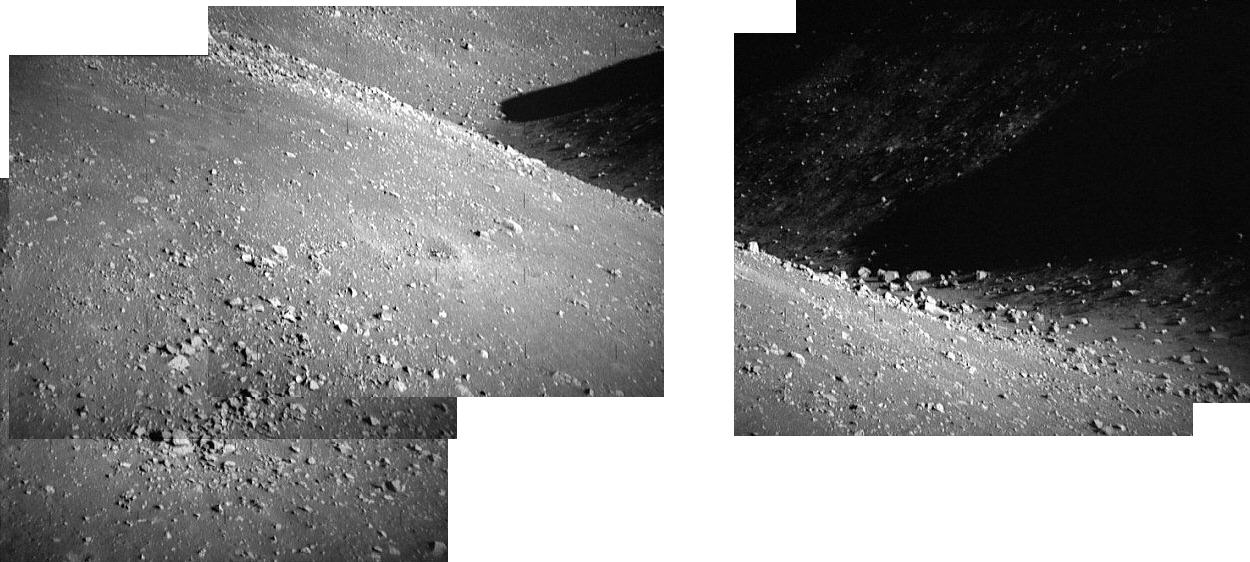 Patrick Vantuyne has combined M119829425L and M119822622L. The separation exaggerates crater depths. In a black-and-white detail from Dave's color SEVA pan, Index Crater in the foreground to the right of up-Sun. The pan was taken starting at about 106:58:27, which was about 0033 UTC on 31 July 1971. At that time, the solar elevation and azimuth were 13.1 and 96.6. The eastern rim of the crater did not cast a shadow at that time, indicating that the inner eastern wall is shallower than 13.1 degrees. Another LROC image, M131623862L, was taken 2156 UTC on 19 June 2010 when the solar elevation was 8.4 degrees. At that time, the eastern half of the crater was nearly filled with shadow, indicating that the inner slope is close to 8.4 degrees. Note that the western rims of some of the small, sharp-rimmed craters within the eastern half of Index are sun lit, another indication that the solar elevation is close to the inner slope.20 July 2011 23:05:01 UTC; image M165842369R; Solar El/Az 19.1/259.1; Full-image center Lat/Long 26.11/3.44; sub-LRO Lat/Long 26.11/0.66; LRO altitude 44 km, resolution 1.66 (width)/0.55(height m/pixel ( 300 Mb TIFF)