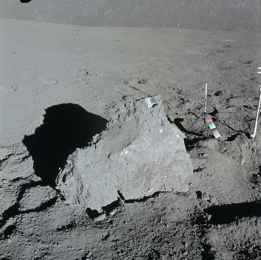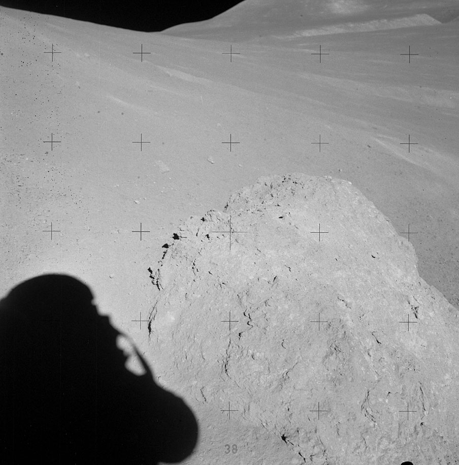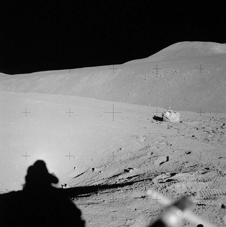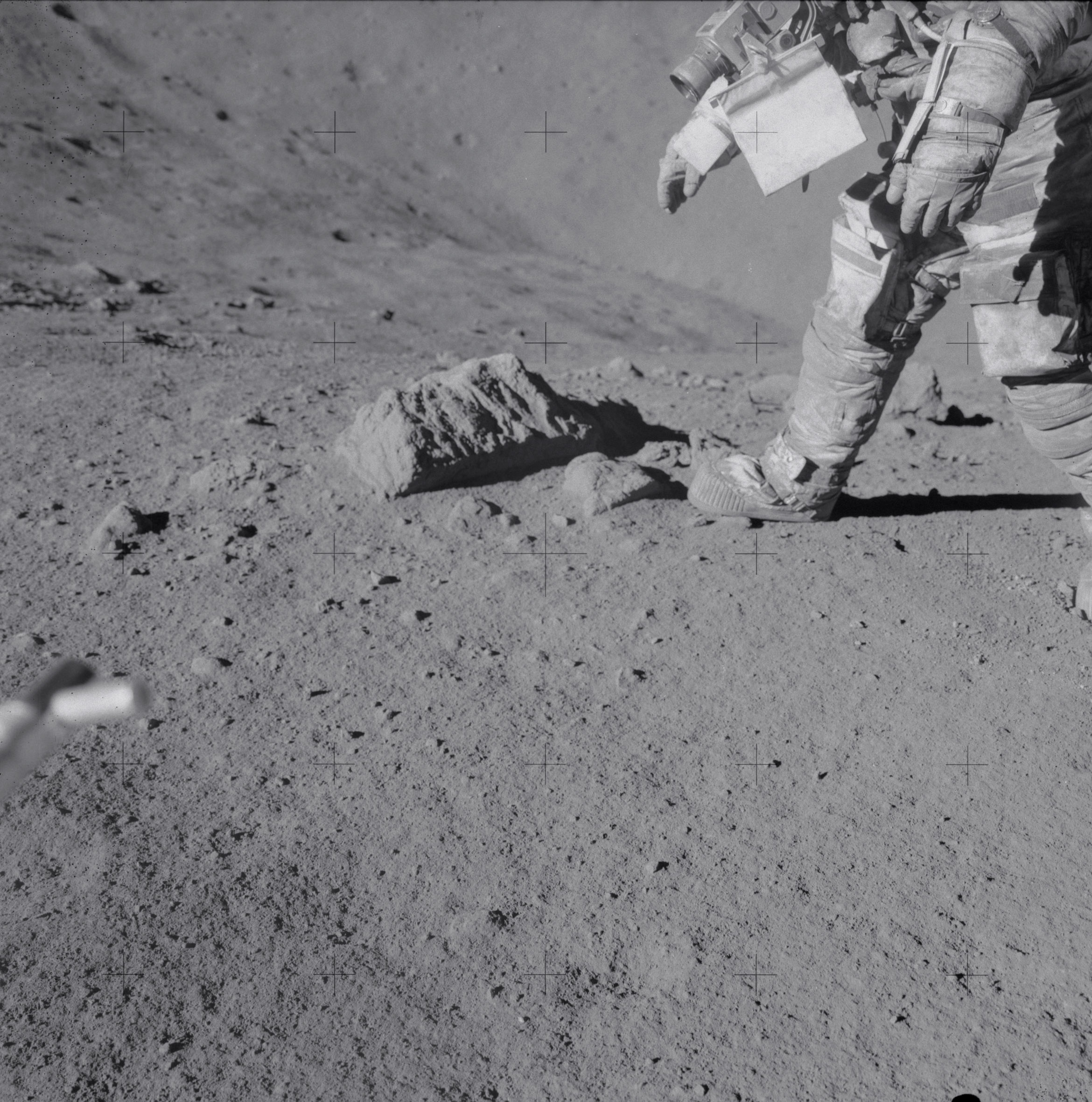Fifth view of Great Scott. Portions of the rock just above the nose pointing toward the camera and to the right of the nose are in excellent focus. The cube at the lower right is one inch (2.54 cm) on eash side.S71-44766 (11 Mb or 0.3 Mb)