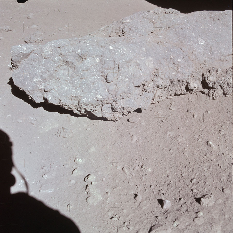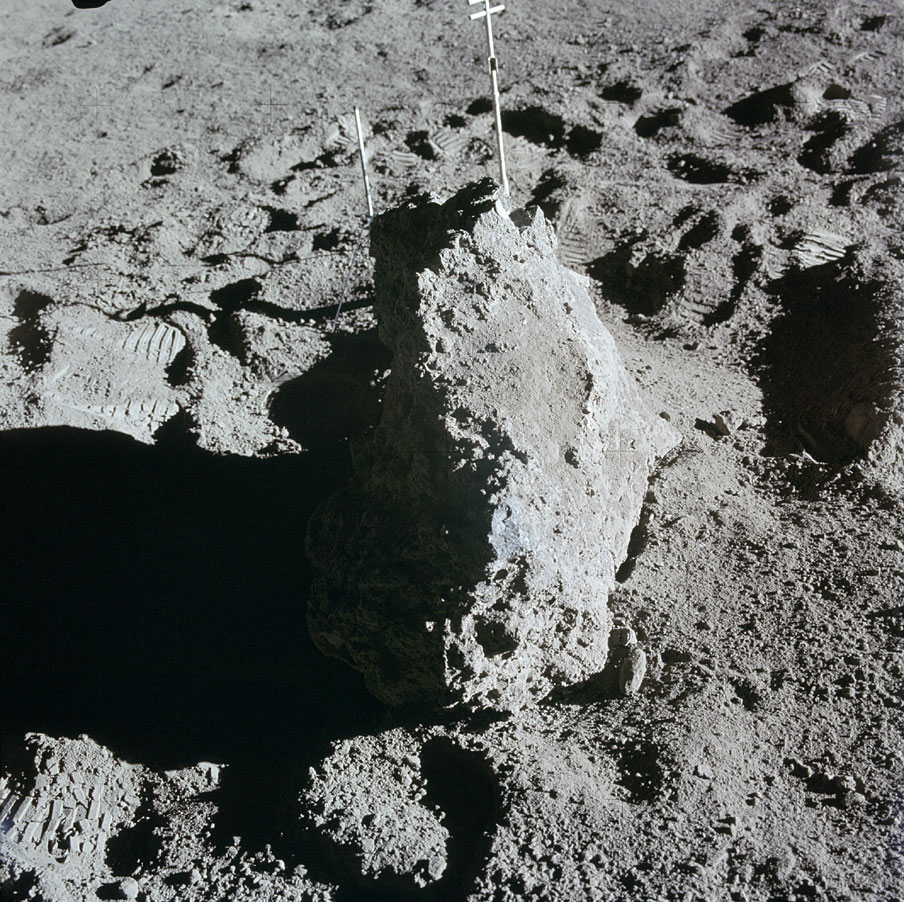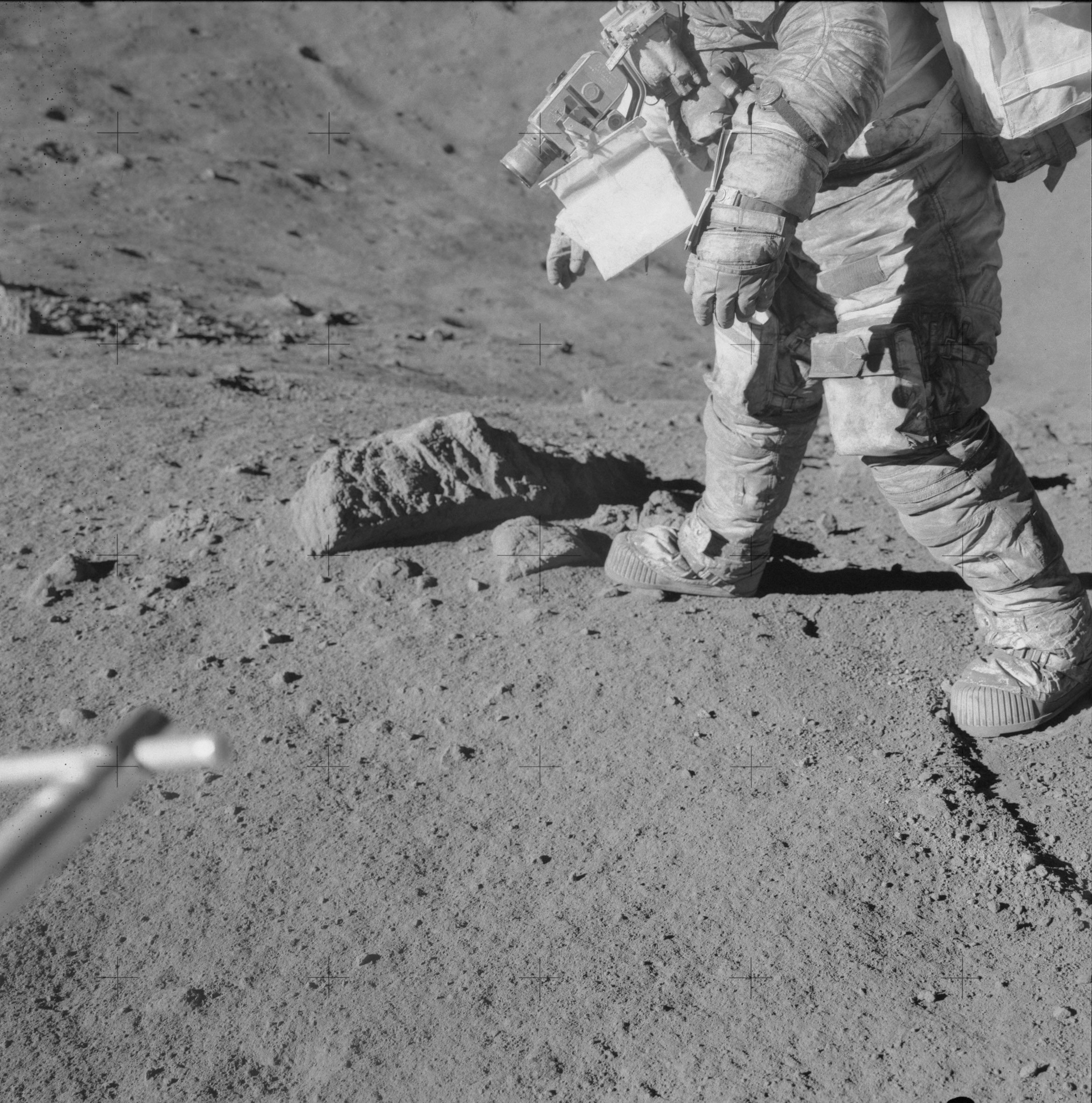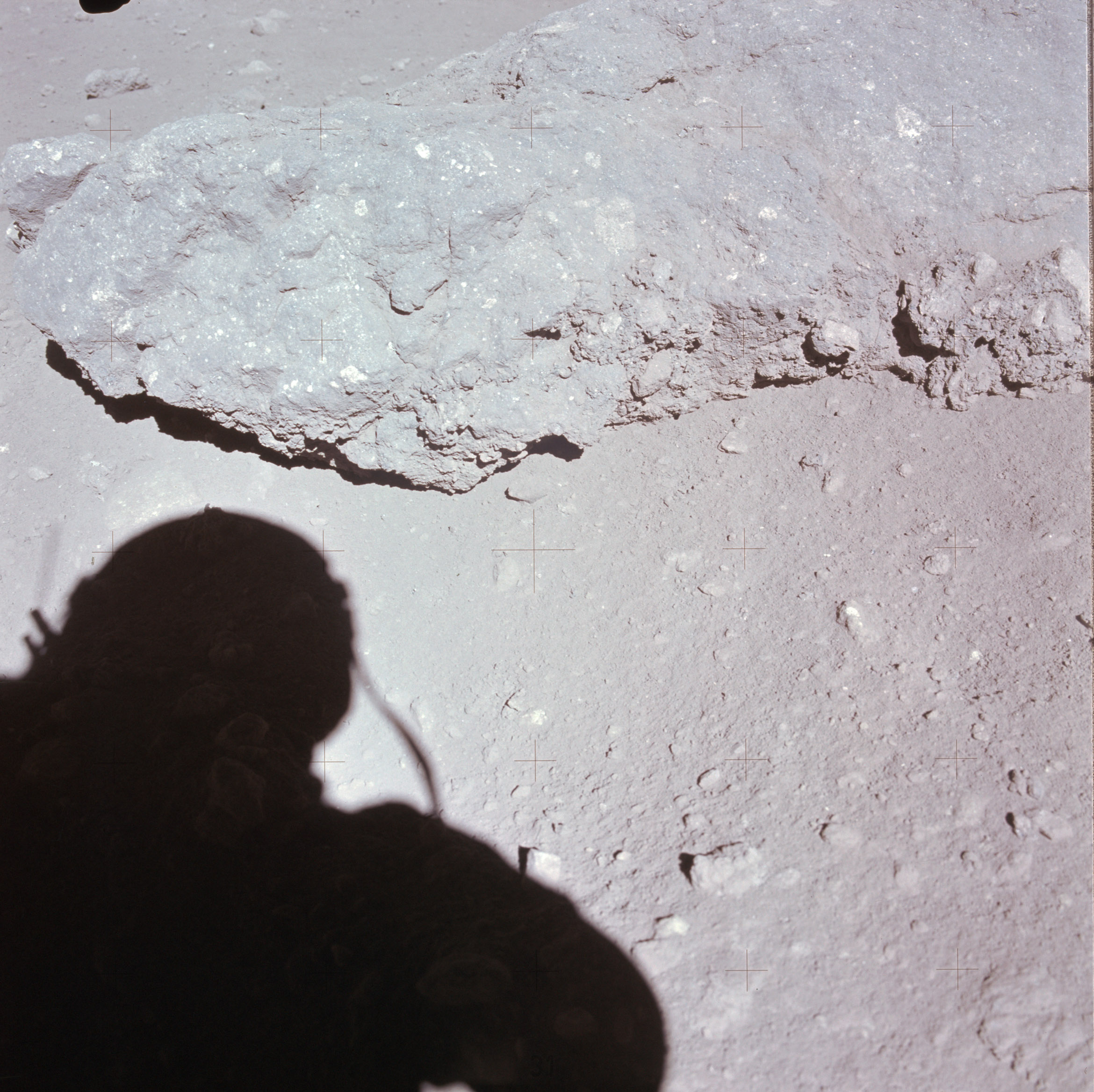Fifth view of Great Scott. Portions of the rock just above the nose pointing toward the camera and to the right of the nose are in excellent focus. The cube at the lower right is one inch (2.54 cm) on eash side.S71-44766 (11 Mb or 0.3 Mb)