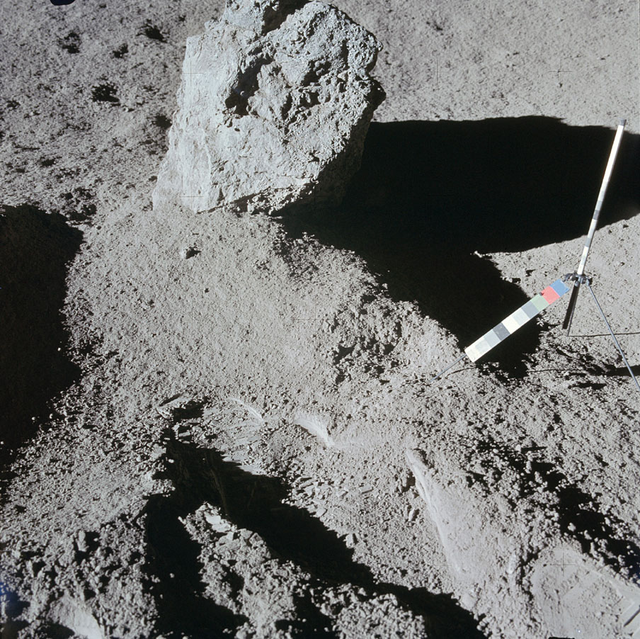 Sixth view of Great Scott. Black and white image. Similar to 43391, but with the rock rotated to the left by about 45 degrees relative to the camera position. The cube at the lower right is one inch (2.54 cm) on eash side.S71-44774 (5 Mb or 0.3 Mb)