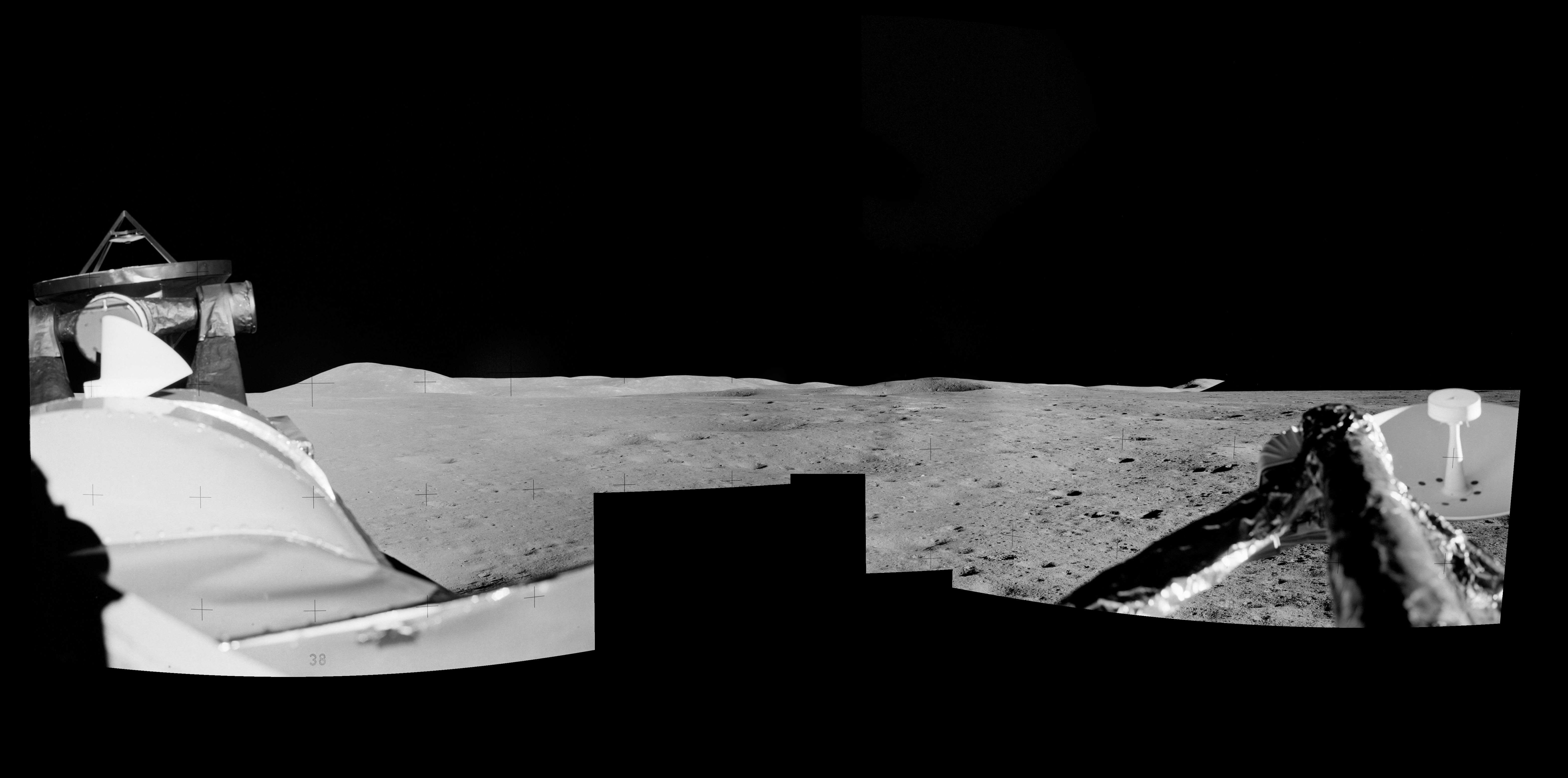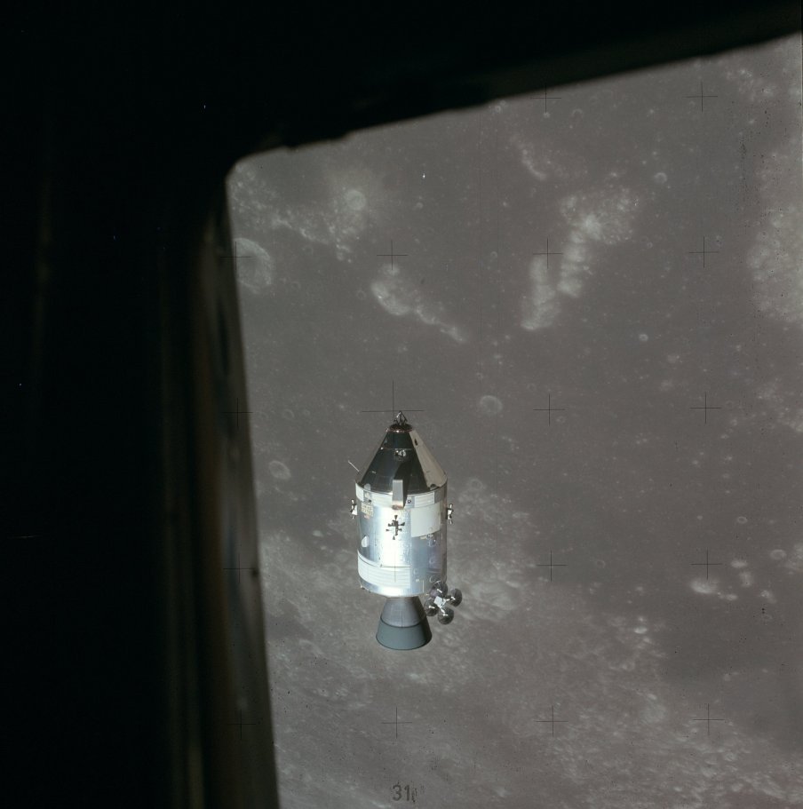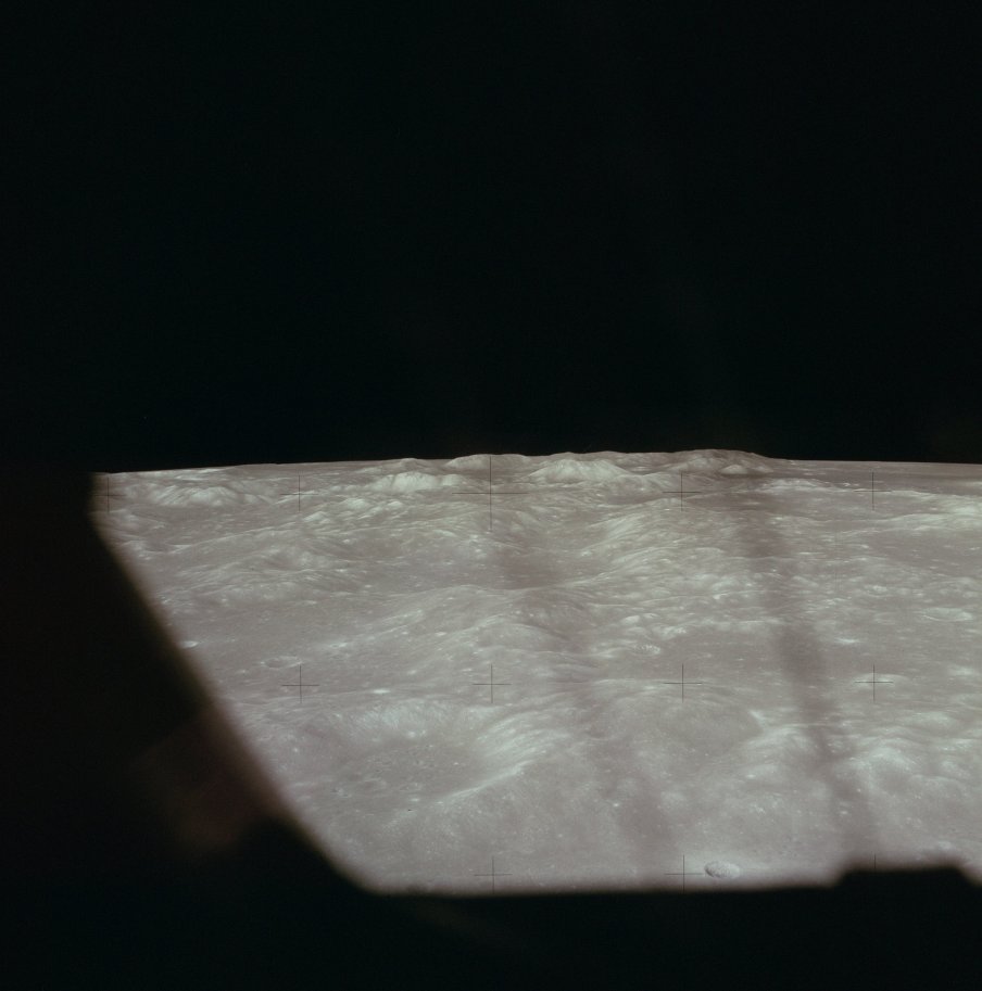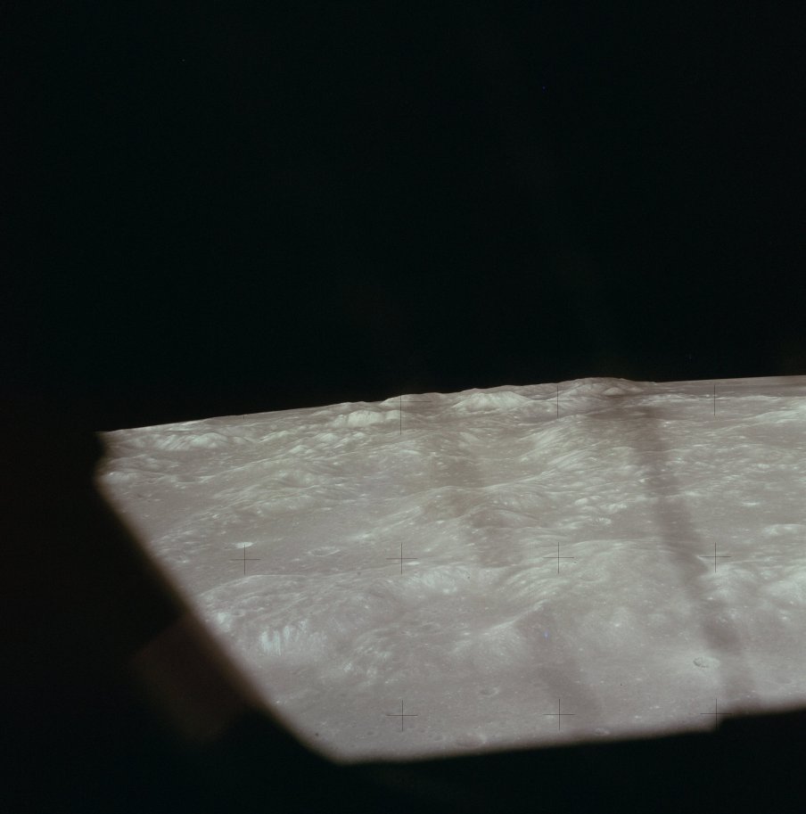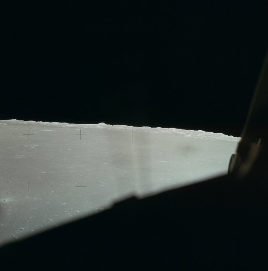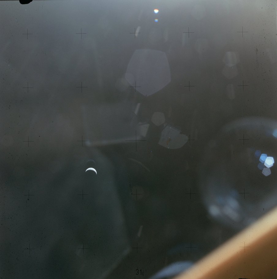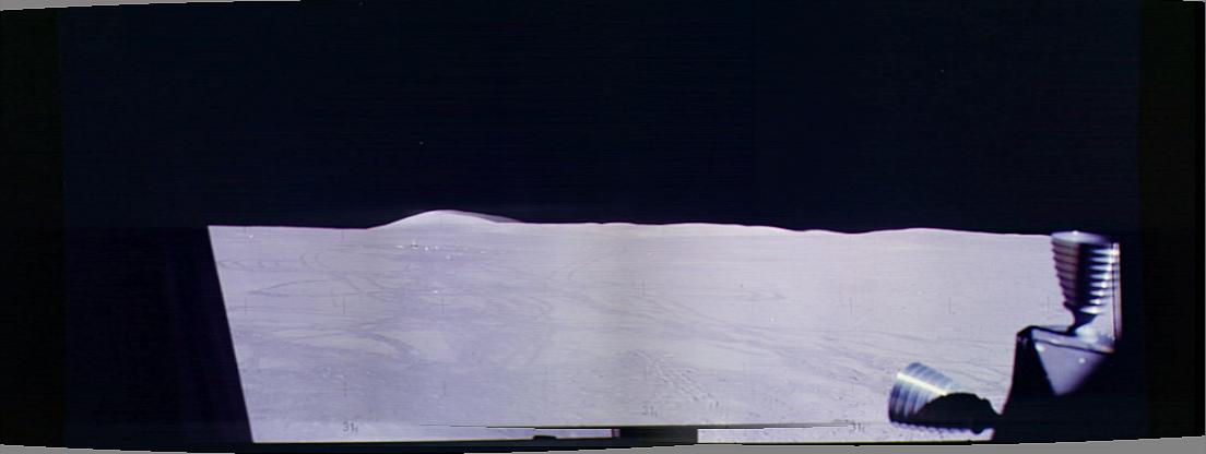 At some point after the SEVA but prior to EVA-1, Dave and Jim took a series of pictures out the windows. The photos taken out Jim's window are 11394 to 11397. Assembled by Erik van Meijgaarden.107:31:57 Post-SEVA Window Pan
