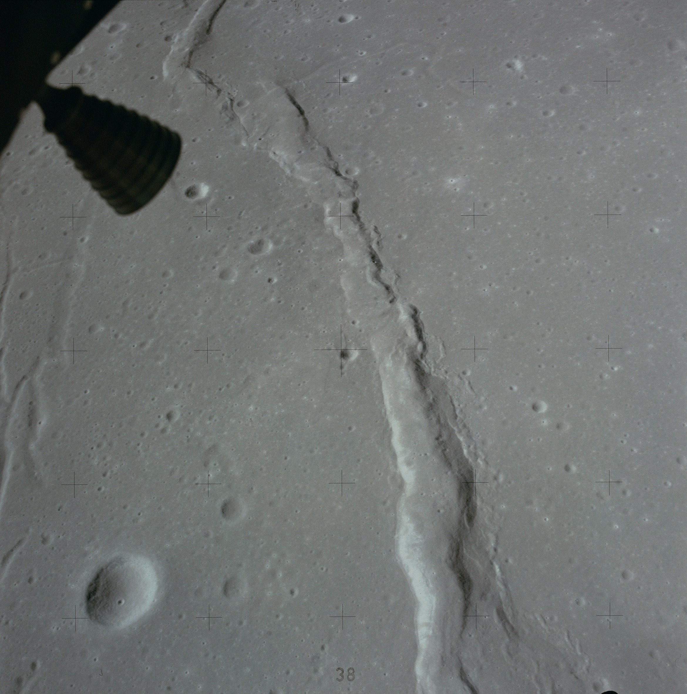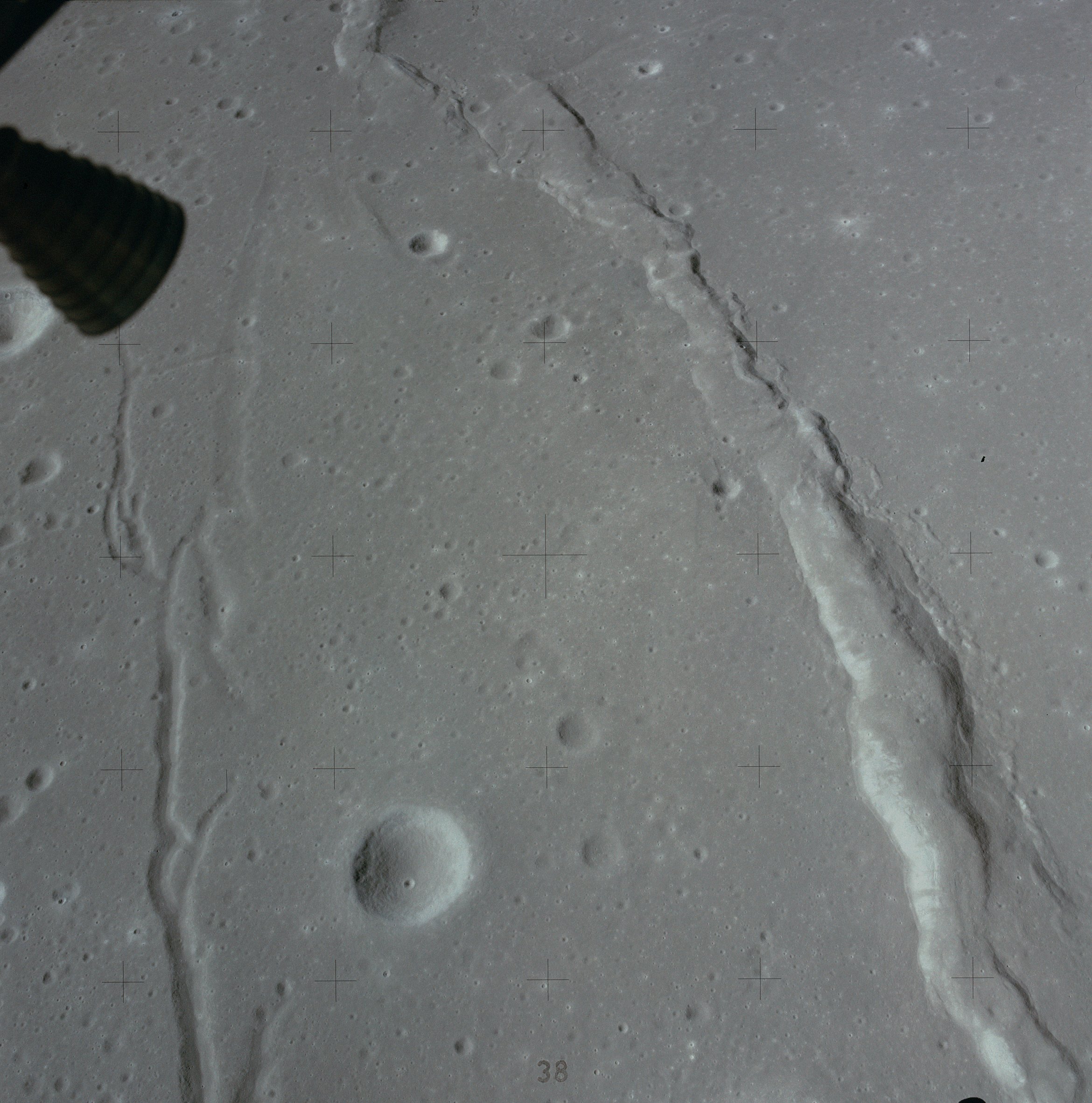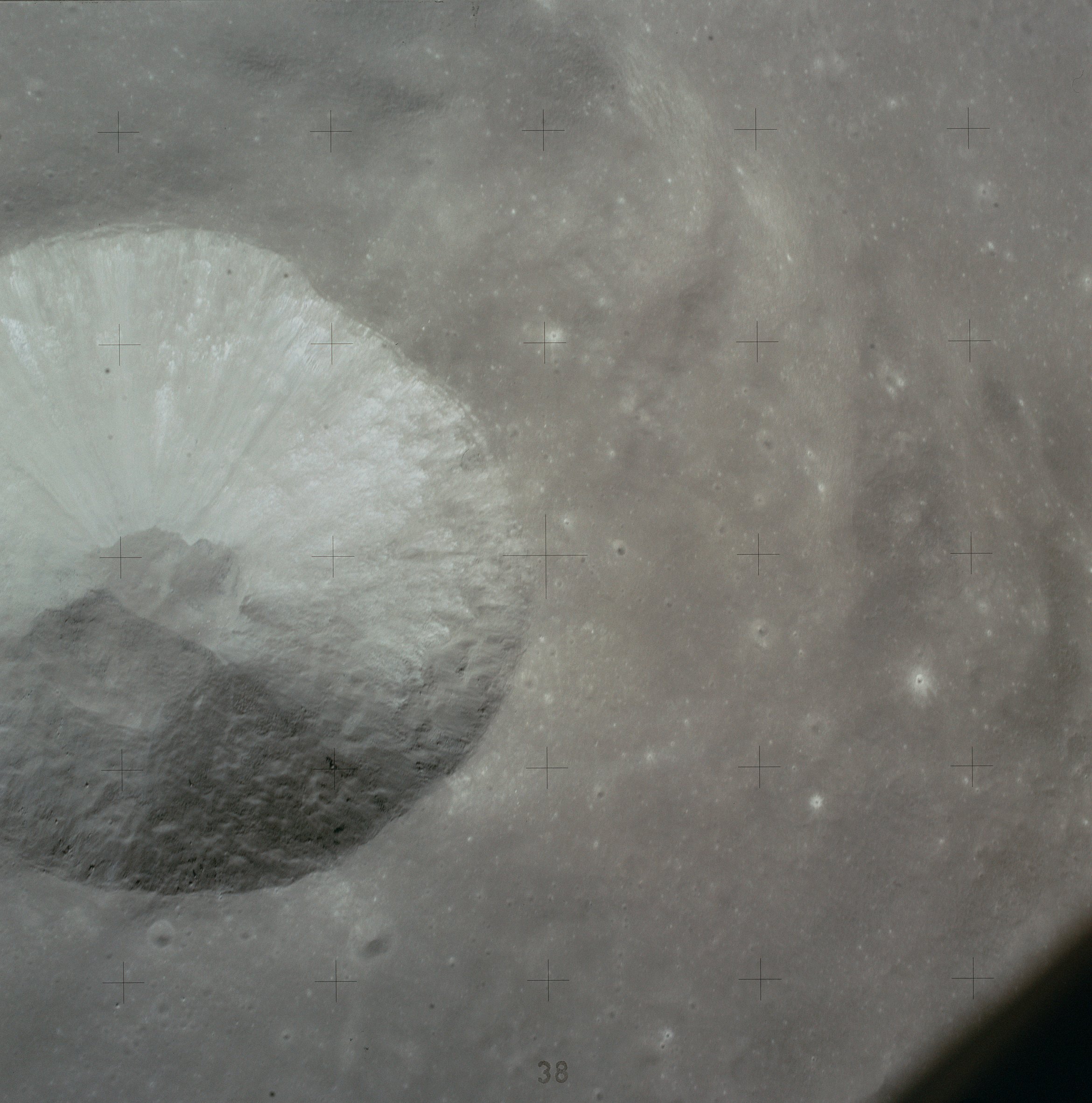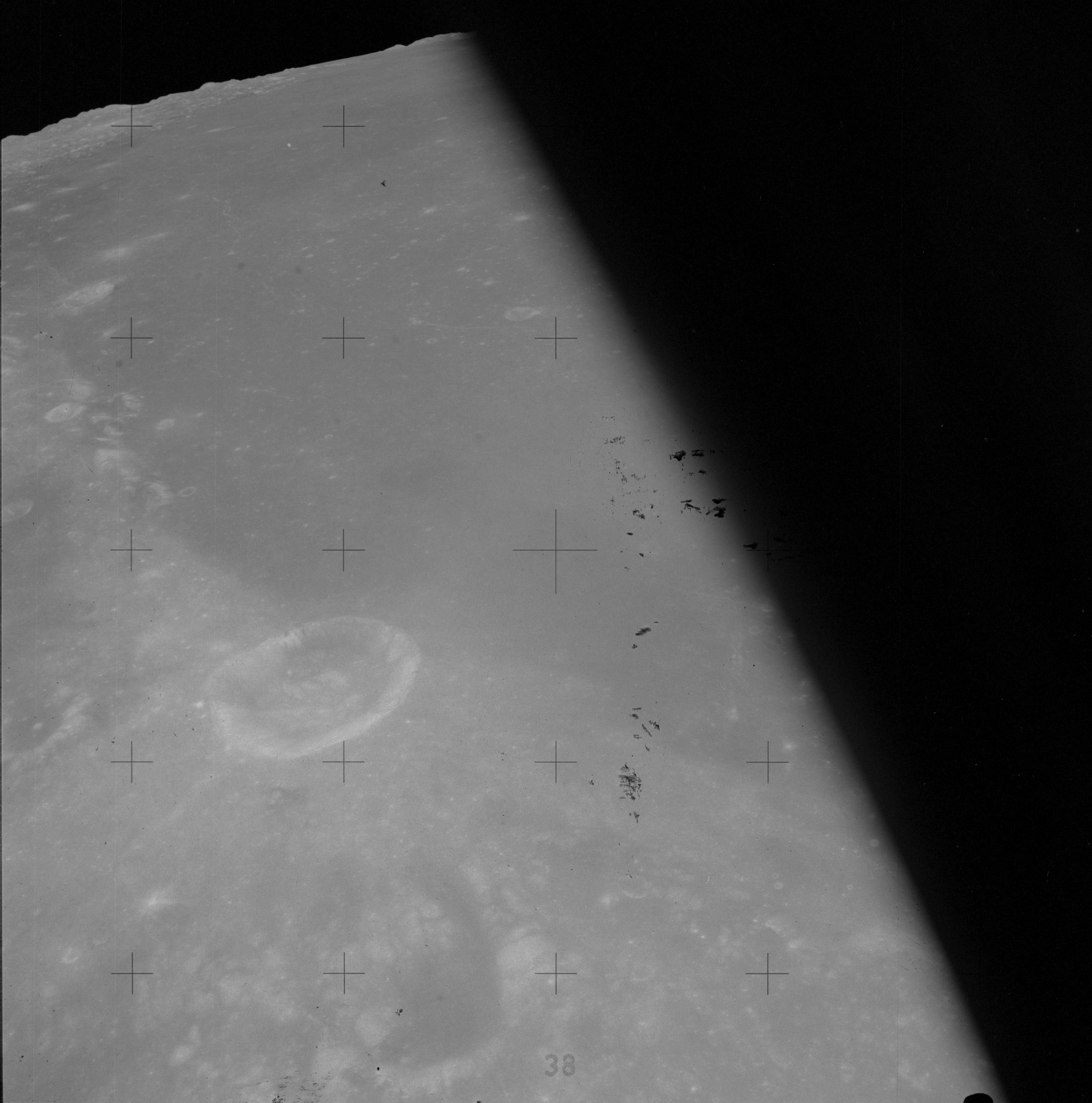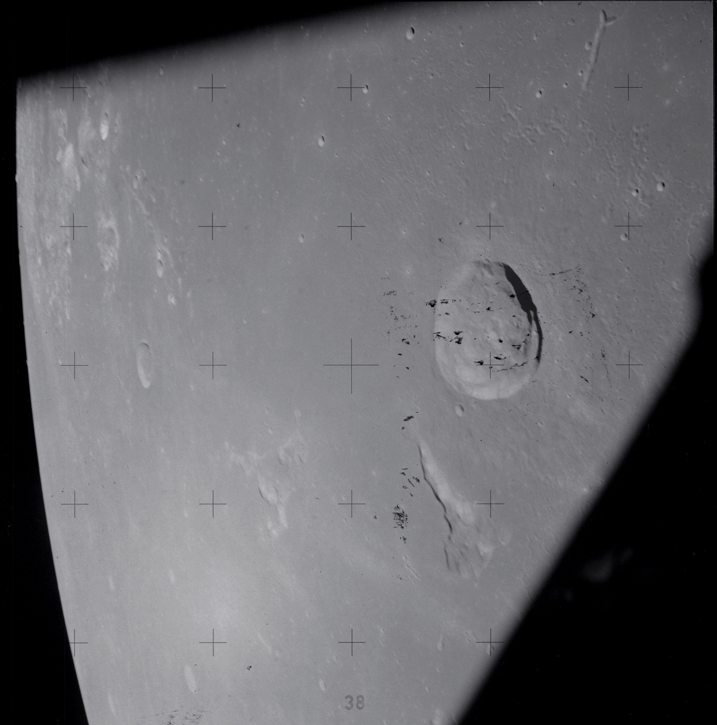 This frame was taken on 1 August 1971 at 15:38 UTC; it shows an oblique view of the landing site at left center and, at the upper right, craters Autolycus and Aristillus. North is to the right. The camera tilt is 40 degrees. Solar elevation is 31 degrees. The smaller version is labeled. Higher resolution versions of M-1537 available from the ASU Apollo Image Archive. Frame 1536 also shows the landig site. Scan courtesy Stephen Tellier, LPI.Rev 38 Mapping (Metric) Camera Frame 1676 ( 13 Mb )See, also, a medium resolution version ( 12 Mb ) of the scan from the original film courtesy NASA/JSC/Arizona State University.