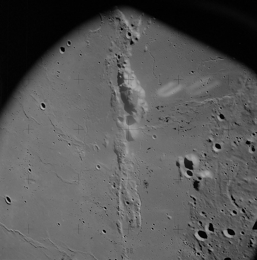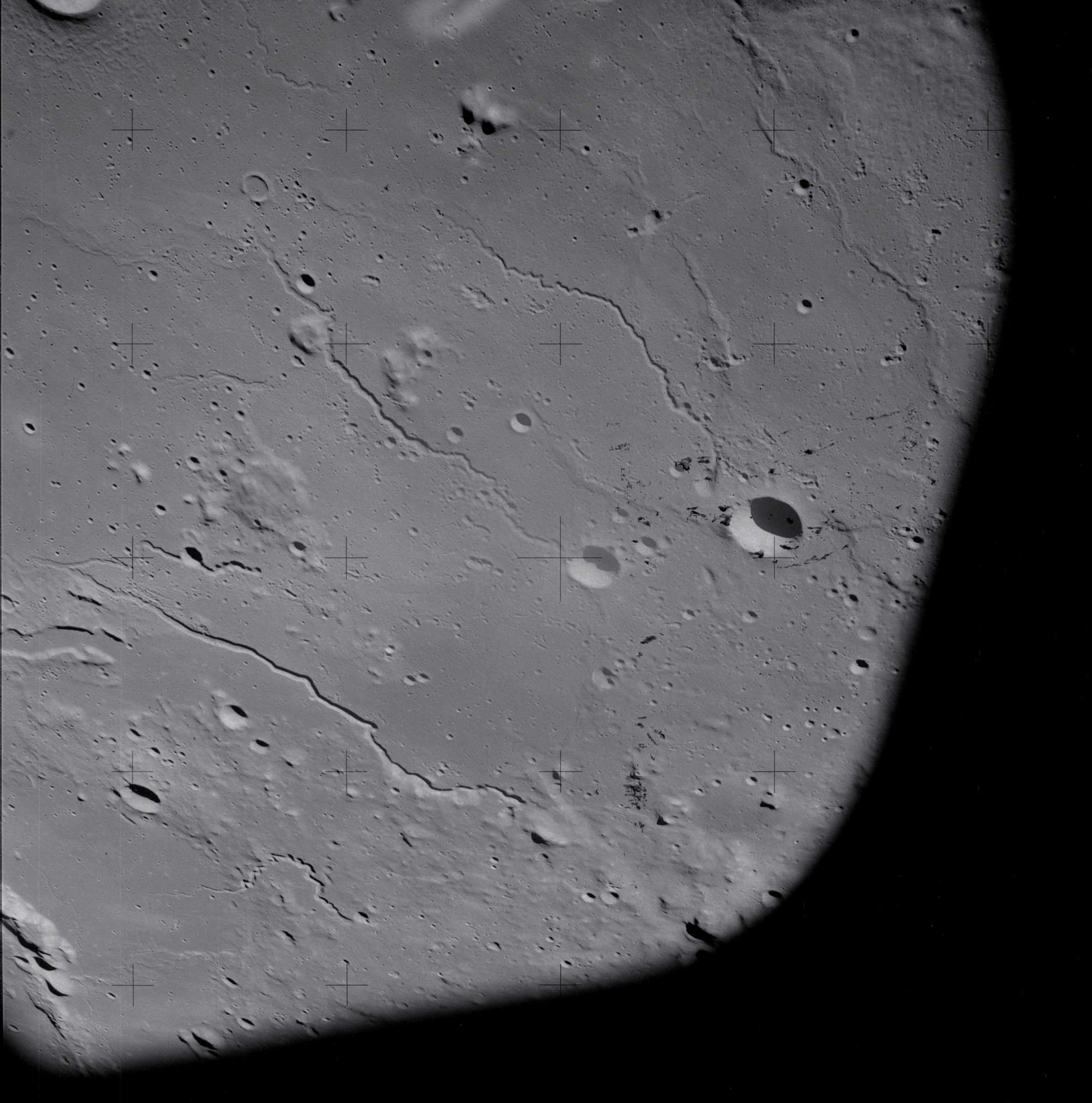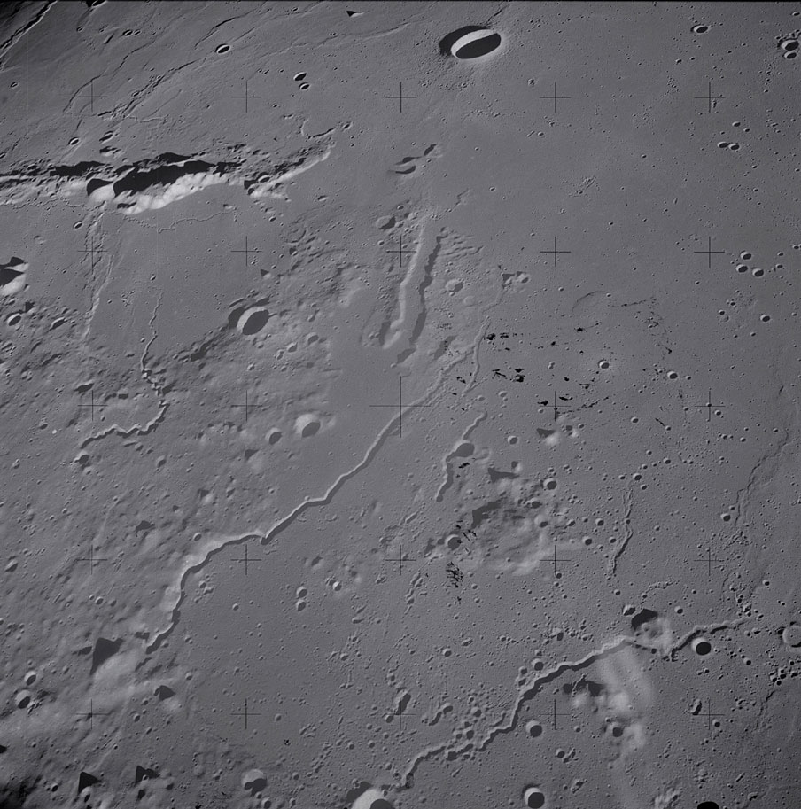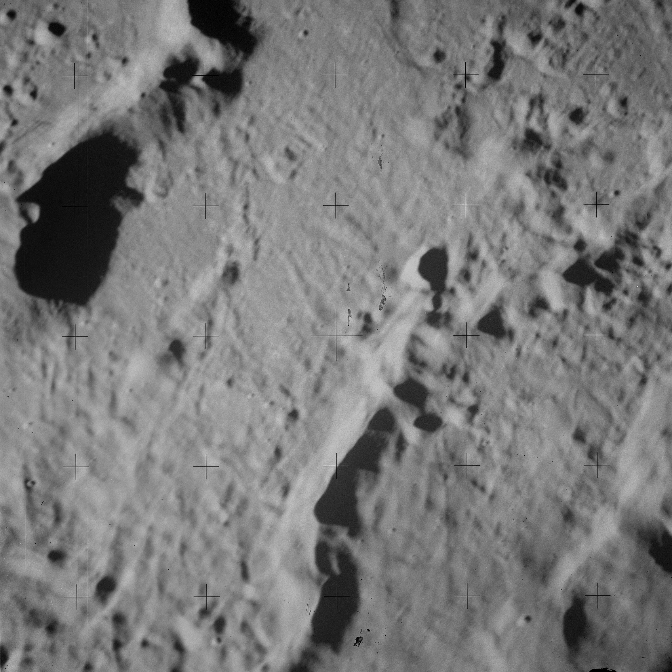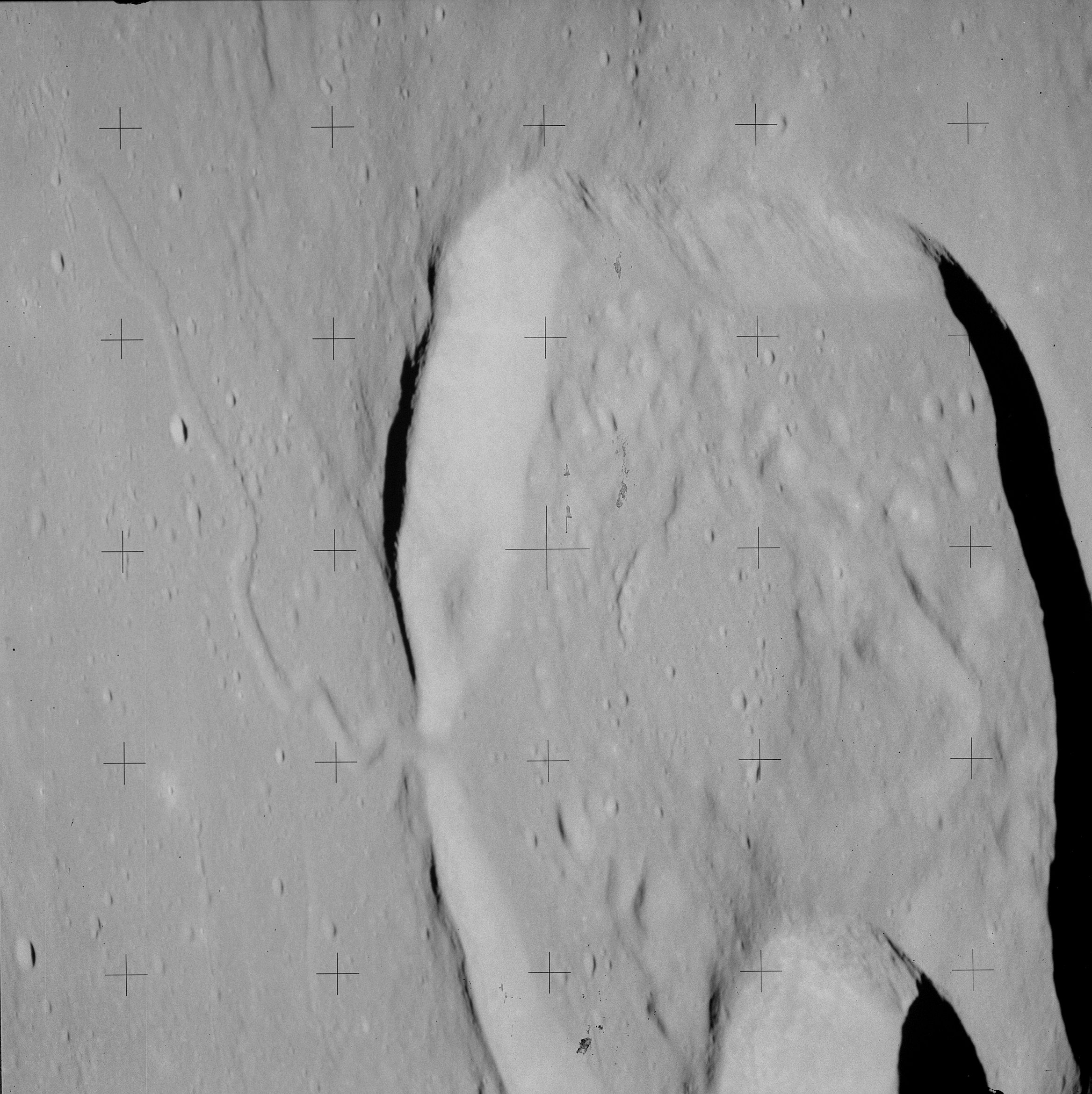 This frame was shot on 1 August 1971 at 13:40 UTC, with the camera titled 25 degrees from vertical. The Sun was 29 degrees above the eastern horizon. Higher resolution versions of M-1422 available from the ASU Apollo Image Archive. Frames 1423 and 1424 also include the landing site. Scan from the original film courtesy NASA/JSC/Arizona State University.Rev. 35 Apollo 15 Mapping (Metric) Camera Frame 1537 ( 3.4 Mb or 269k )