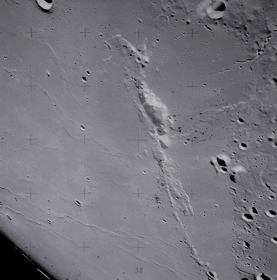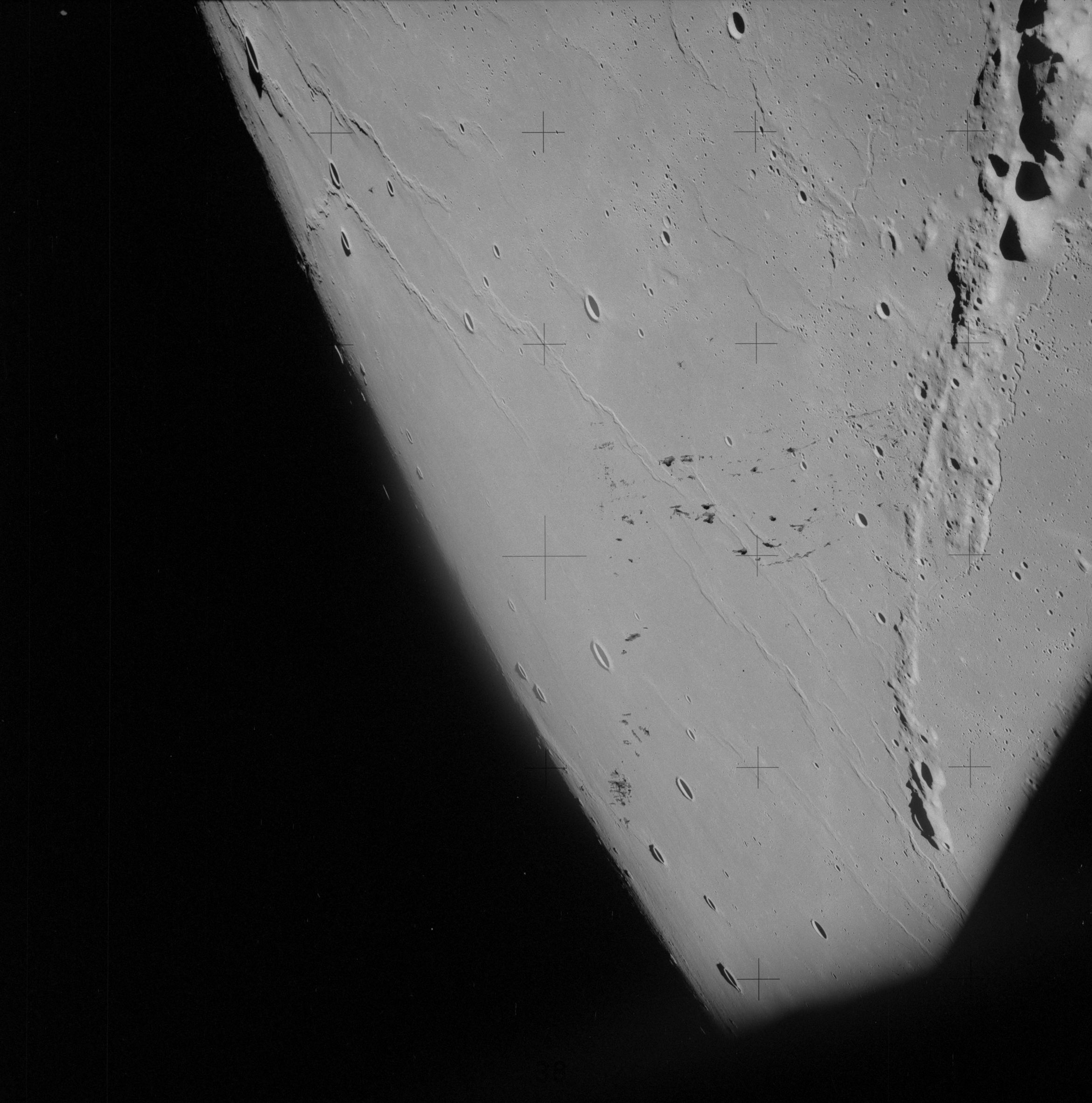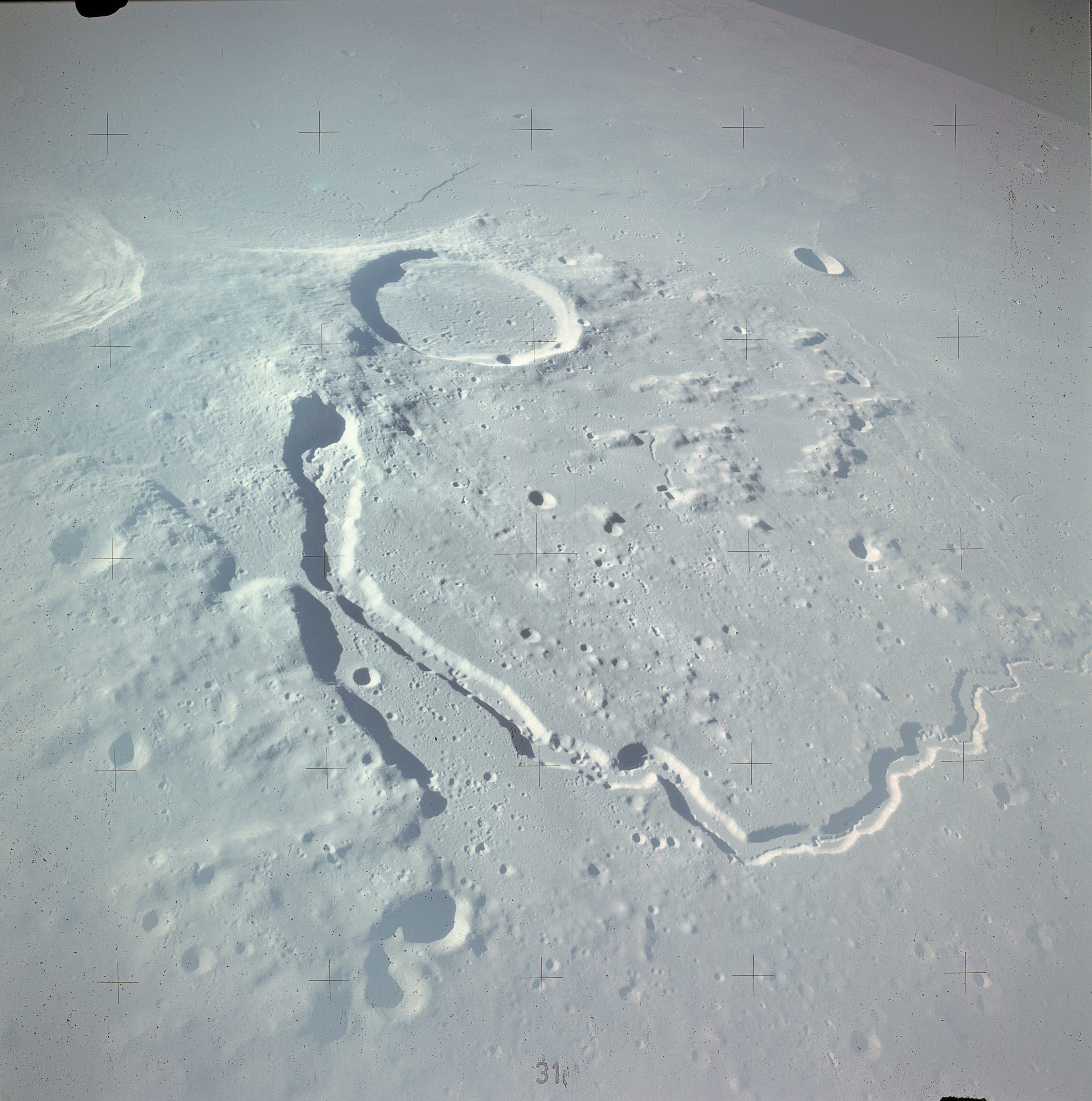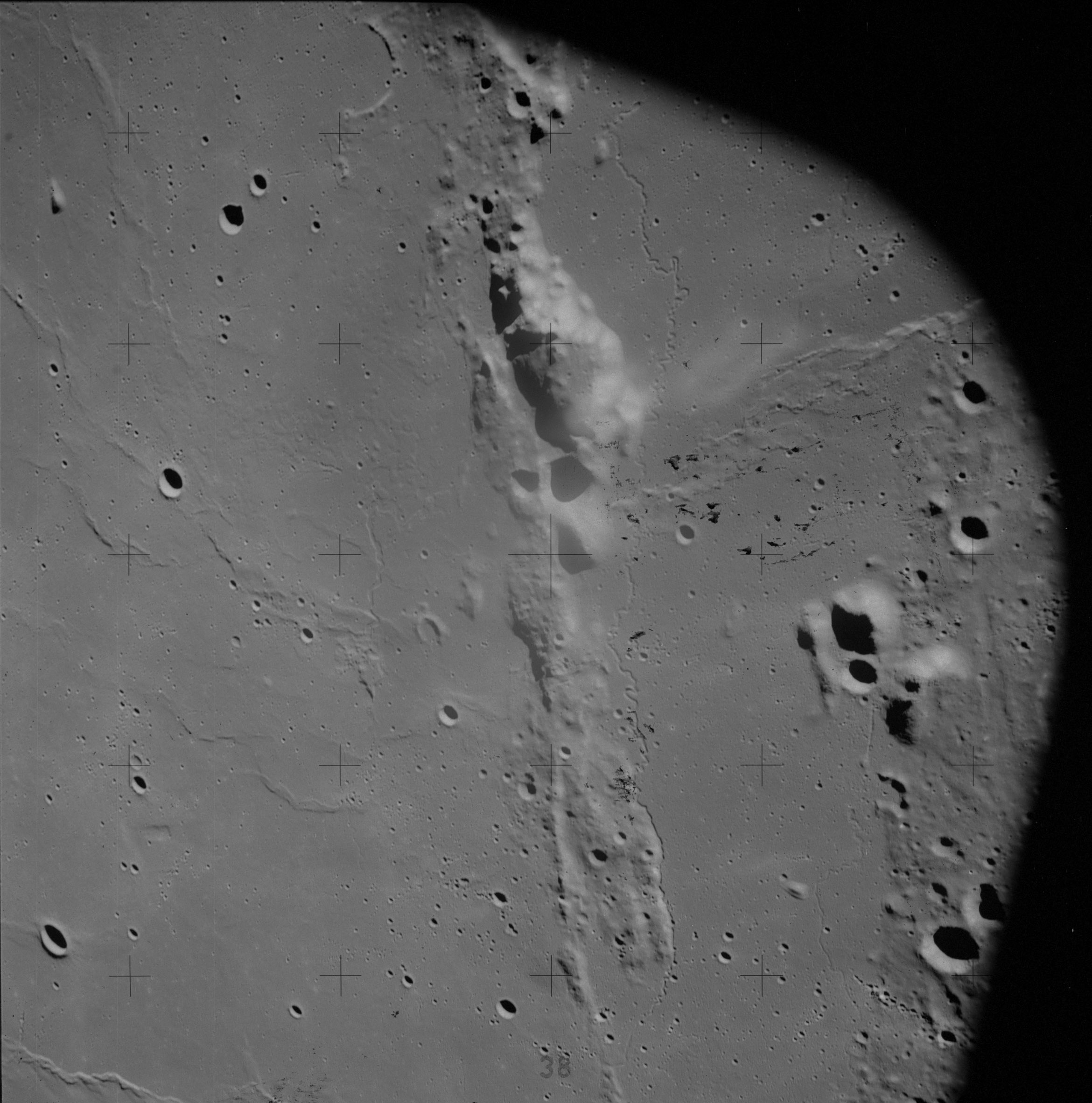 This frame was shot on 1 August 1971 at 13:40 UTC, with the camera titled 25 degrees from vertical. The Sun was 29 degrees above the eastern horizon. Higher resolution versions of M-1422 available from the ASU Apollo Image Archive. Frames 1423 and 1424 also include the landing site. Scan from the original film courtesy NASA/JSC/Arizona State University.Rev. 35 Apollo 15 Mapping (Metric) Camera Frame 1537 ( 3.4 Mb or 269k )