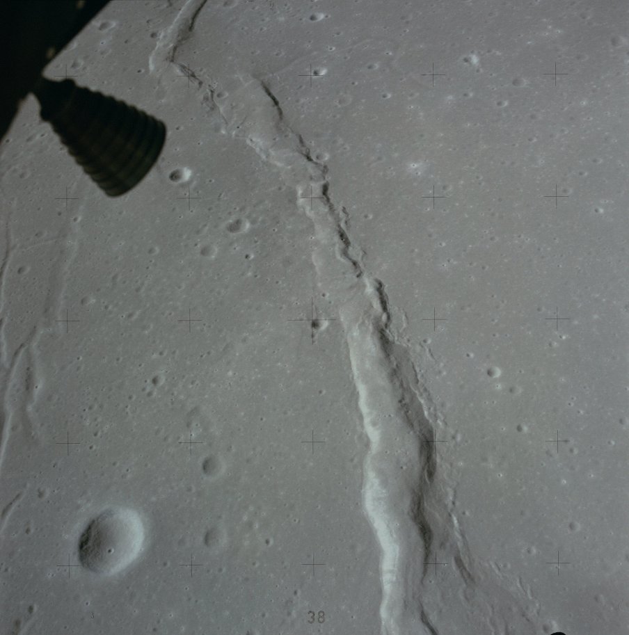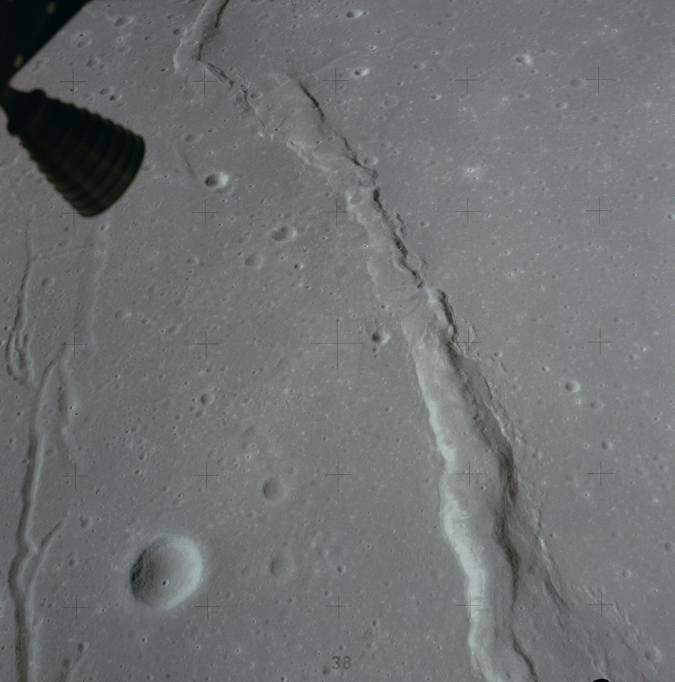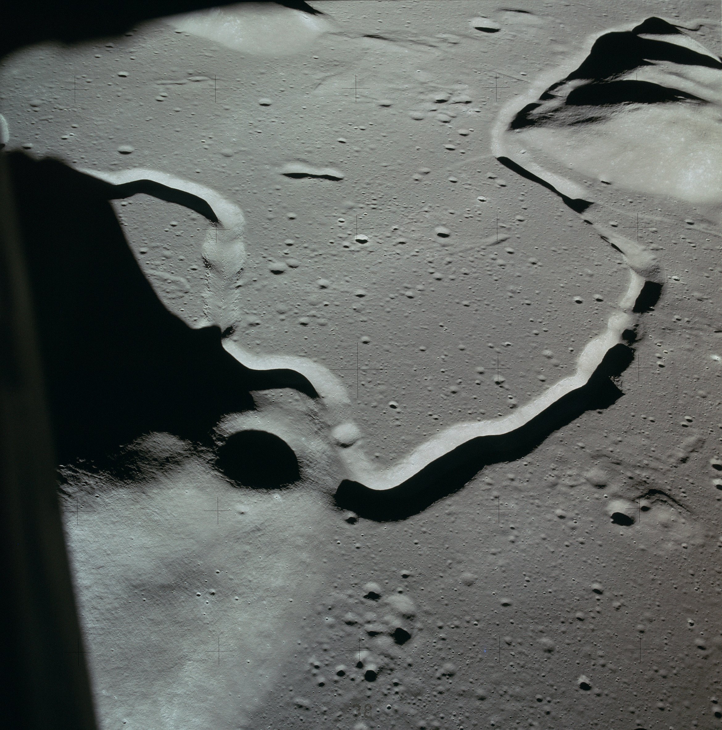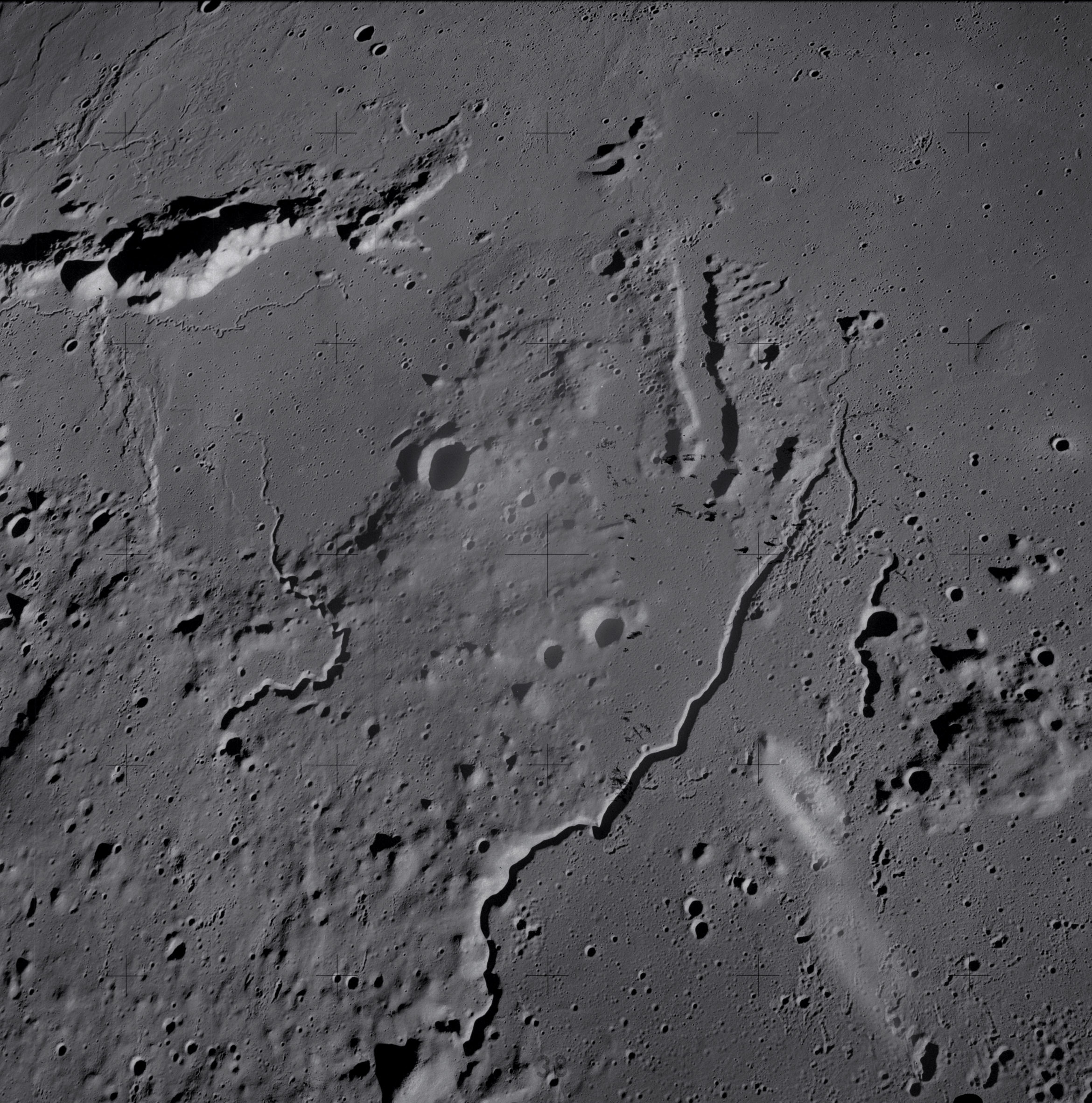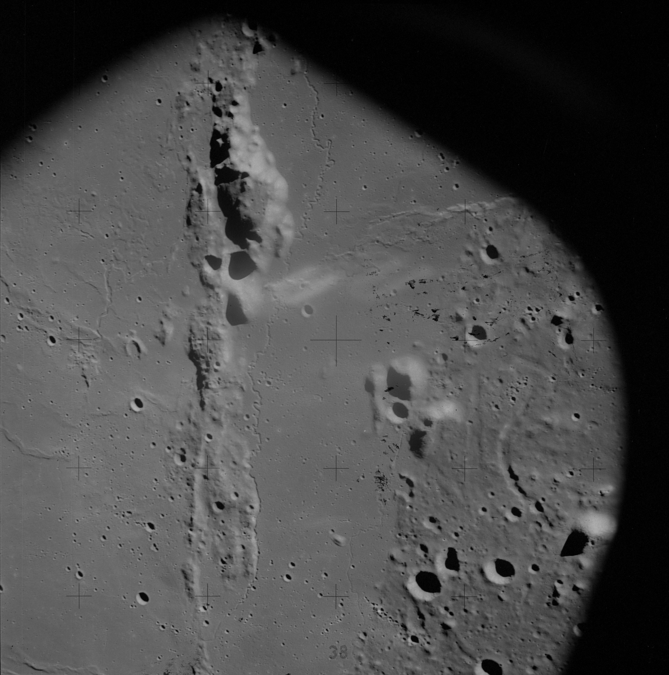 This frame was shot on 1 August 1971 at 13:40 UTC, with the camera titled 25 degrees from vertical. The Sun was 29 degrees above the eastern horizon. Higher resolution versions of M-1422 available from the ASU Apollo Image Archive. Frames 1423 and 1424 also include the landing site. Scan from the original film courtesy NASA/JSC/Arizona State University.Rev. 35 Apollo 15 Mapping (Metric) Camera Frame 1537 ( 3.4 Mb or 269k )