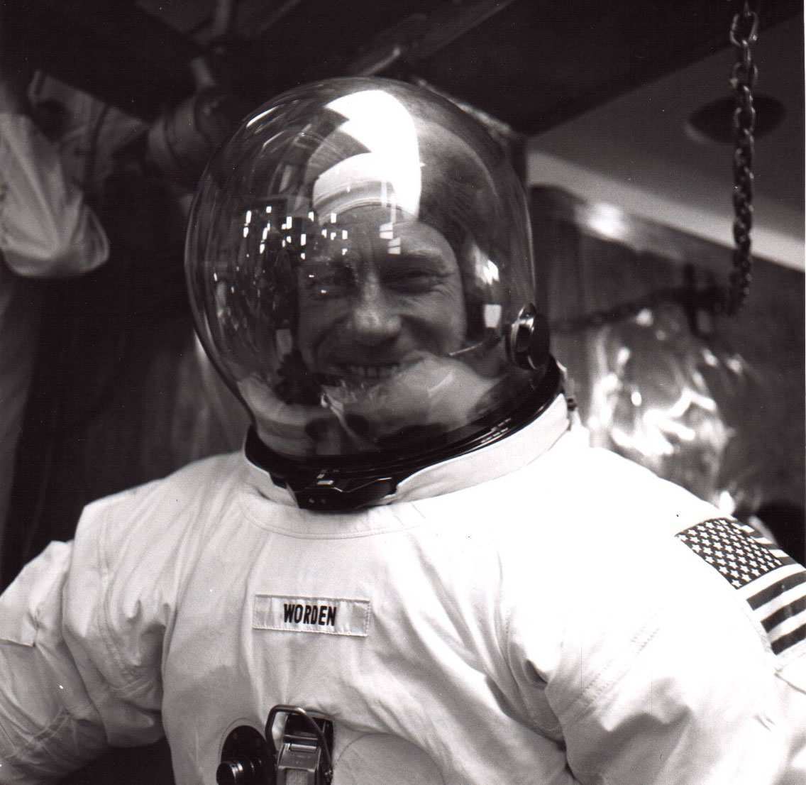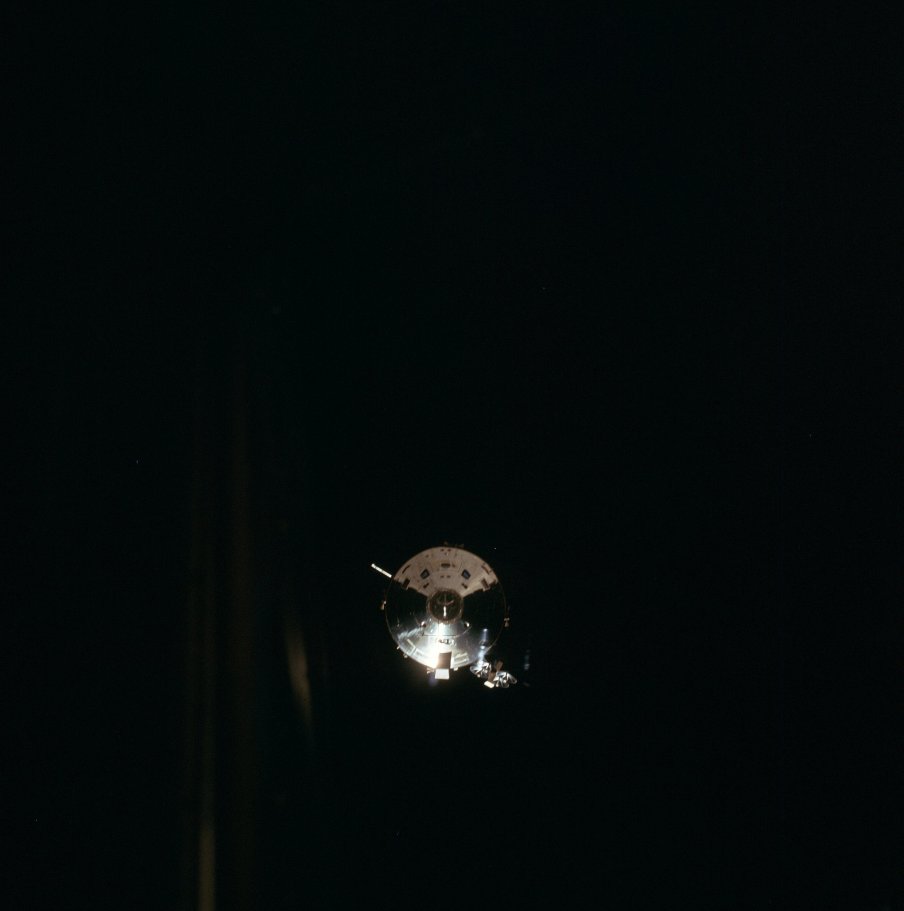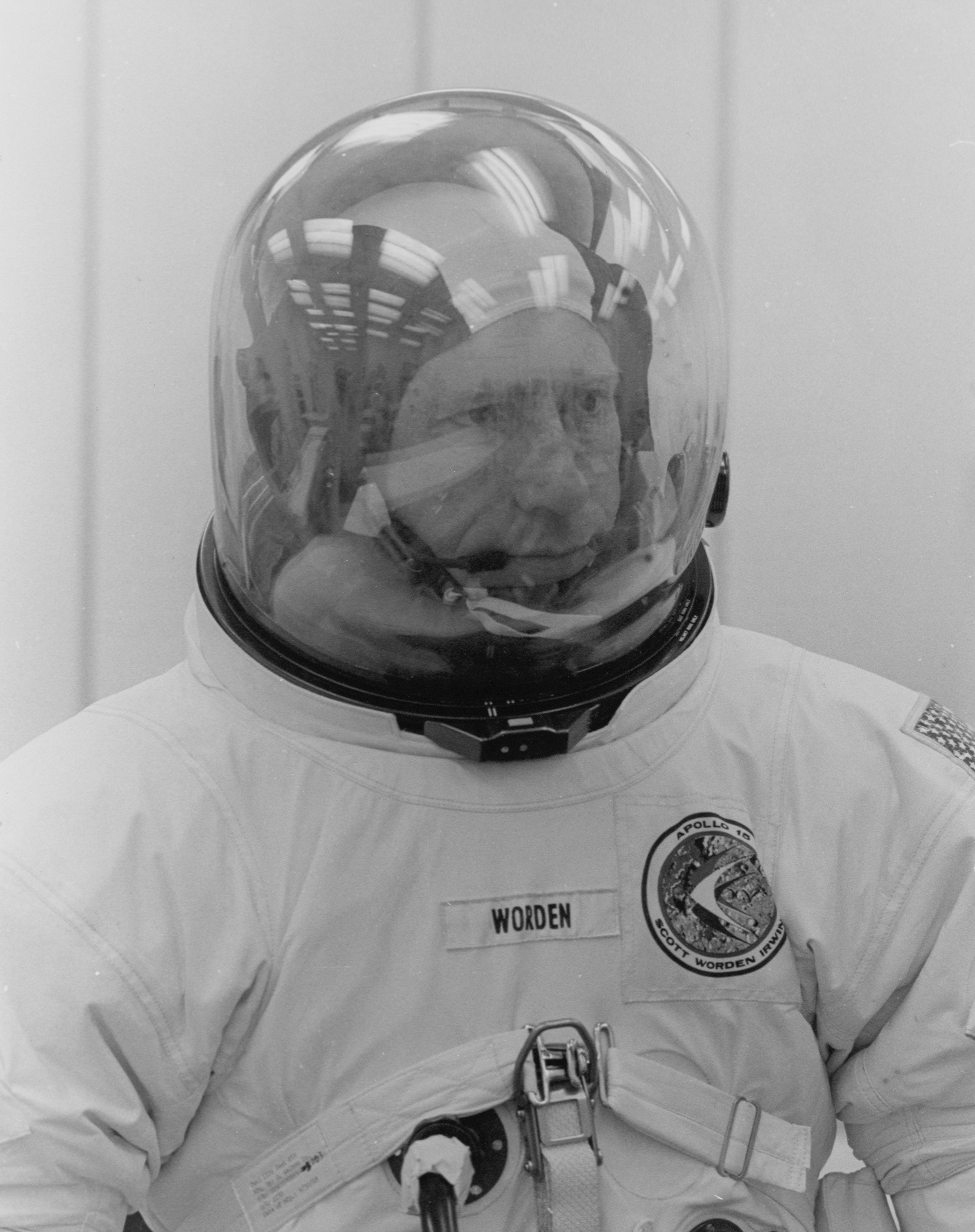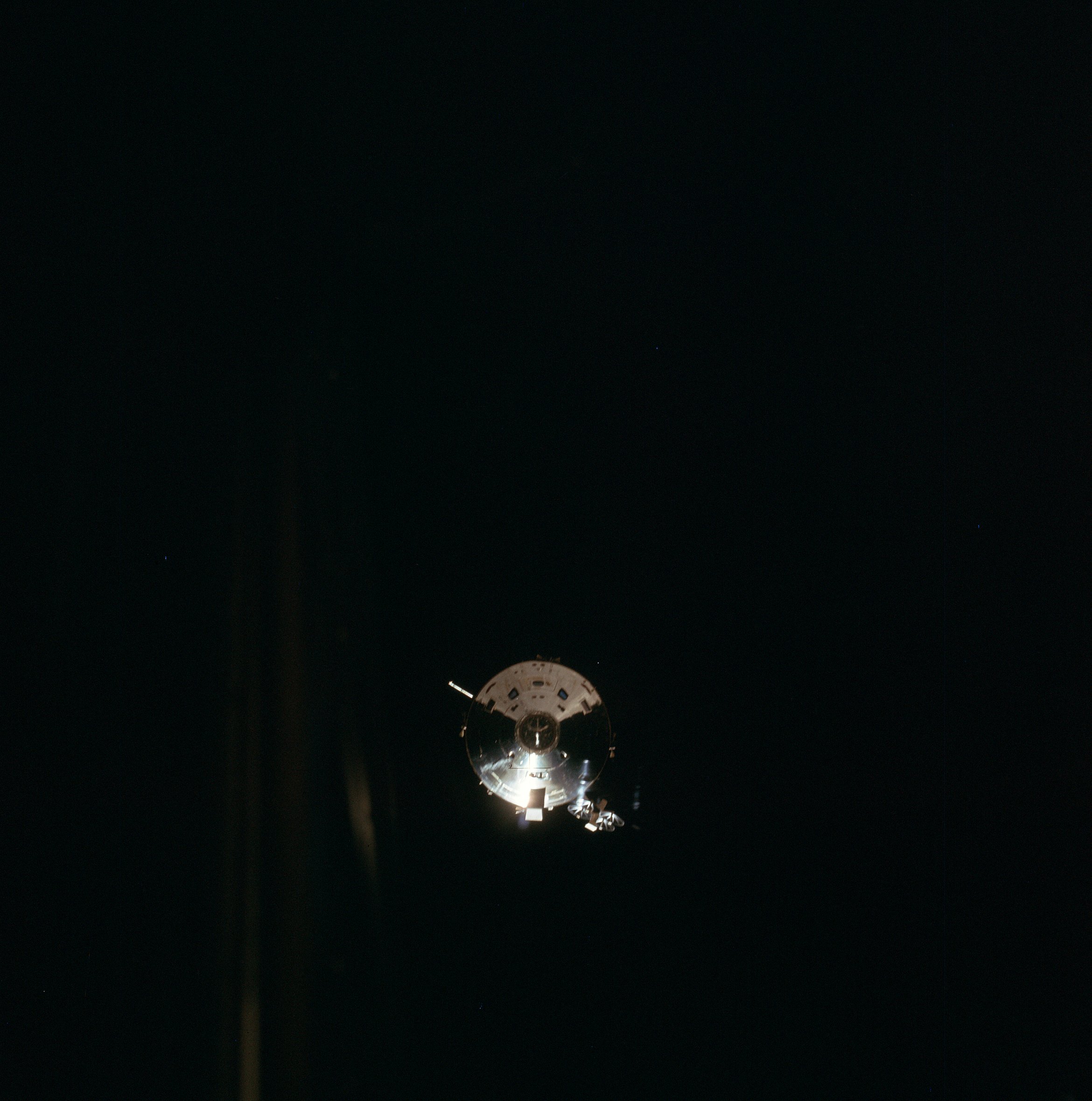 Best of Worden's EVA, not a very good picture. A better picture is S71-43202 ( 1.1 Mb ), which is a frame from a 16-mm film shot during Al's EVA. The NASA Caption for the latter is "APOLLO 15 TRANS-EARTH EVA VIEW --- Astronaut Alfred M. Worden, command module pilot of the Apollo 15 lunar landing mission, floats in space outside the spacecraft during his trans-Earth extravehicular activity (EVA). This photograph was taken from a frame of motion picture film exposed by the 16mm Maurer camera mounted in the hatch of the Command Module (CM). During his EVA Worden made an inspection of the Service Module's (SM) Scientific Instrument Module (SIM) bay and retrieved the film cassettes from the Panoramic Camera and the Mapping Camera. The SIM bay holds eight orbital science experiments. The EVA occurred when the spacecraft was homeward bound approximately 171,000 nautical miles from Earth." Scan courtesy Susan Erskine, NASA Johnson. See, also, a NASA drawing depicting the CMP EVA.