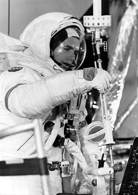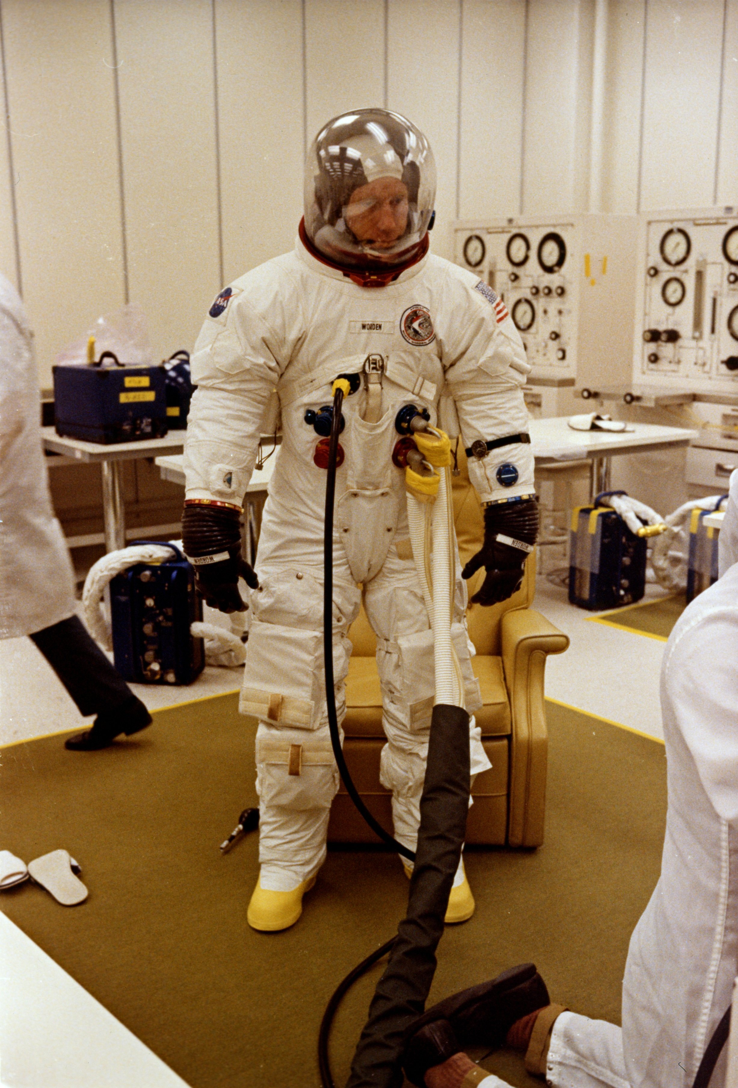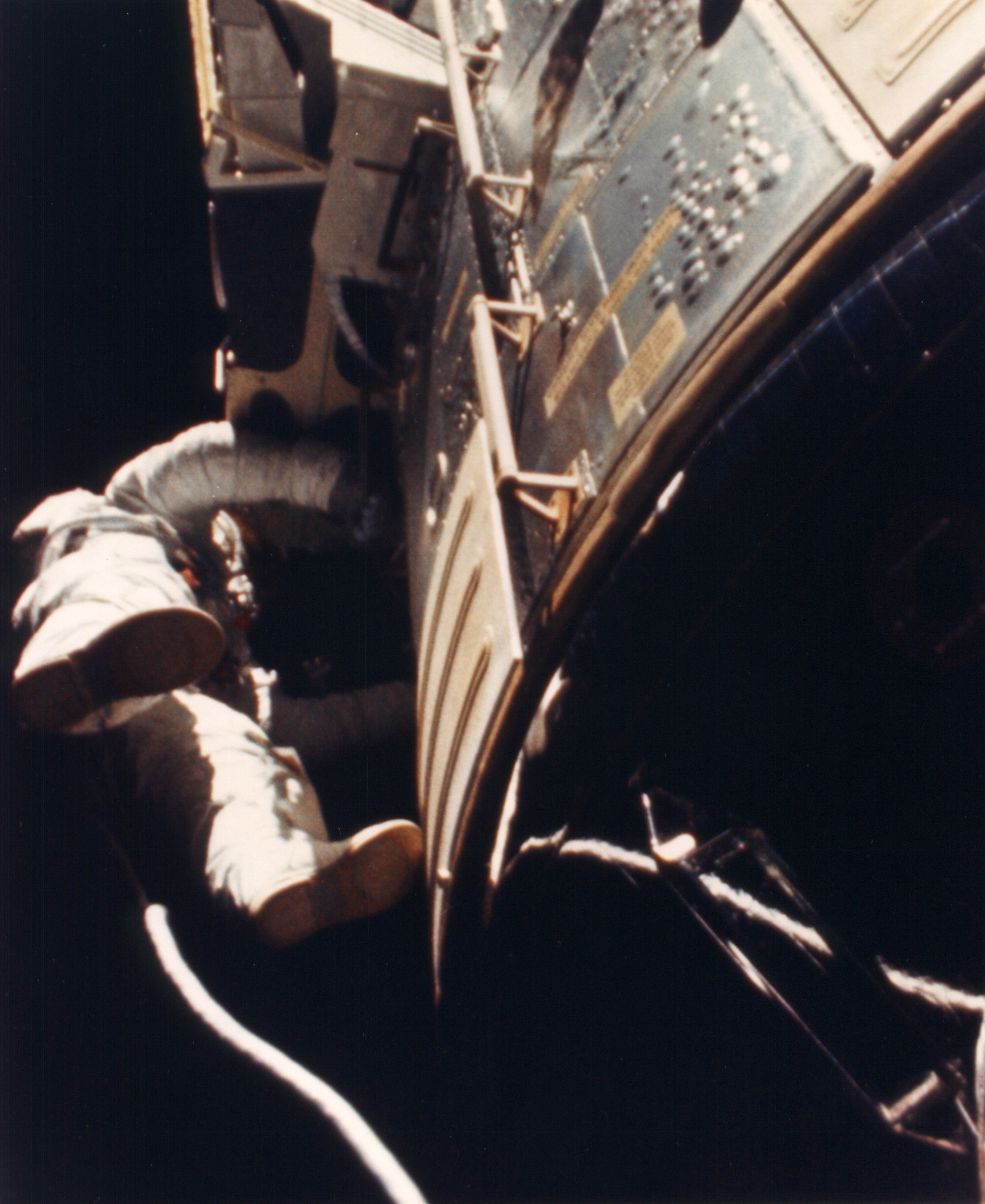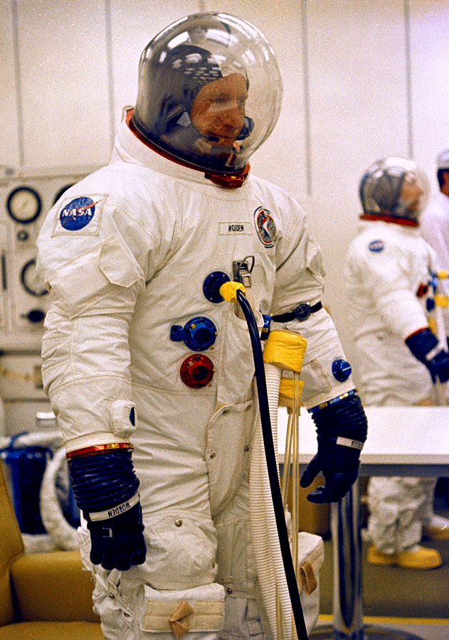 Best of Worden's EVA, not a very good picture. A better picture is S71-43202 ( 1.1 Mb ), which is a frame from a 16-mm film shot during Al's EVA. The NASA Caption for the latter is "APOLLO 15 TRANS-EARTH EVA VIEW --- Astronaut Alfred M. Worden, command module pilot of the Apollo 15 lunar landing mission, floats in space outside the spacecraft during his trans-Earth extravehicular activity (EVA). This photograph was taken from a frame of motion picture film exposed by the 16mm Maurer camera mounted in the hatch of the Command Module (CM). During his EVA Worden made an inspection of the Service Module's (SM) Scientific Instrument Module (SIM) bay and retrieved the film cassettes from the Panoramic Camera and the Mapping Camera. The SIM bay holds eight orbital science experiments. The EVA occurred when the spacecraft was homeward bound approximately 171,000 nautical miles from Earth." Scan courtesy Susan Erskine, NASA Johnson. See, also, a NASA drawing depicting the CMP EVA.