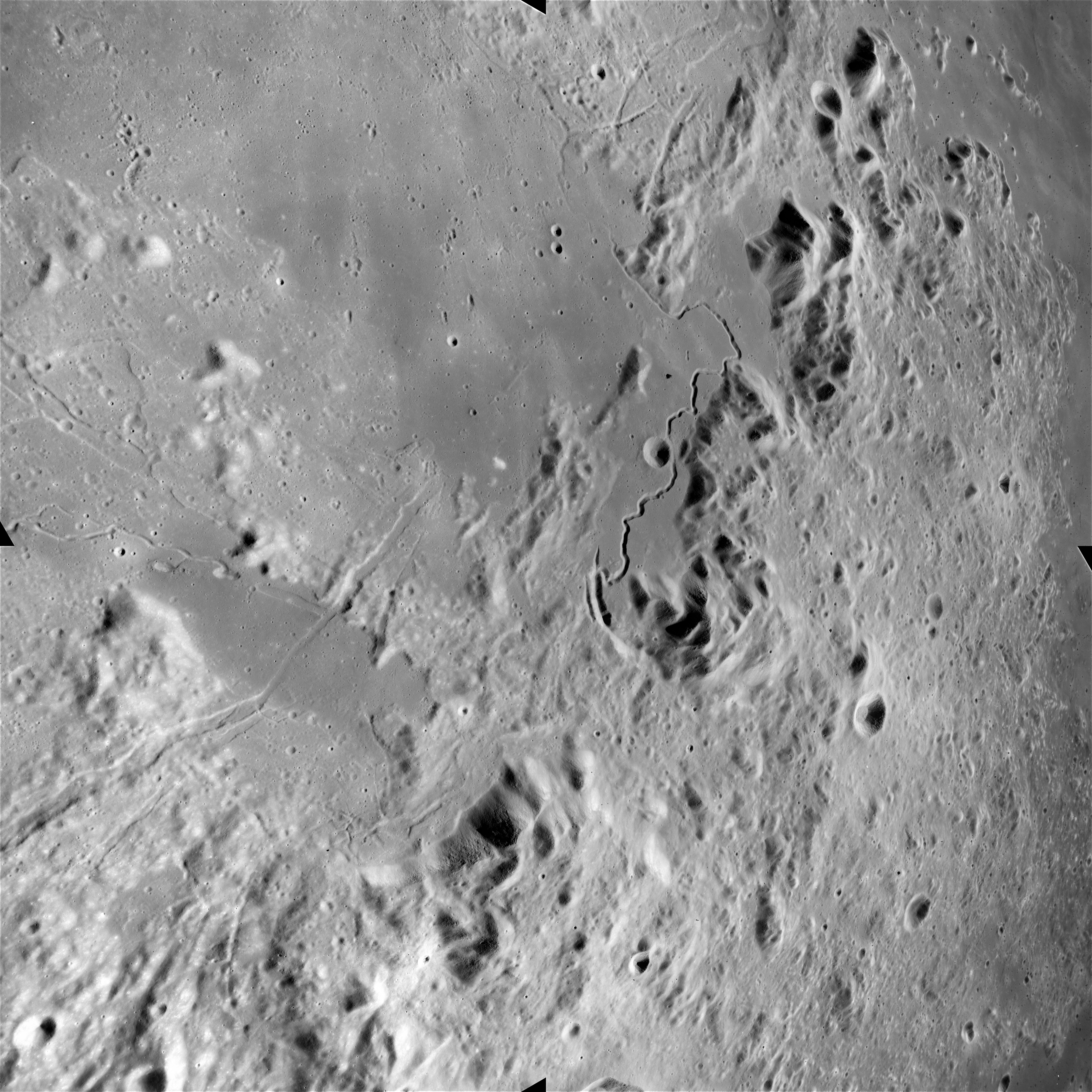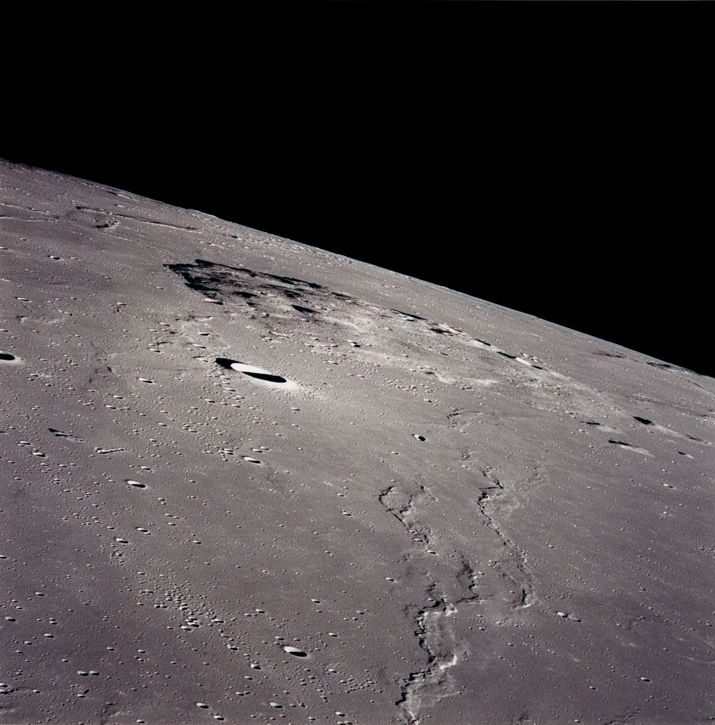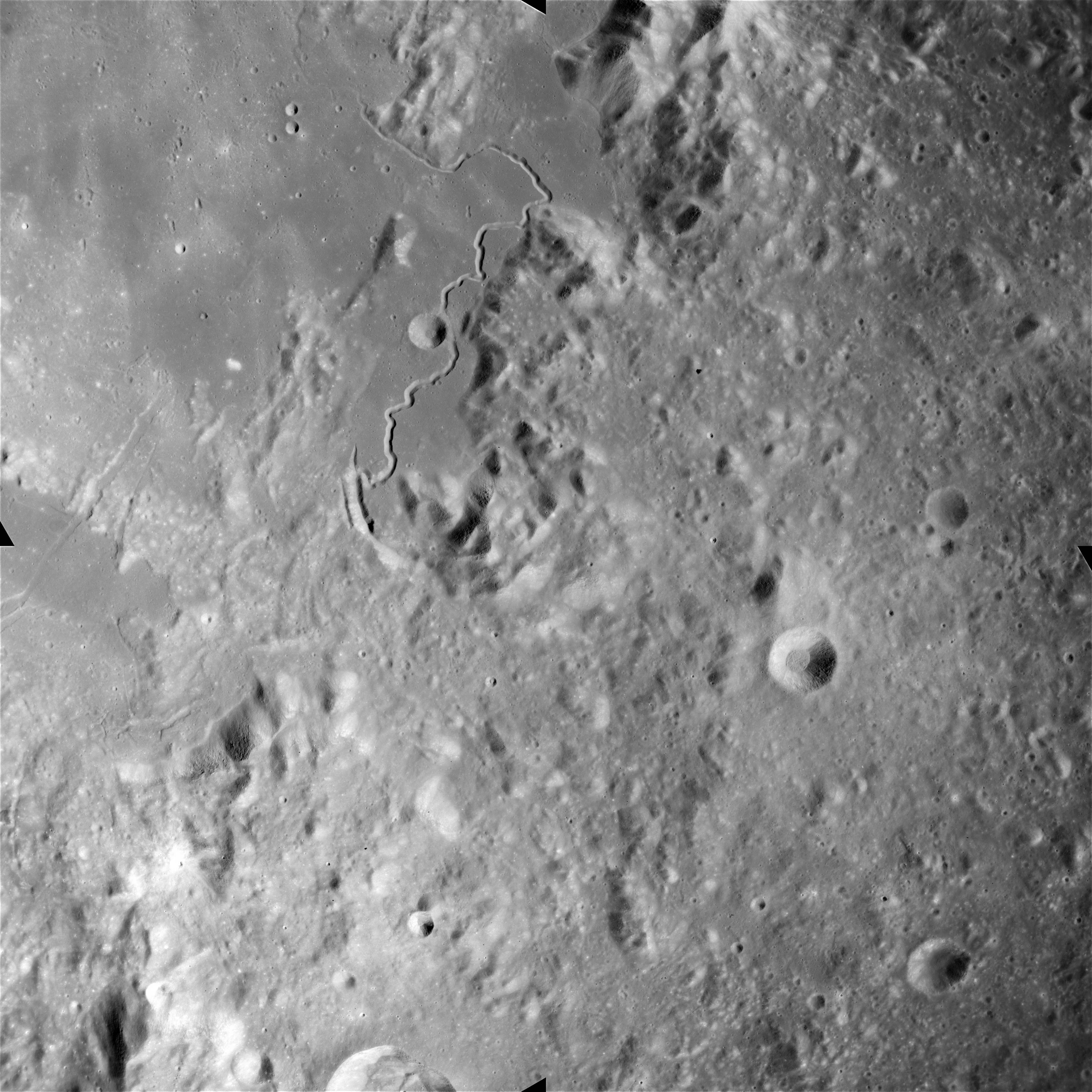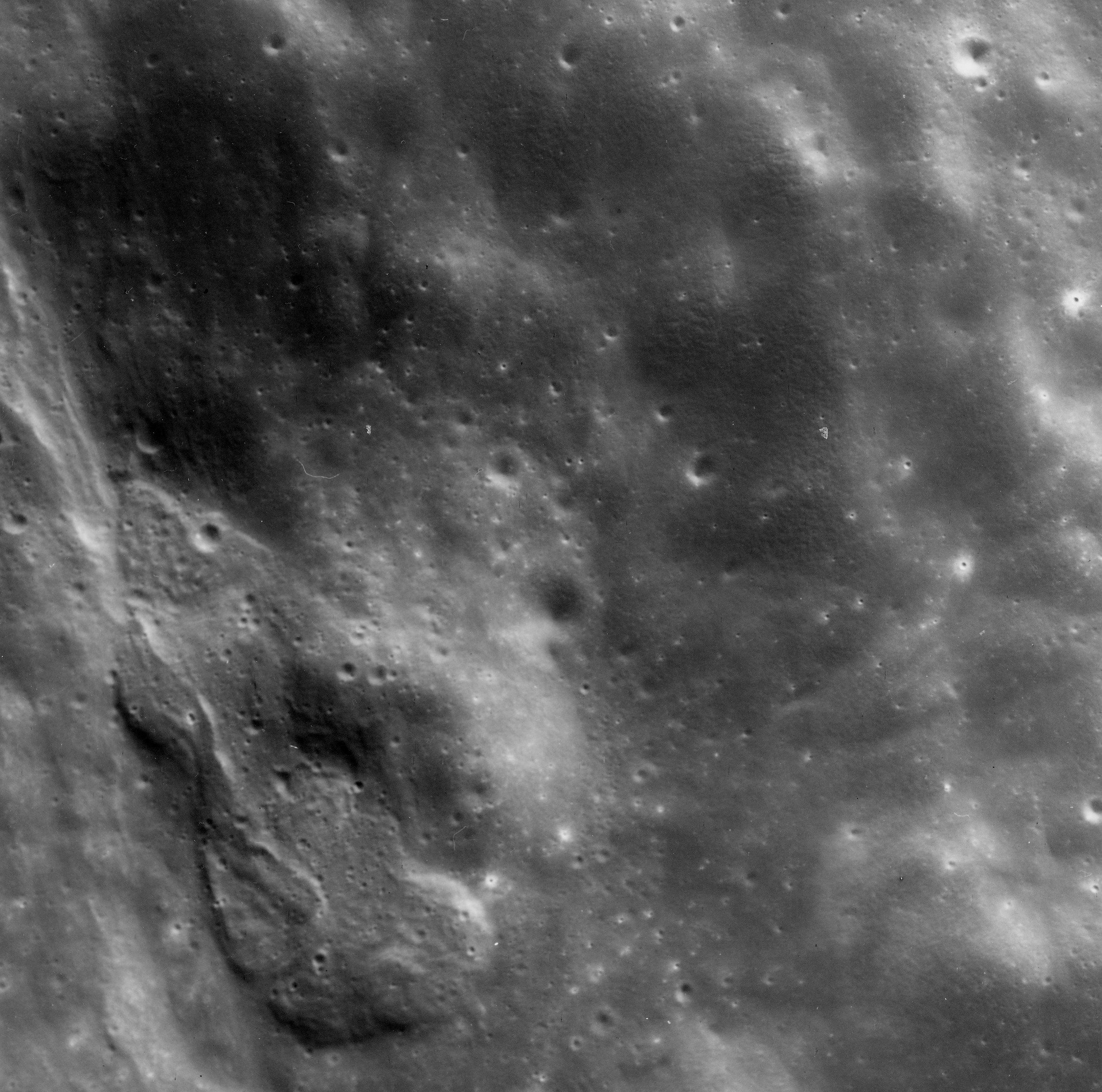 Lobate landslip outside northeastern rim of Tsiolkovsky. Research by David Woods.AS15-94-12803