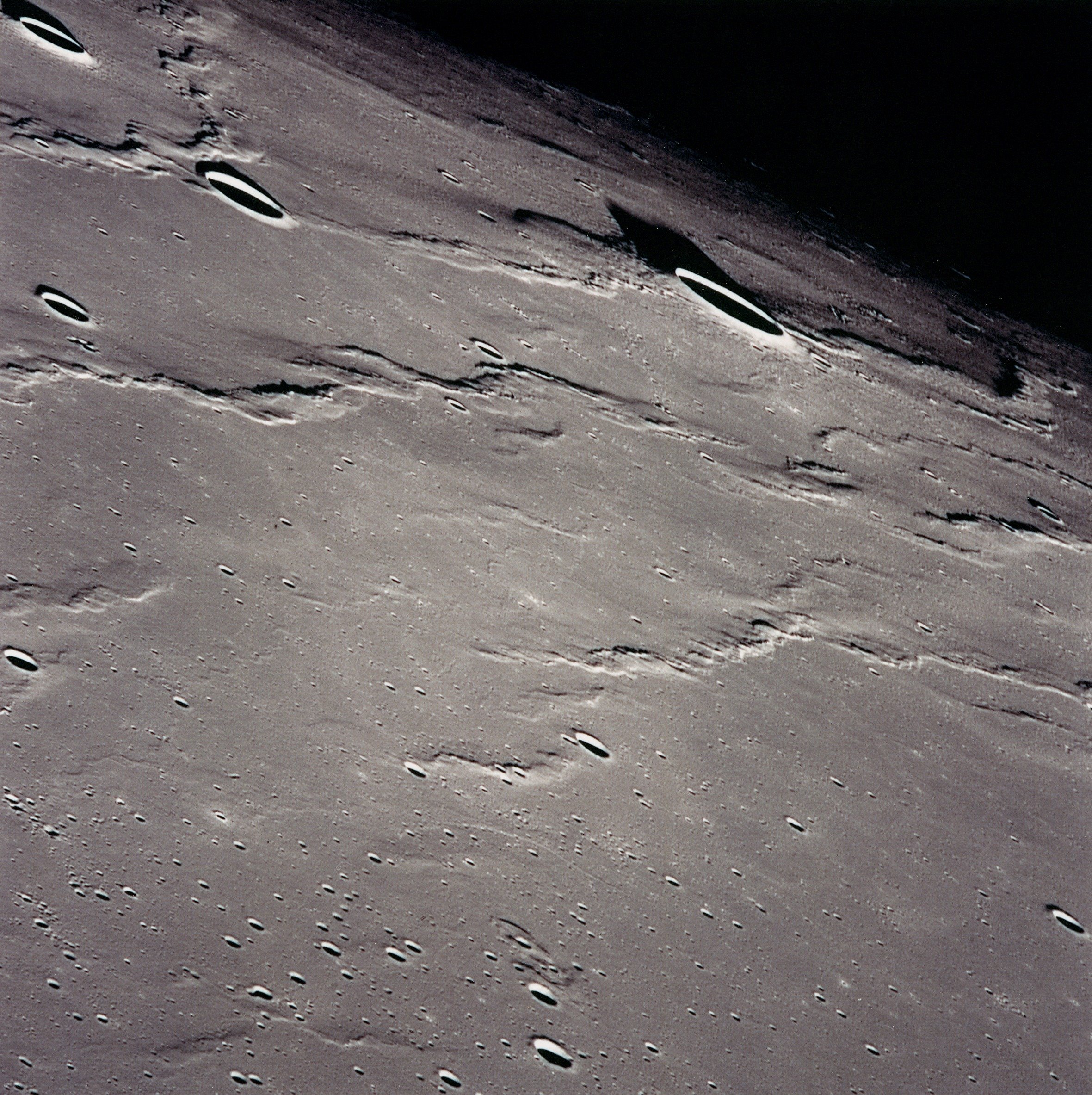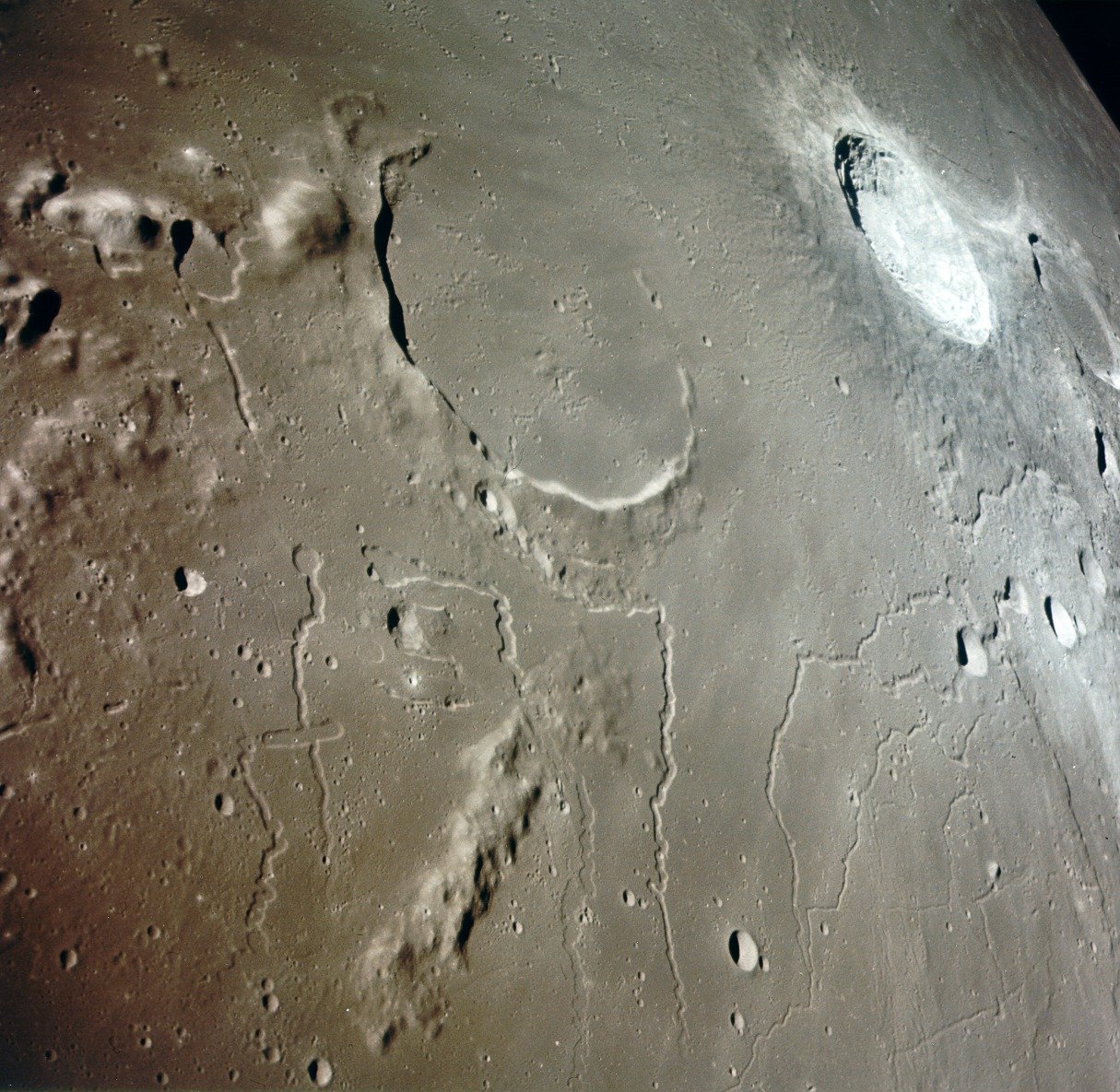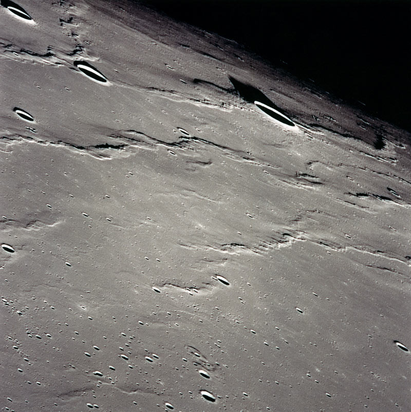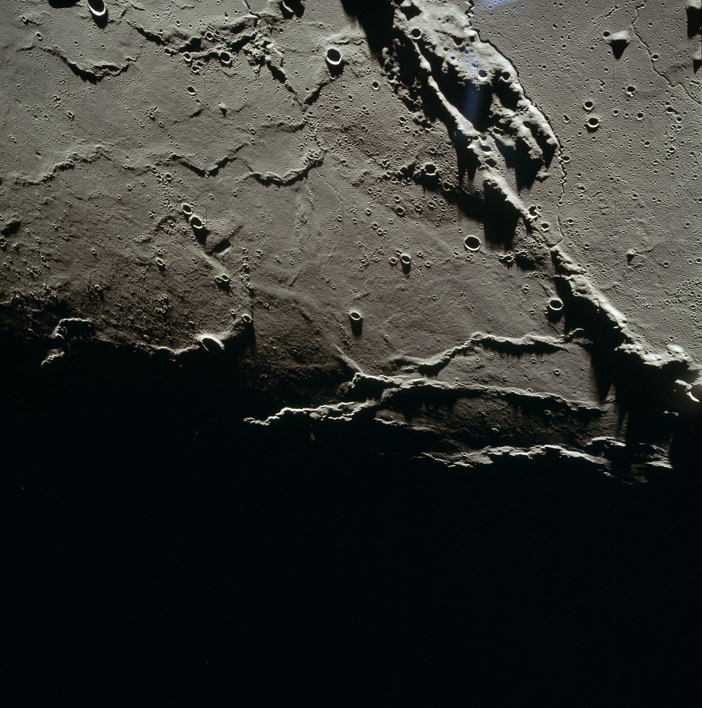 Lobate landslip outside northeastern rim of Tsiolkovsky. Research by David Woods.AS15-94-12803