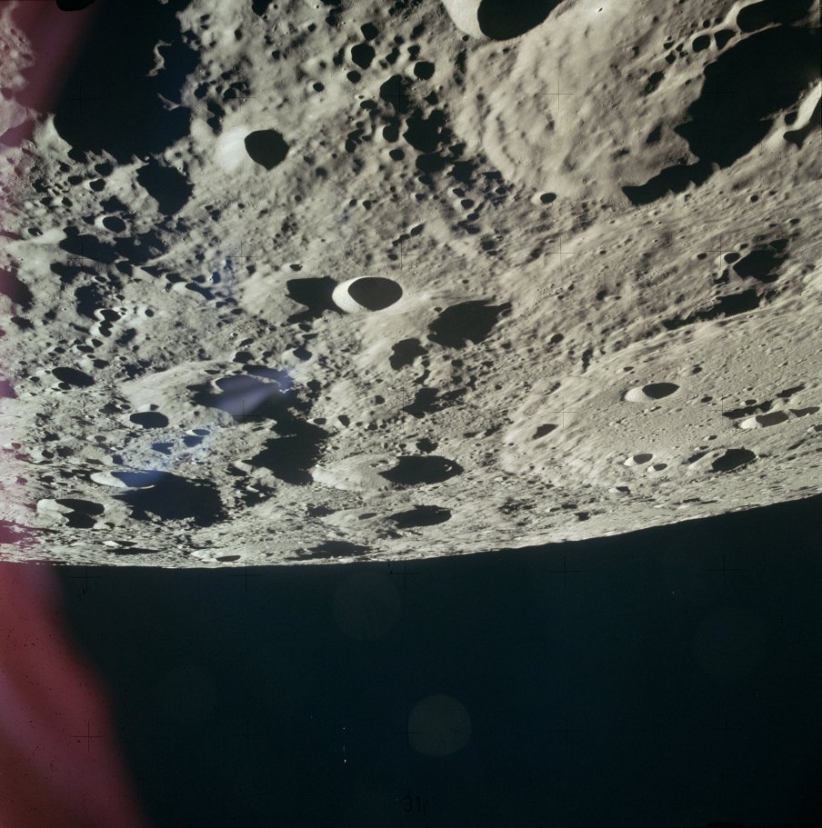 'Southern Sea' and Craters Lyot and Humboldt taken after transEarth injection. See, also, a labeled version ( 3.4 Mb ) by René Cantin. Scan by Kipp Teague.AS15-96-13093 ( 185k or 1427k )