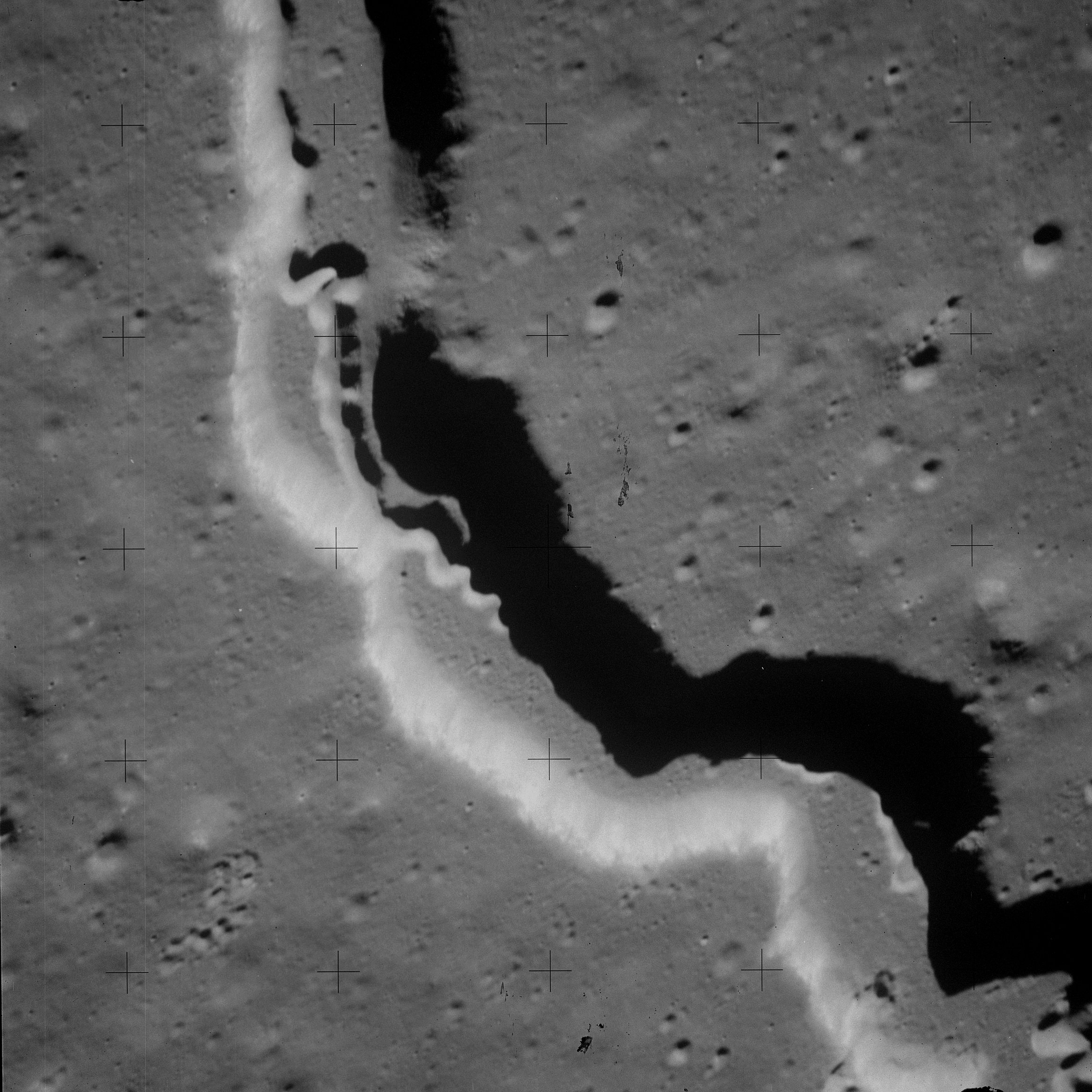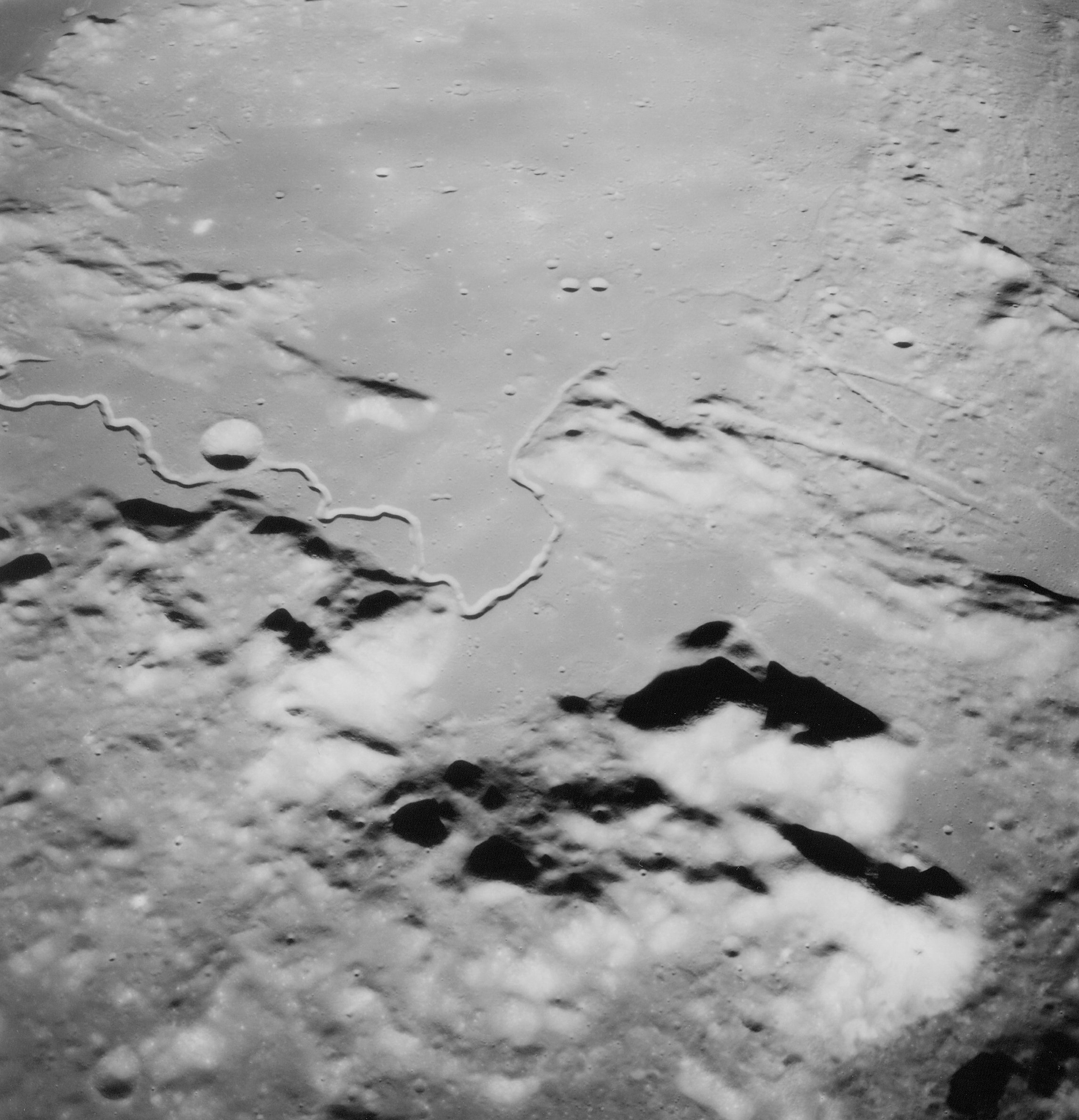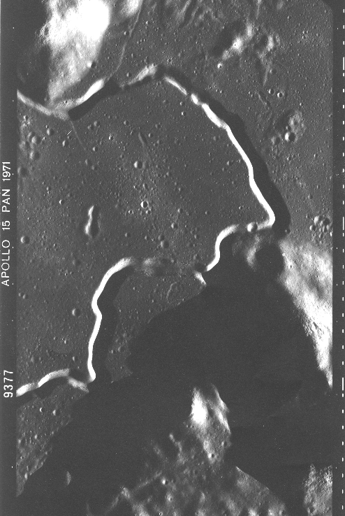 Rev 69. Vertical into Schroter's Valley, showing the meanders and partial fill of them in place by talus off of the sunlit slope of the main valley. Mapping Camera frame A15-M-2611 ( 3.0 Mb ) gives a broader context.AS15-97-13267