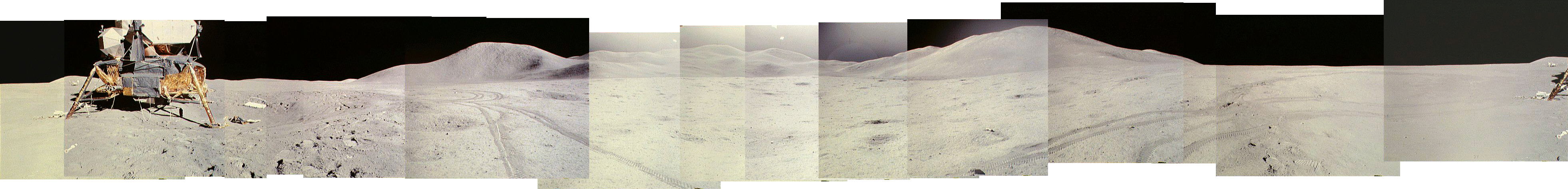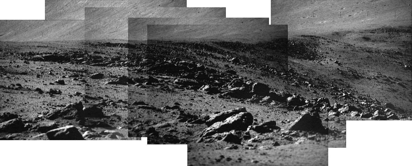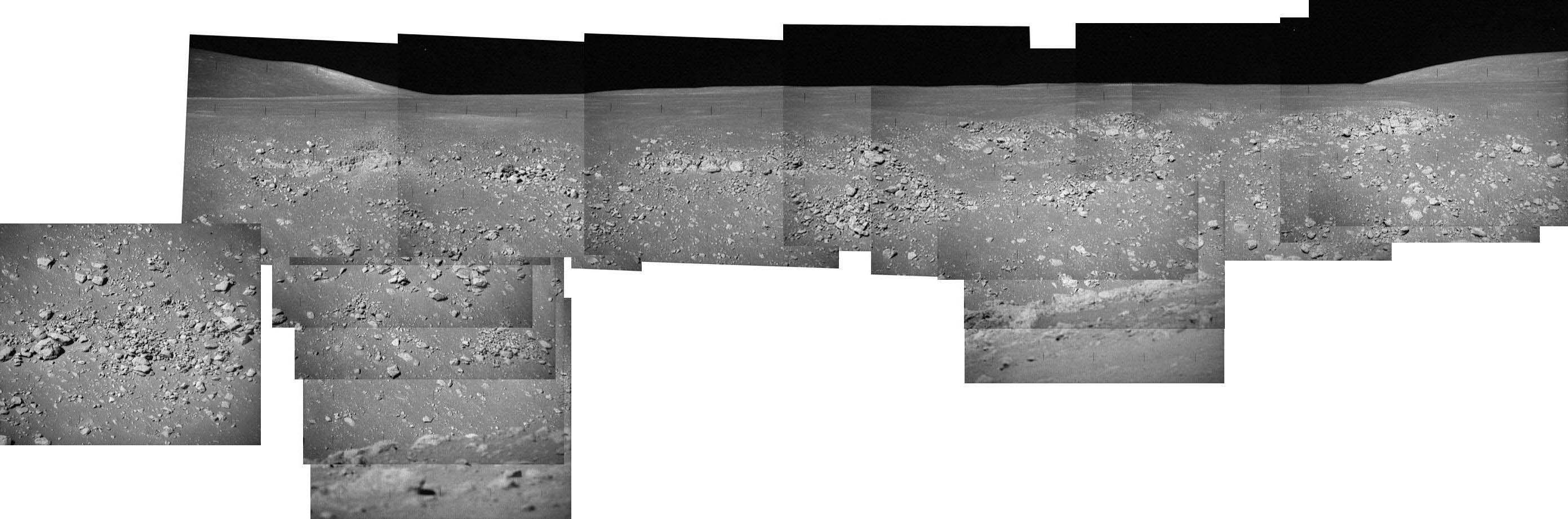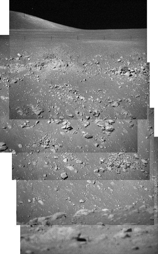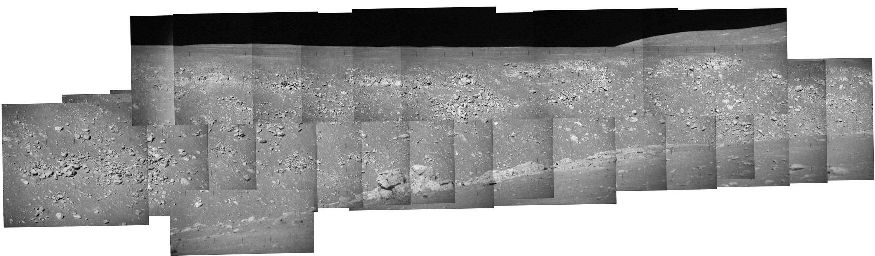 Assembled by David Harland. An 1800-dpi assembly (8.6 Mb) by Eric Jones includes the rille around to Mt. Hadley and a portion of the Swann Range.123:19:35 Station 2 500-mm Pan of Trophy Point, First Strip ( 1.7Mb or 0.3Mb )
