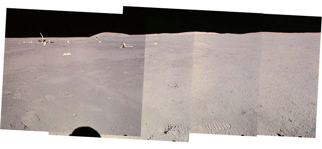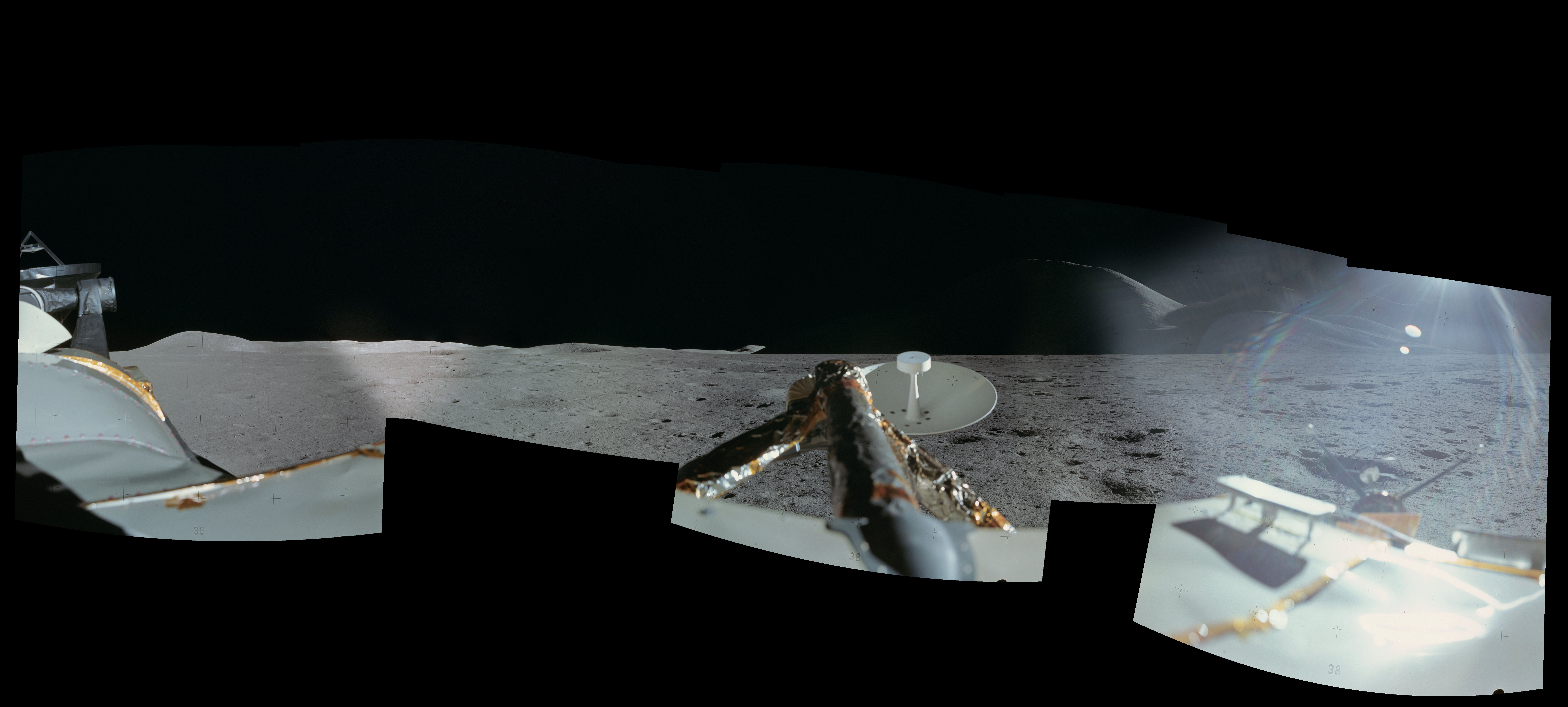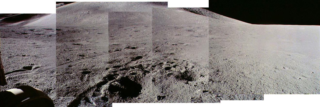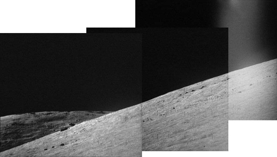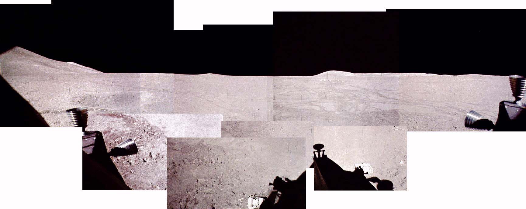 The frames are AS15-85- 11398 and 11407. High-resolution assembly with perspective correction and context by Eric Jones.122:14:35 Station 1 Pan: Two-frame down-Sun view ( 1.8 Mb )