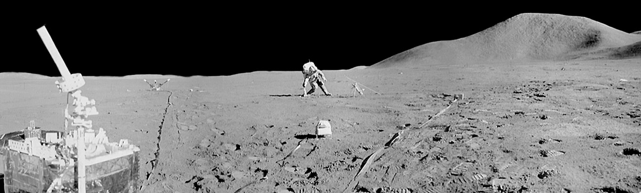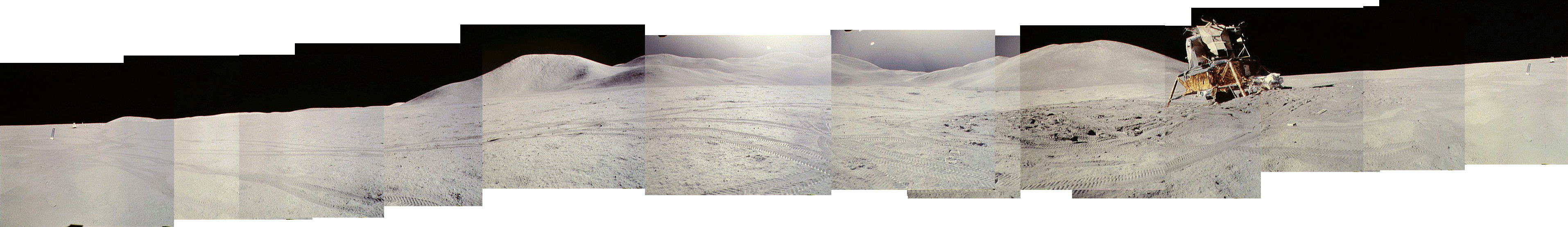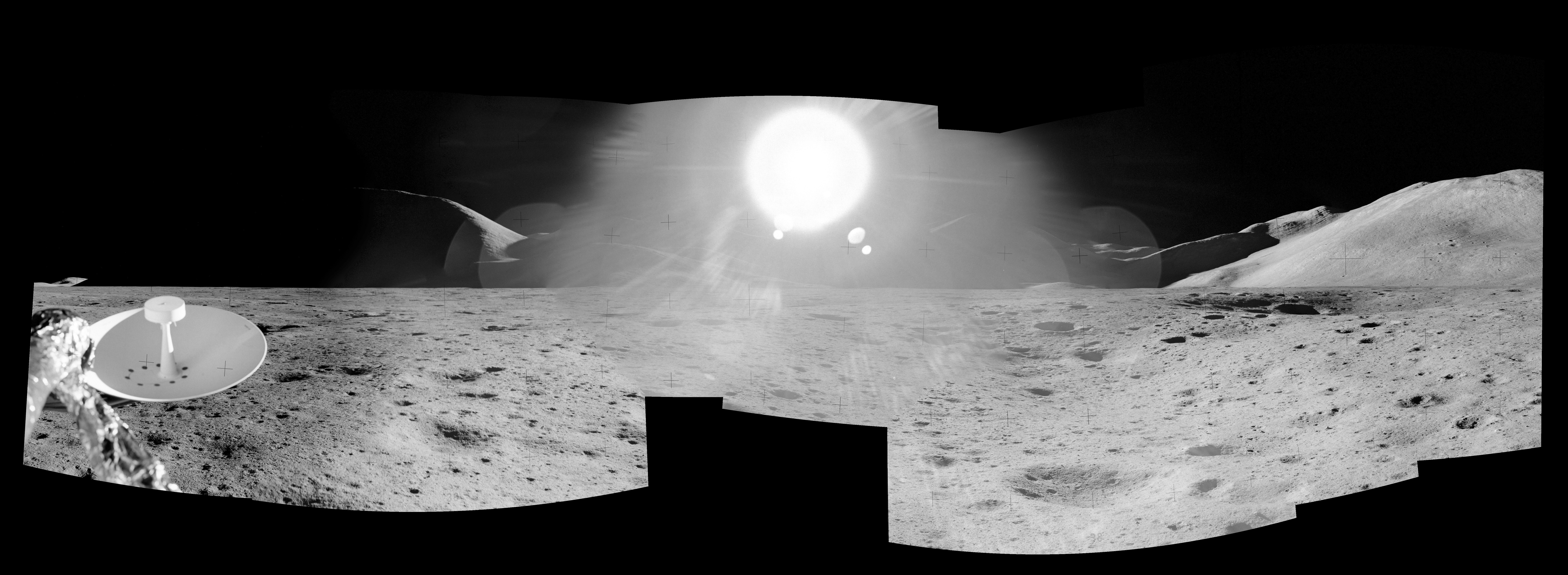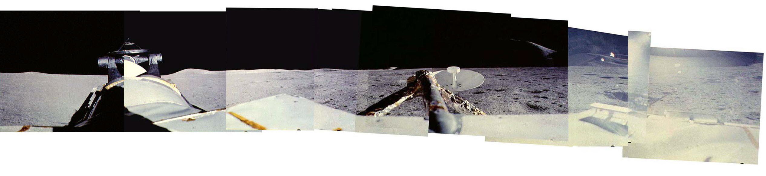 The frames are AS15-85- 11398 and 11407. High-resolution assembly with perspective correction and context by Eric Jones.122:14:35 Station 1 Pan: Two-frame down-Sun view ( 1.8 Mb )