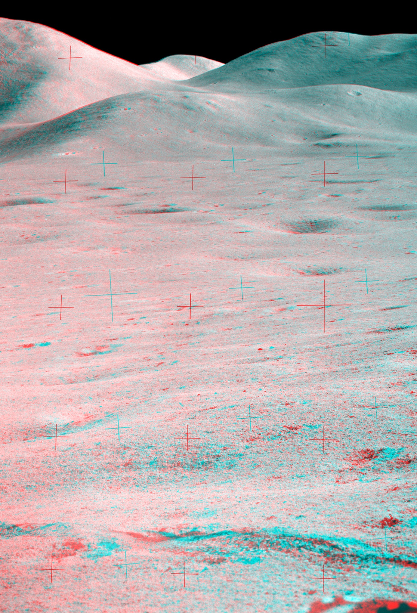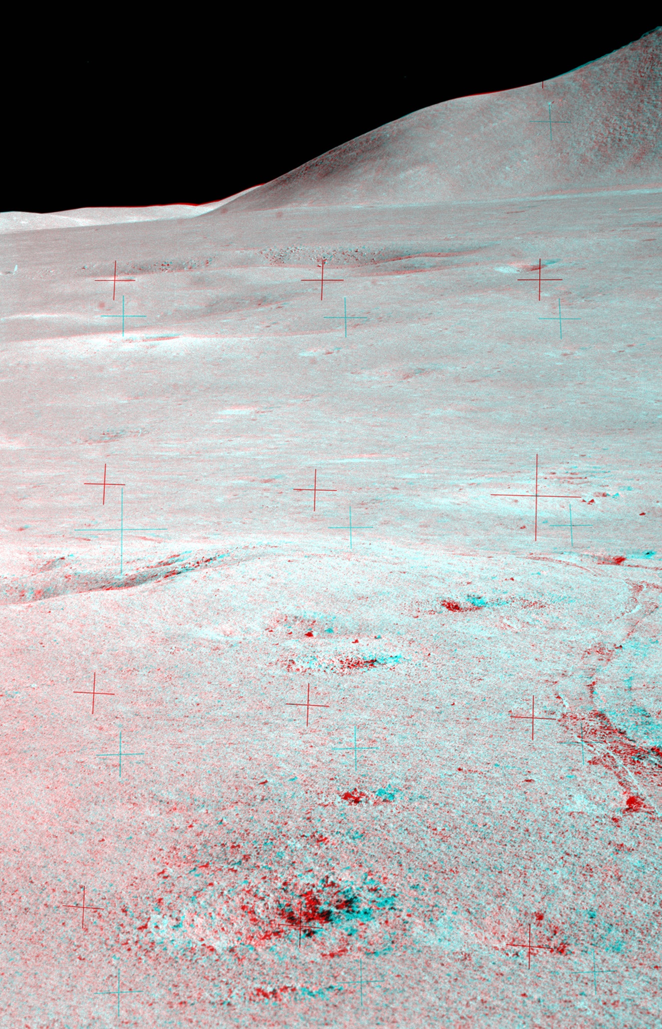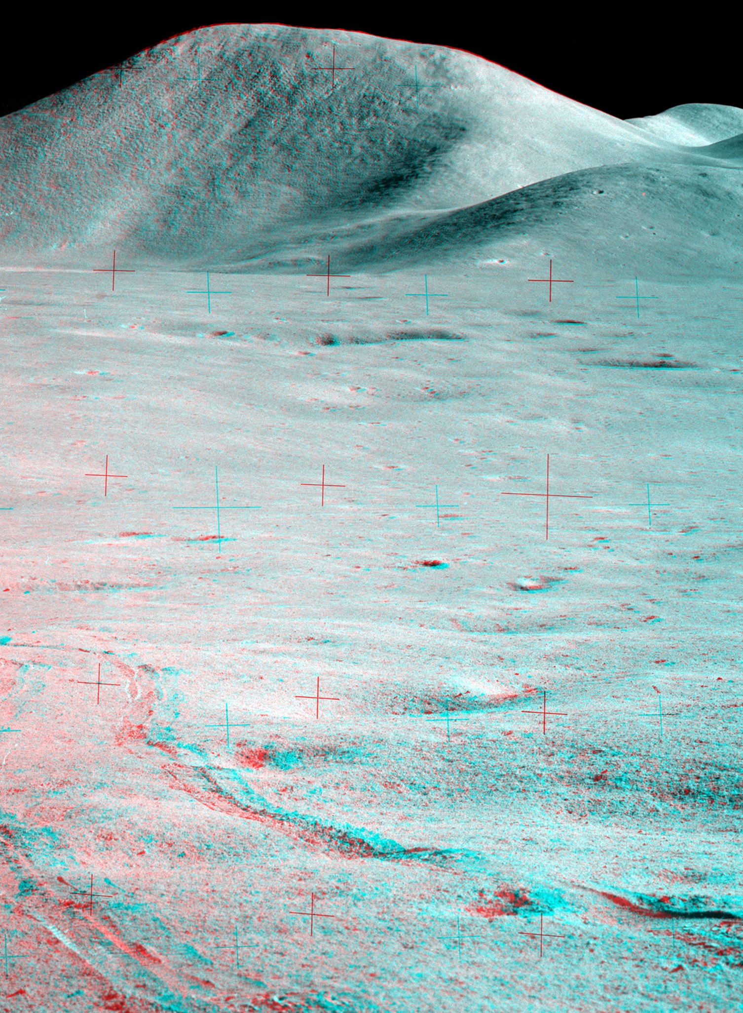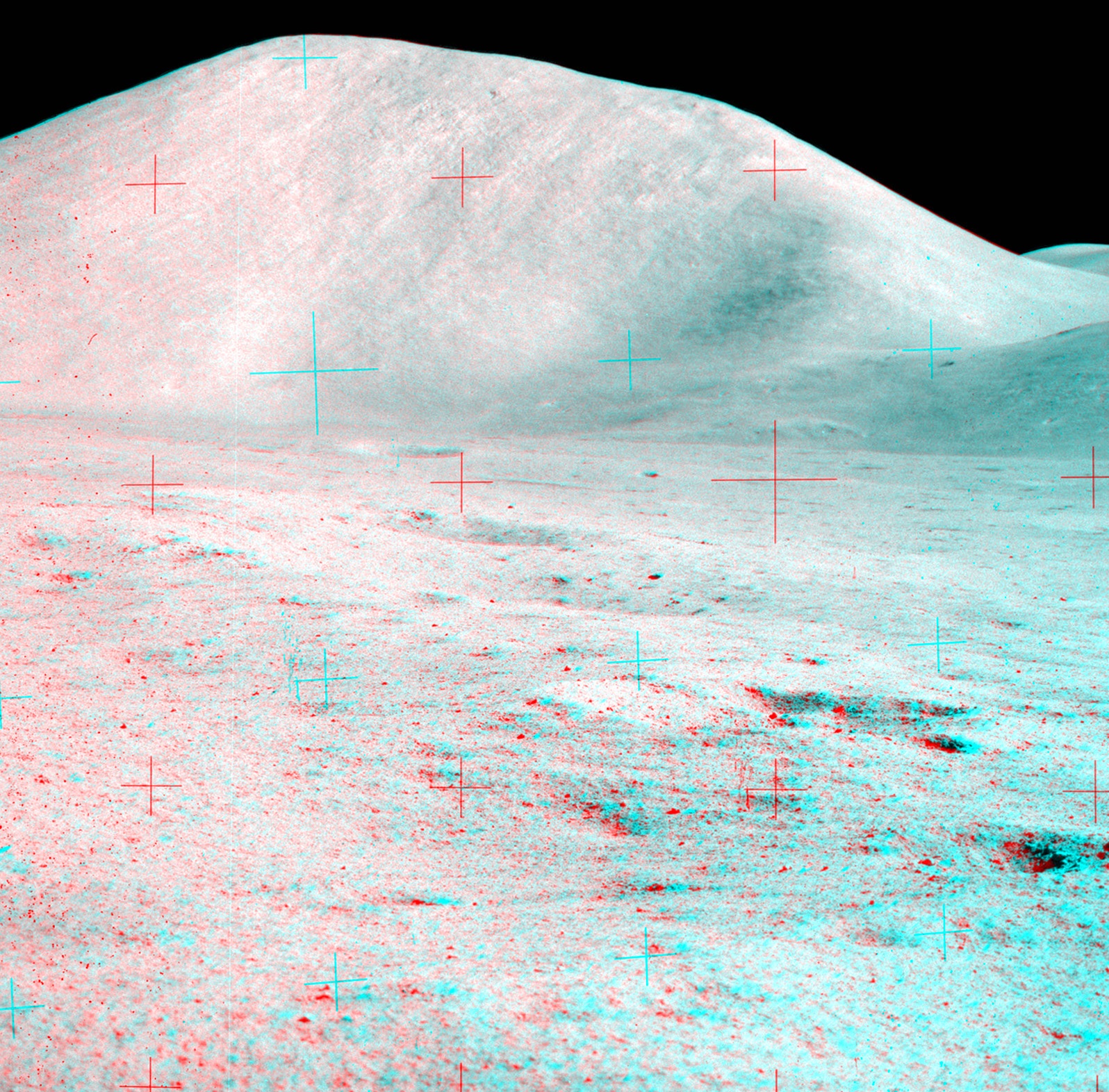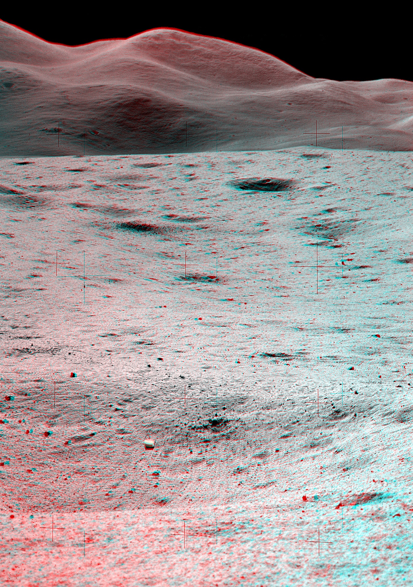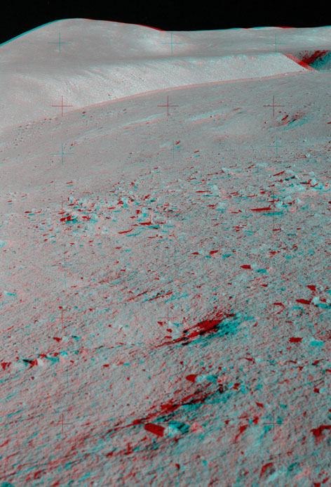 Vertical view of the landing site from frames AS15-M-1134 and AS15-M-1135. Anaglyph by Yuri Krasilnikov.Rev 34 Mapping (Metric) Camera Frame 1422 ( 13 Mb )