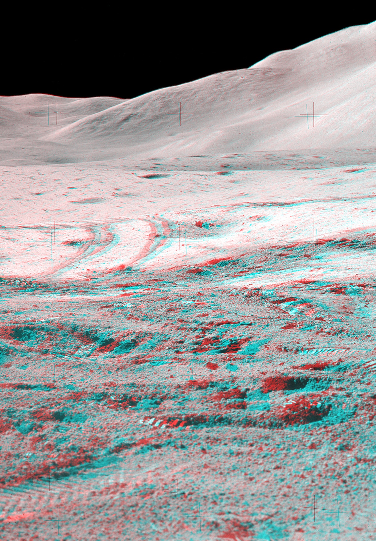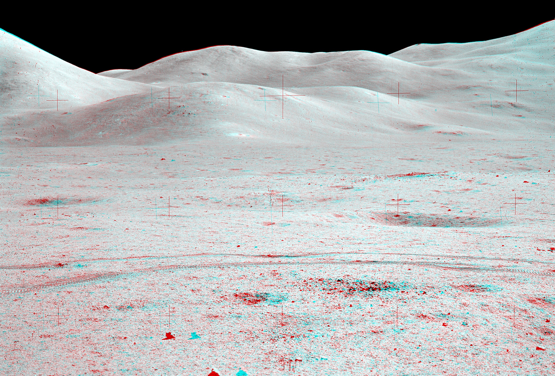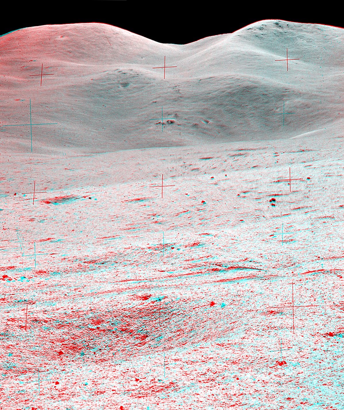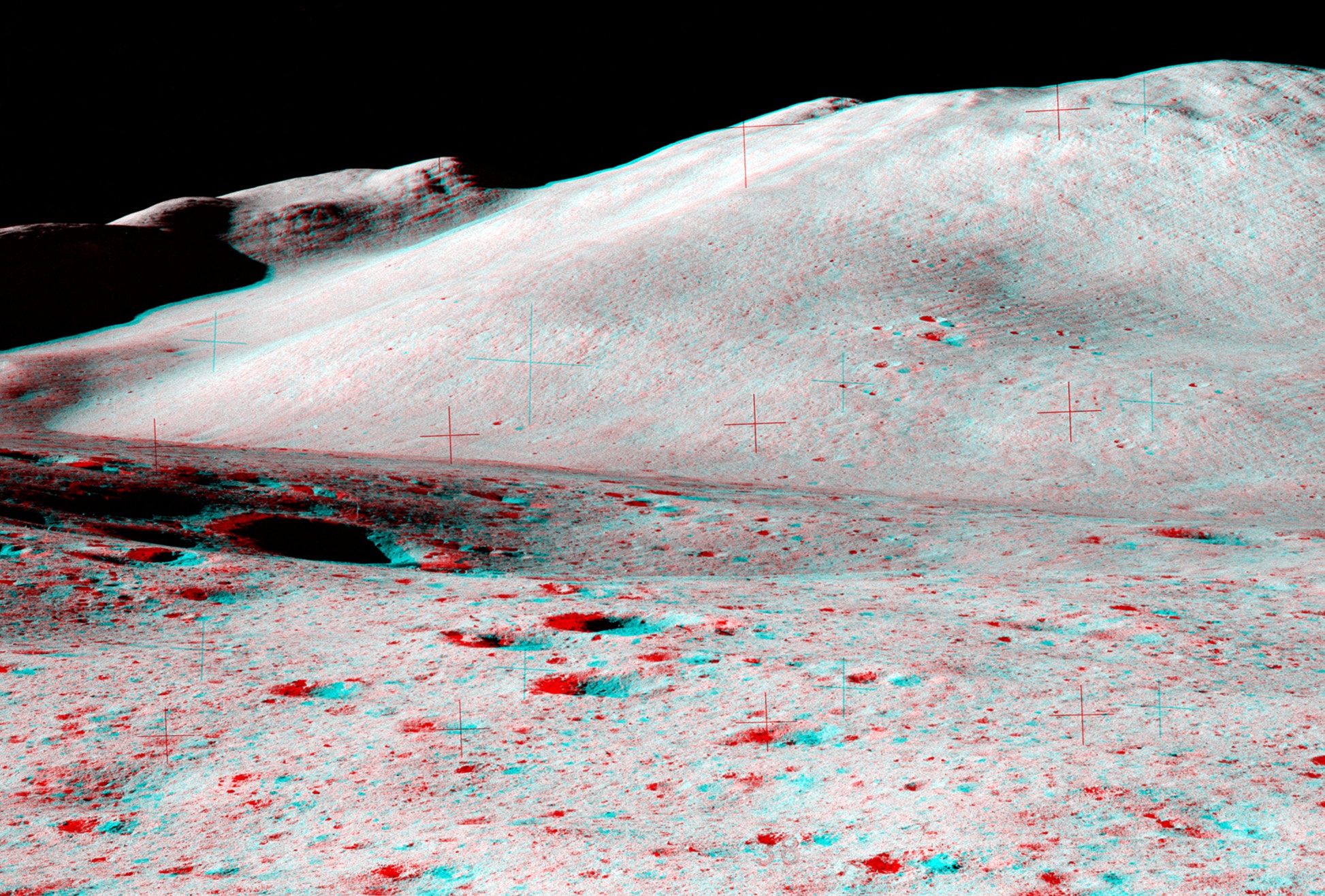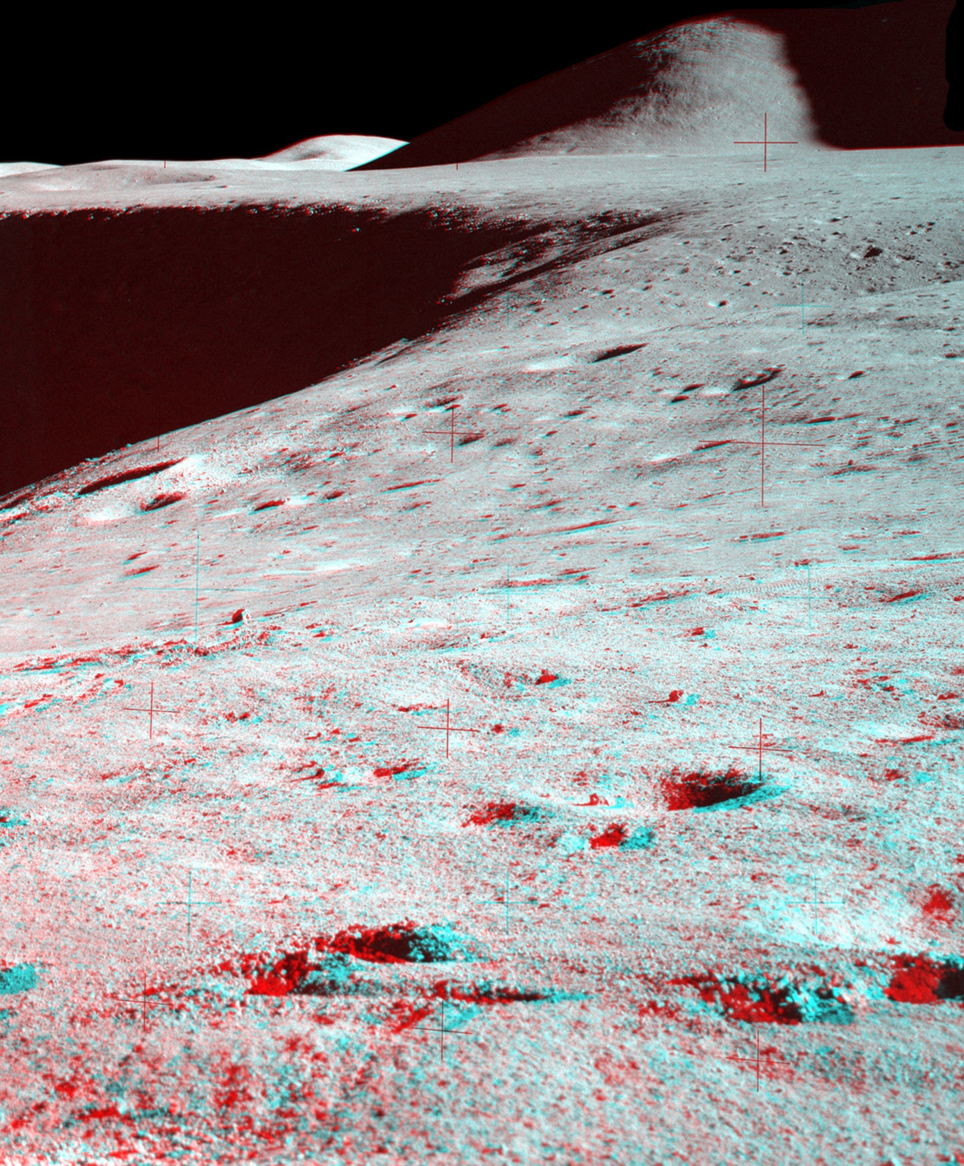 Vertical view of the landing site from frames AS15-M-1134 and AS15-M-1135. Anaglyph by Yuri Krasilnikov.Rev 34 Mapping (Metric) Camera Frame 1422 ( 13 Mb )