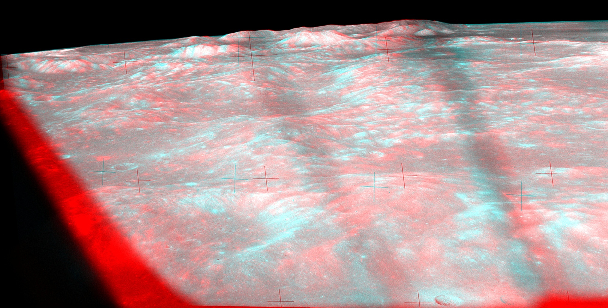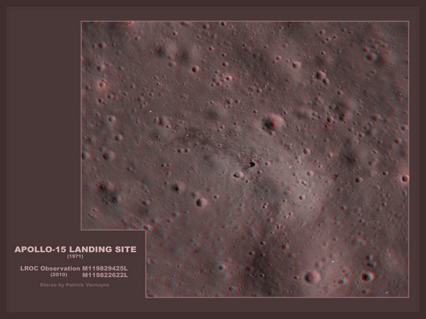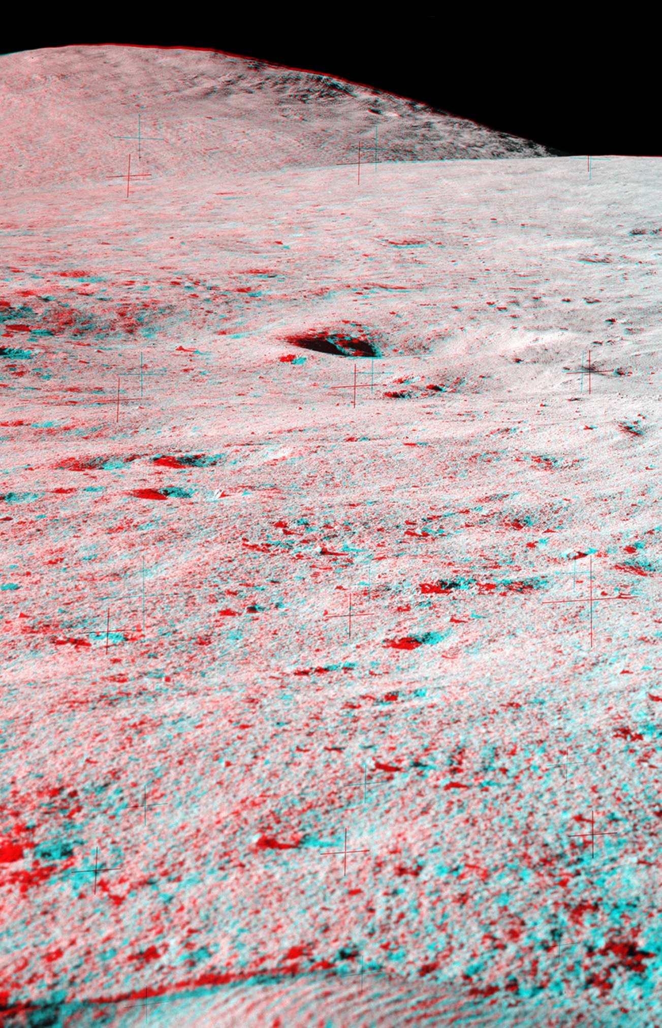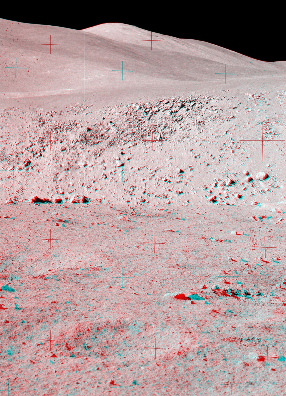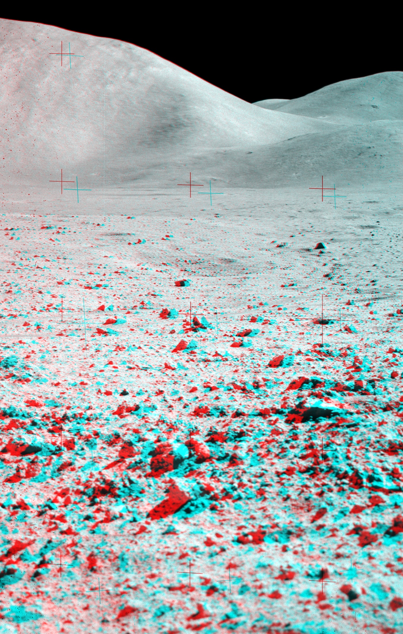 Vertical view of the landing site from frames AS15-M-1134 and AS15-M-1135. Anaglyph by Yuri Krasilnikov.Rev 34 Mapping (Metric) Camera Frame 1422 ( 13 Mb )