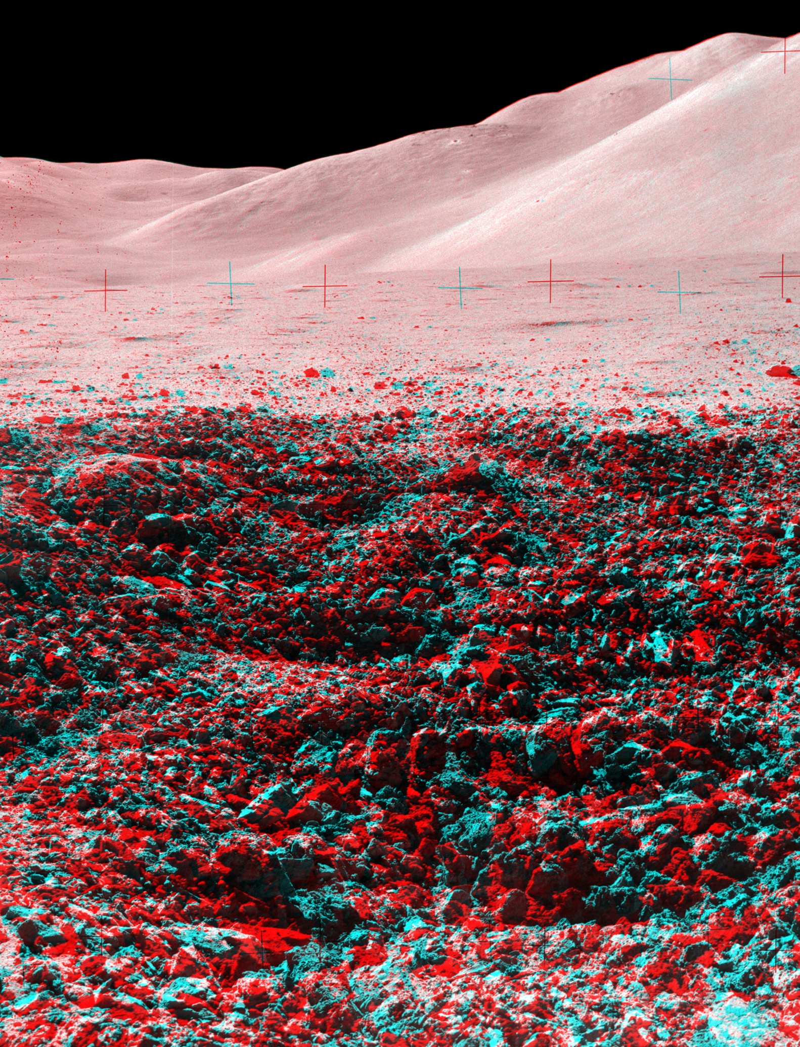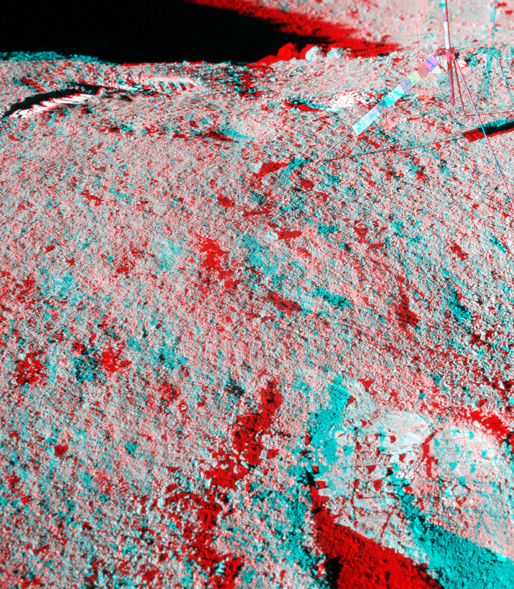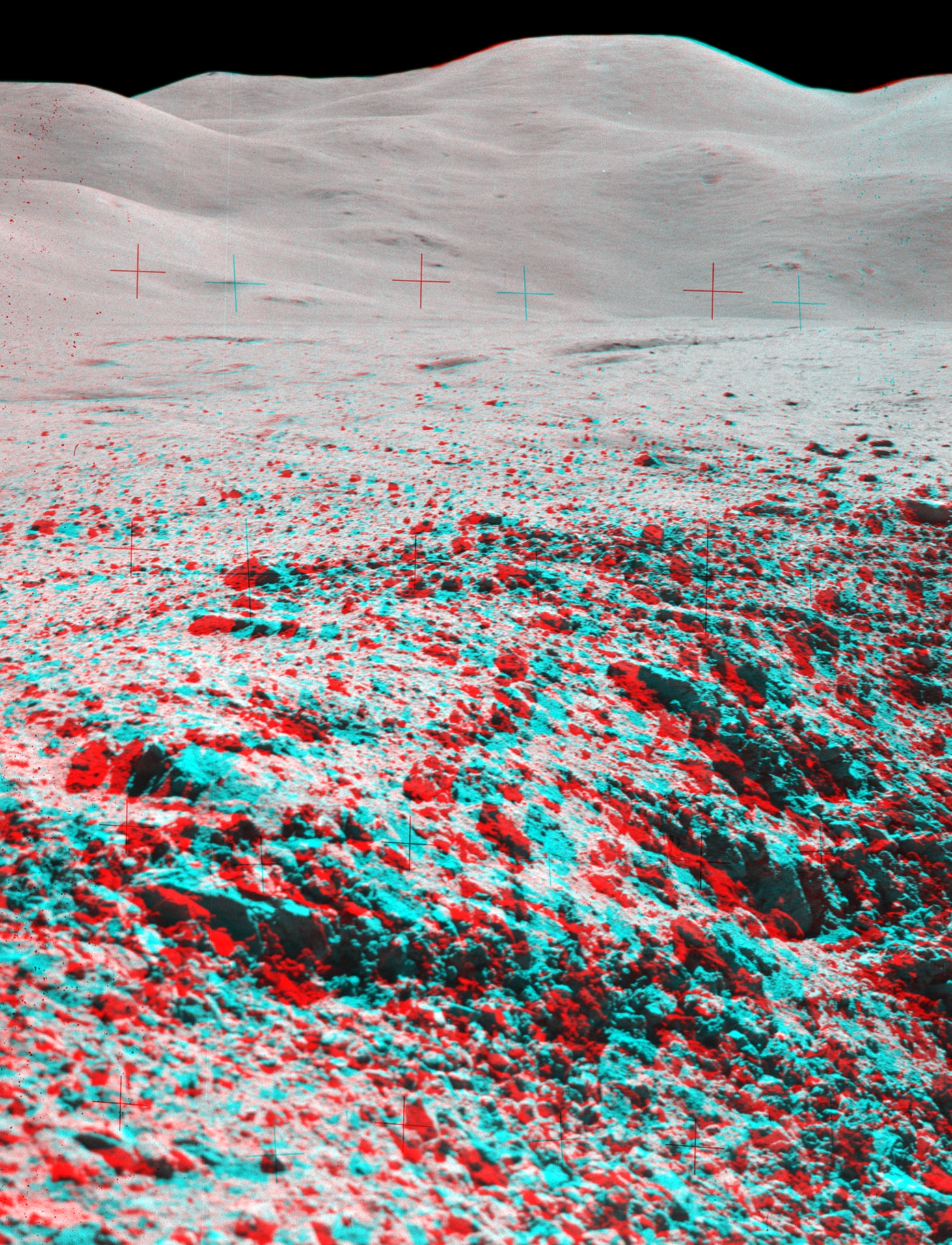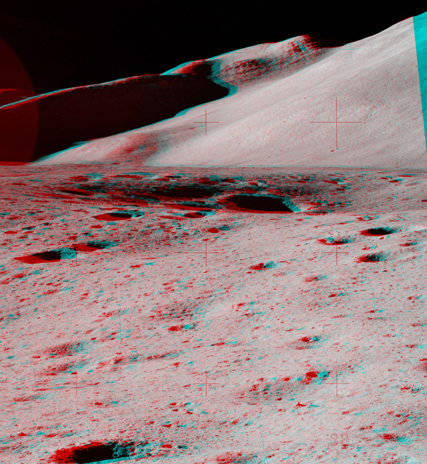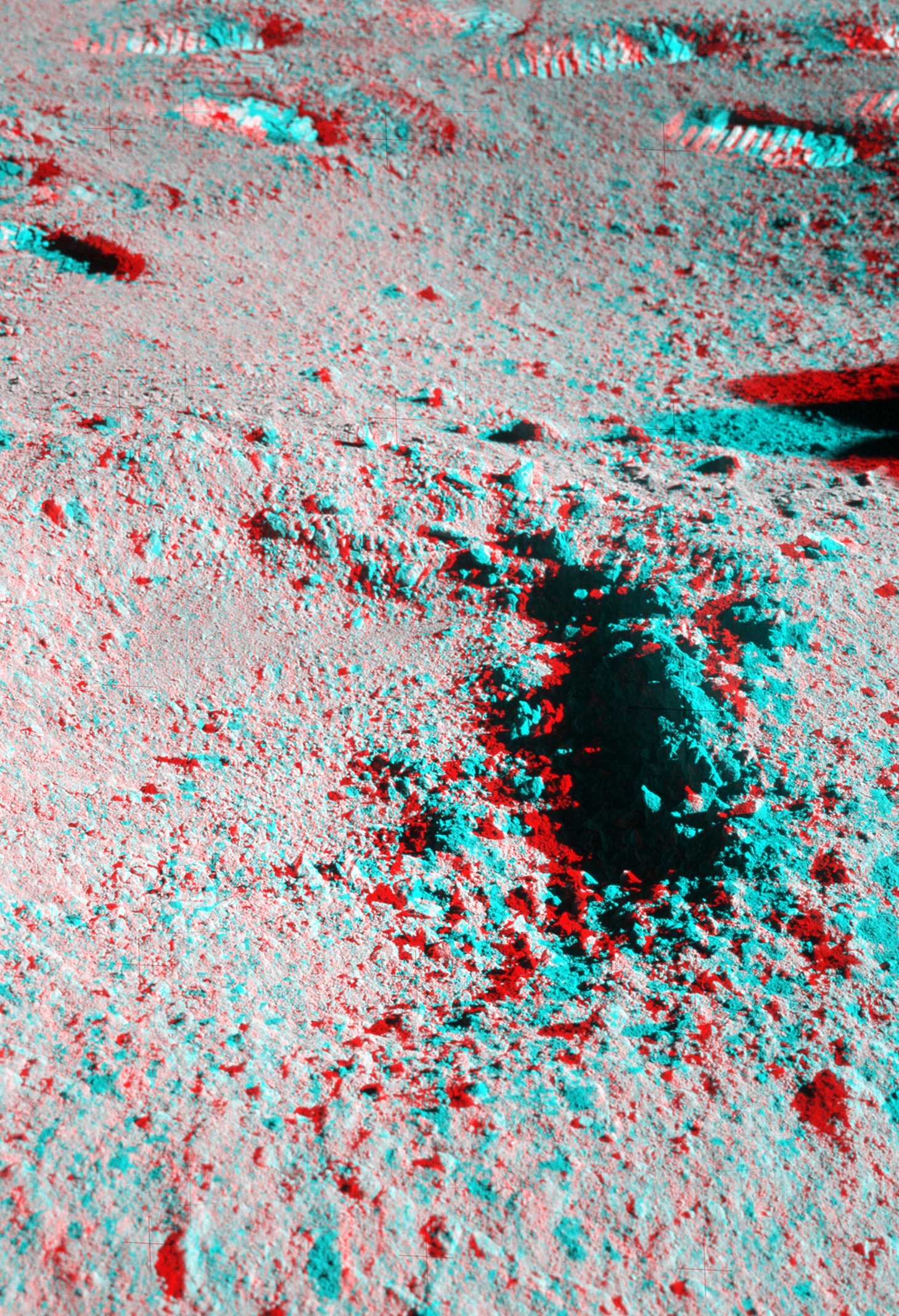Vertical view of the landing site from frames AS15-M-1134 and AS15-M-1135. Anaglyph by Yuri Krasilnikov.Rev 34 Mapping (Metric) Camera Frame 1422 ( 13 Mb )