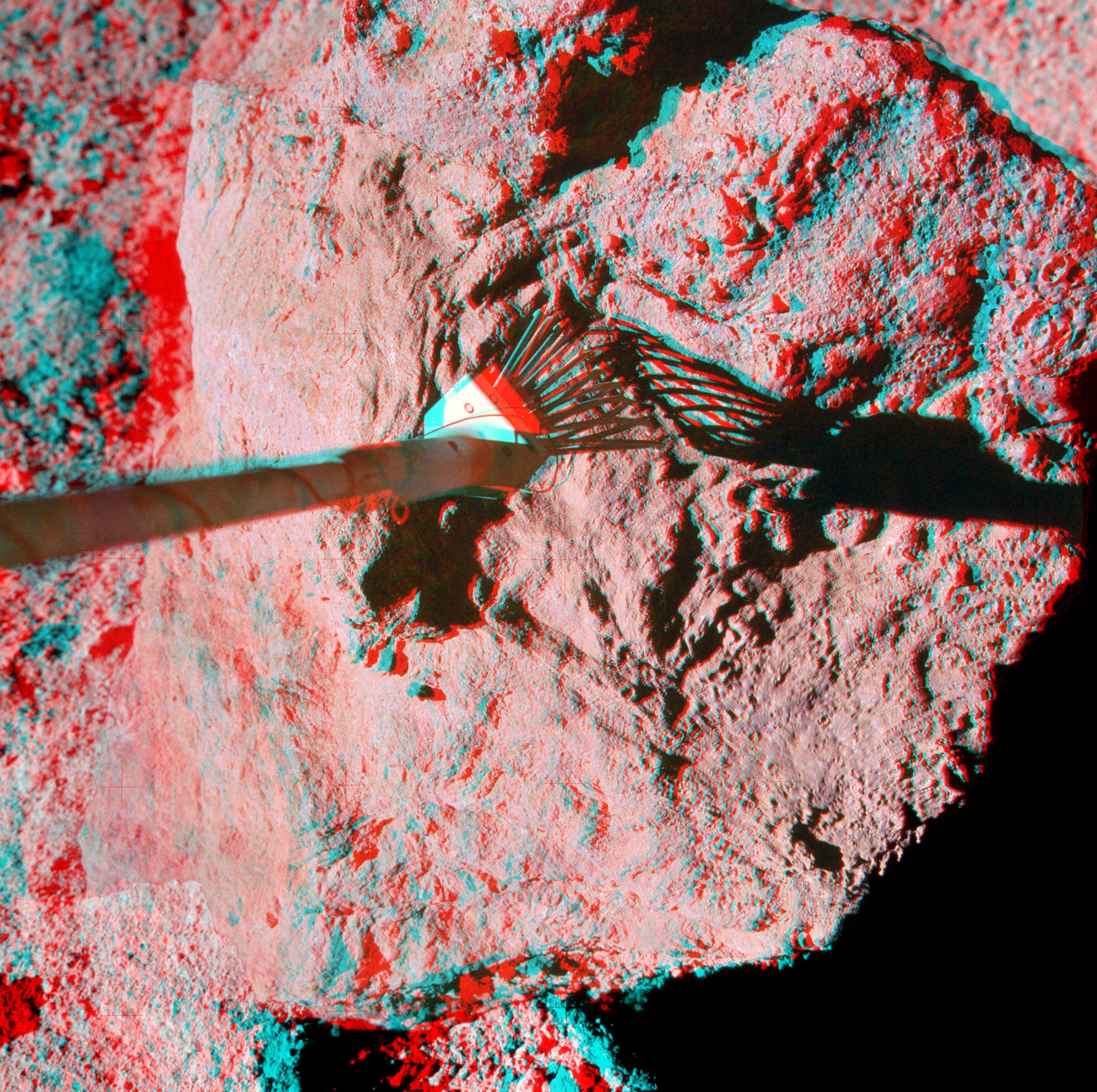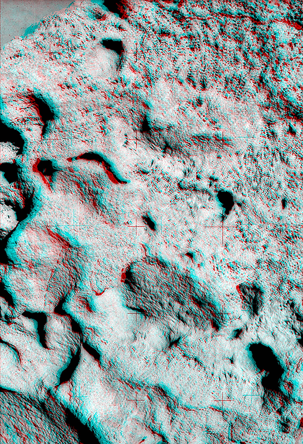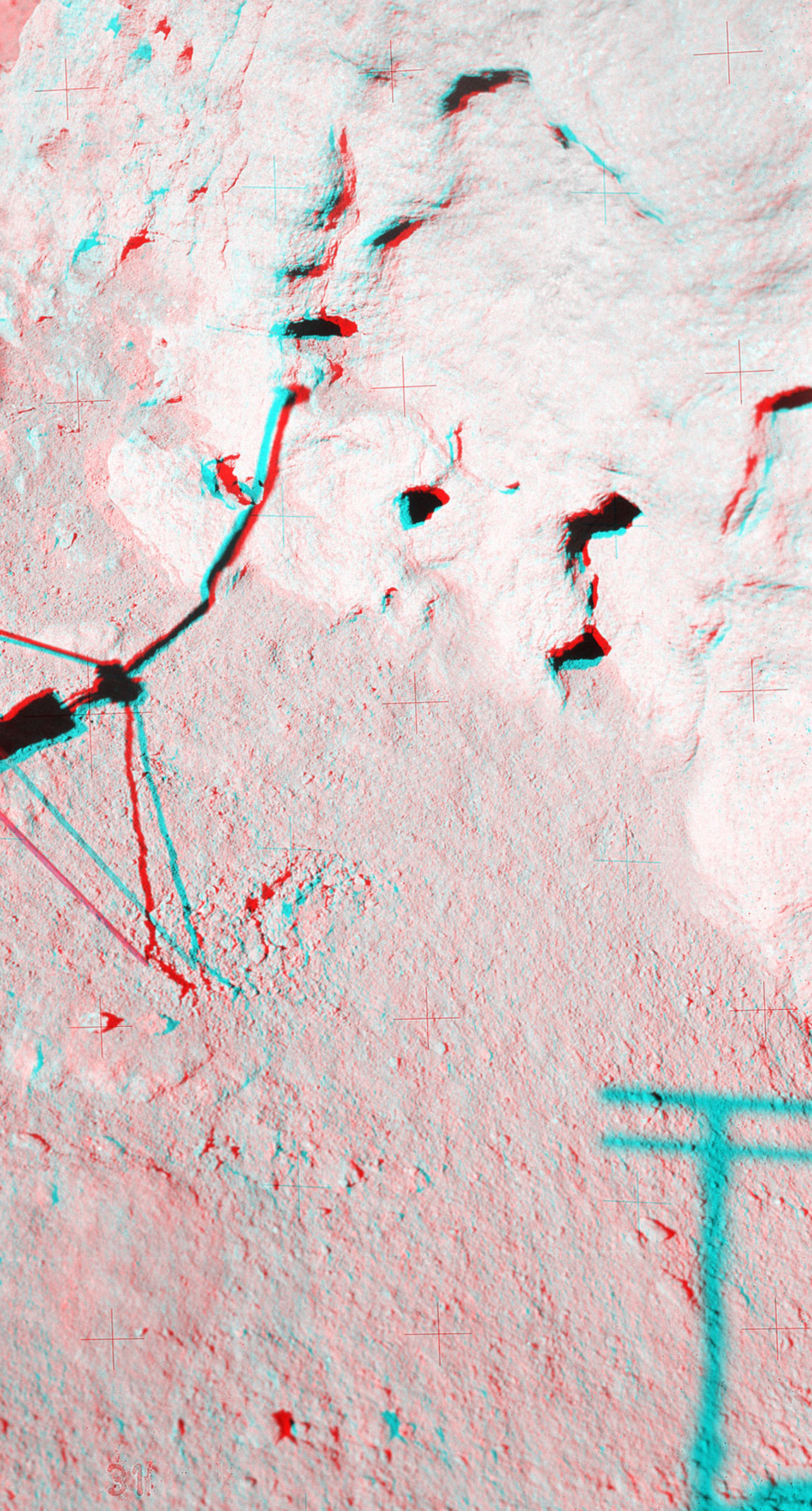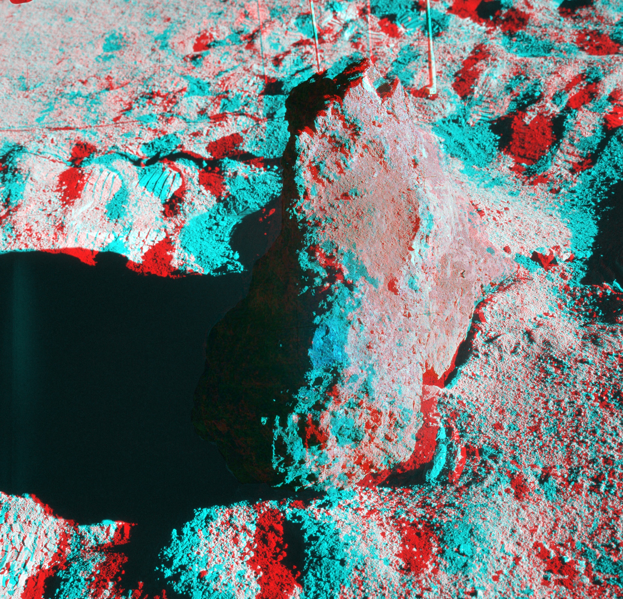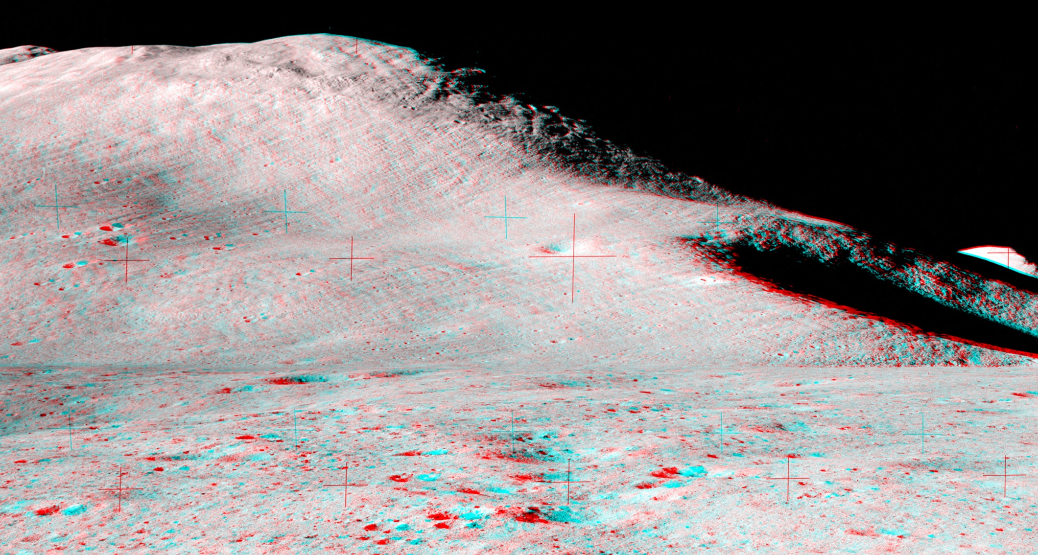Vertical view of the landing site from frames AS15-M-1134 and AS15-M-1135. Anaglyph by Yuri Krasilnikov.Rev 34 Mapping (Metric) Camera Frame 1422 ( 13 Mb )