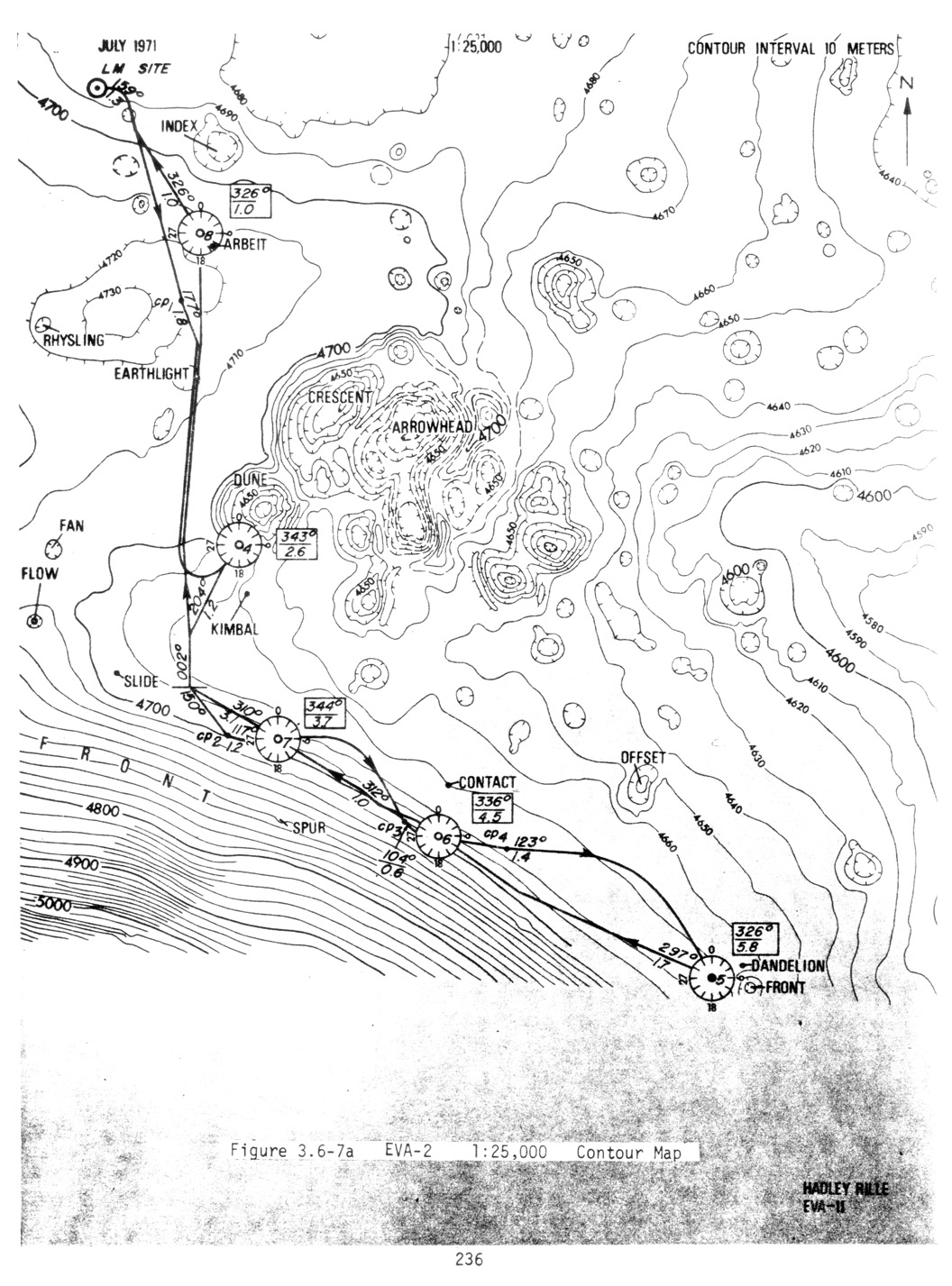 Page 230 from the Apollo 15 Lunar Surface Procedures volume.EVA-2 Contour Map ( 583k )