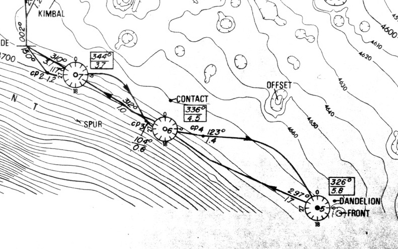 Page 257 from the Apollo 15 Lunar Surface Procedures volume, shows the area from Spur east to Front. The crew had a chronopaque version of this map during the traverses.EVA-3 Contour Map ( 487k )