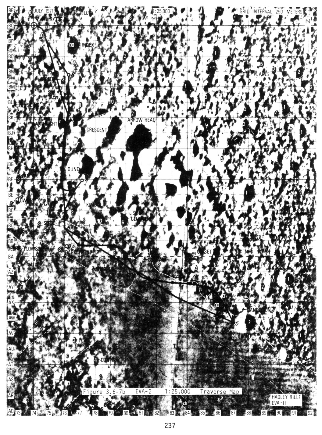 Page 237 from the Apollo 15 Lunar Surface Procedures volume.Traverse Map EVA-1, 1 of 2; EVA-2, 1 of 3 ( 554k )