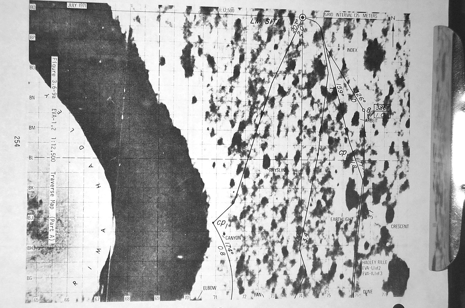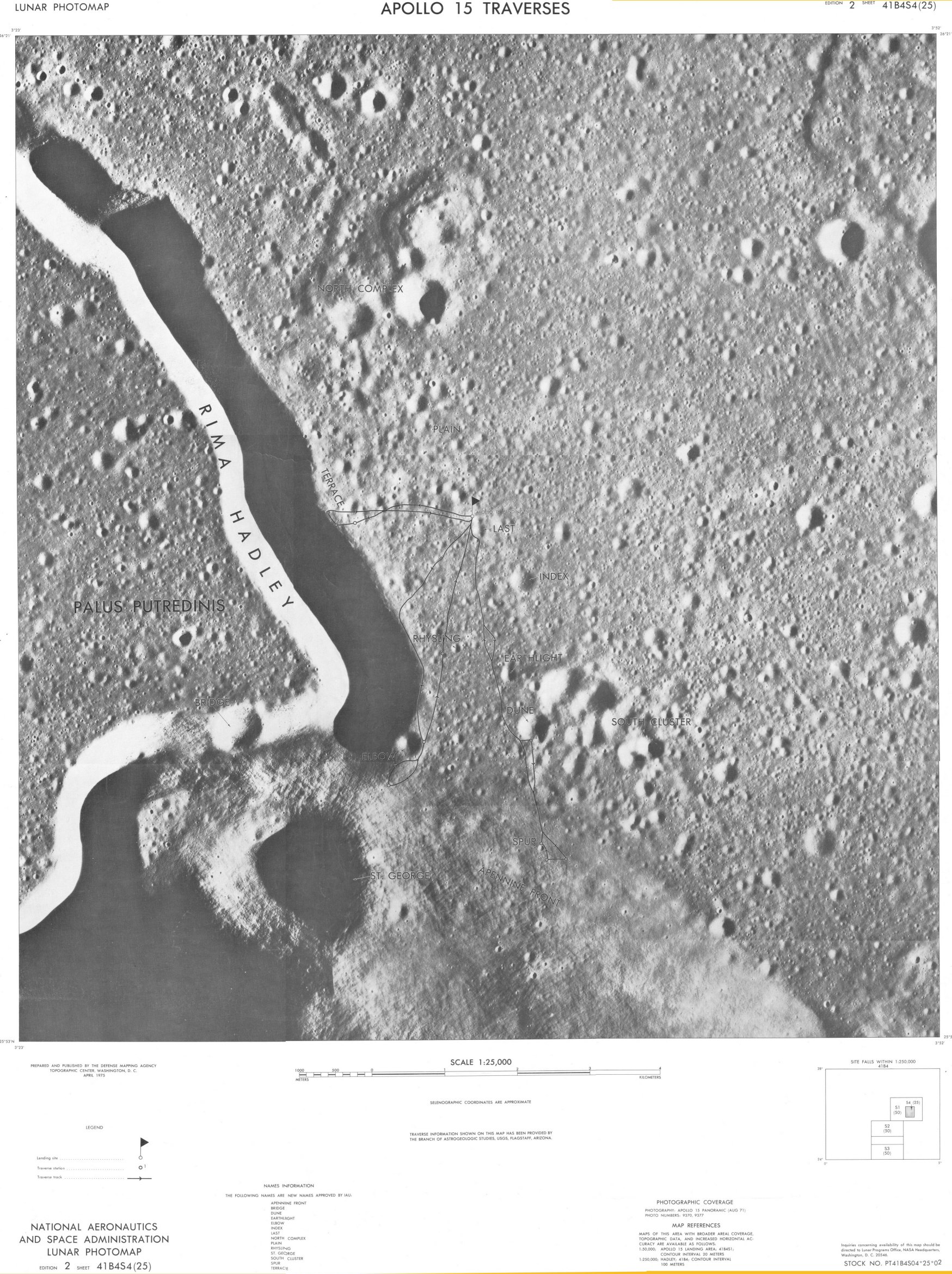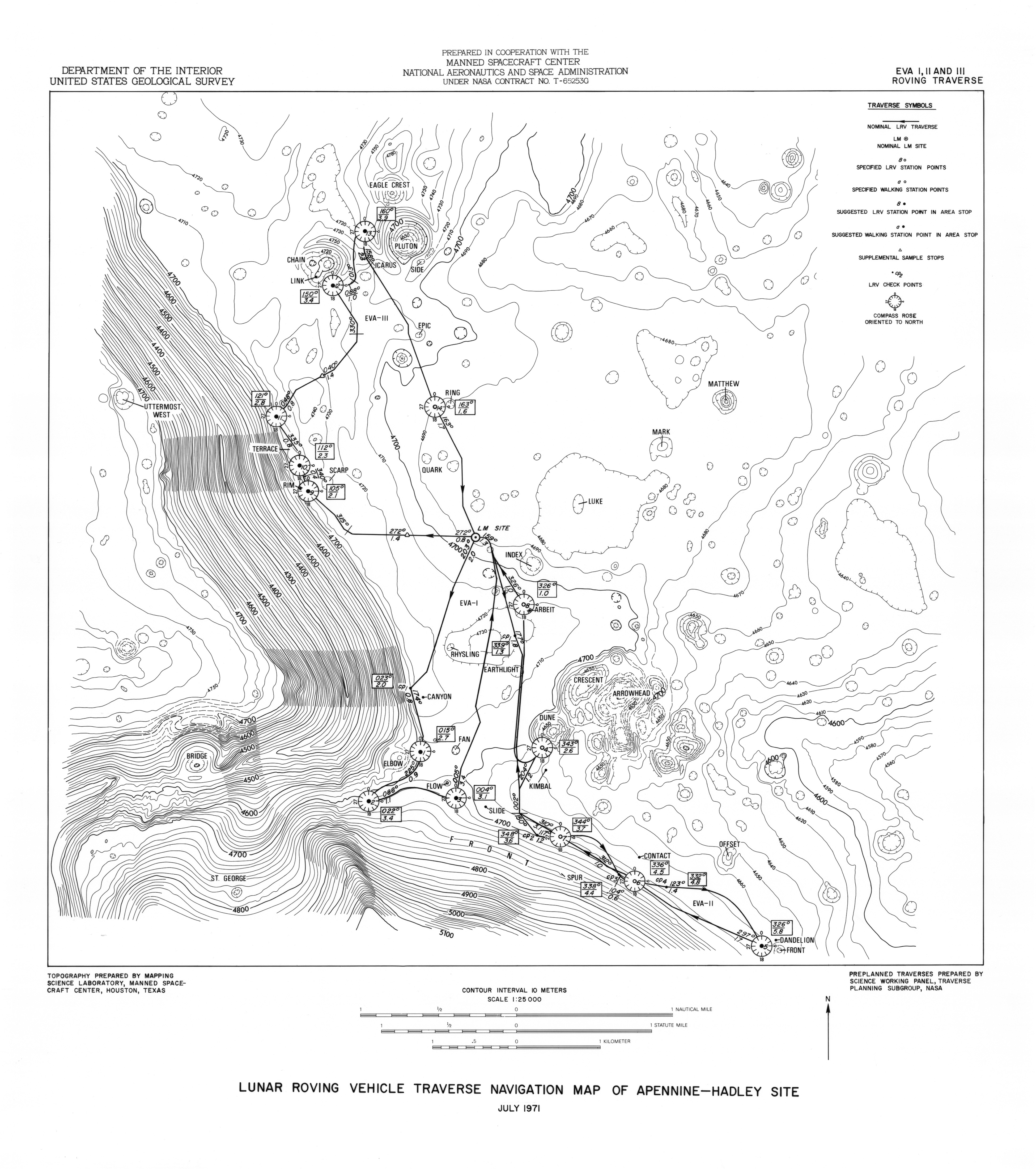 Scans organized by Ken Glover from a chart provided by David Portree, USGS FlagstaffLRV Traverse Navigation Map of Apennine-Hadley Site, July 1971 ( 1.4 Mb PDF or 2.7 Mb JPEG )